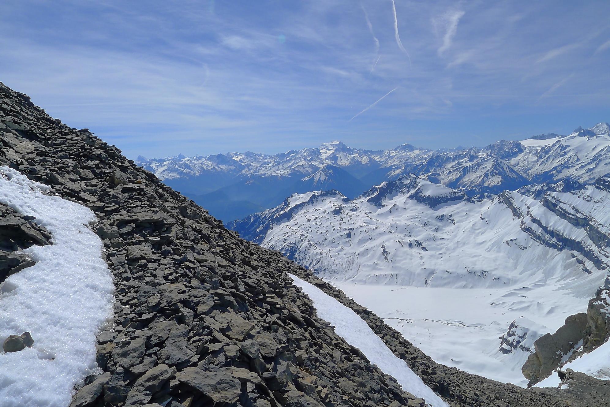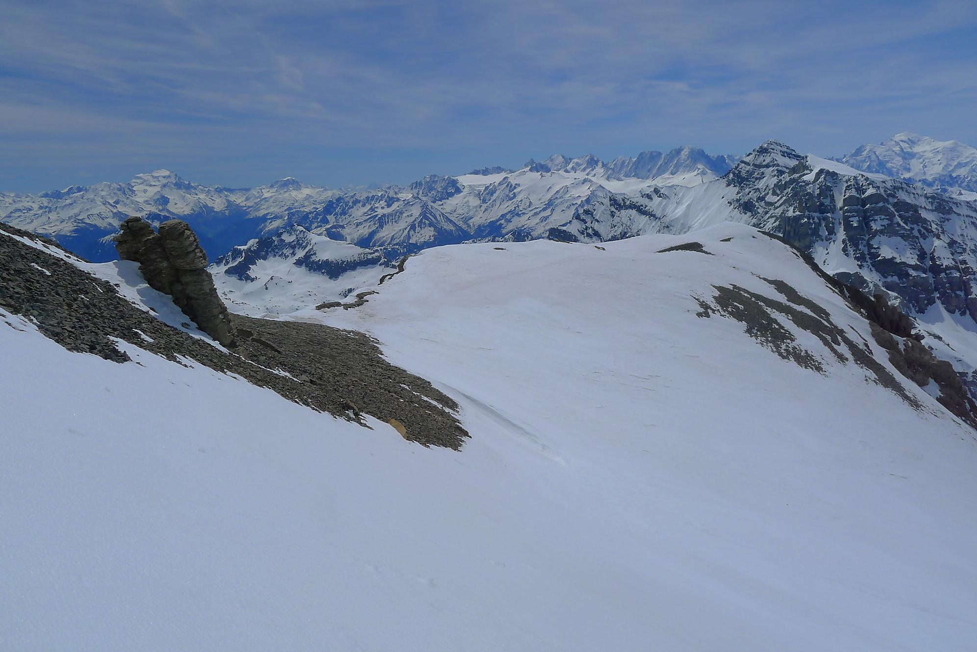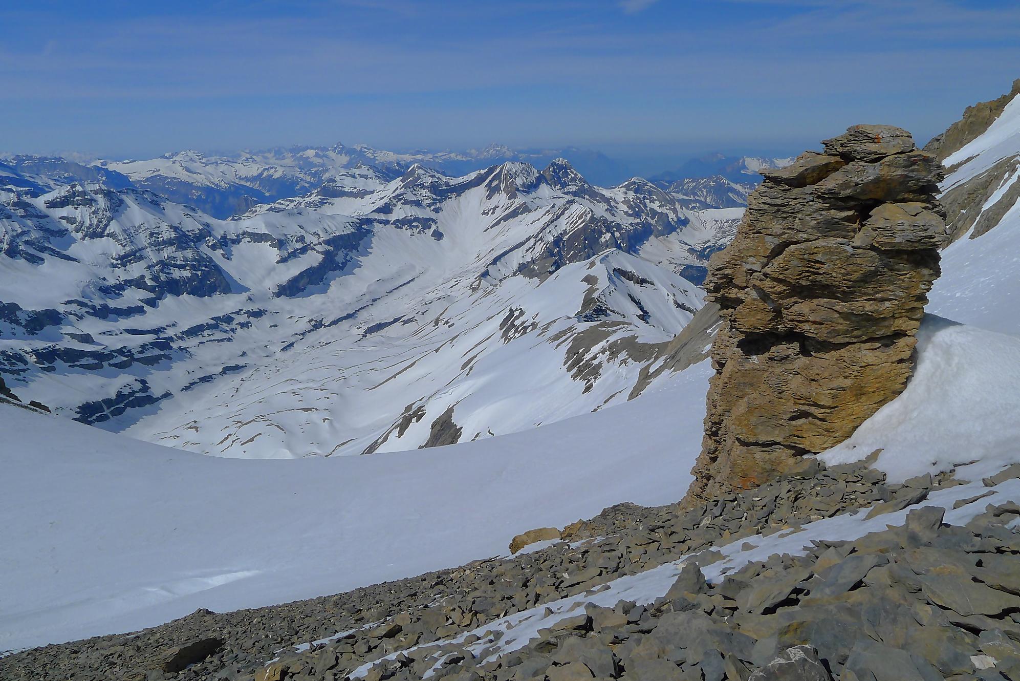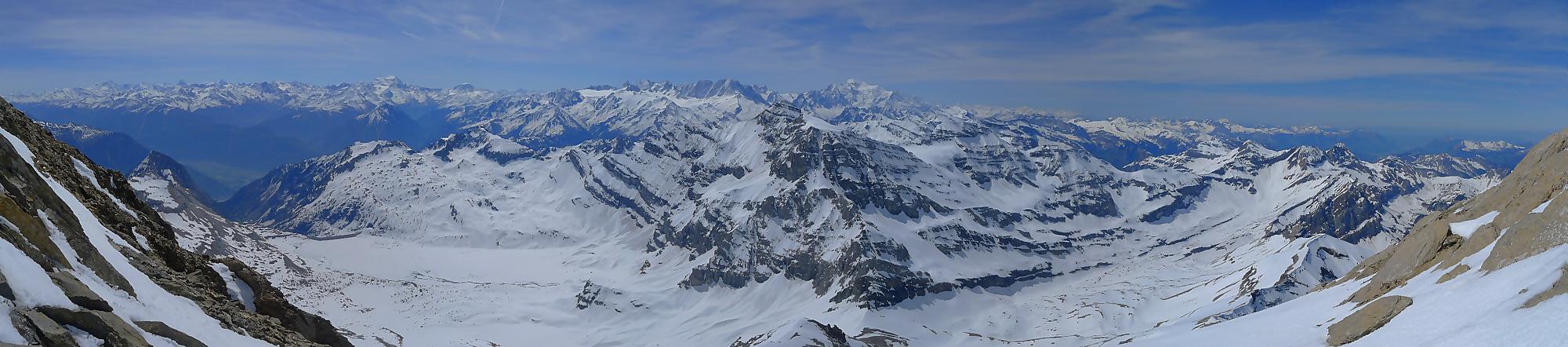 Dans les derniers 50m ,je sors les crampons, la neige humide reposant sur une couche de glace qui m’avait déjà donné des frayeurs plus bas. J’arrive vers 11h45 à la Haute Cime des Dents du Midi, bien fatigué. Je prends mes photos, tout content quand même d’avoir persévéré, la vue est belle !