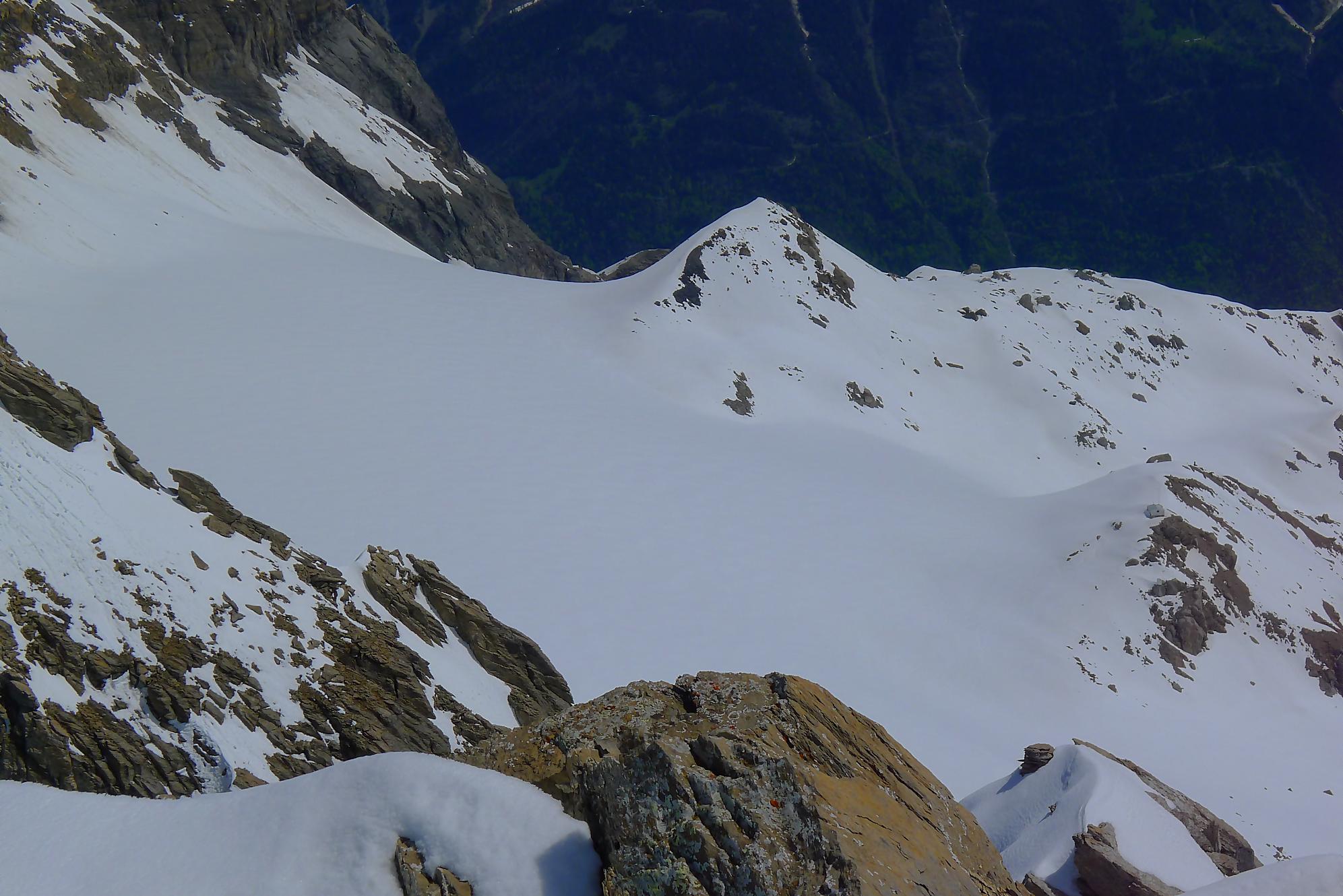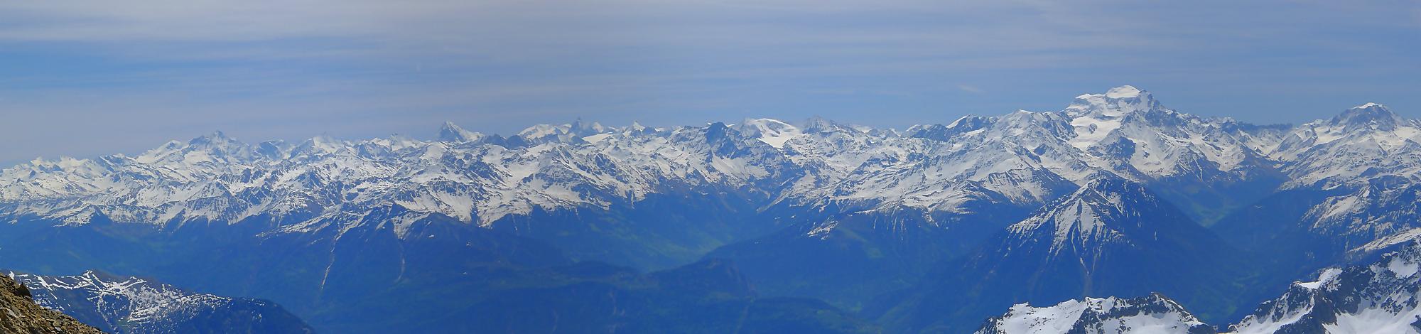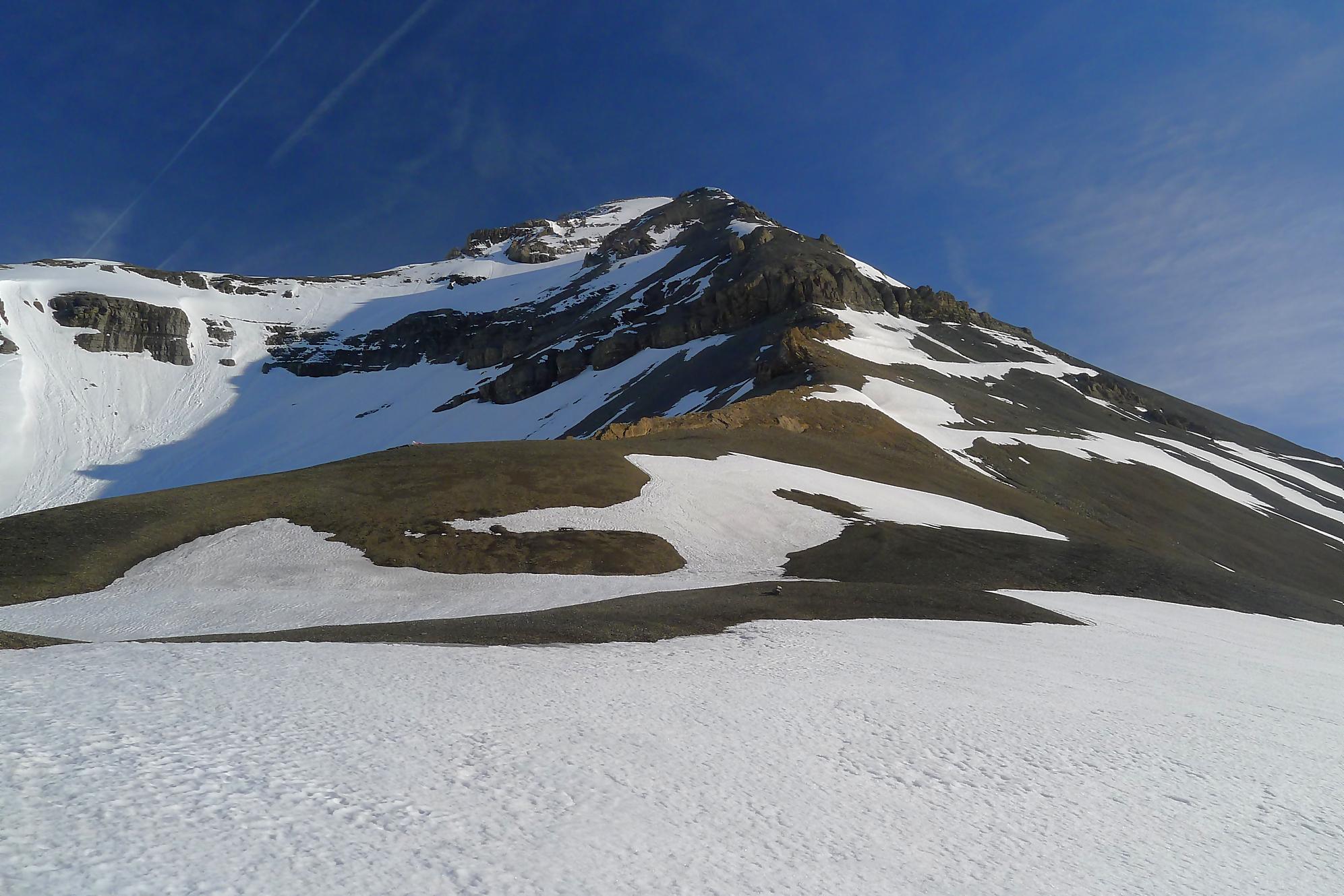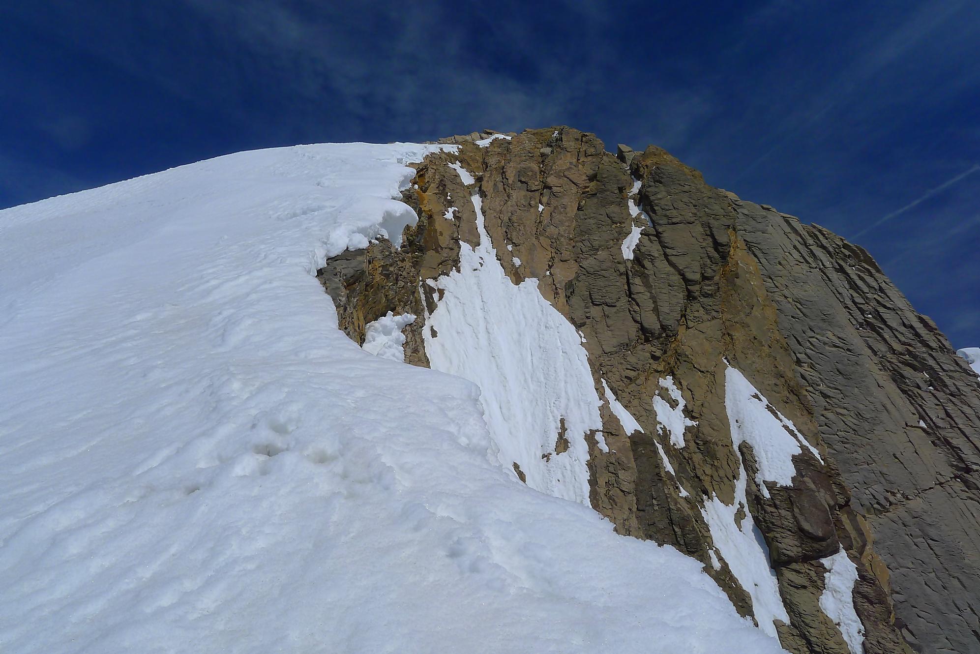 Dans les derniers 50m ,je sors les crampons, la neige humide reposant sur une couche de glace qui m’avait déjà donné des frayeurs plus bas. J’arrive vers 11h45 à la Haute Cime des Dents du Midi, bien fatigué. Je prends mes photos, tout content quand même d’avoir persévéré, la vue est belle !