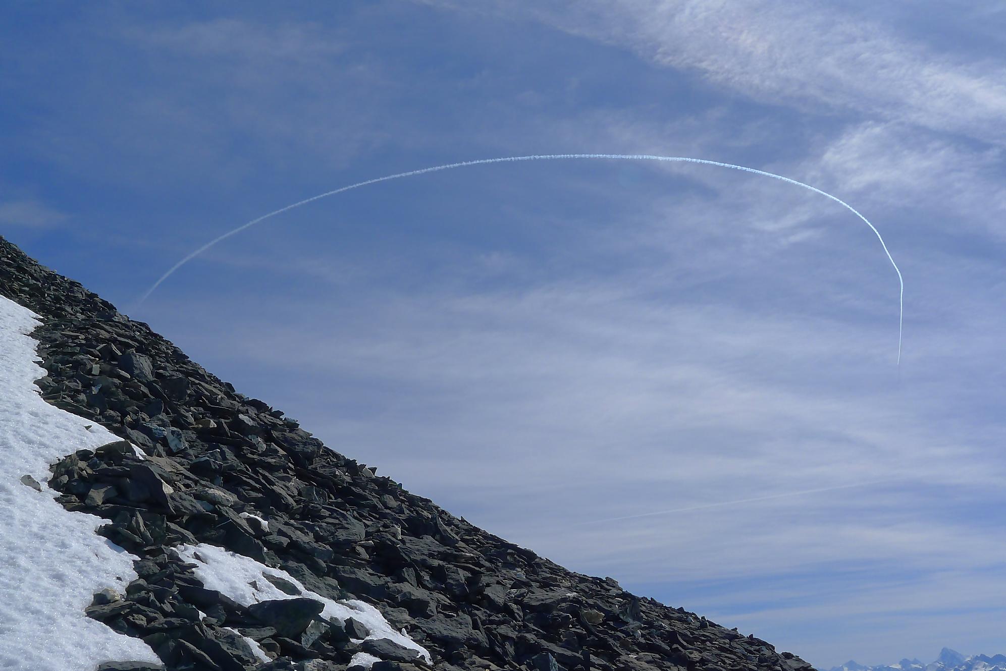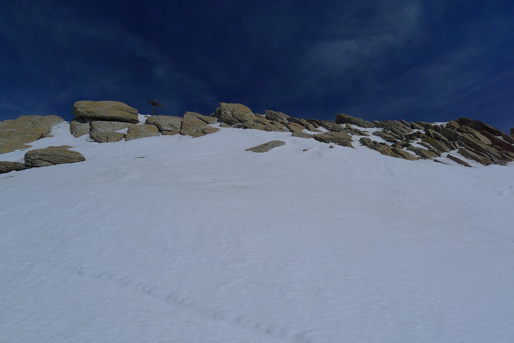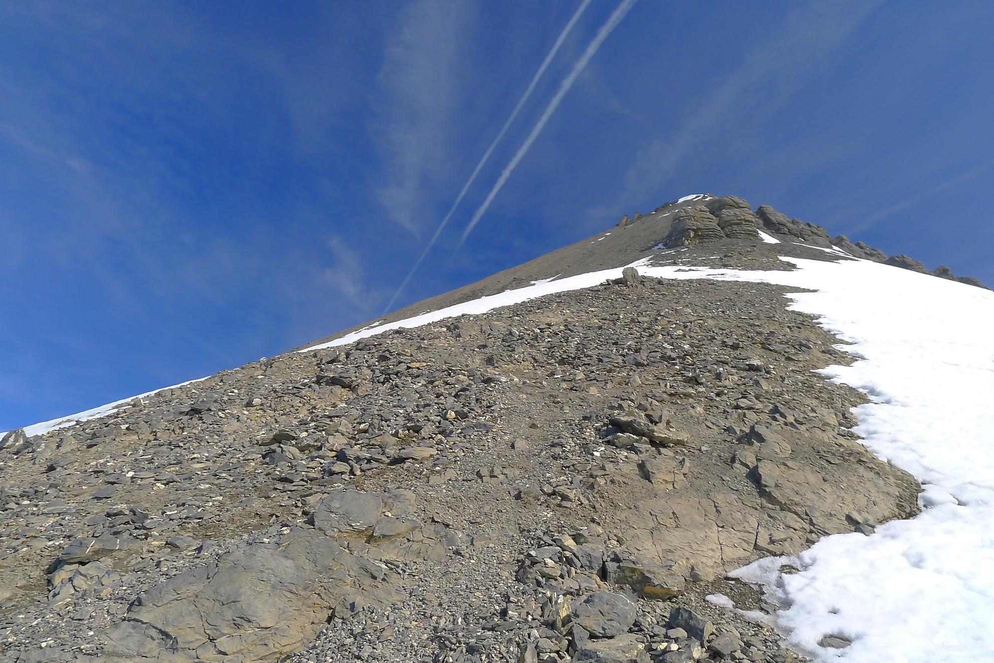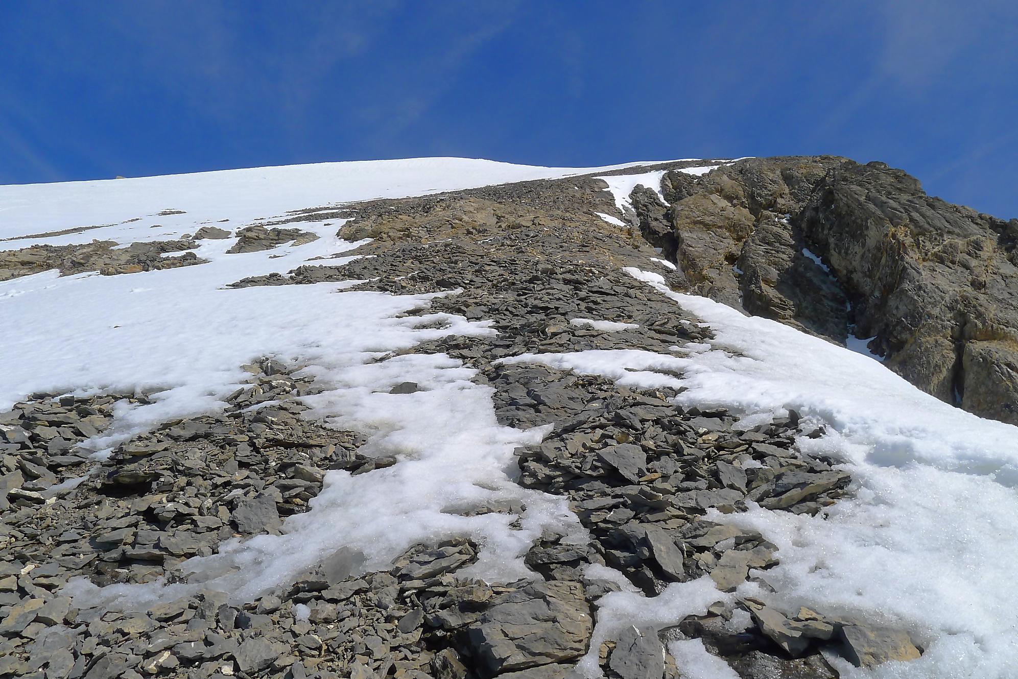 Dans les derniers 50m ,je sors les crampons, la neige humide reposant sur une couche de glace qui m’avait déjà donné des frayeurs plus bas. J’arrive vers 11h45 à la Haute Cime des Dents du Midi, bien fatigué. Je prends mes photos, tout content quand même d’avoir persévéré, la vue est belle !