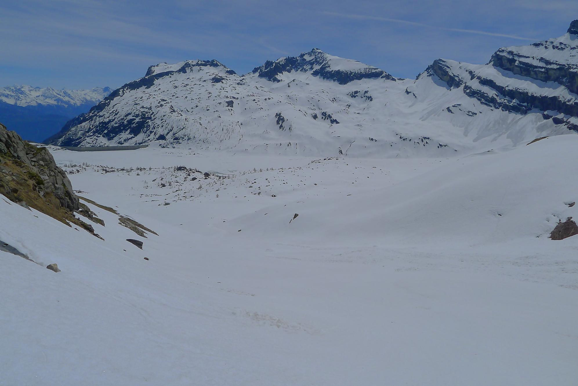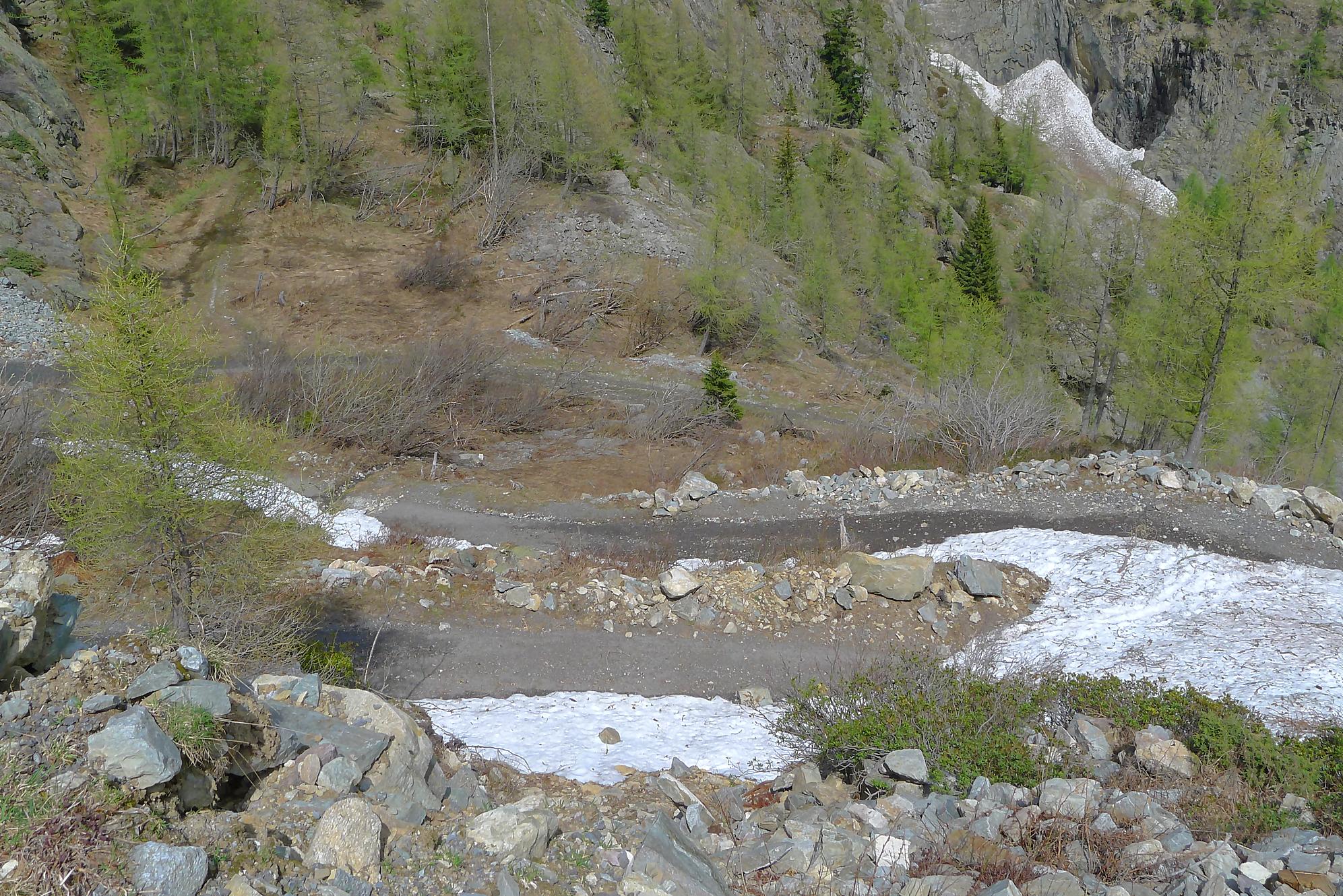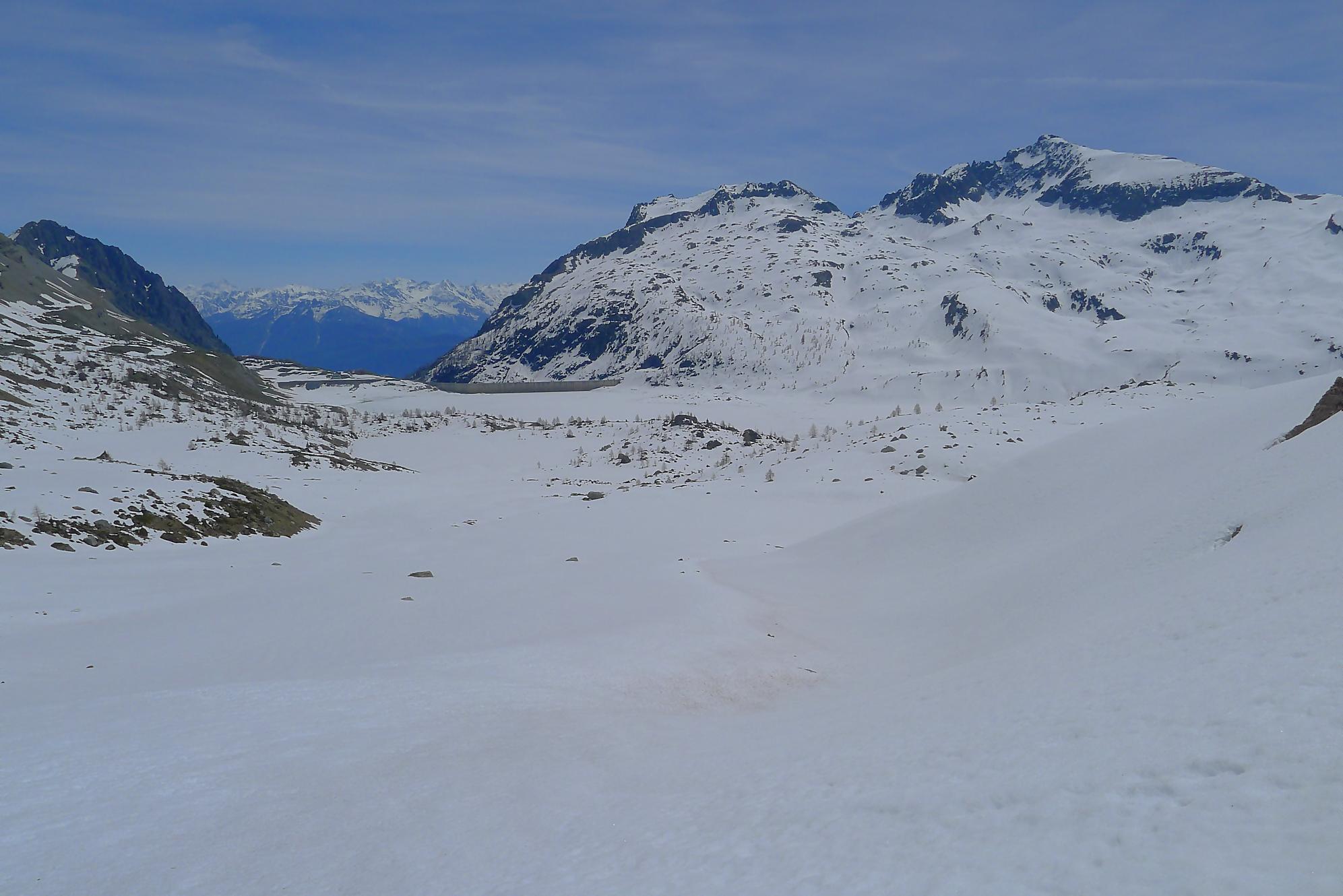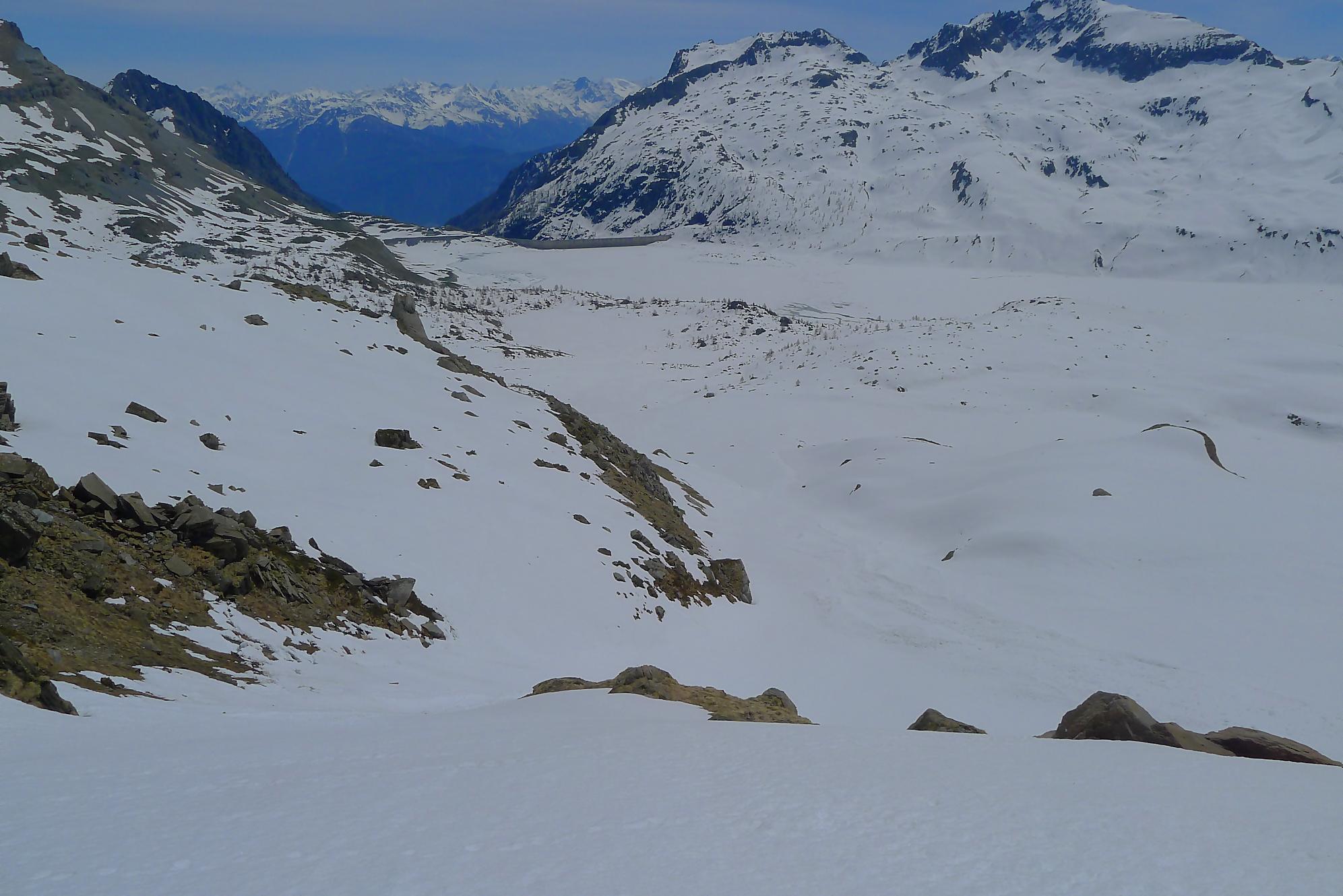 Il me restait ensuite à traverser le plateau de Plan Château, de pousser puis marcher le long du barrage de Salanfe (ce faut plat est le défaut de cette course). Je retrouve le refuge de Salanfe, récupère quelques affaires, puis me lance dans les pentes douces du vallon de La Salanfe. Au col du Pt1775, c’est la fin du ski, il faut désormais porter les skis et descendre la longue route pour Van d’en Haut (c’est quand même plus marrant quand on peut la descendre à ski !).