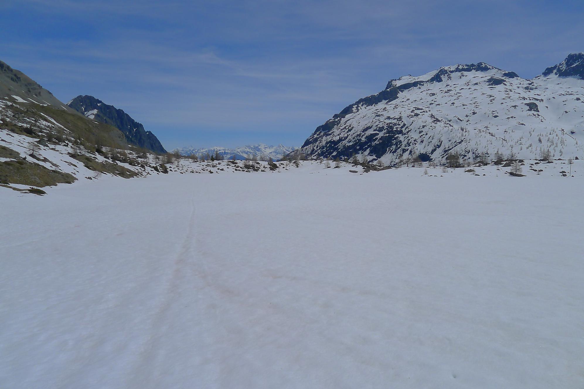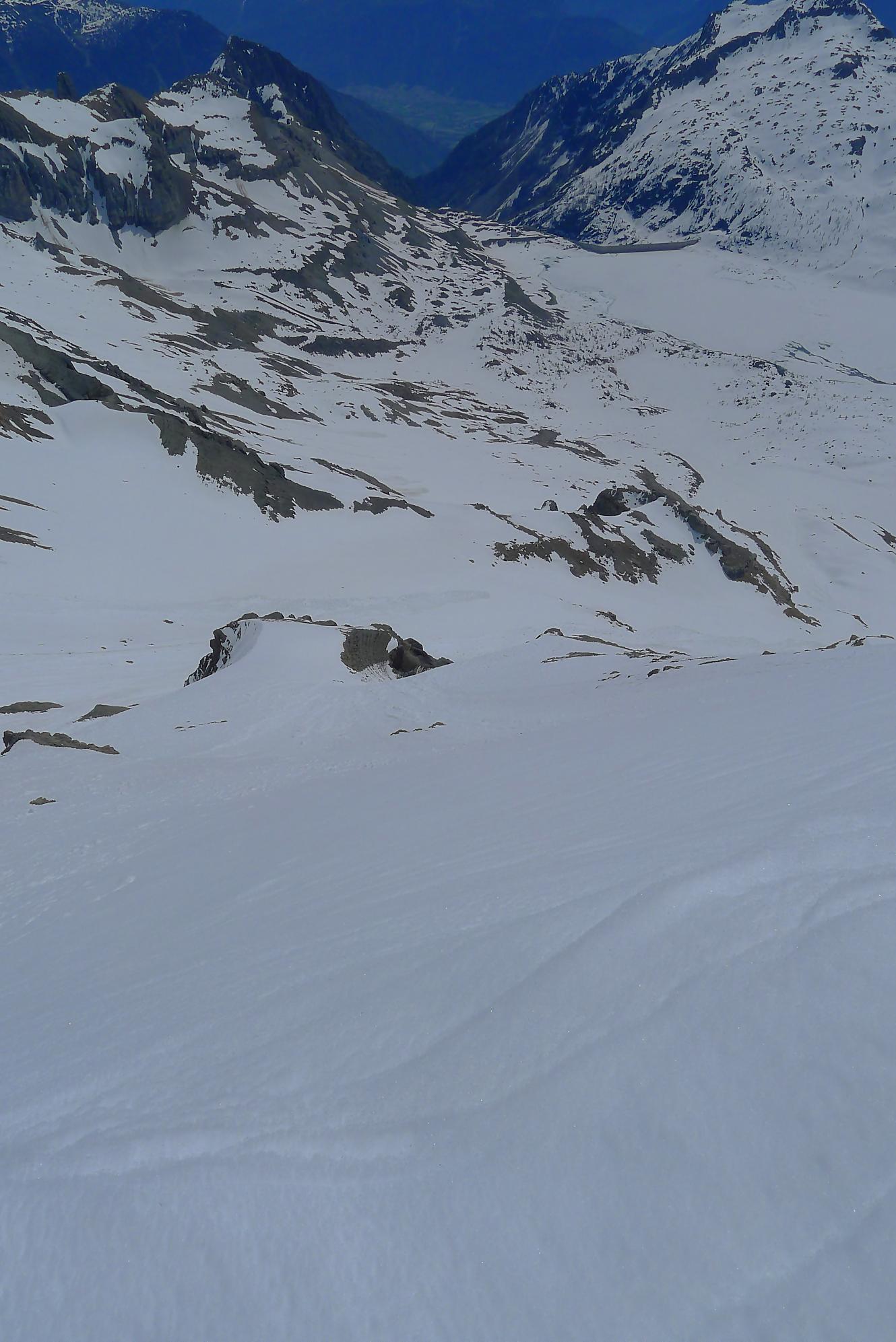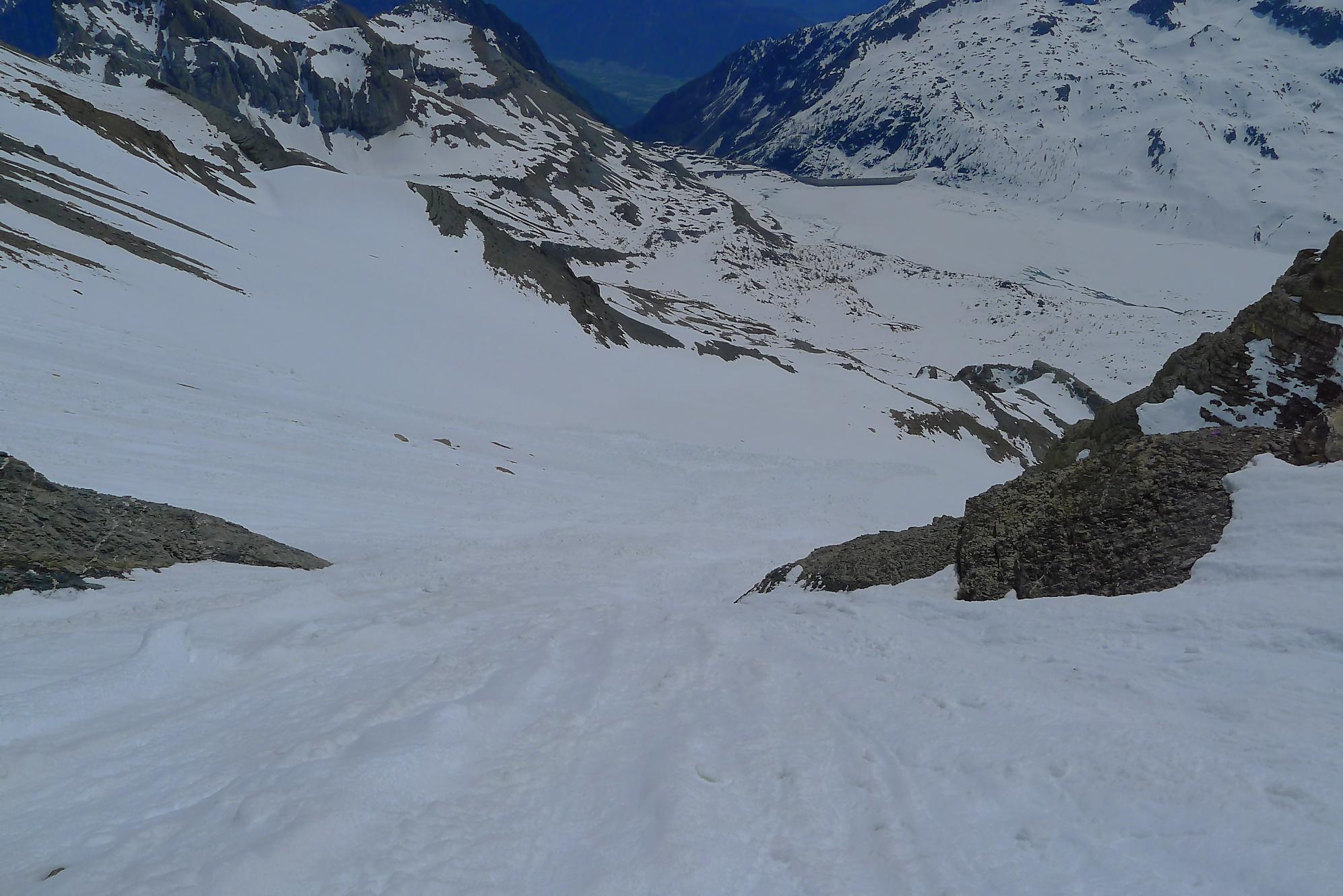 Il me restait ensuite à traverser le plateau de Plan Château, de pousser puis marcher le long du barrage de Salanfe (ce faut plat est le défaut de cette course). Je retrouve le refuge de Salanfe, récupère quelques affaires, puis me lance dans les pentes douces du vallon de La Salanfe. Au col du Pt1775, c’est la fin du ski, il faut désormais porter les skis et descendre la longue route pour Van d’en Haut (c’est quand même plus marrant quand on peut la descendre à ski !).