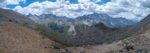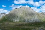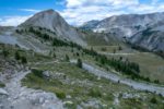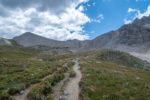 Je repars et la montée se poursuit en hauteur du lac de Saint-Anne. Encore un rayon de soleil qui me permet de profiter de sa belle couleur. Il faut remonter un vaste plateau, avec sur la gauche quelques jolies petites falaises. Toujours bien du monde ici. La pente se raidit et le sol devient minéral. Tiens des cyclistes (avec moteur) remonte cette pente. C’est étroit. Monde minéral. J’accède au col Girardin, assez venté en ce jour. La vue s’ouvre.