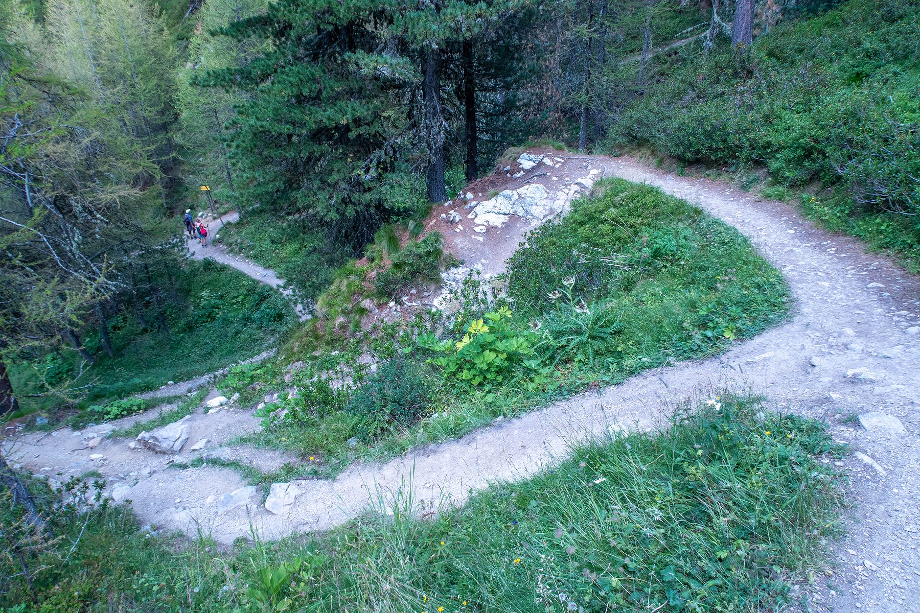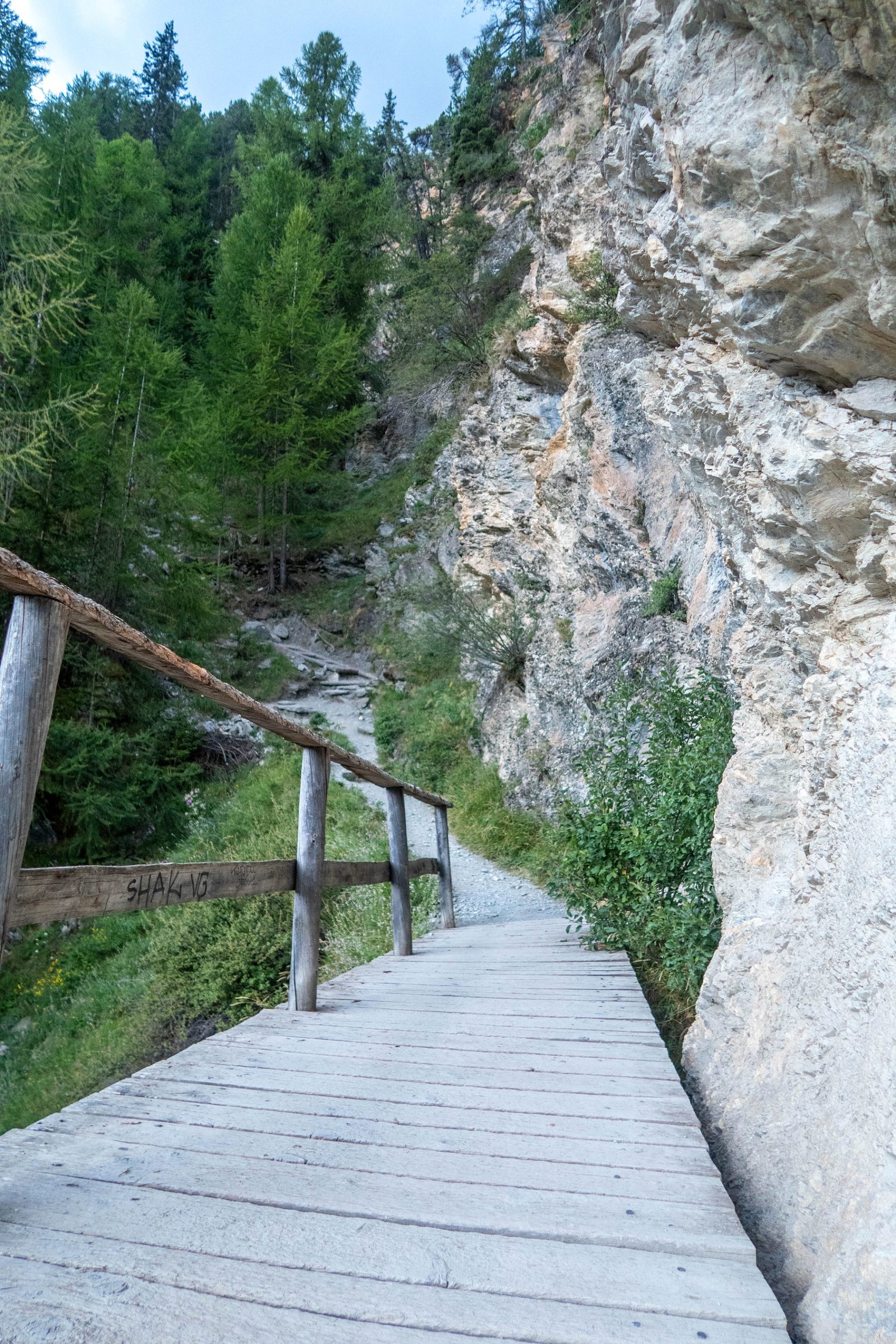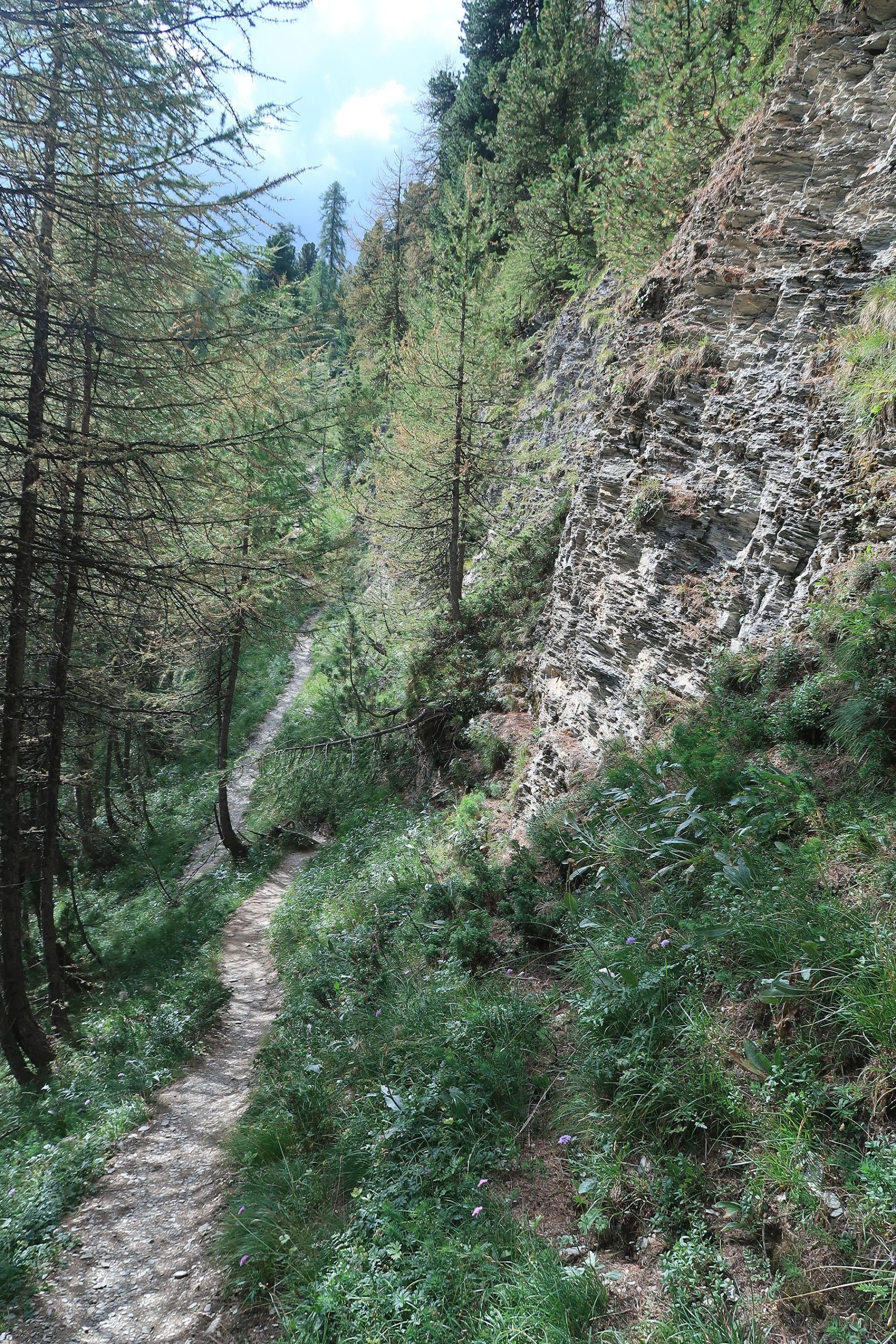 Je traverse le ruisseau de la Pisse (ça, c’est du nom !) via un pont pour suivre un sentier qui file en forêt (surtout des mélèzes). C’est pentu, mais régulier. Le sentier a de nombreux lacets et est agréable. Un joli passage le long de la falaise avec un pont en bois.
