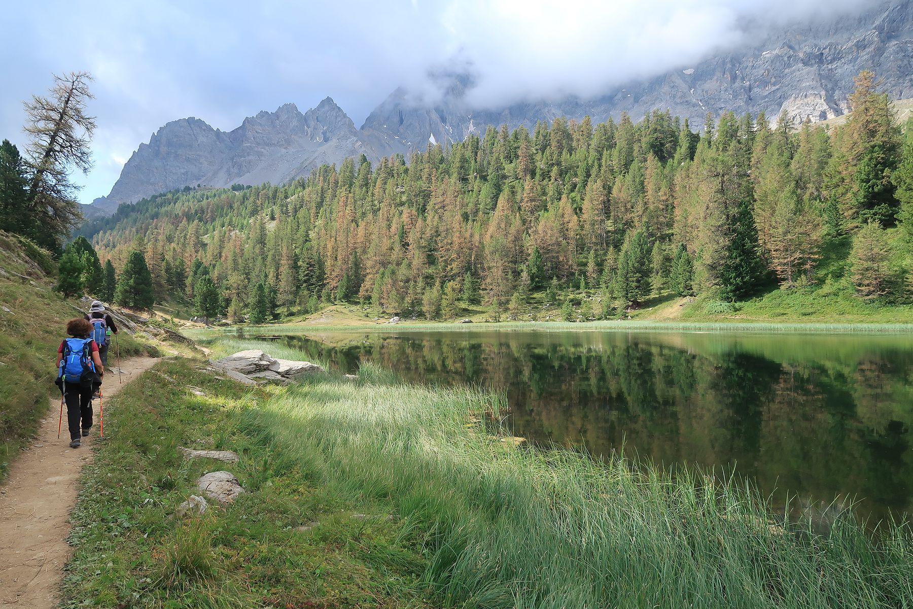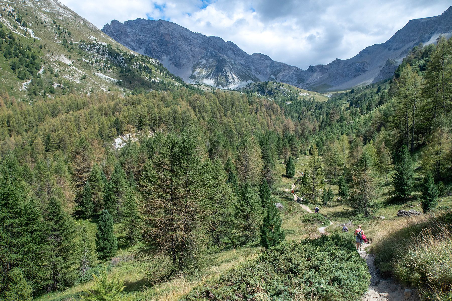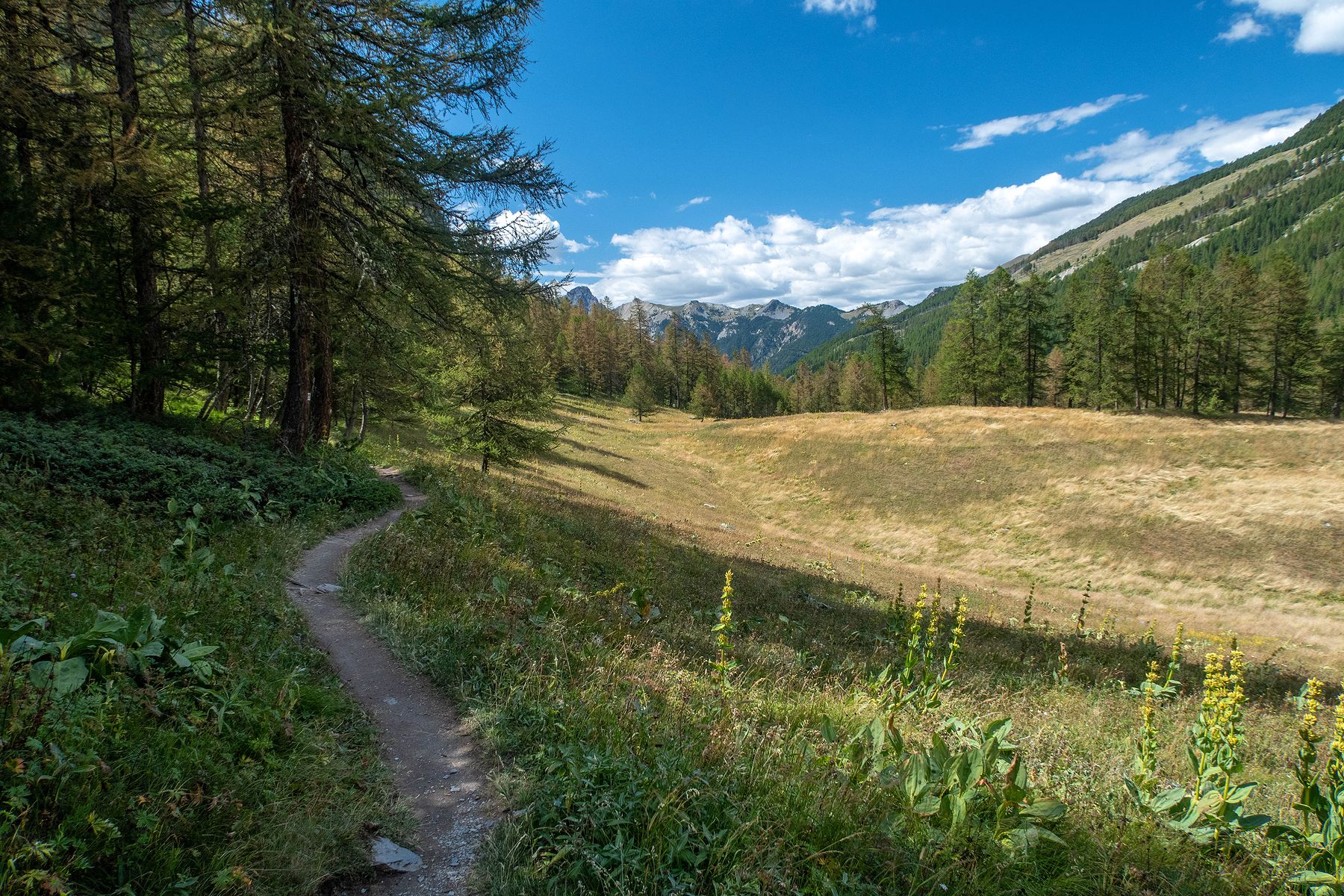 Je traverse le ruisseau de la Pisse (ça, c’est du nom !) via un pont pour suivre un sentier qui file en forêt (surtout des mélèzes). C’est pentu, mais régulier. Le sentier a de nombreux lacets et est agréable. Un joli passage le long de la falaise avec un pont en bois.