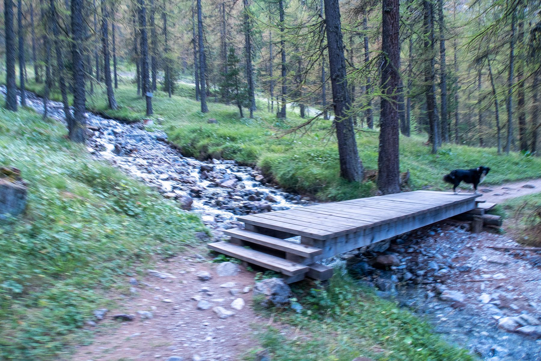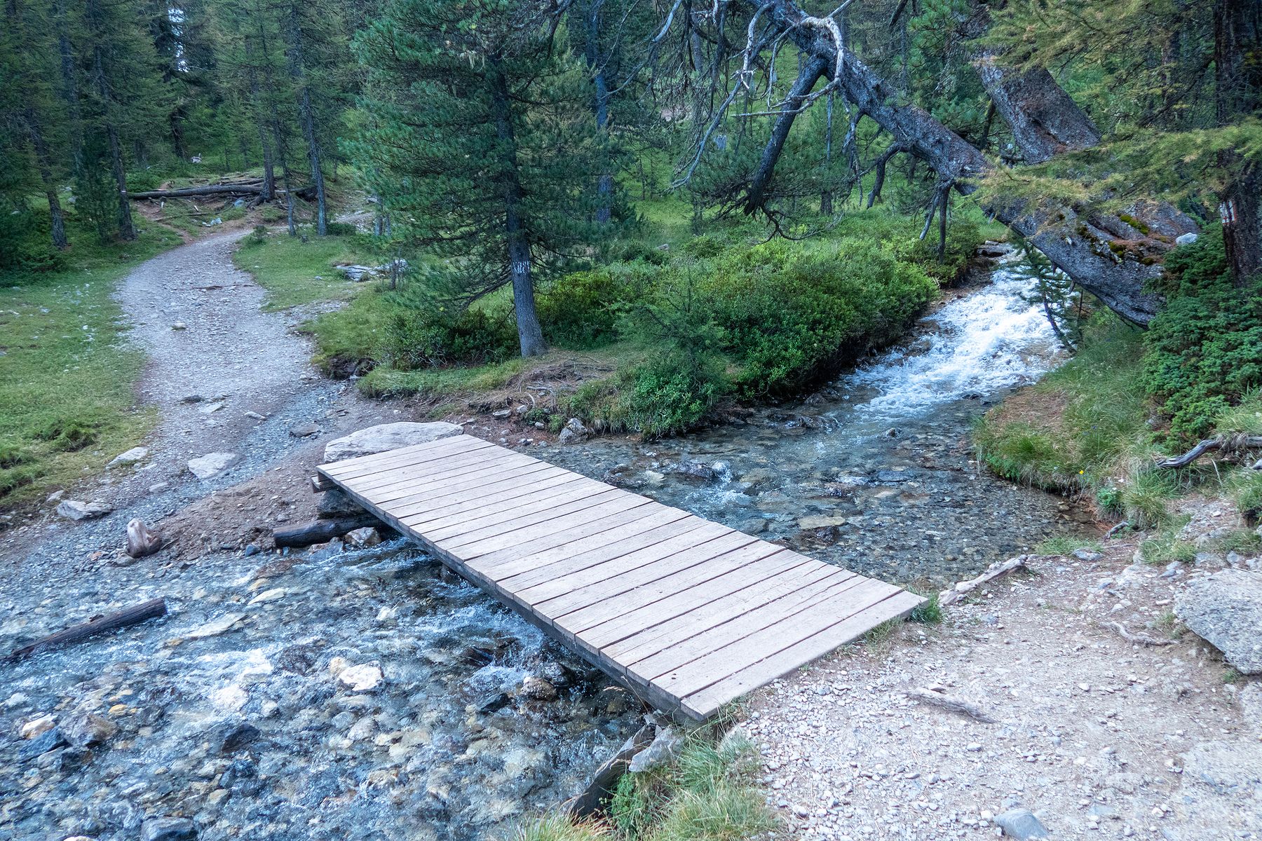 Un petit pont en bois permet de franchir le torrent du Col Tronchet. Poursuite en forêt pour un sentier agréable. Ensuite un passage pentu tout en zigzags.