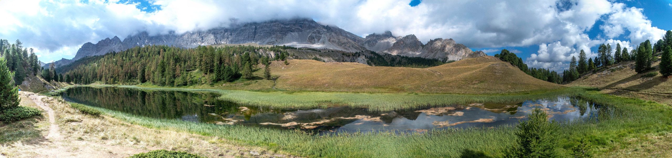 Par la suite, je sors de la forêt pour une prairie et j’atteins le lac Miroir. Le lieu est tout simplement charmant. Le lac est lové, entre forêt et montagne. Je reste un bon moment ici, pour profiter des lieux et notamment attendre un rayon de soleil. La météo est bien nuageuse aujourd’hui.