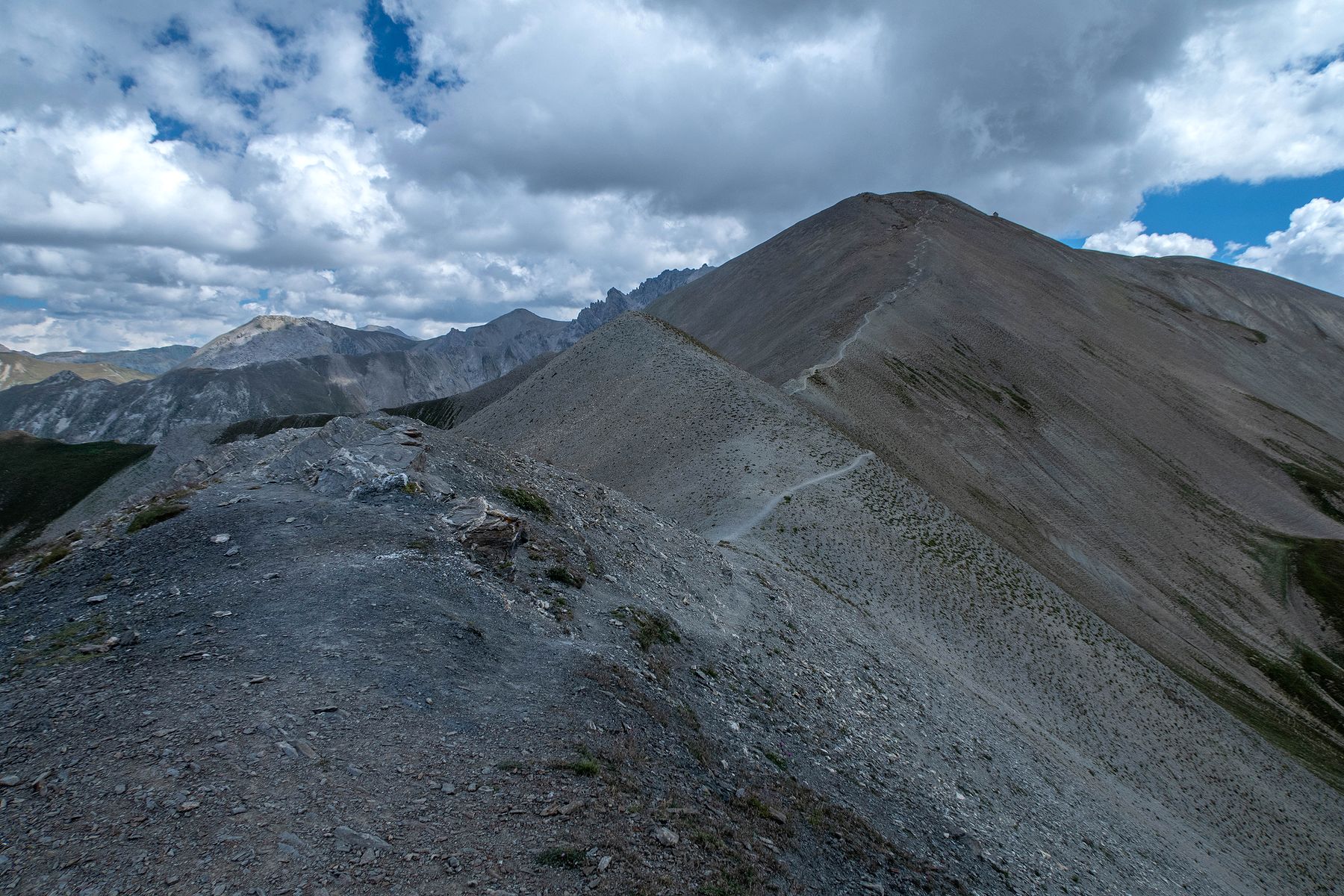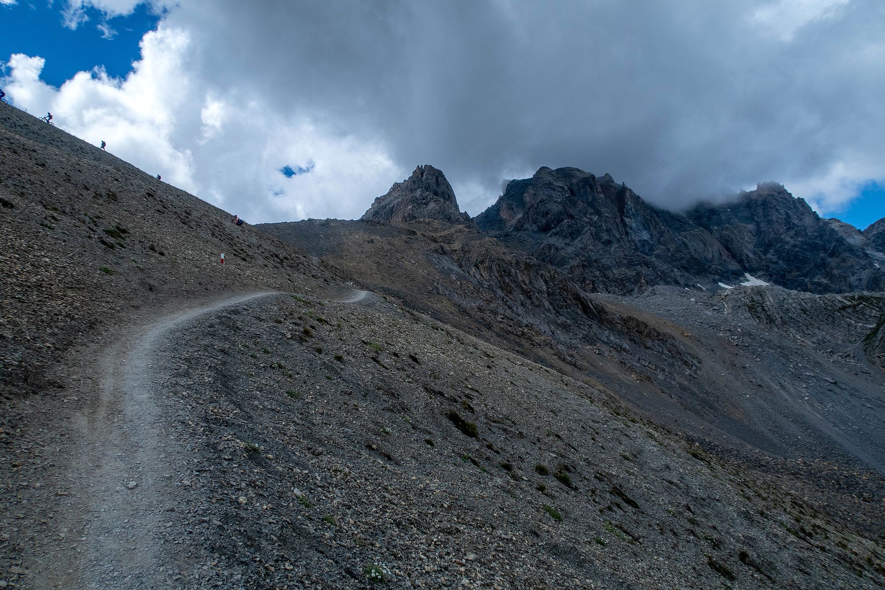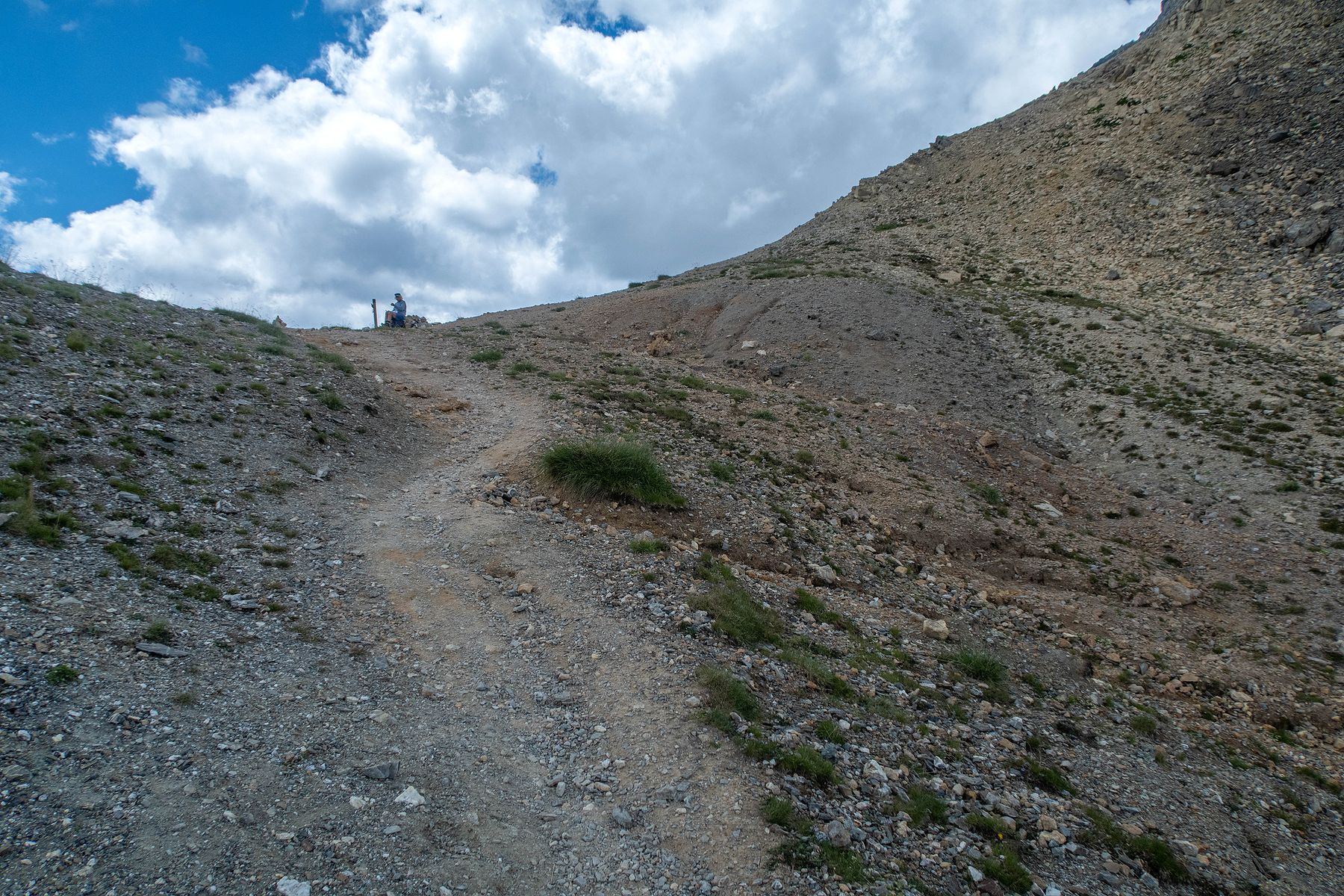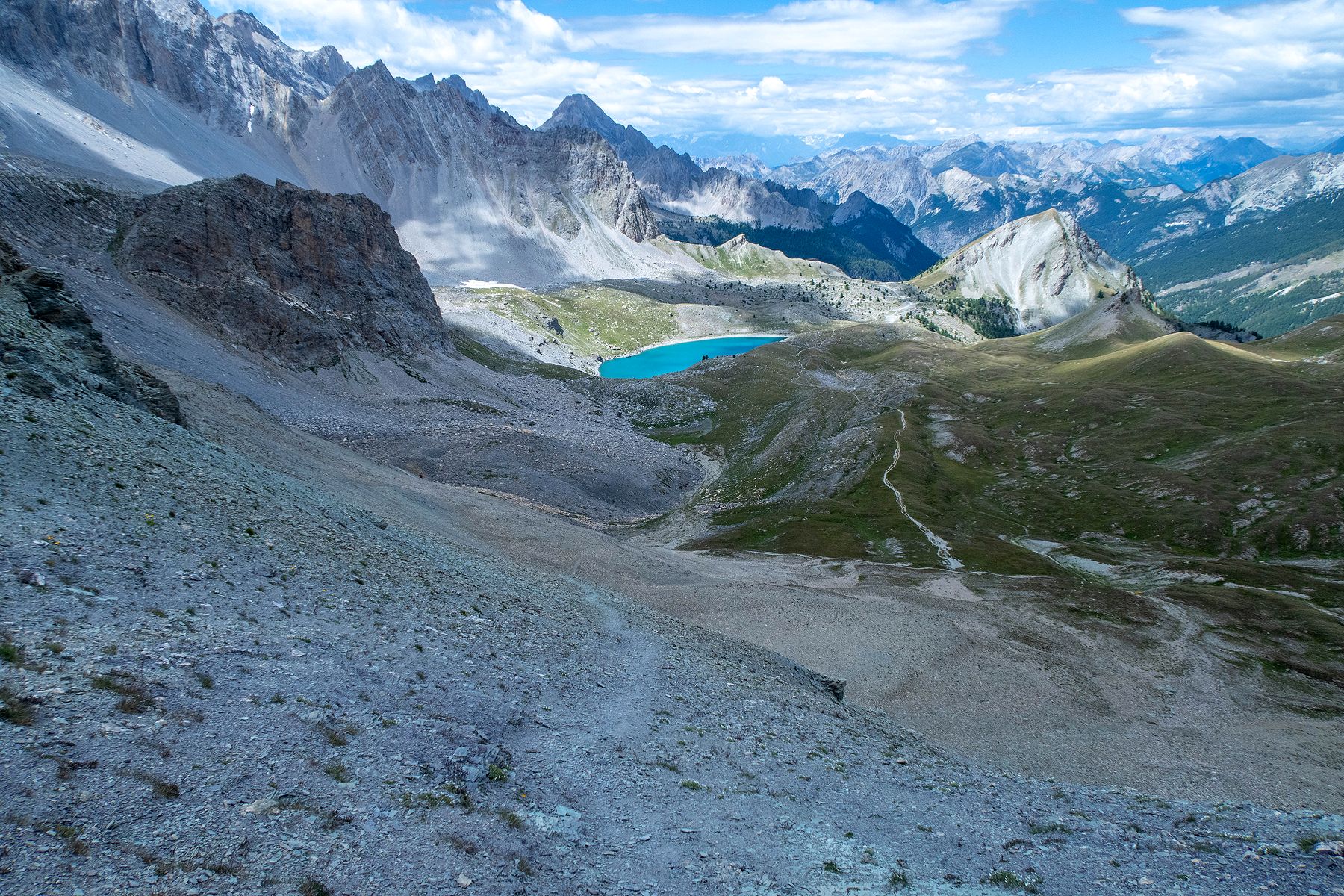 Je repars et la montée se poursuit en hauteur du lac de Saint-Anne. Encore un rayon de soleil qui me permet de profiter de sa belle couleur. Il faut remonter un vaste plateau, avec sur la gauche quelques jolies petites falaises. Toujours bien du monde ici. La pente se raidit et le sol devient minéral. Tiens des cyclistes (avec moteur) remonte cette pente. C’est étroit. Monde minéral. J’accède au col Girardin, assez venté en ce jour. La vue s’ouvre.