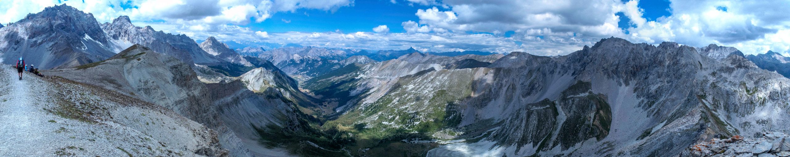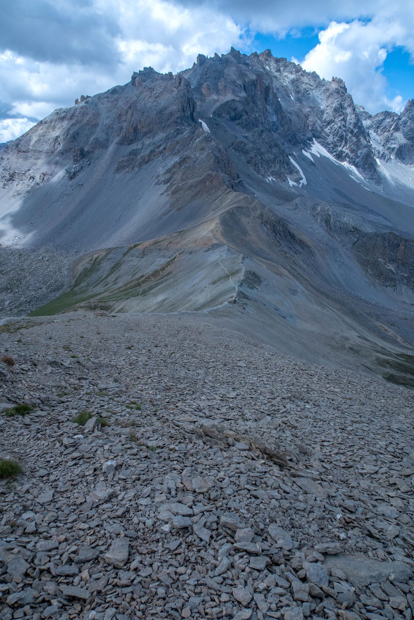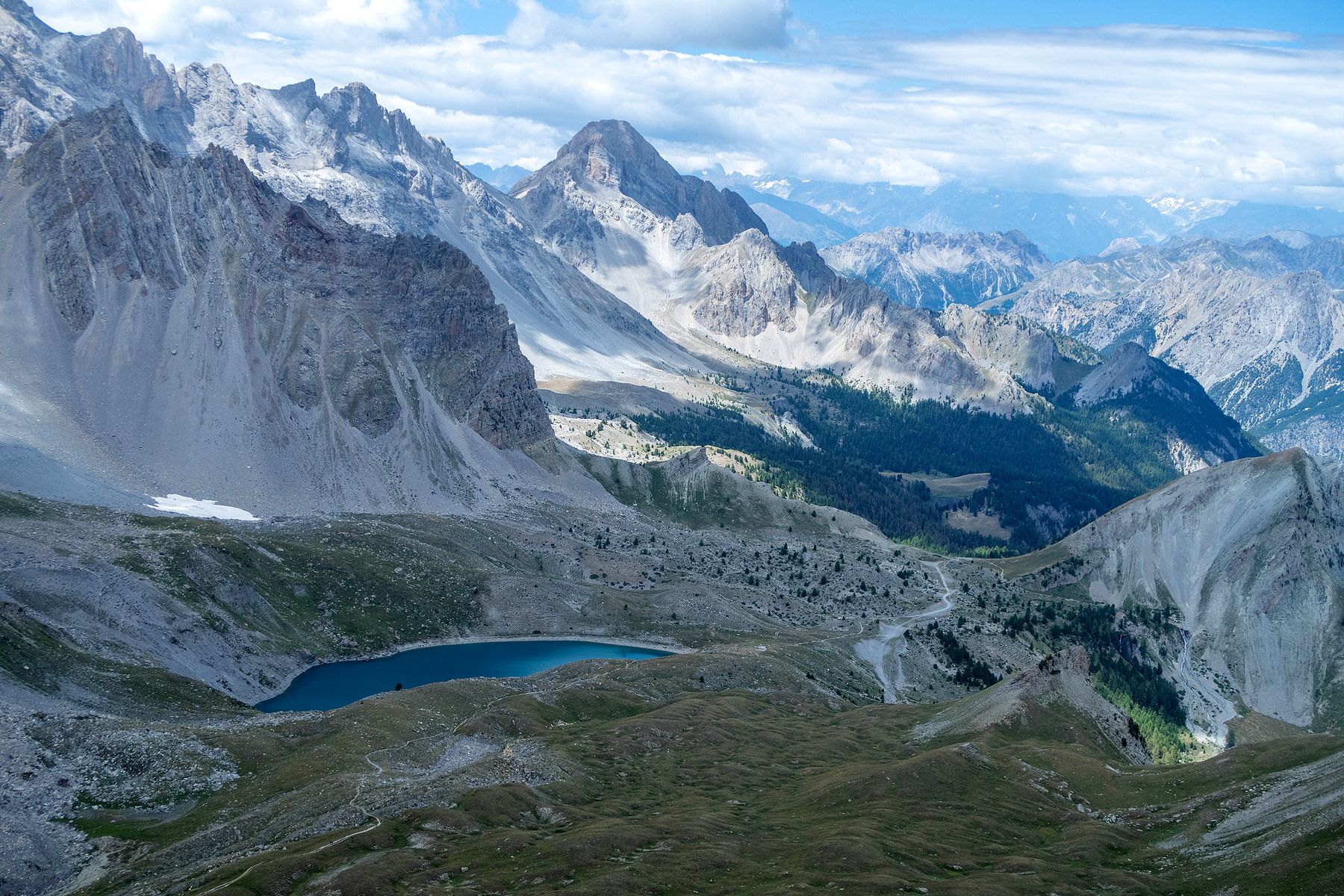 Je repars et la montée se poursuit en hauteur du lac de Saint-Anne. Encore un rayon de soleil qui me permet de profiter de sa belle couleur. Il faut remonter un vaste plateau, avec sur la gauche quelques jolies petites falaises. Toujours bien du monde ici. La pente se raidit et le sol devient minéral. Tiens des cyclistes (avec moteur) remonte cette pente. C’est étroit. Monde minéral. J’accède au col Girardin, assez venté en ce jour. La vue s’ouvre.