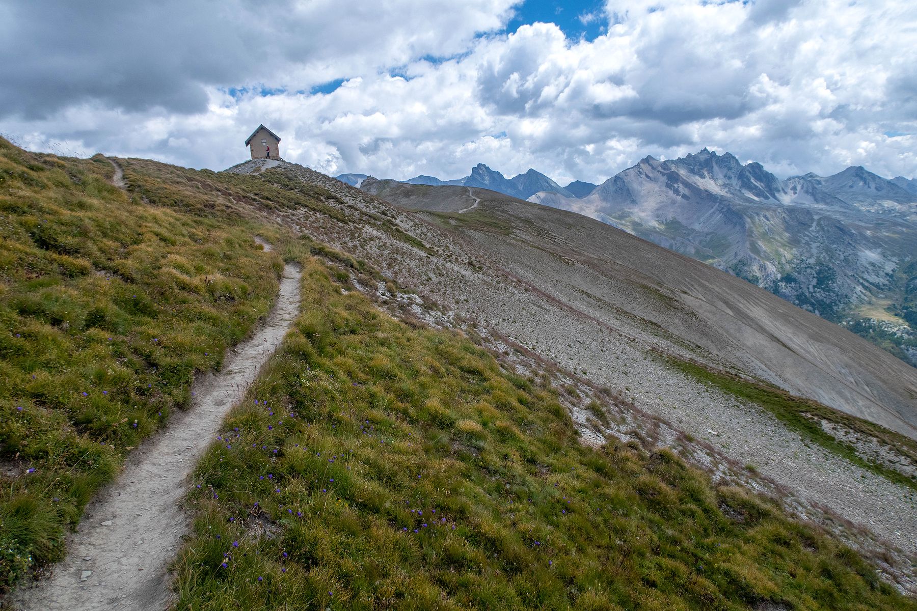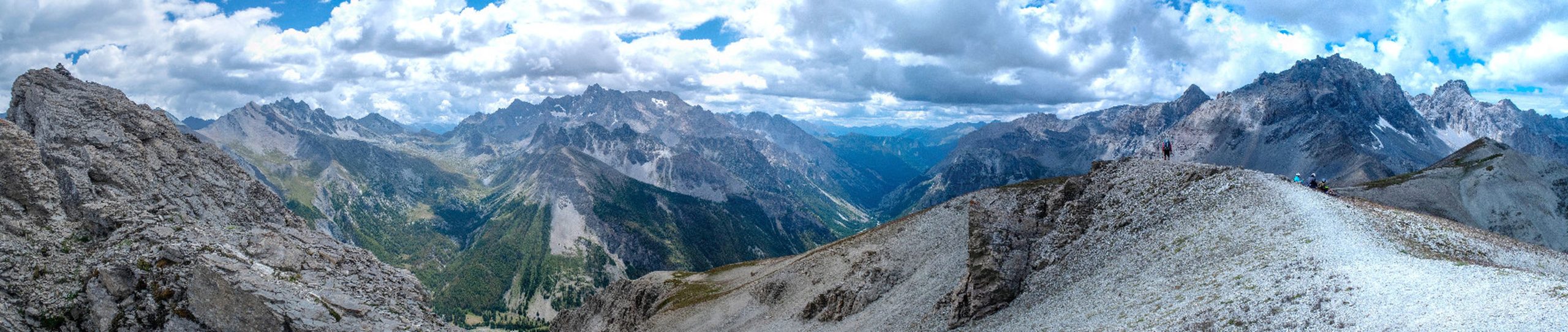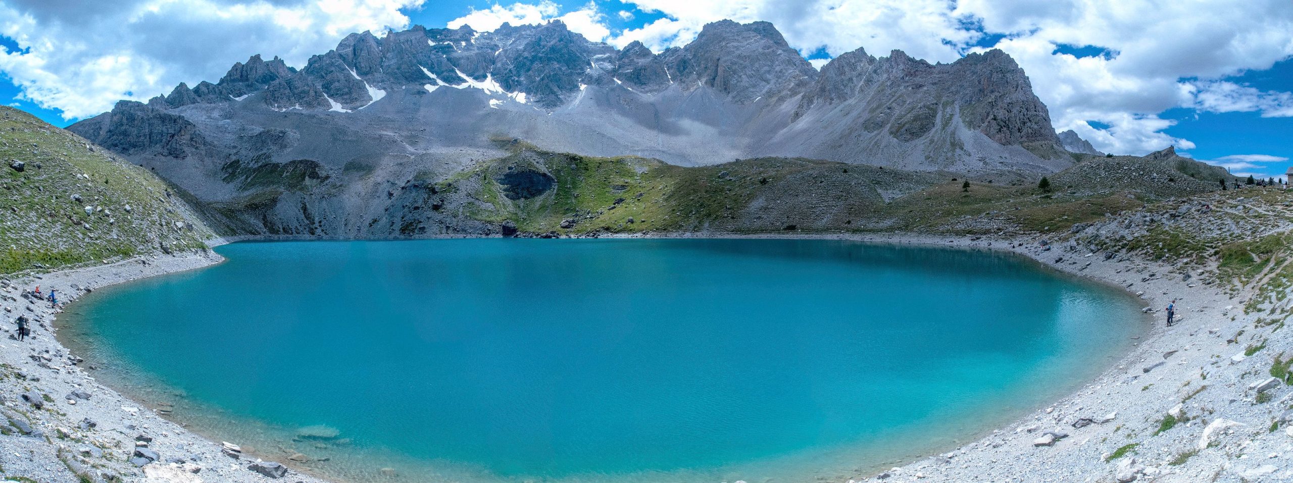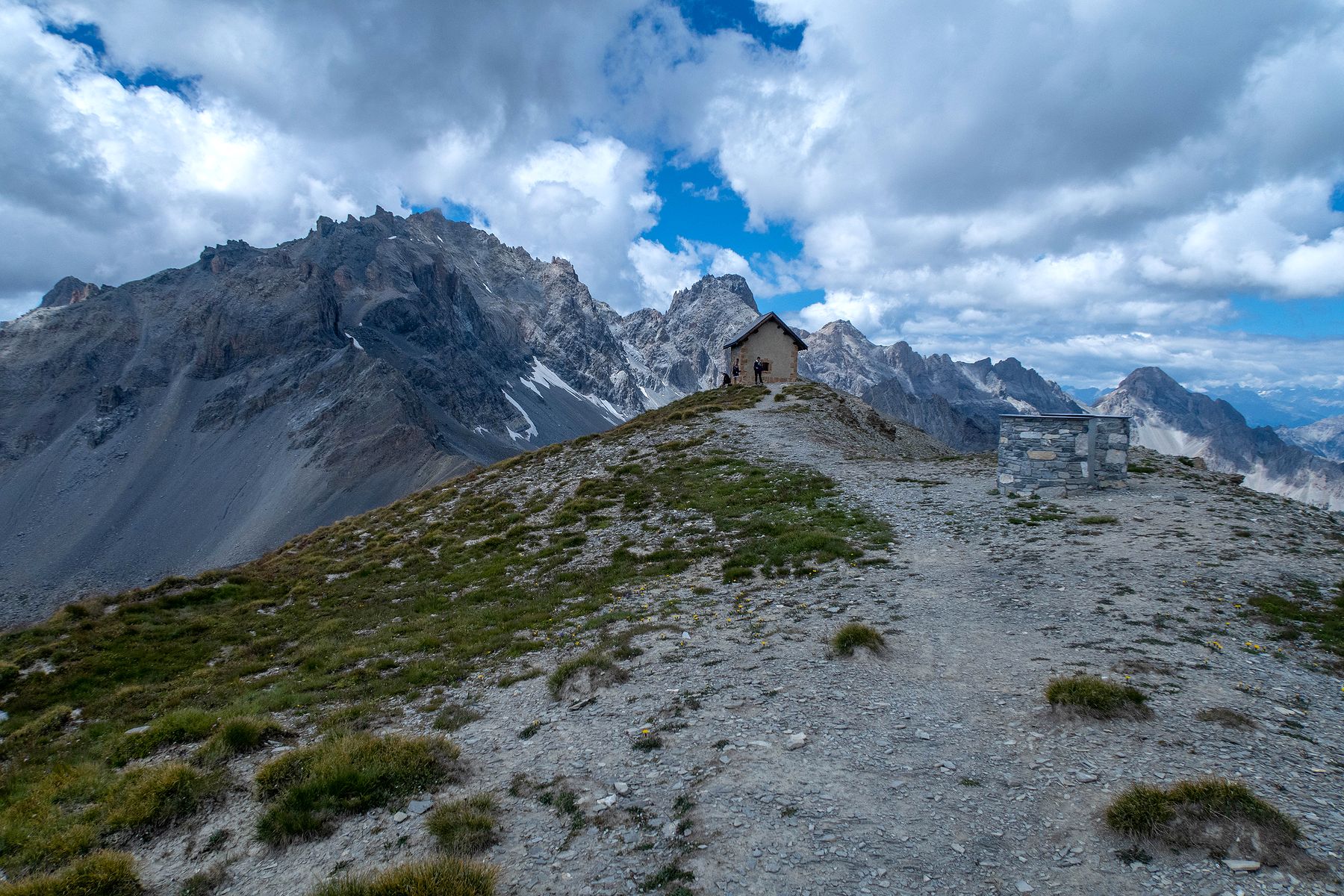 Je repars et la montée se poursuit en hauteur du lac de Saint-Anne. Encore un rayon de soleil qui me permet de profiter de sa belle couleur. Il faut remonter un vaste plateau, avec sur la gauche quelques jolies petites falaises. Toujours bien du monde ici. La pente se raidit et le sol devient minéral. Tiens des cyclistes (avec moteur) remonte cette pente. C’est étroit. Monde minéral. J’accède au col Girardin, assez venté en ce jour. La vue s’ouvre.