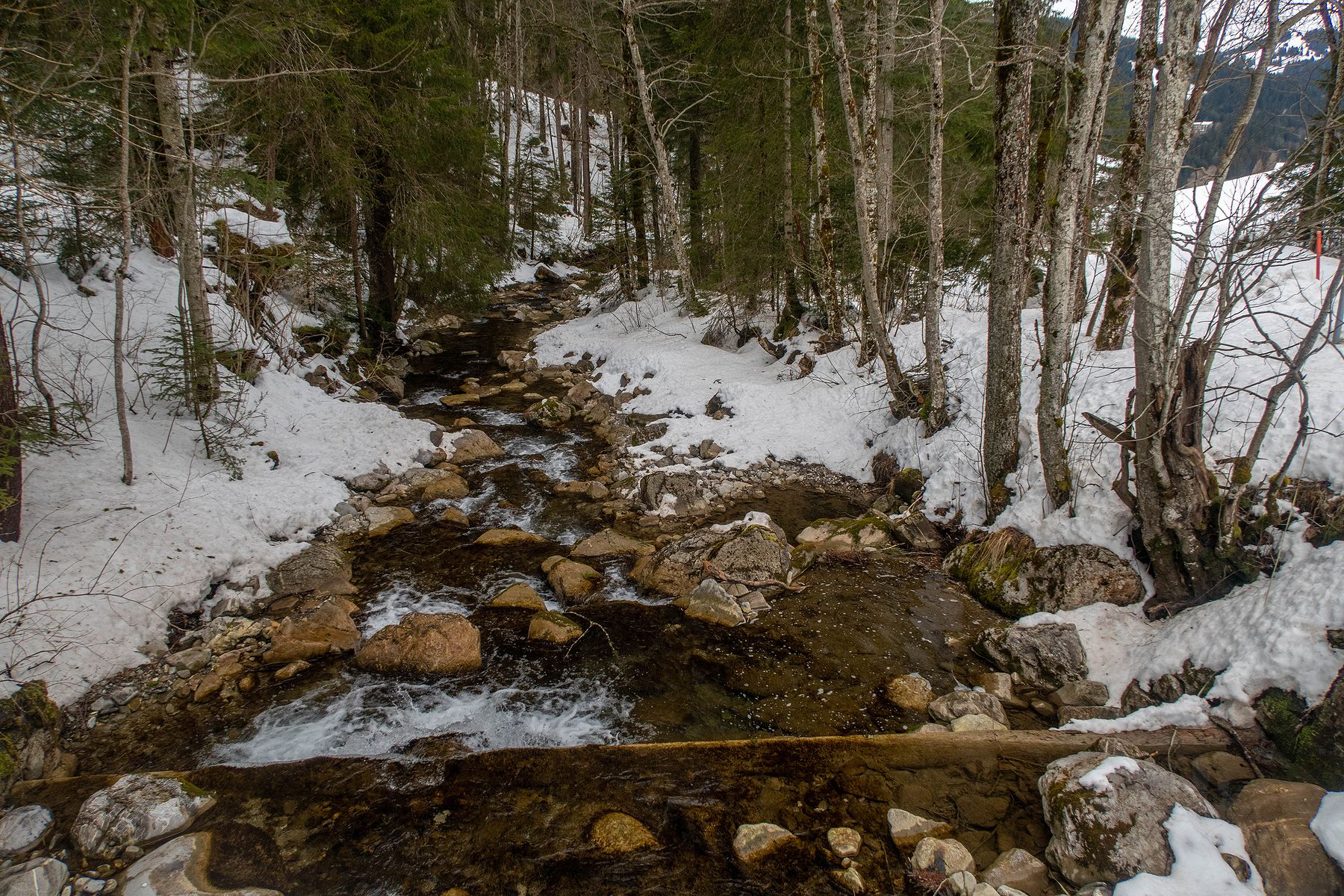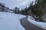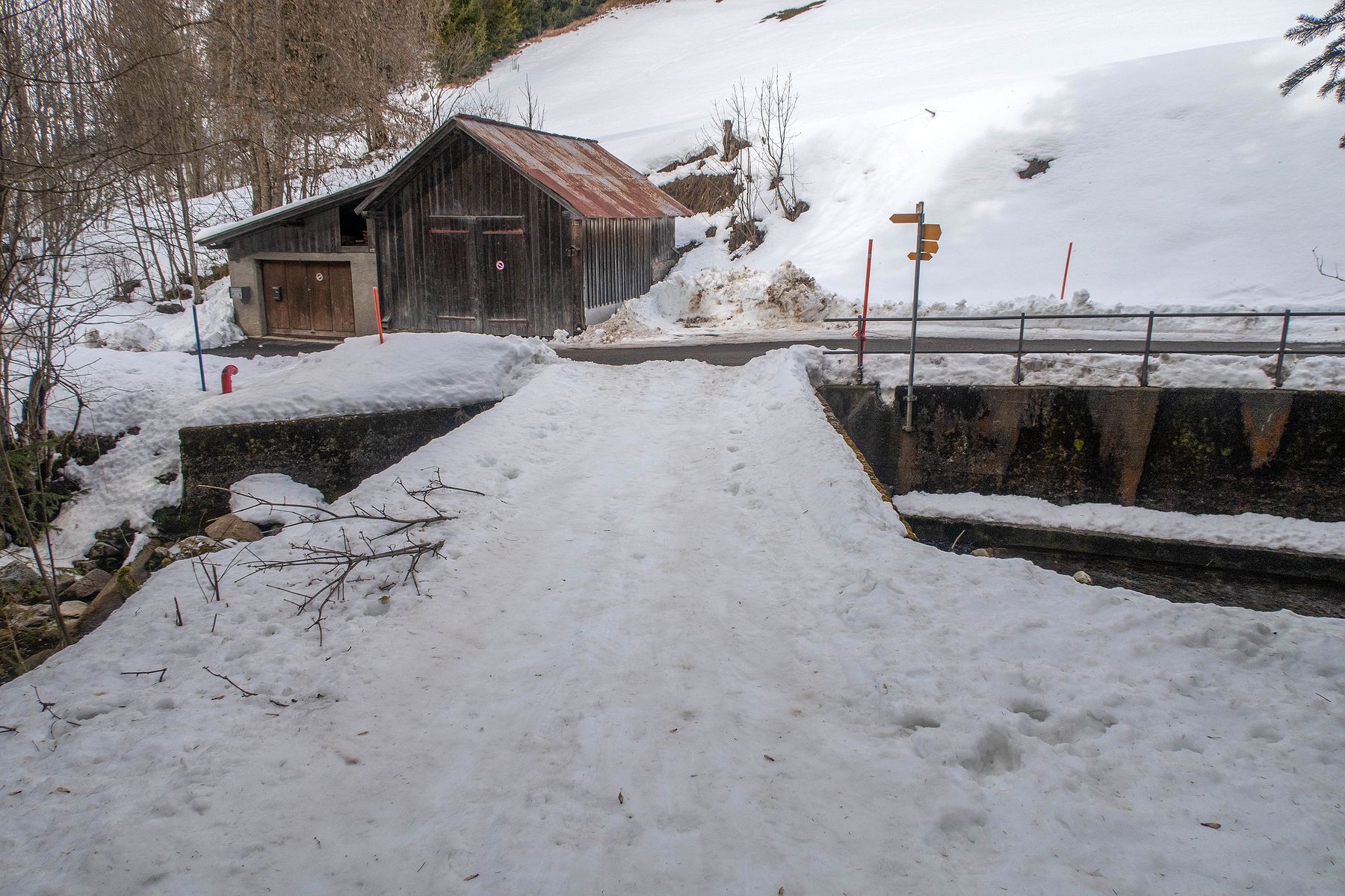 Descente avec peu de neige, donc avec attention. Je retrouve le pont qui enjambe La Torneresse. Je traverse la route et la longe en skiant. Cela me permet de revenir presque au parking en ski.