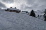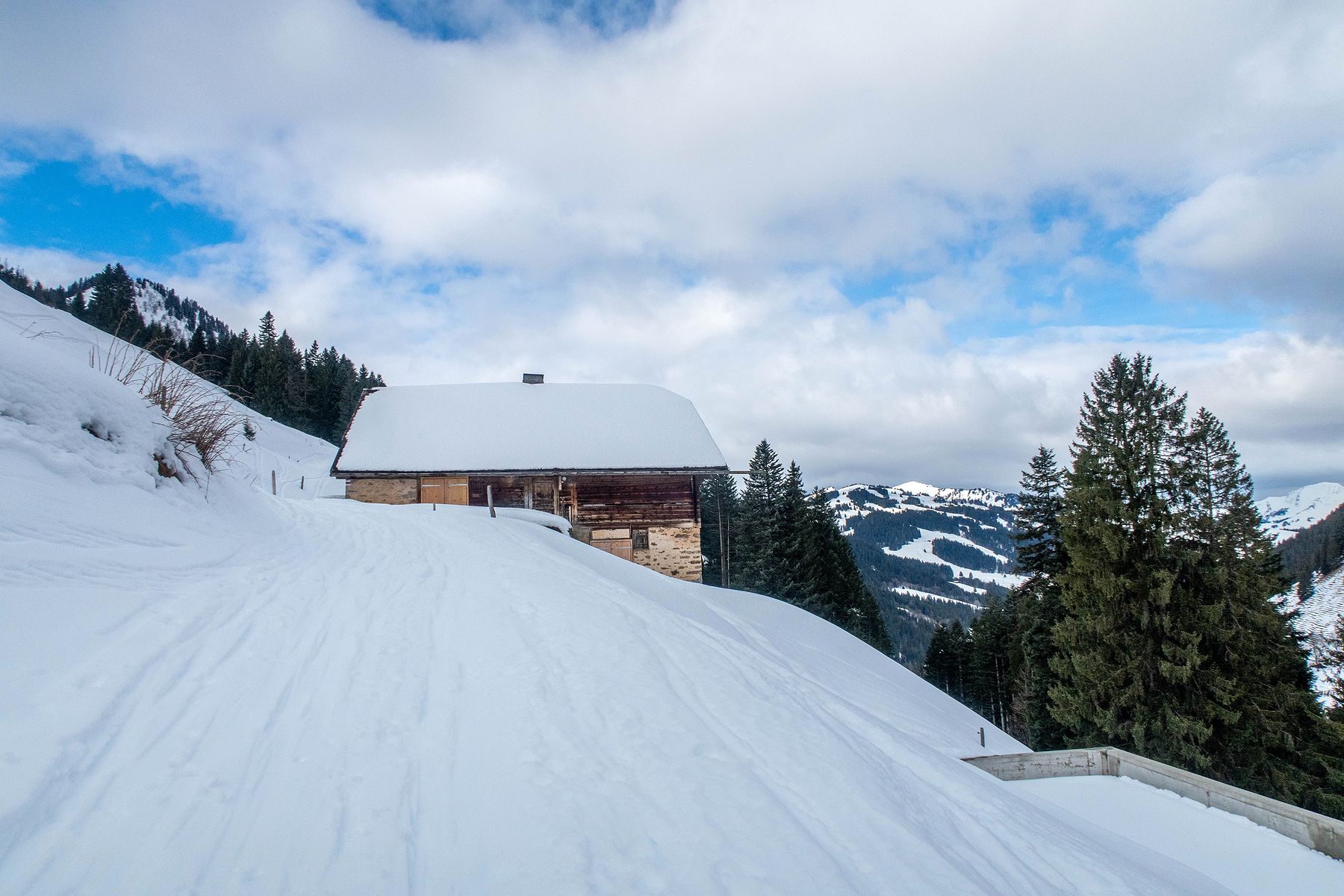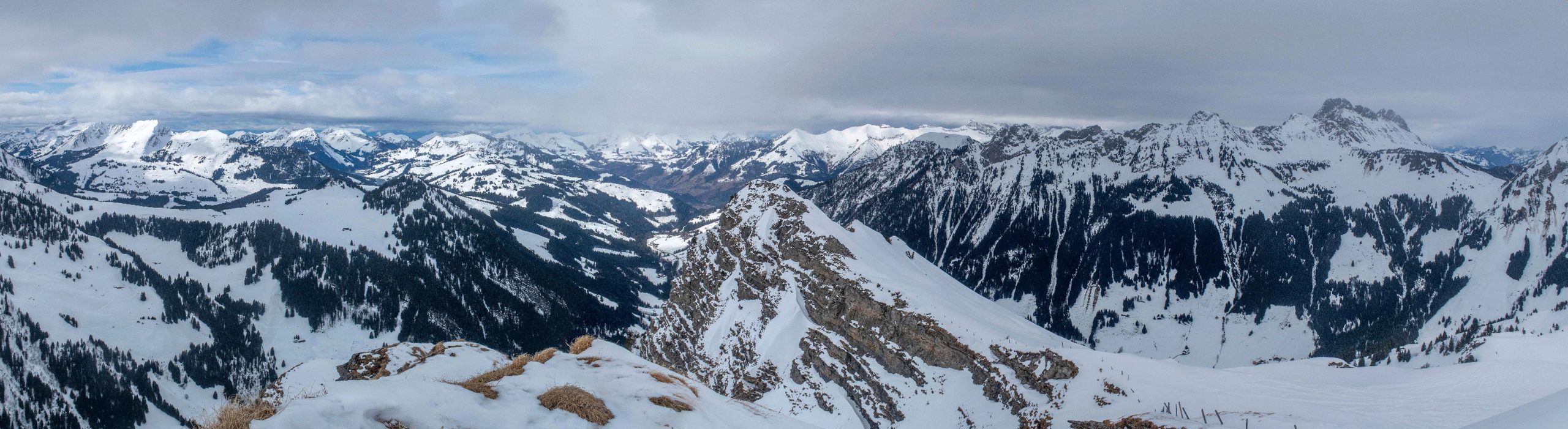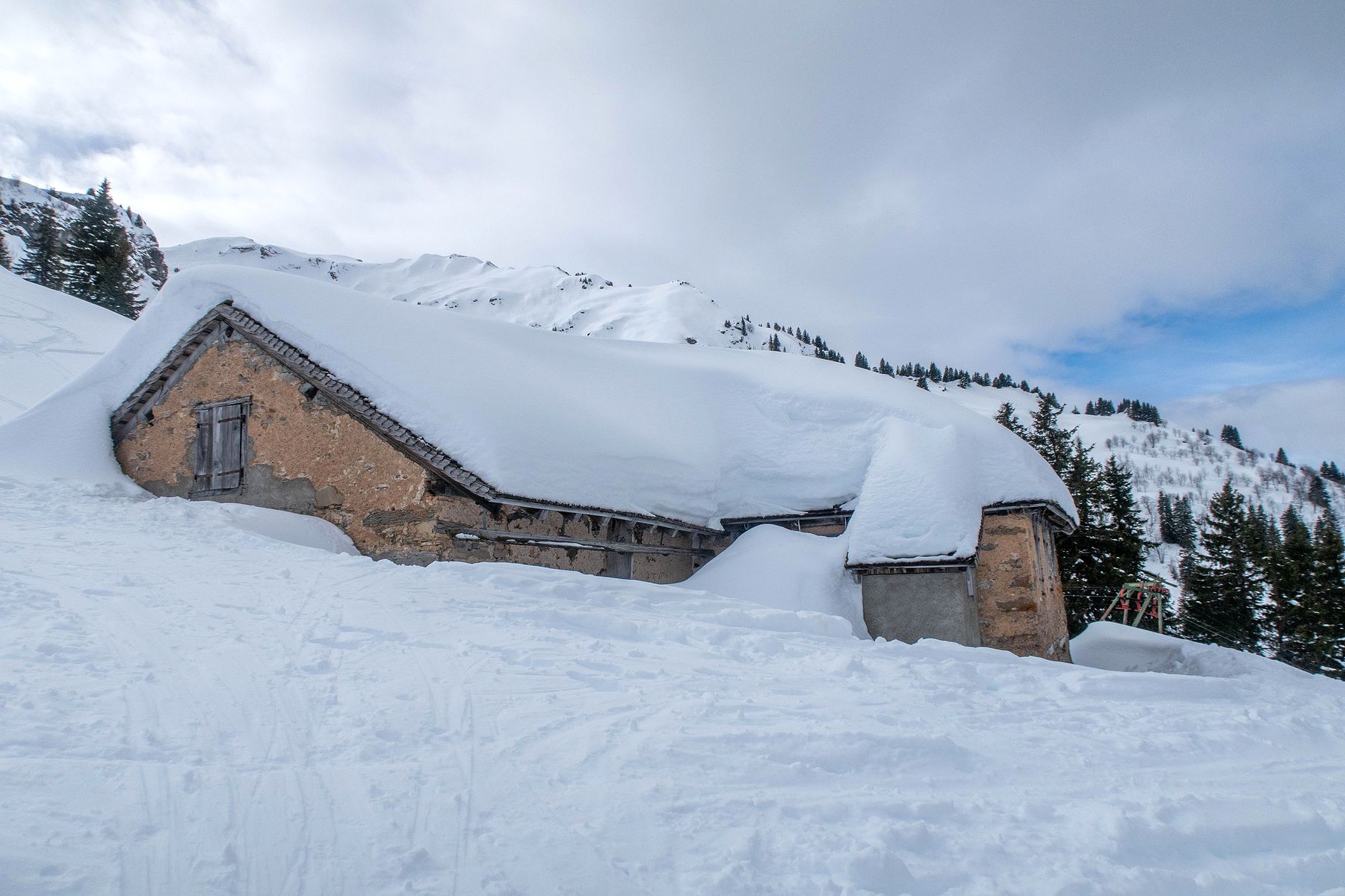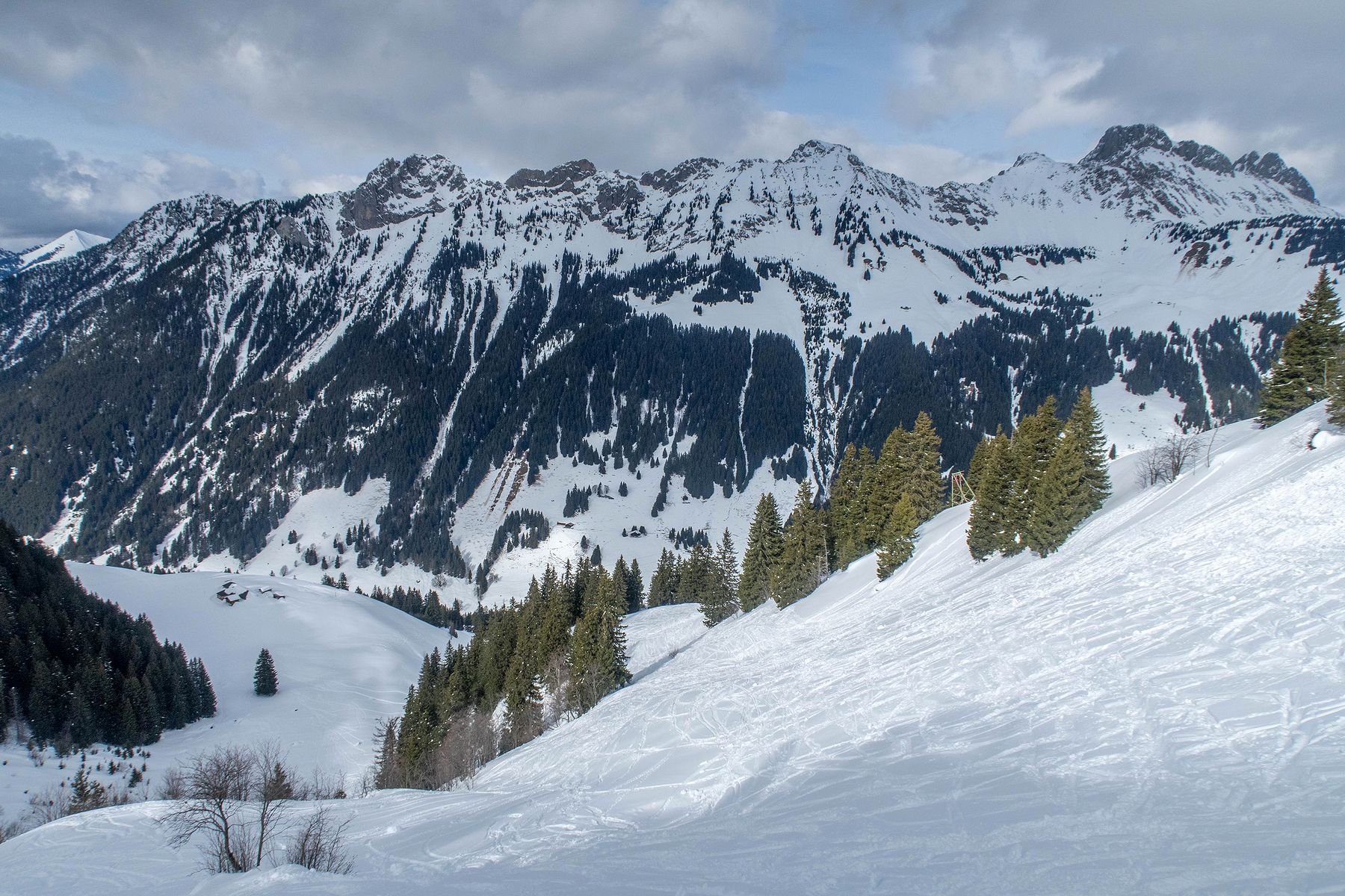 Je rentre dans le pâturage suivant. La vue s’ouvre partiellement sur la Gummflue et cie. Ciel gris avec quelques éclaircies. Joli quand même. J’atteins la ferme des Croset, avec son monte-charge. Je croise un skieur qui descend et après un bel échange, je gagne de l’information pour la descente.