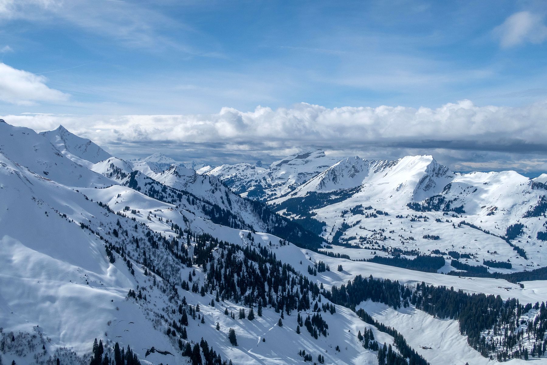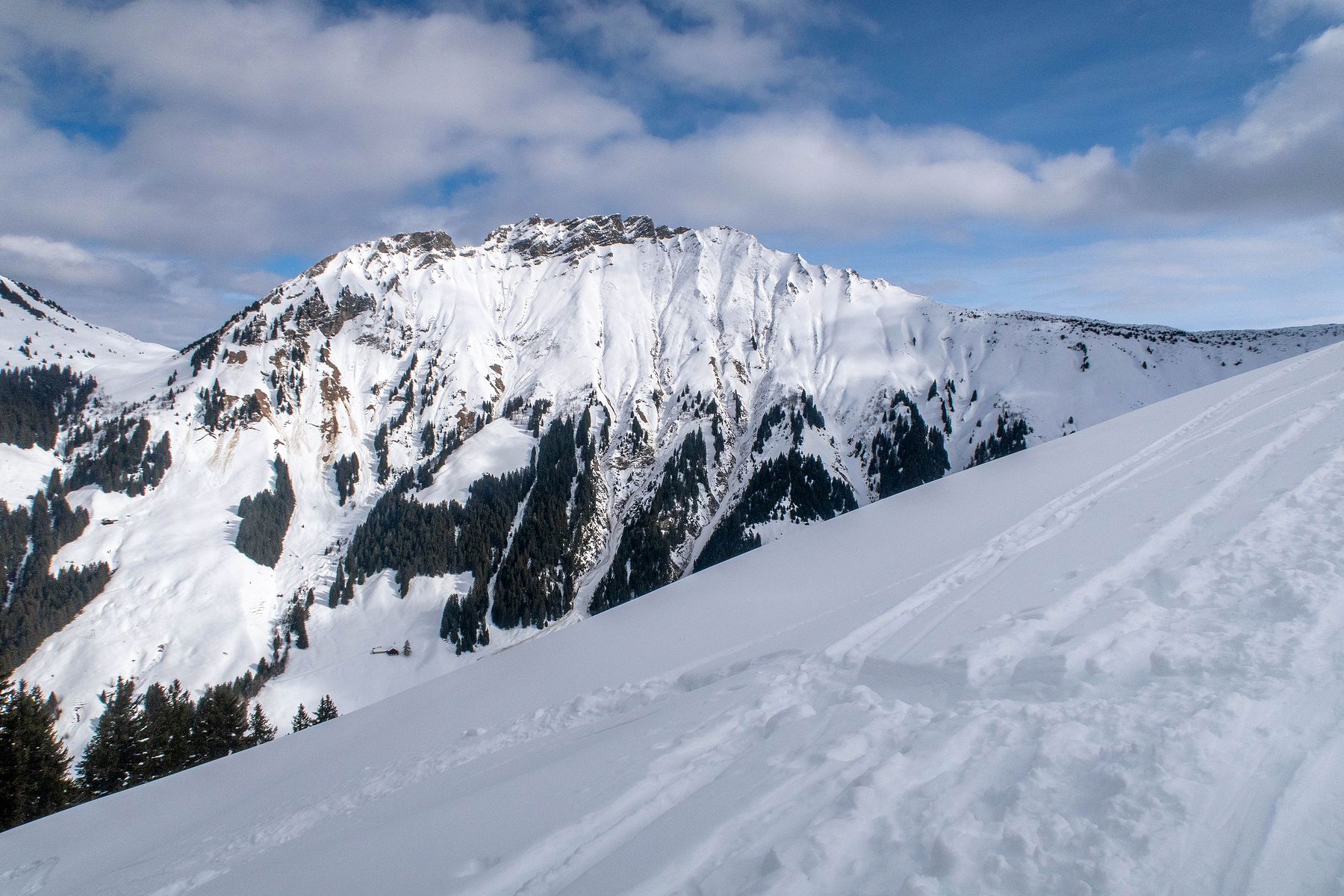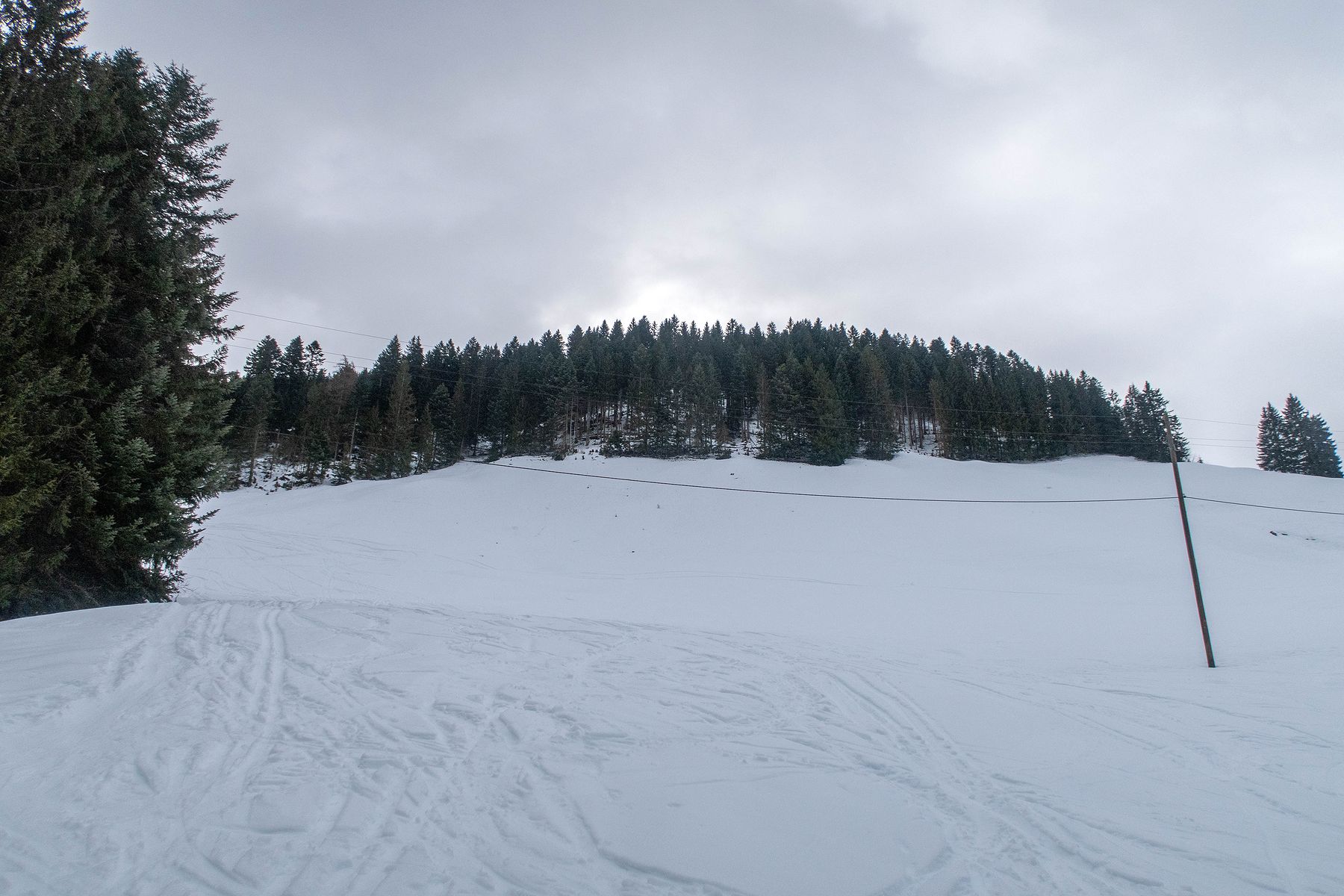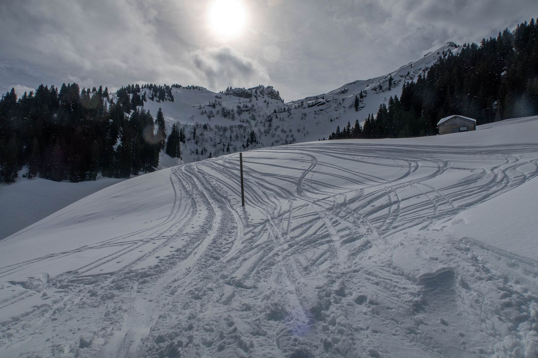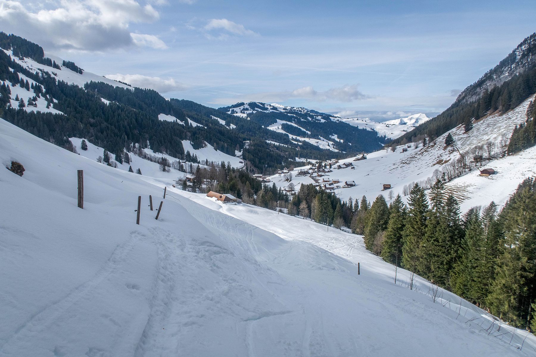 Je rentre dans le pâturage suivant. La vue s’ouvre partiellement sur la Gummflue et cie. Ciel gris avec quelques éclaircies. Joli quand même. J’atteins la ferme des Croset, avec son monte-charge. Je croise un skieur qui descend et après un bel échange, je gagne de l’information pour la descente.