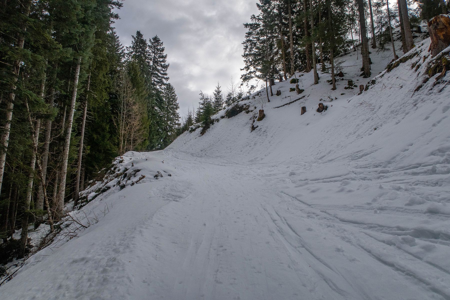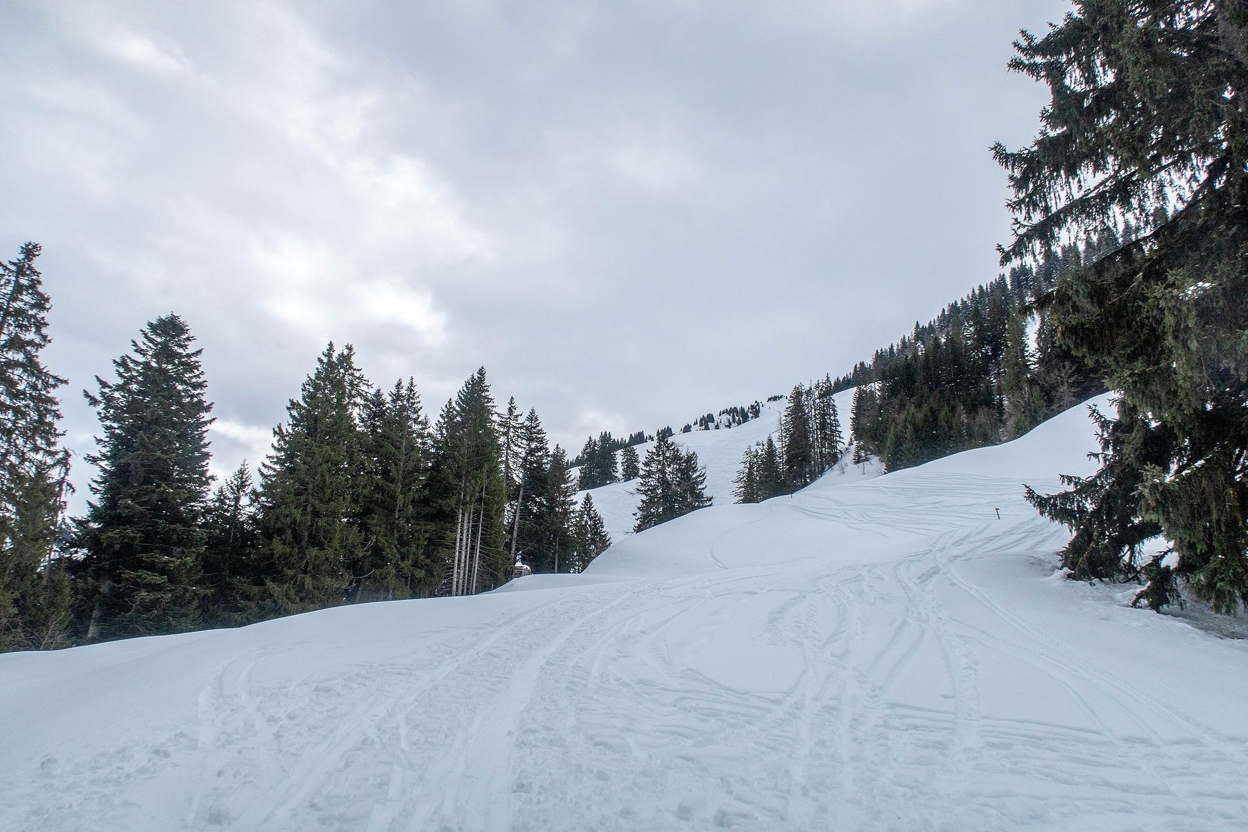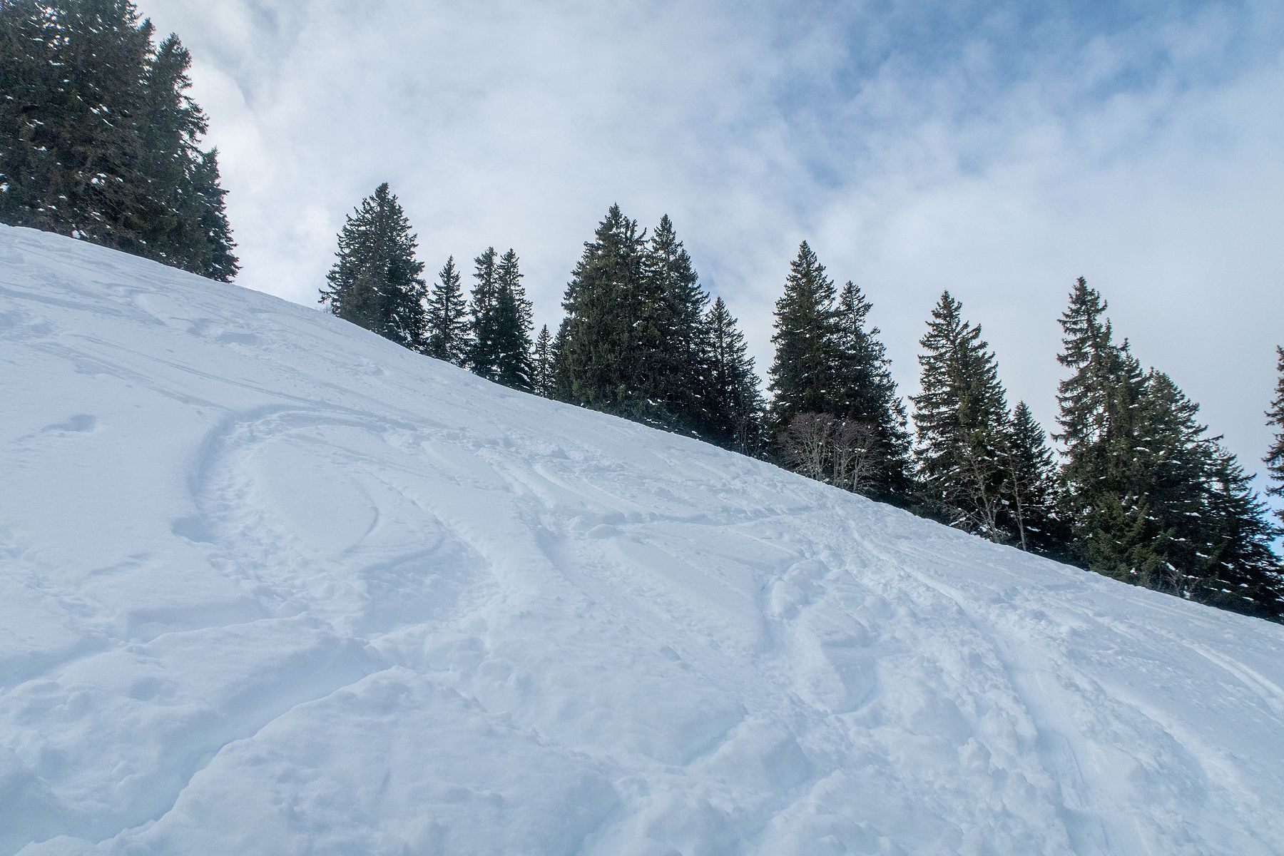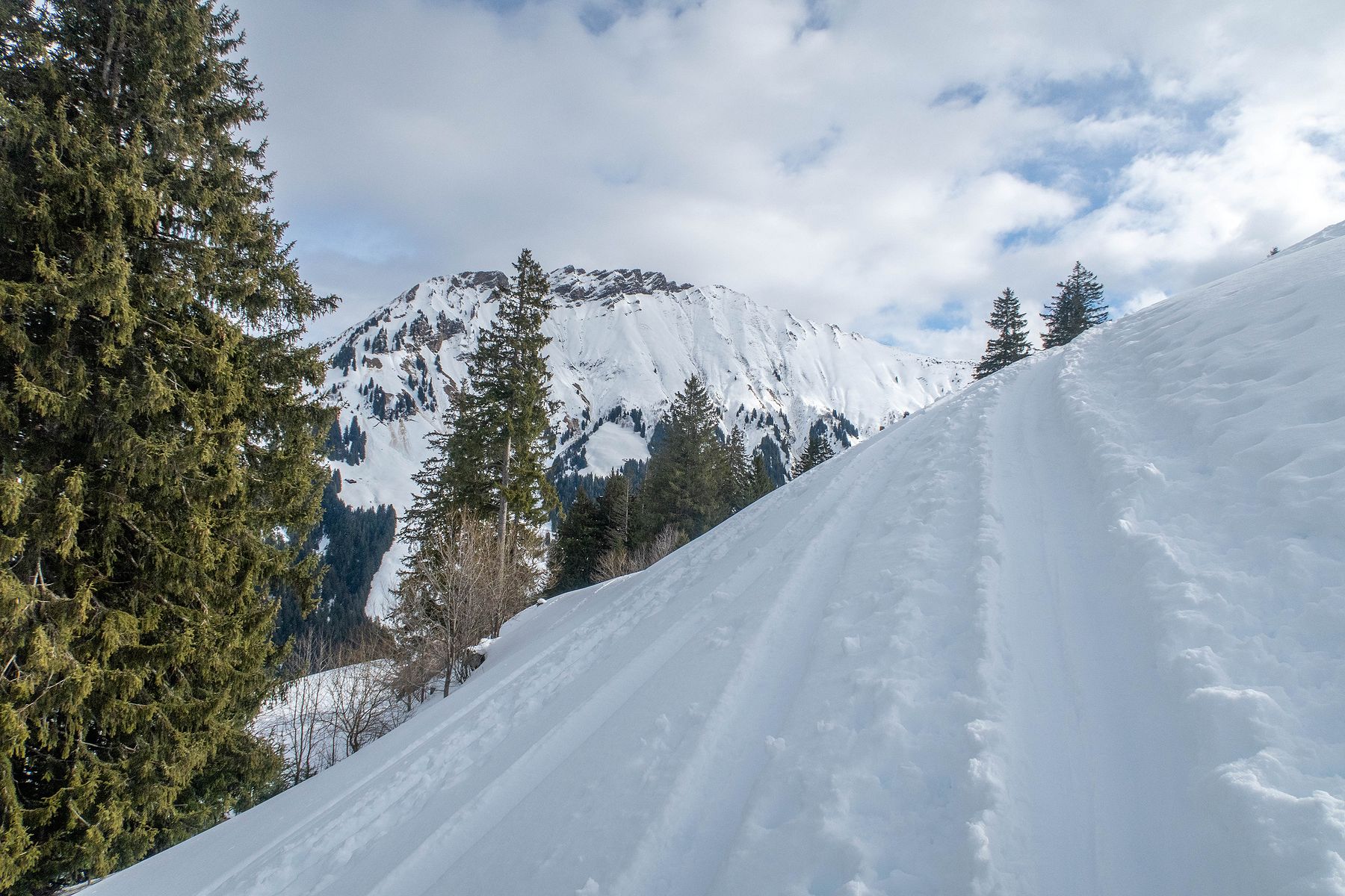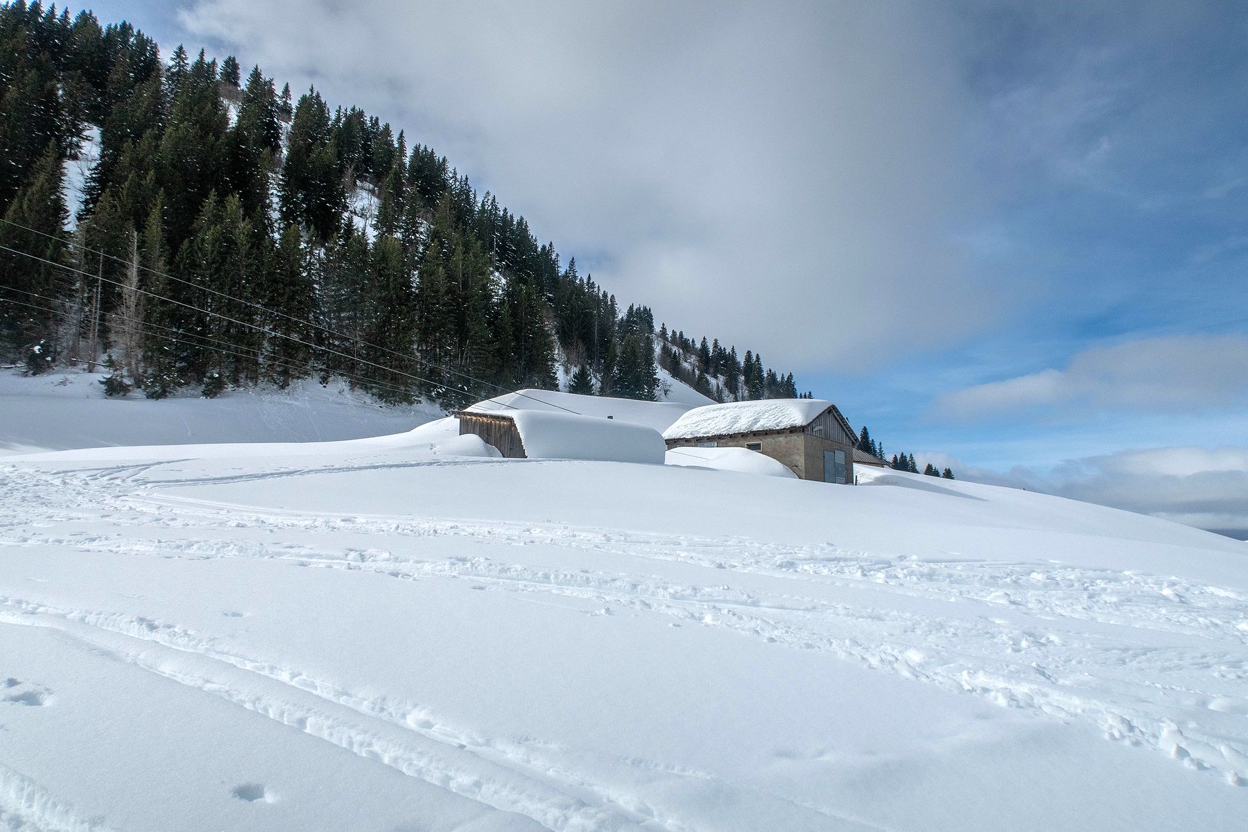 Je retrouve la route qui file en forêt ensuite le pâturage de de Pâquier Geneyne. Je coupe dans le pâturage, la neige est vraiment lourde. Mes skis n’accrochent plus et je déclenche une petite coulée. Je rejoins au mieux la route et la ferme de Pâquier Geneyne.