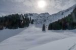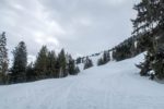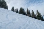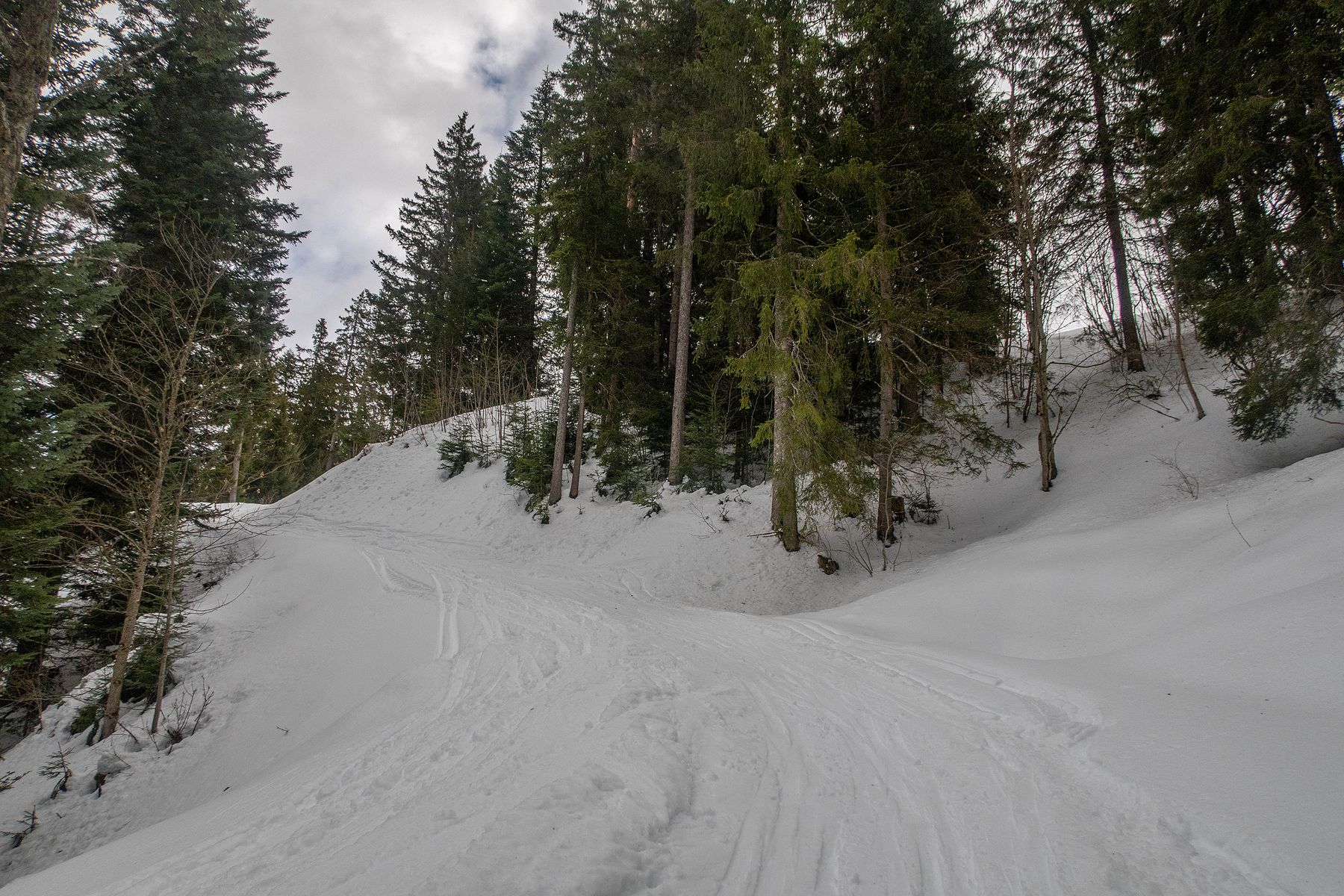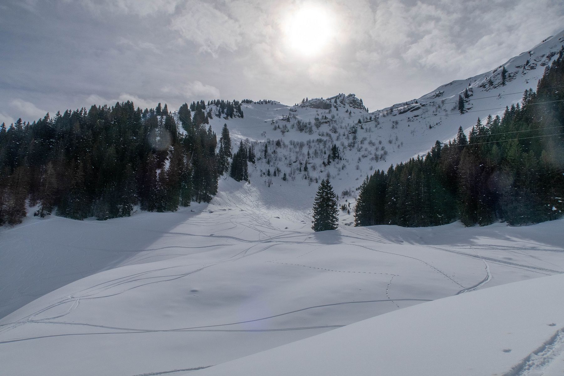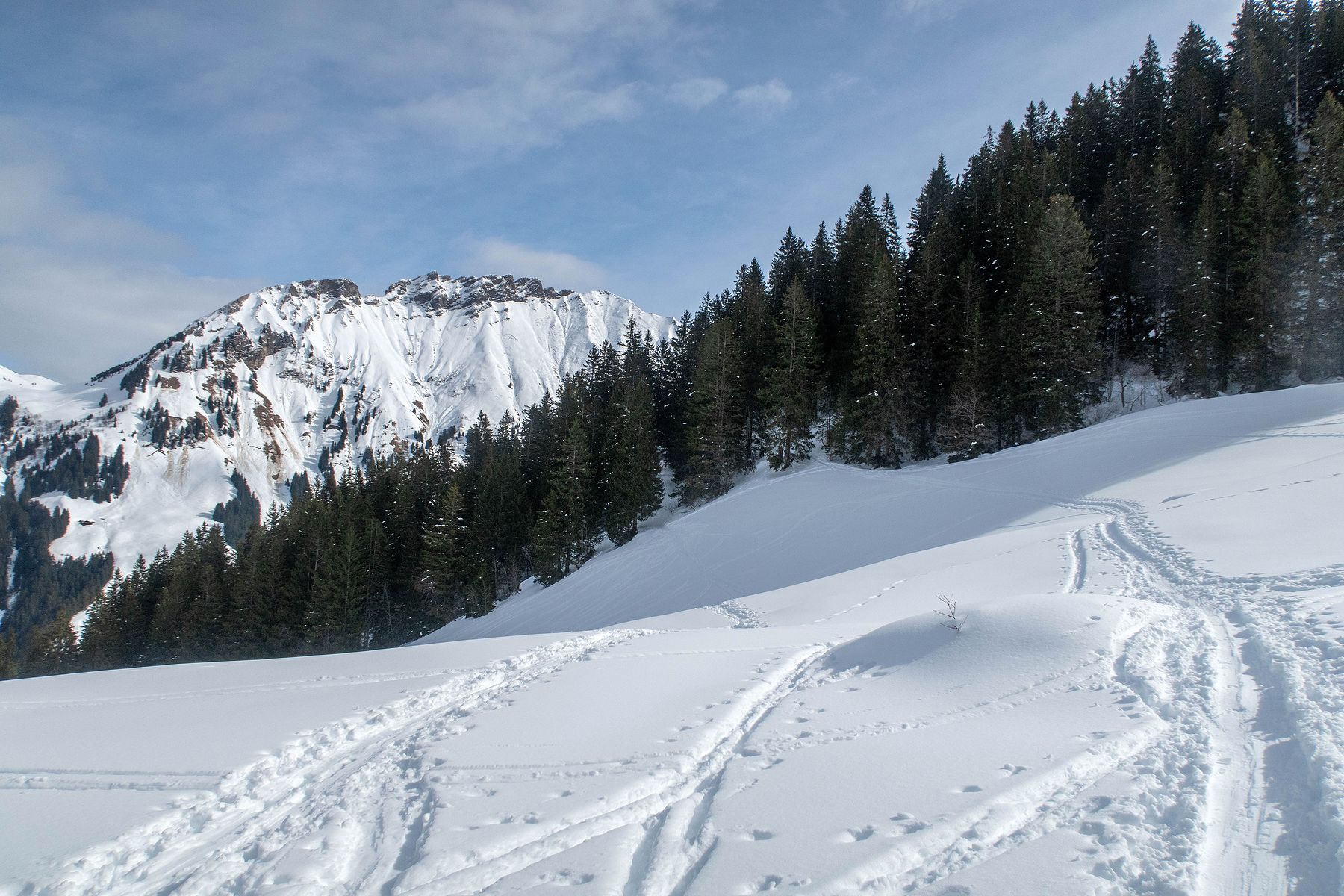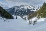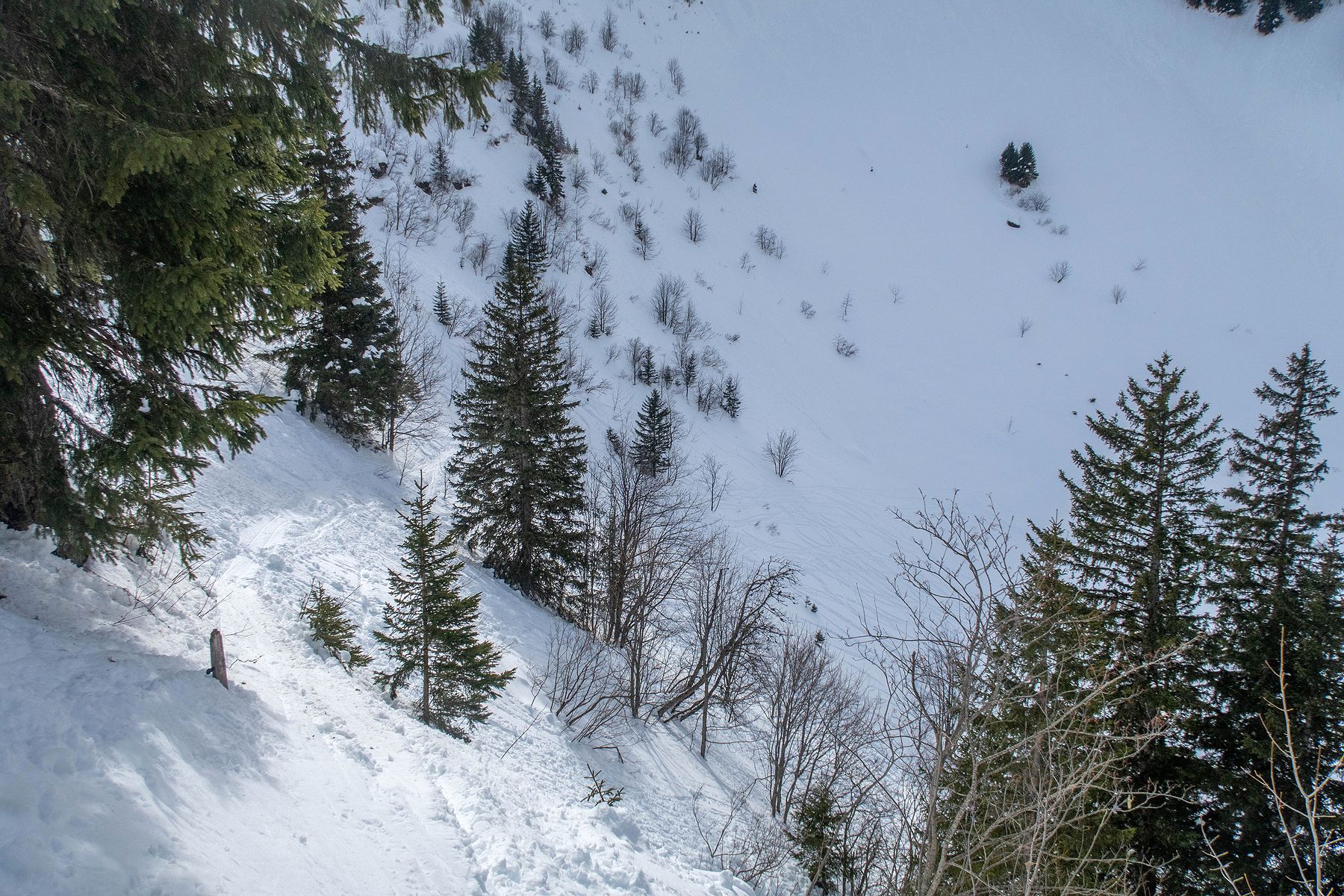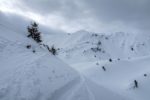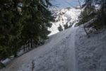 Après une bonne pause, j’amorce la descente. La neige est lourde et je skie donc doucement. Je descends en partie dans la face E puis file dans les pentes au N. Ce secteur a du charme. Je descends dans ces pentes, au N. Je cherche une meilleure neige, mais que de la neige lourde. Je passe un petit col ensuite, je file en travers. Quelques arbustes. C’est agréable. Je rejoins un couloir. Tiens il y a des coulées