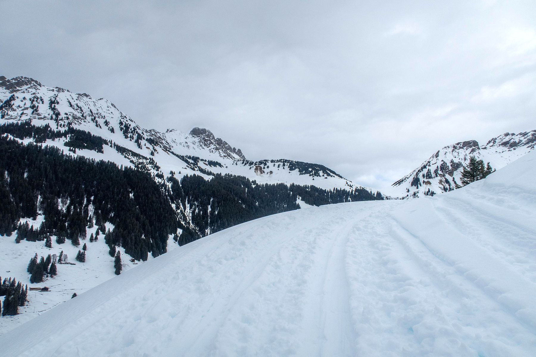 Je me gare à l’Etivaz, juste après le Contour, le long de la route, il y a un grand parking. Je pars à ski, après une petite marche. Il y a assez de neige dans le pâturage pour longer la route en ski.