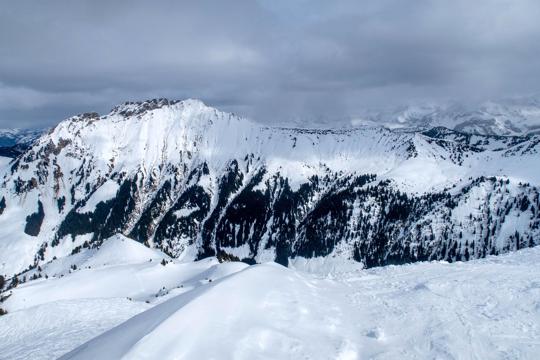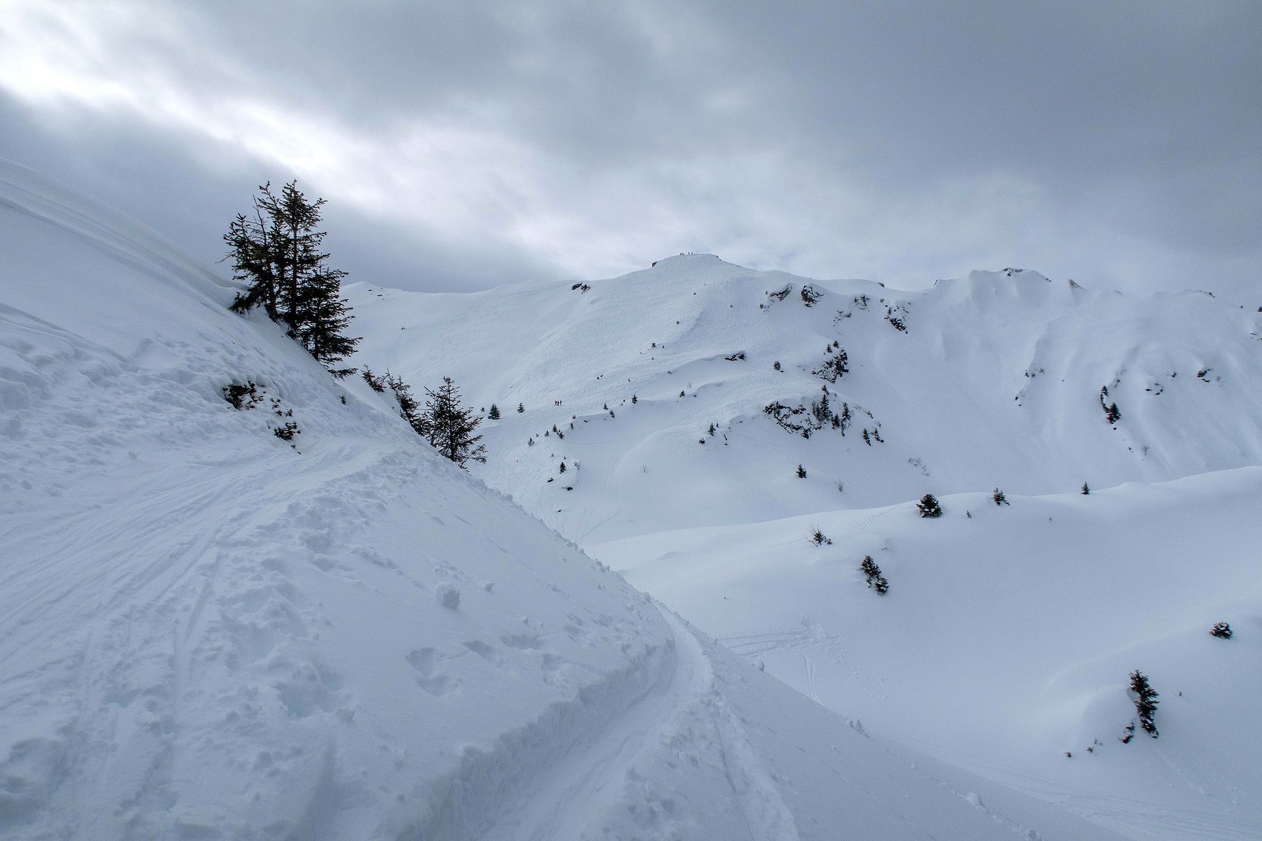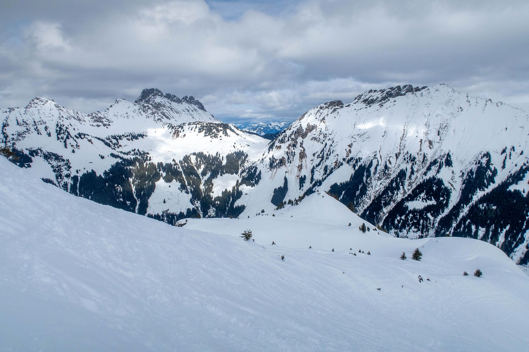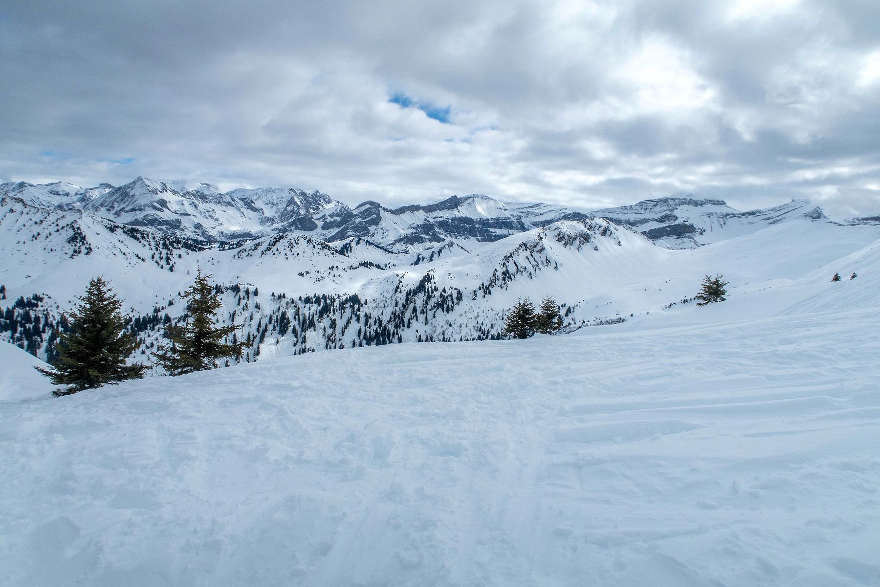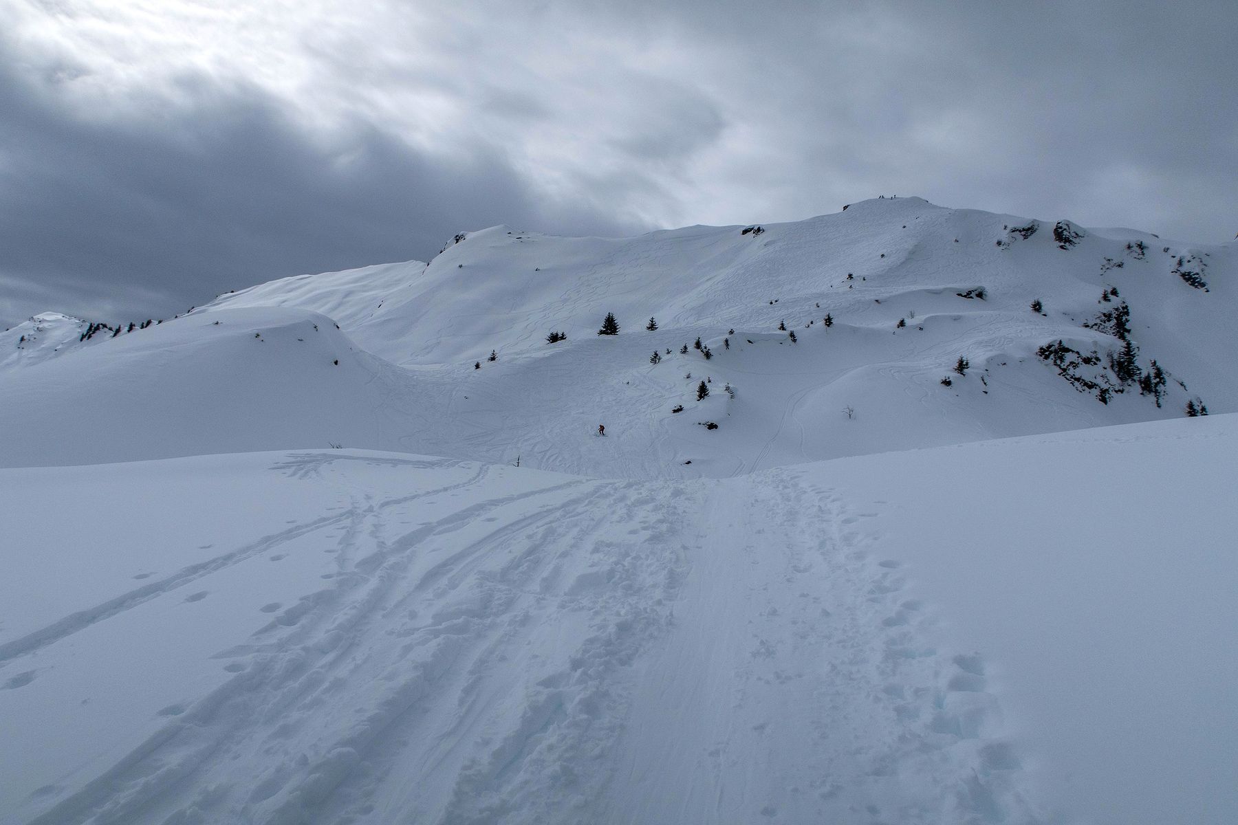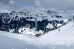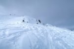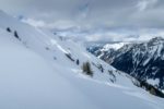 Je poursuis et prends de la hauteur. C’est pentu, plusieurs conversions sont nécessaires. Je rejoins un sommet sans nom, au Pt1980. Je pars en dévers et il faut ensuite redescendre à un petit col. Descente pentue et peu pratique avec les peaux sous les skis. Sur la gauche, c’est le secteur des Diablerets. La vue se voile.