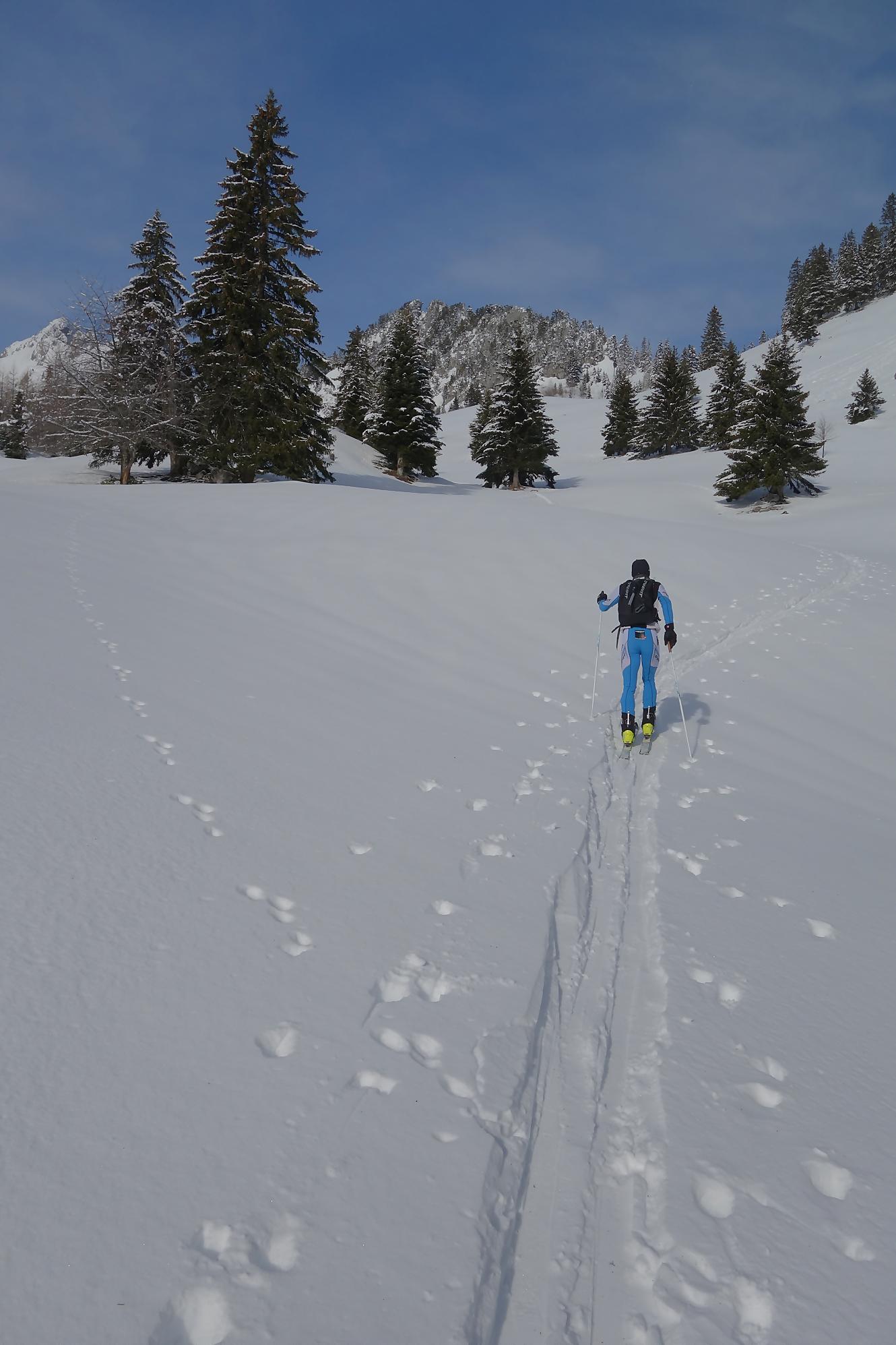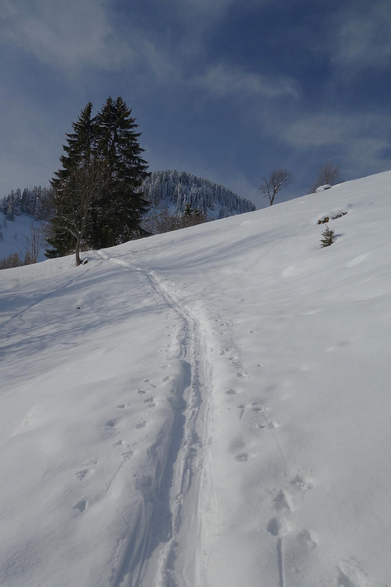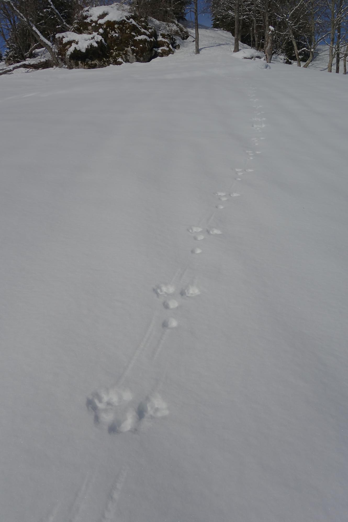 Haut de Torgon, Plan la Jeux, je suis d’attaque au matin. Il y a une inversion de température, il fait plus doux en montagne, +2°c, grand ciel bleu. Les affaires se portent bien. Départ en douceur dans ces pâturages, puis traversée de la forêt. On se retrouve à nouveau dans les pâturages au-dessus de Dravers. C’est joli, le lièvre a gambadé et ses traces sont nombreuses. Mais point vu de crottes ! Le chamois ou chevreuil (neige trop fraiche pour la détermination exacte) a brouté les bourgeons qui sont déjà en train de bourgeonner !