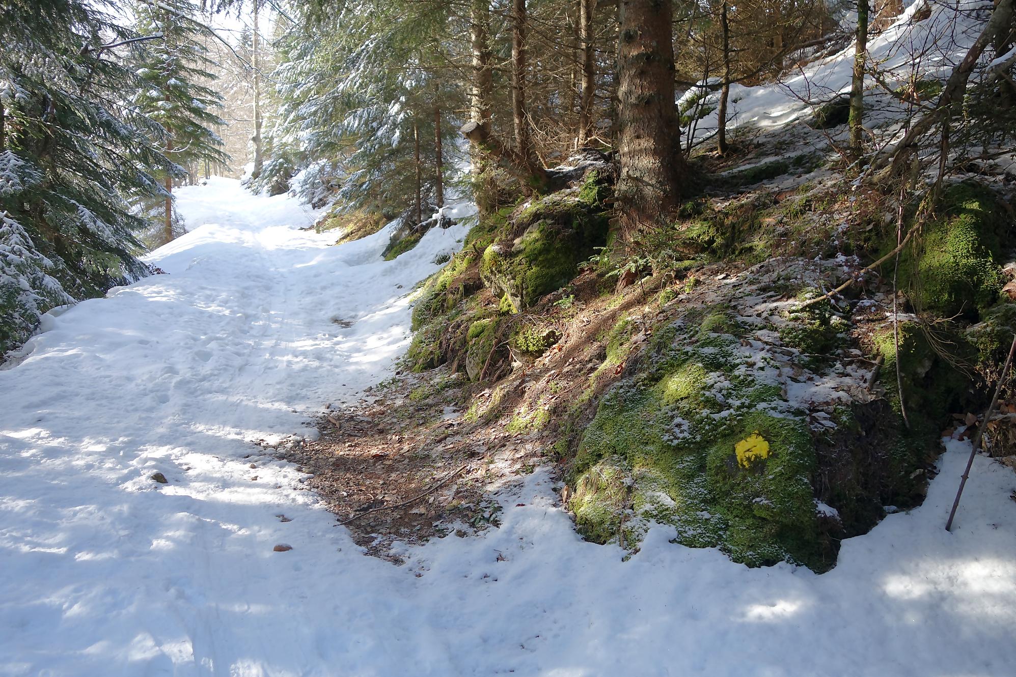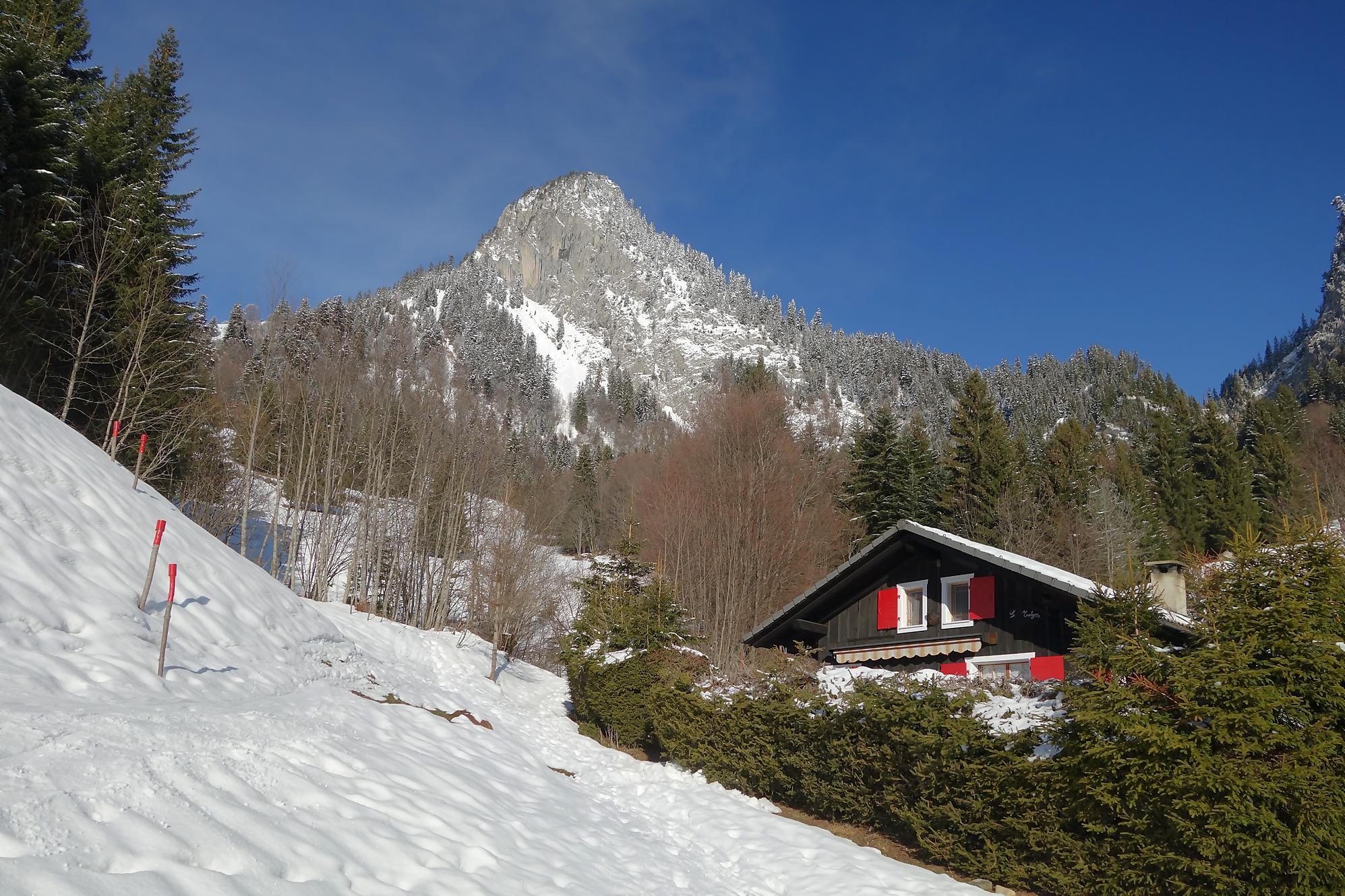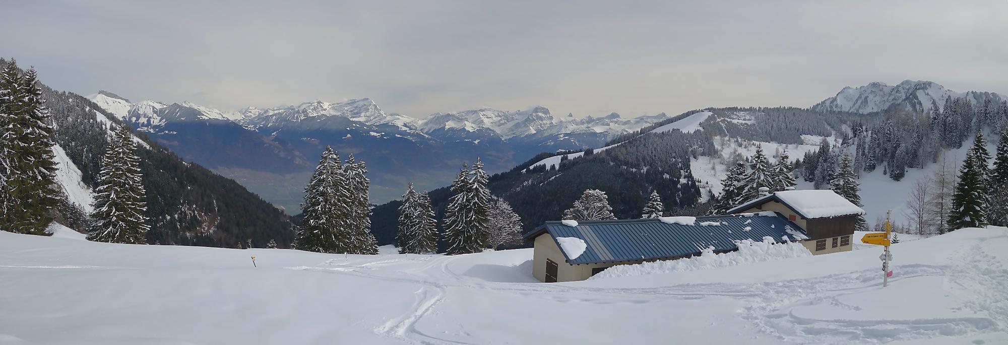 Haut de Torgon, Plan la Jeux, je suis d’attaque au matin. Il y a une inversion de température, il fait plus doux en montagne, +2°c, grand ciel bleu. Les affaires se portent bien. Départ en douceur dans ces pâturages, puis traversée de la forêt. On se retrouve à nouveau dans les pâturages au-dessus de Dravers. C’est joli, le lièvre a gambadé et ses traces sont nombreuses. Mais point vu de crottes ! Le chamois ou chevreuil (neige trop fraiche pour la détermination exacte) a brouté les bourgeons qui sont déjà en train de bourgeonner !