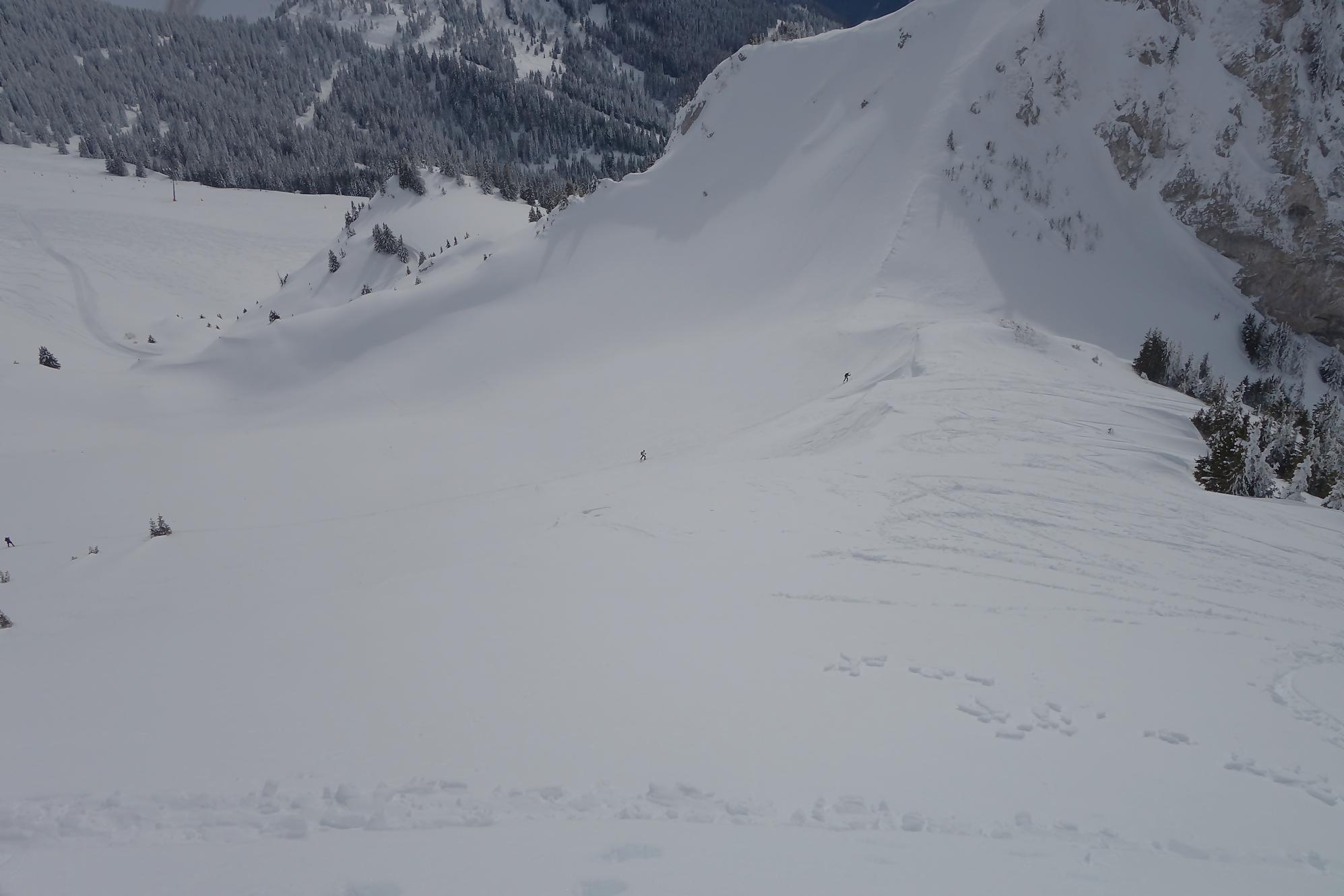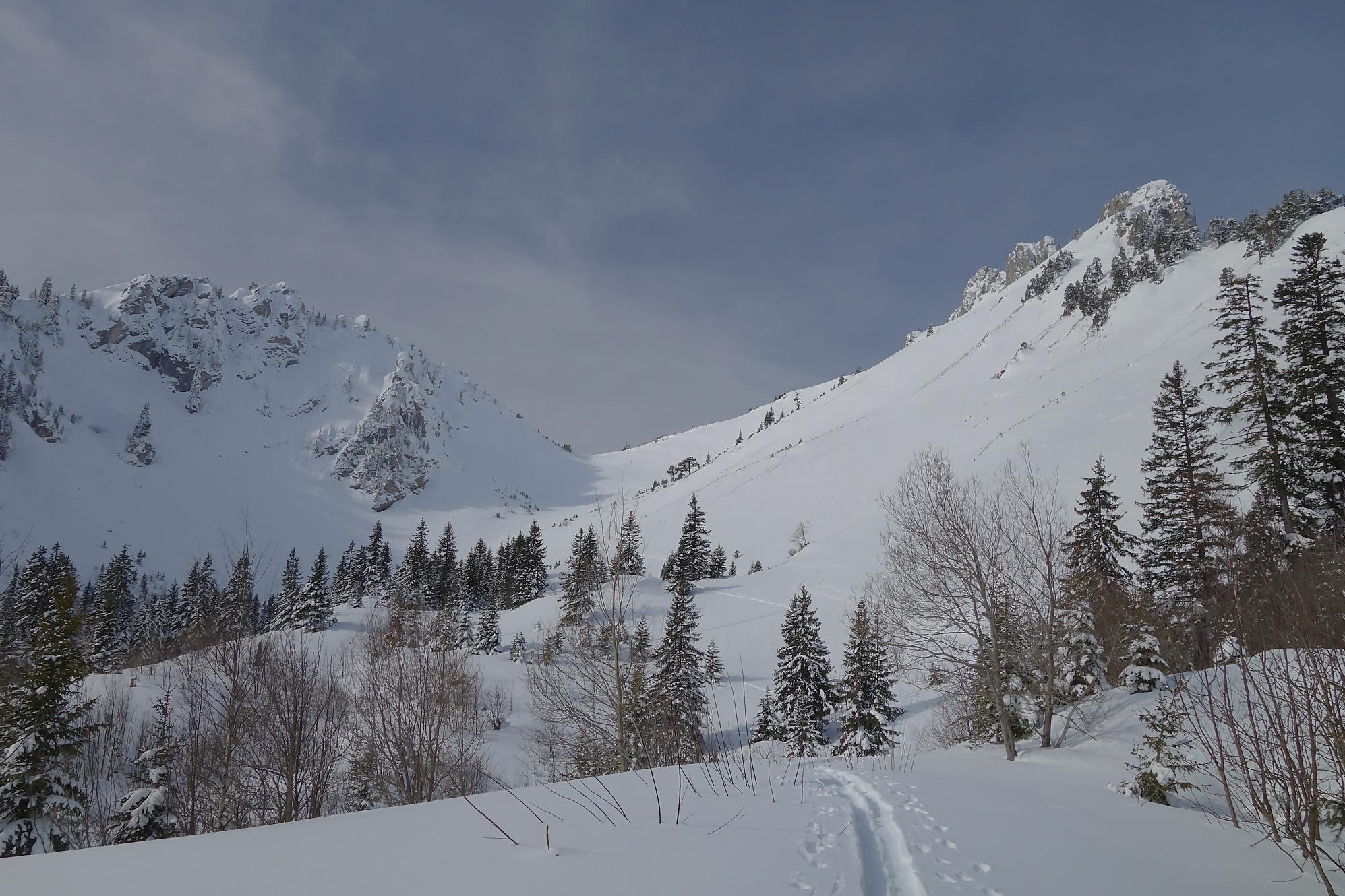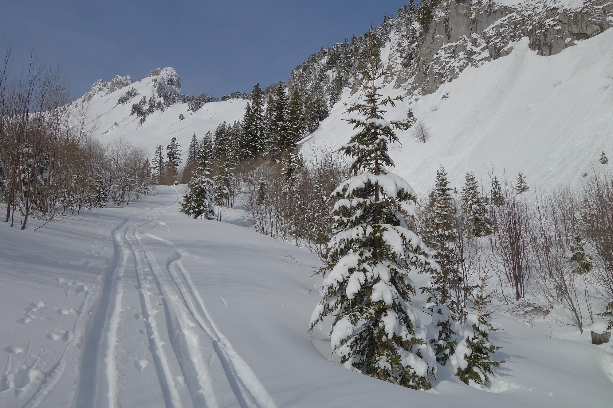 Je retrouve mon passage clé. Comme désormais on se connait, je le passe à pied sans crampons et descend vers le Col de Sevan où la poule caquete avec ses congénères. Ca souffle toujours aussi fort ! Je file et arrive au Col d’Outanne où je babille à nouveau, avec un grand-père qui m’a vu faire demi-tour en haut. Selon lui ça n’est pas raide ! Il connait bien le secteur et m’explique les différentes descentes. Mais je suis une poule, pas un skieur casse-cou ! Je poursuis et sous le Col d’Outanne, c’est le meilleur morceau : de la poudreuse ! Délice que j’avais presque oublié cette année. Après Dravers, la chaleur aidant (+9°c au parking !), c’est une neige bien transformée, mais encore agréable. Je retrouve le parking et me dis que j’ai bien fait de me lever tôt. Pas belle la vie ?