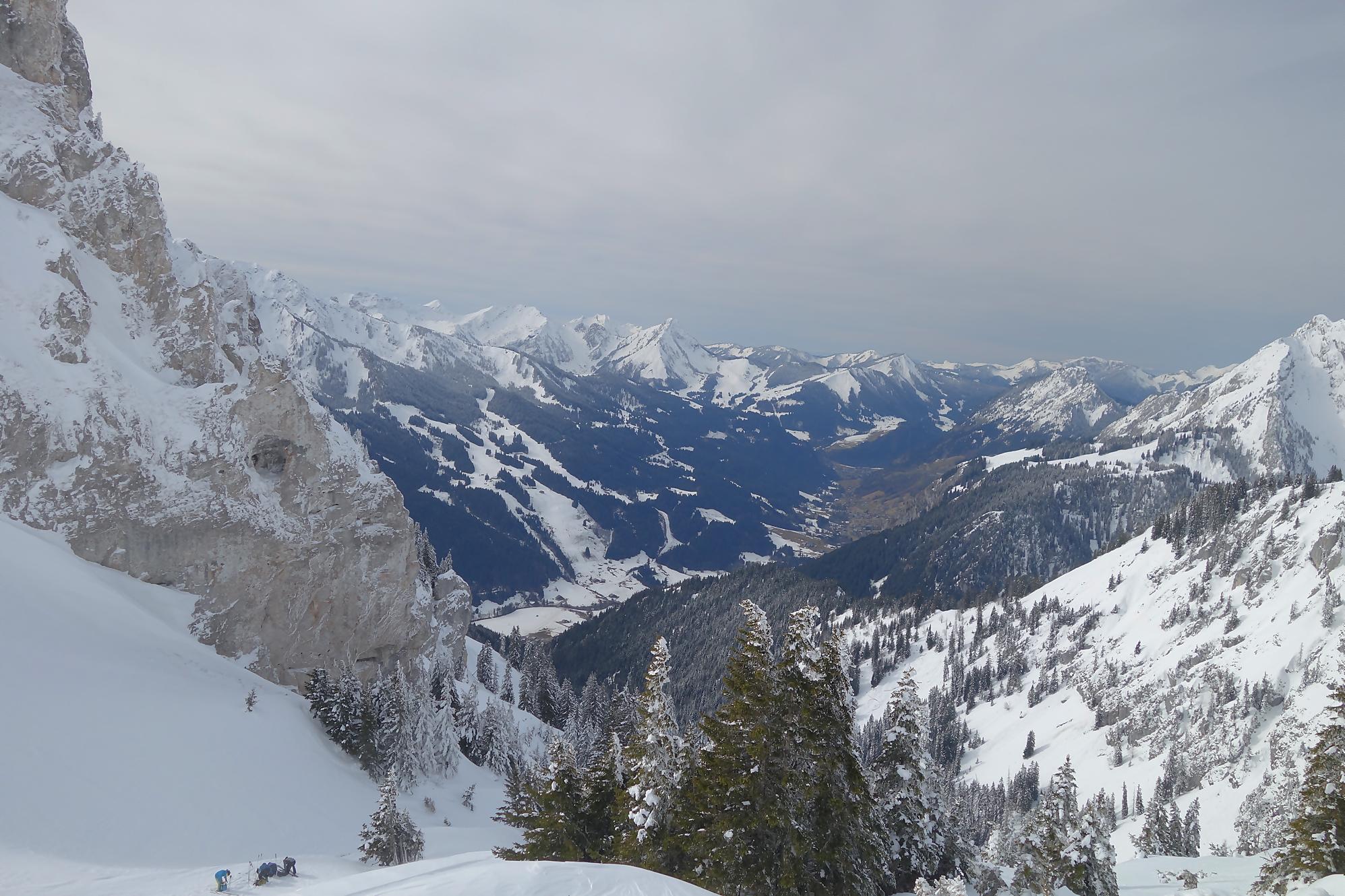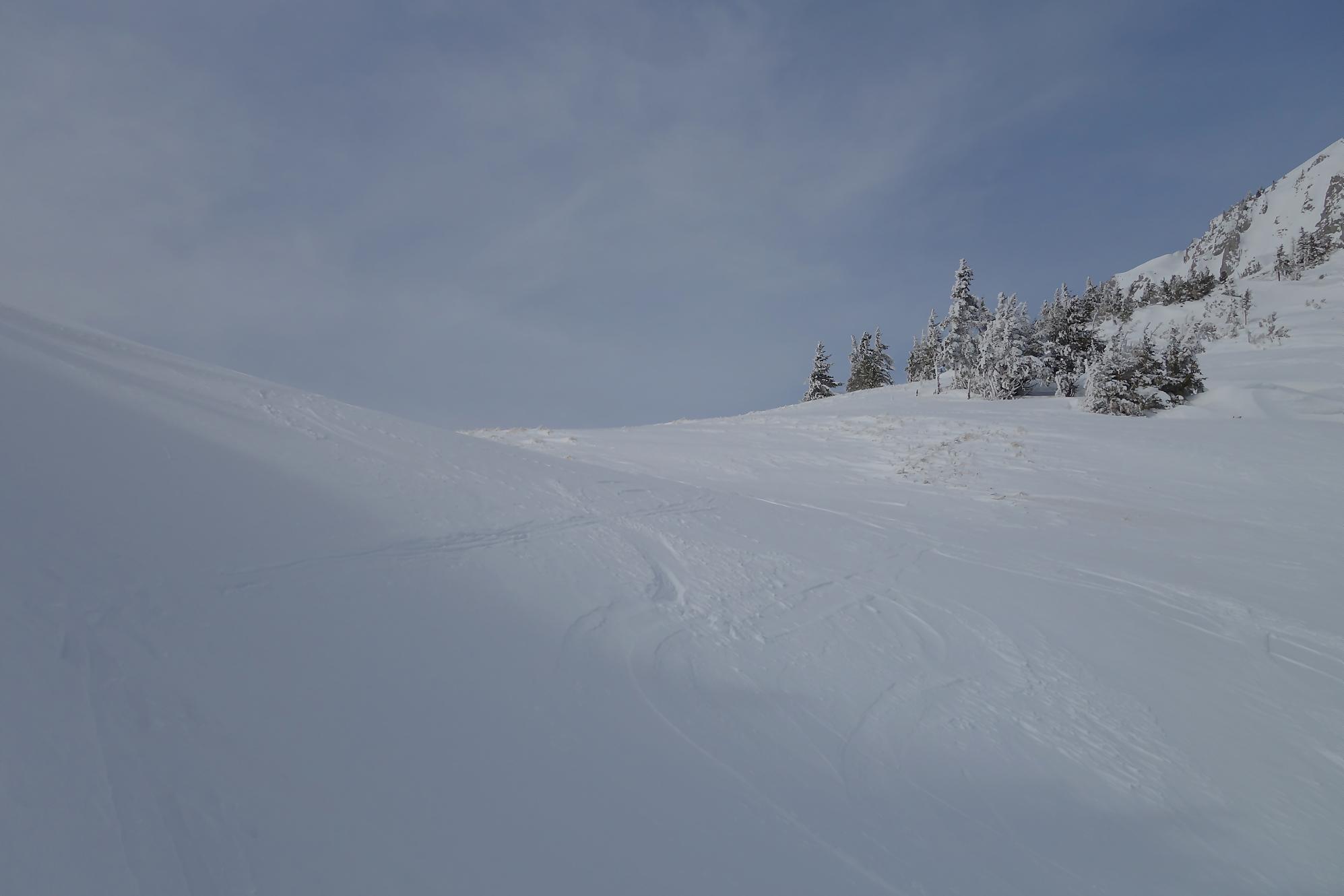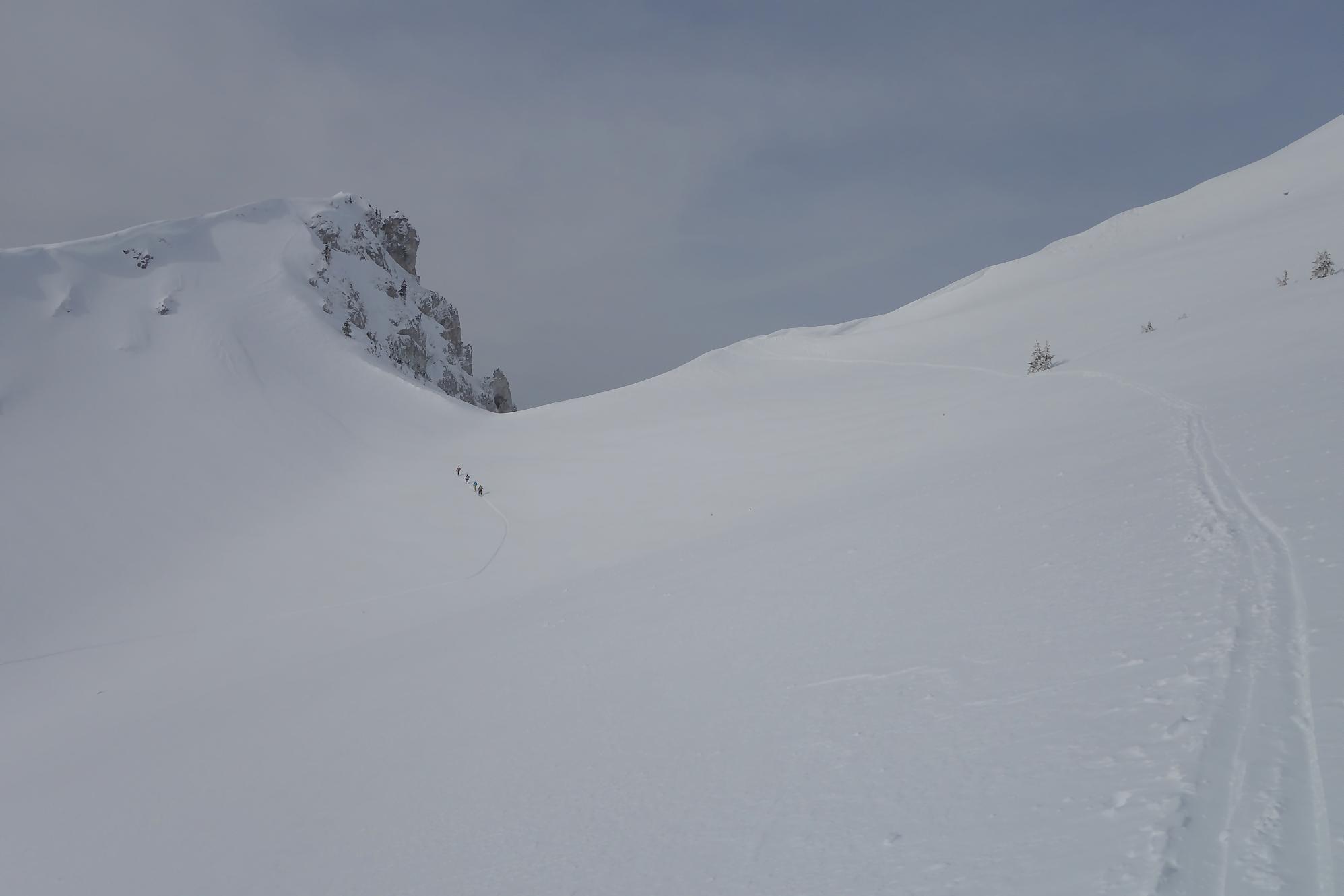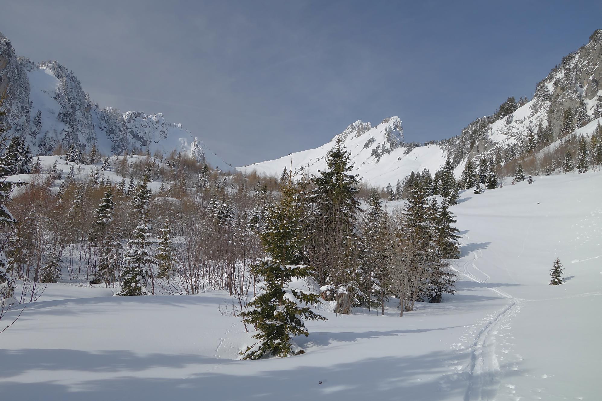 Je retrouve mon passage clé. Comme désormais on se connait, je le passe à pied sans crampons et descend vers le Col de Sevan où la poule caquete avec ses congénères. Ca souffle toujours aussi fort ! Je file et arrive au Col d’Outanne où je babille à nouveau, avec un grand-père qui m’a vu faire demi-tour en haut. Selon lui ça n’est pas raide ! Il connait bien le secteur et m’explique les différentes descentes. Mais je suis une poule, pas un skieur casse-cou ! Je poursuis et sous le Col d’Outanne, c’est le meilleur morceau : de la poudreuse ! Délice que j’avais presque oublié cette année. Après Dravers, la chaleur aidant (+9°c au parking !), c’est une neige bien transformée, mais encore agréable. Je retrouve le parking et me dis que j’ai bien fait de me lever tôt. Pas belle la vie ?