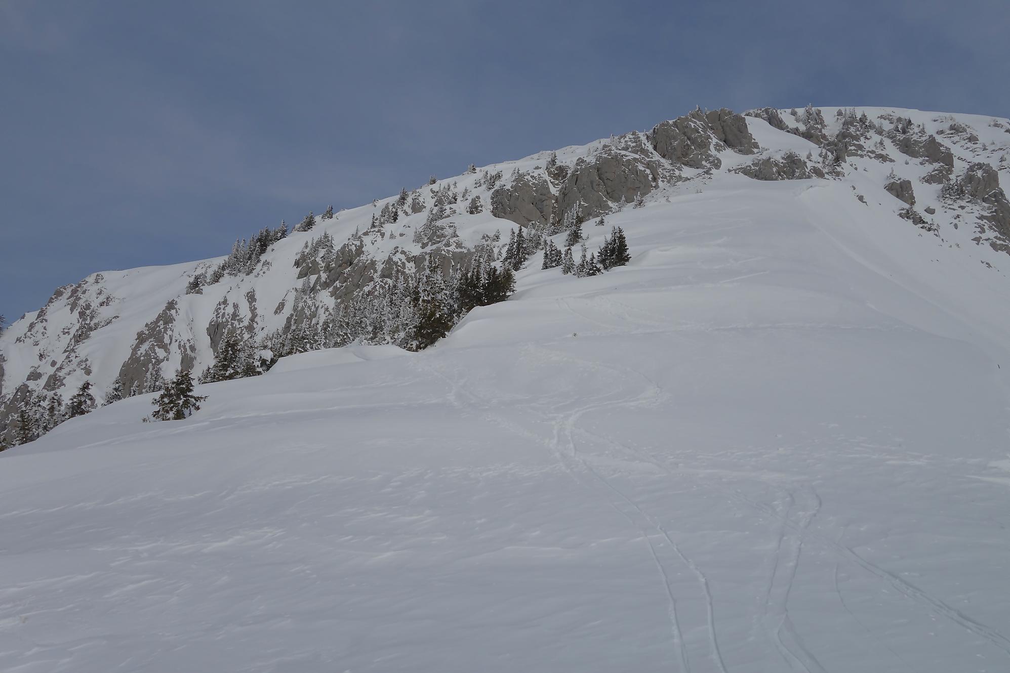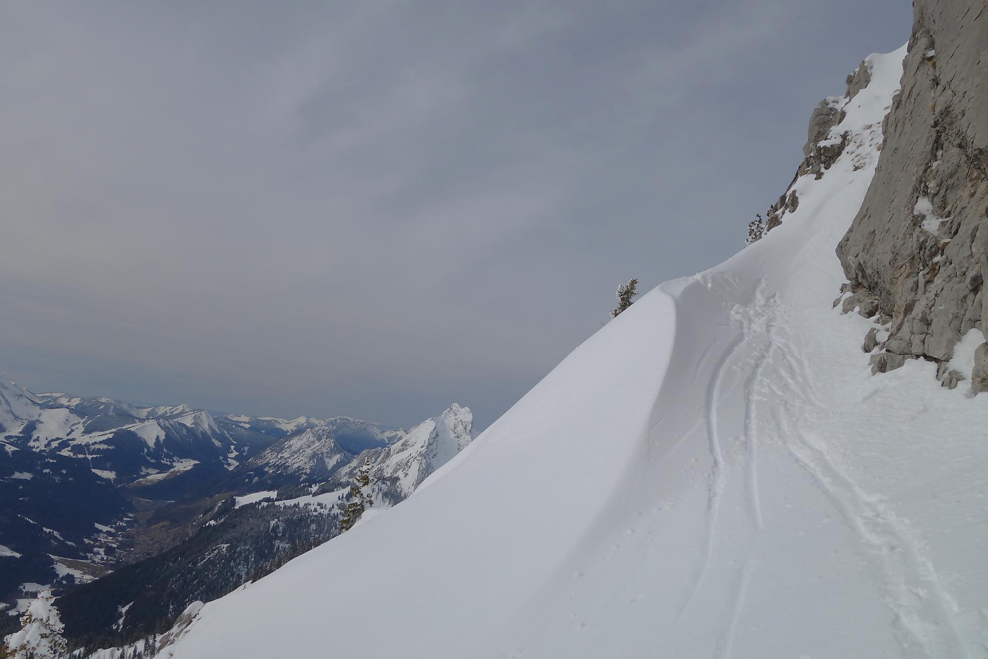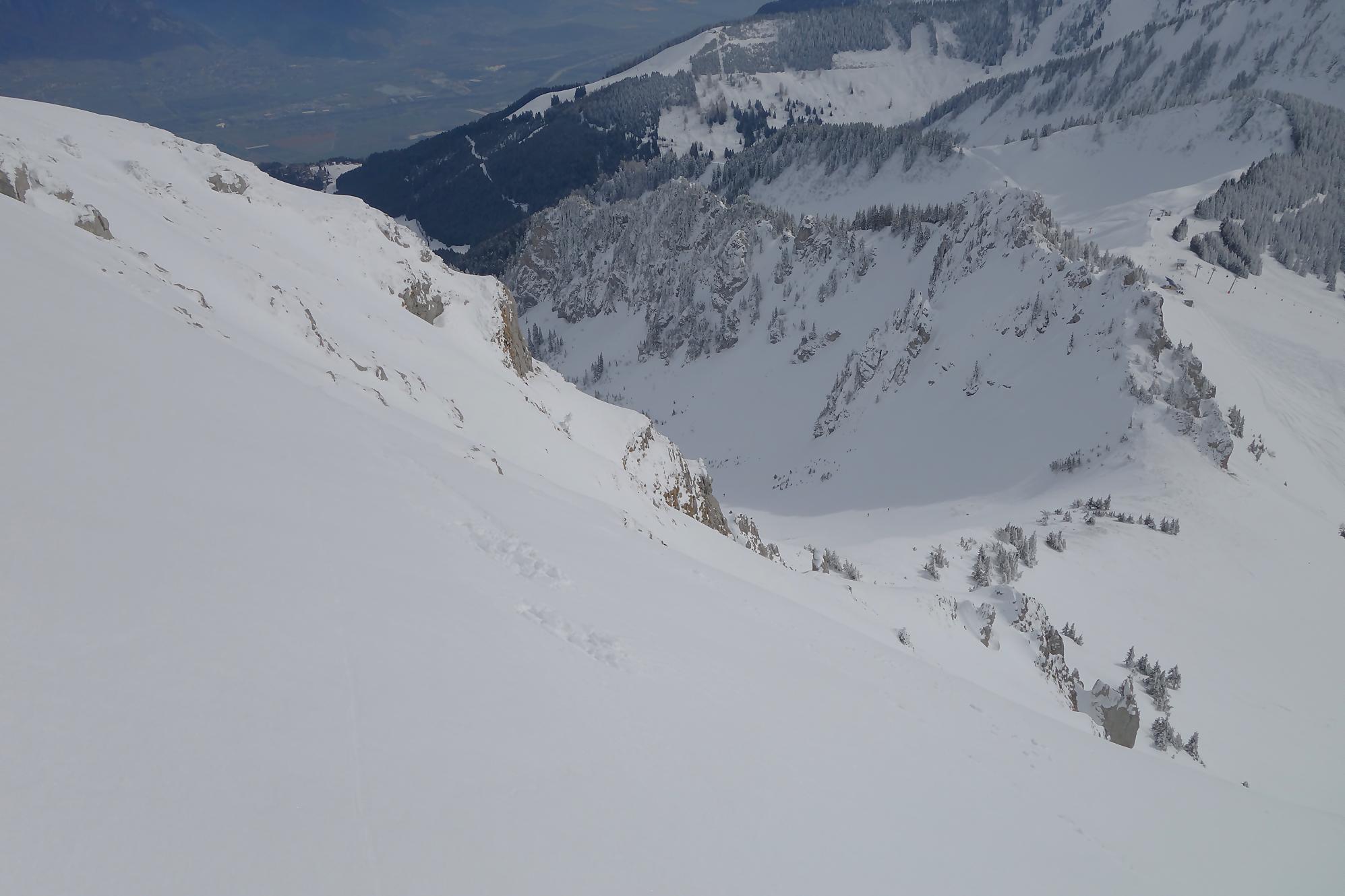 Le skieur précédent est descendu par le côté E et je file sur ses traces. La neige est en partie transformée et j’arrive dans le secteur raide. Stop ! Je suis passé en été et le souvenir de la raideur est vivace. Je ne le sens plus. Normalement, le danger d’avalanche est à 2 dans ce secteur, je suis en solo. Je reste quelques brèves minutes et décide de faire demi-tour. Poule mouillée ? Peut-être, mais poule vivante qui a encore envie de caqueter et picorer du bon grain bio !