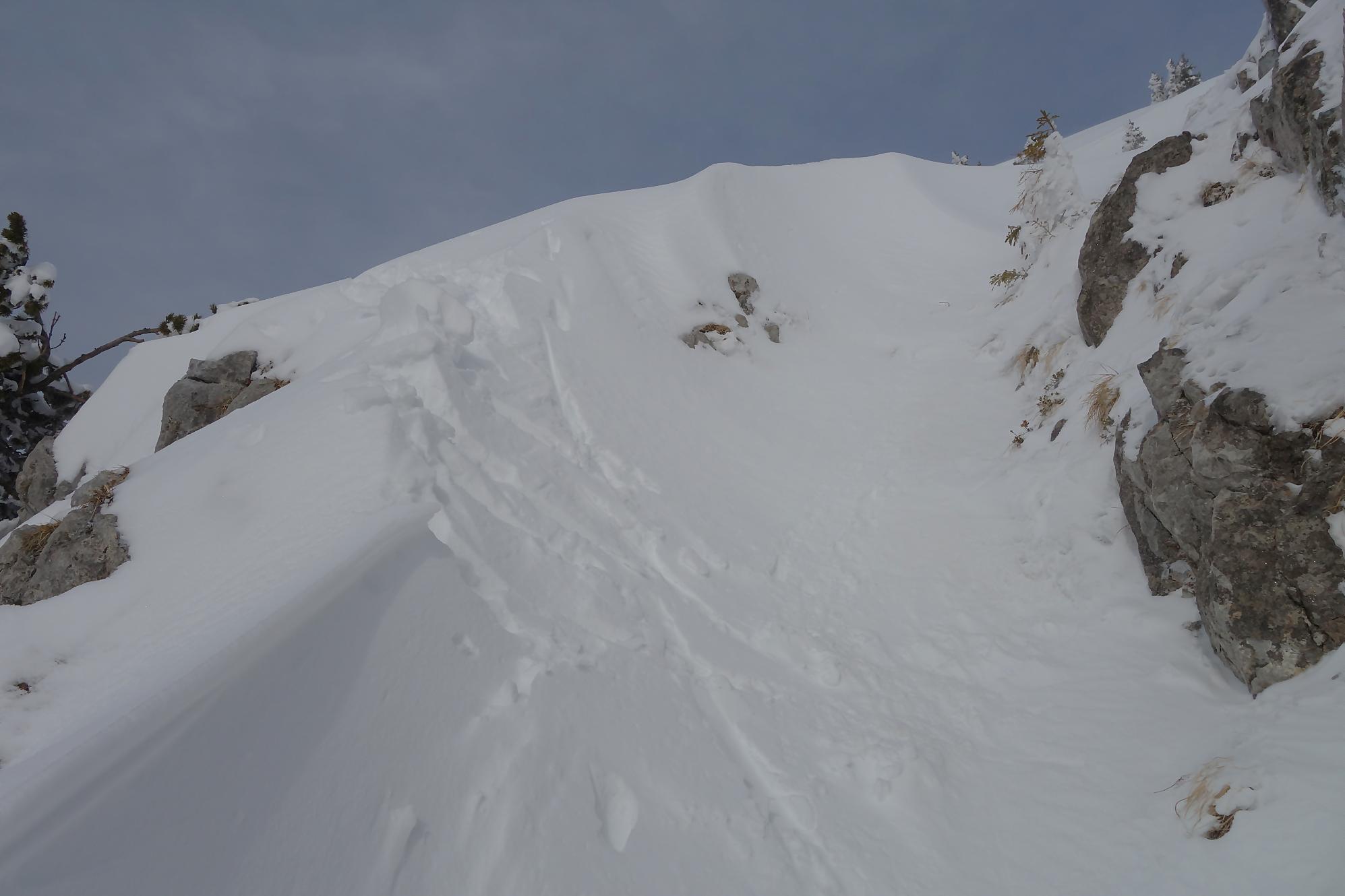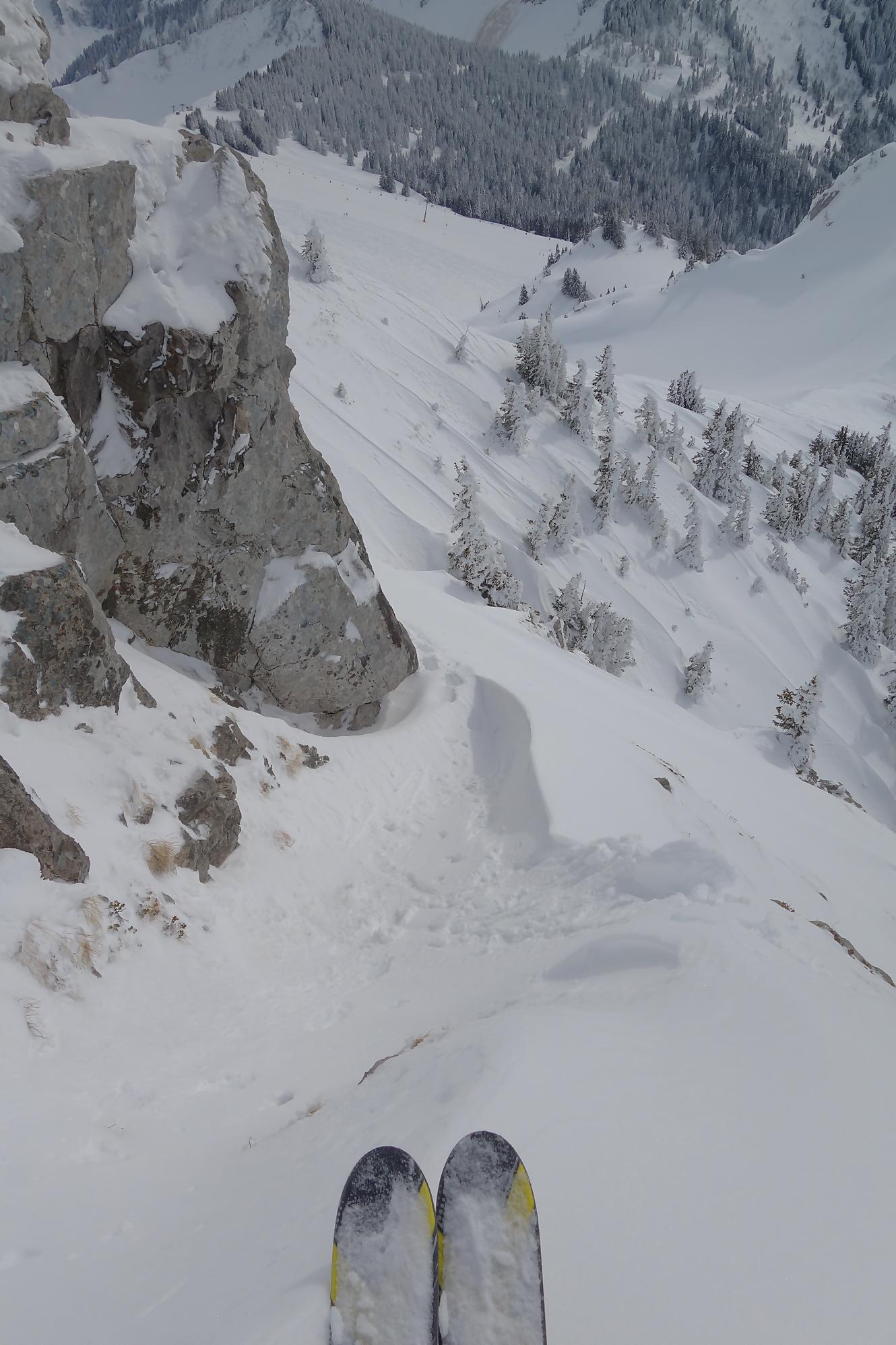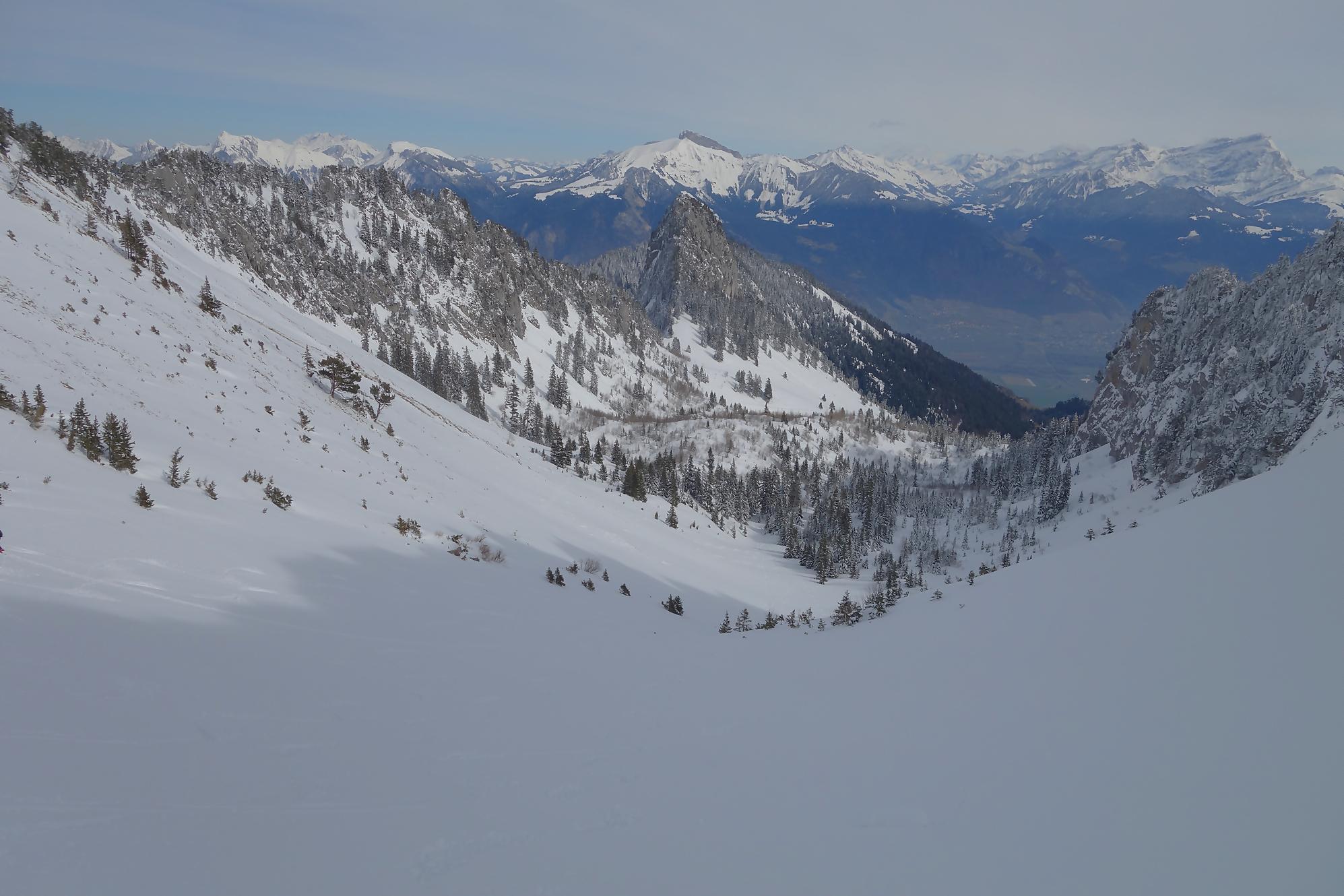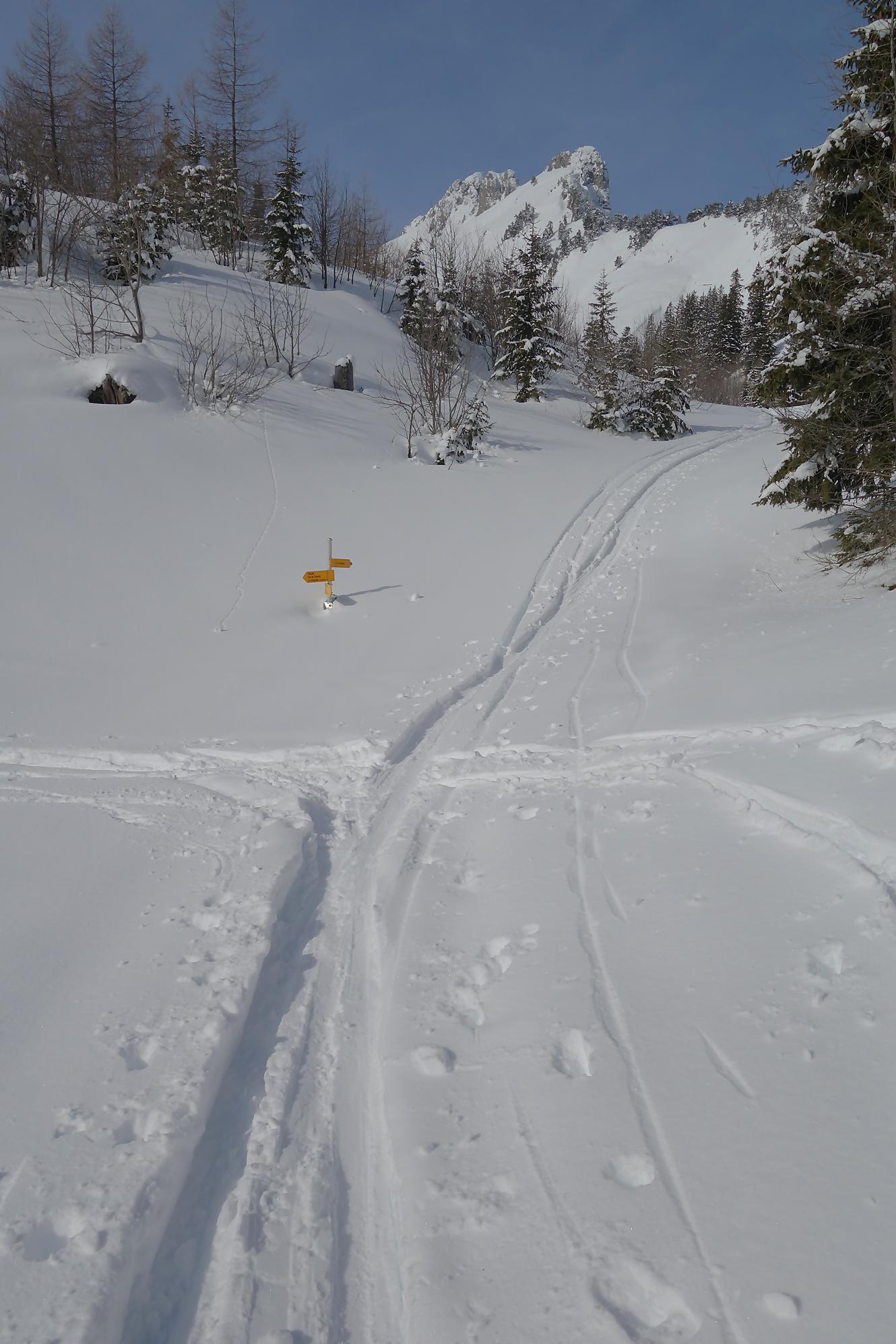 Le skieur précédent est descendu par le côté E et je file sur ses traces. La neige est en partie transformée et j’arrive dans le secteur raide. Stop ! Je suis passé en été et le souvenir de la raideur est vivace. Je ne le sens plus. Normalement, le danger d’avalanche est à 2 dans ce secteur, je suis en solo. Je reste quelques brèves minutes et décide de faire demi-tour. Poule mouillée ? Peut-être, mais poule vivante qui a encore envie de caqueter et picorer du bon grain bio !
