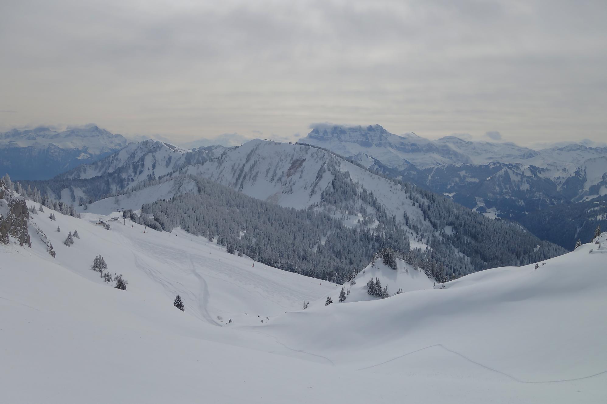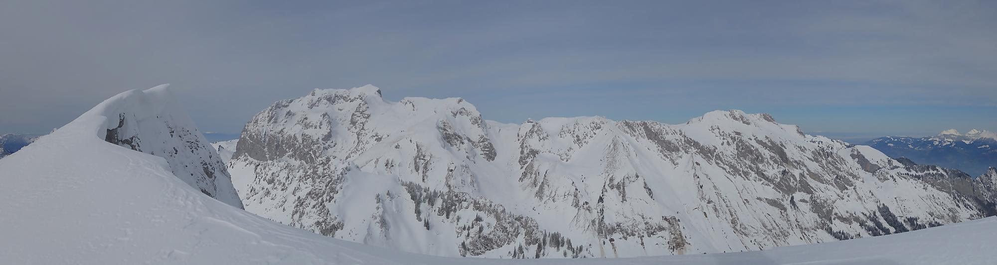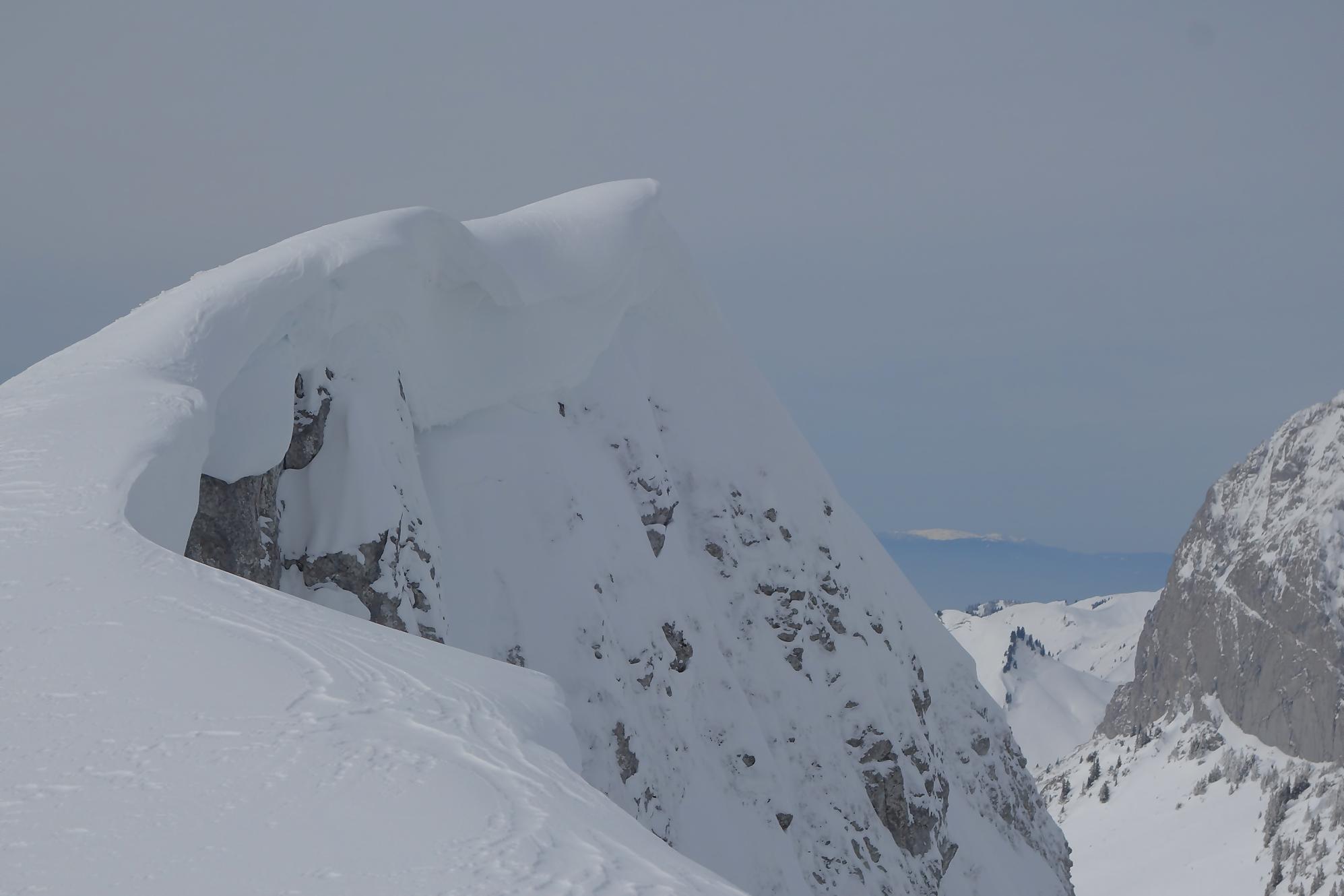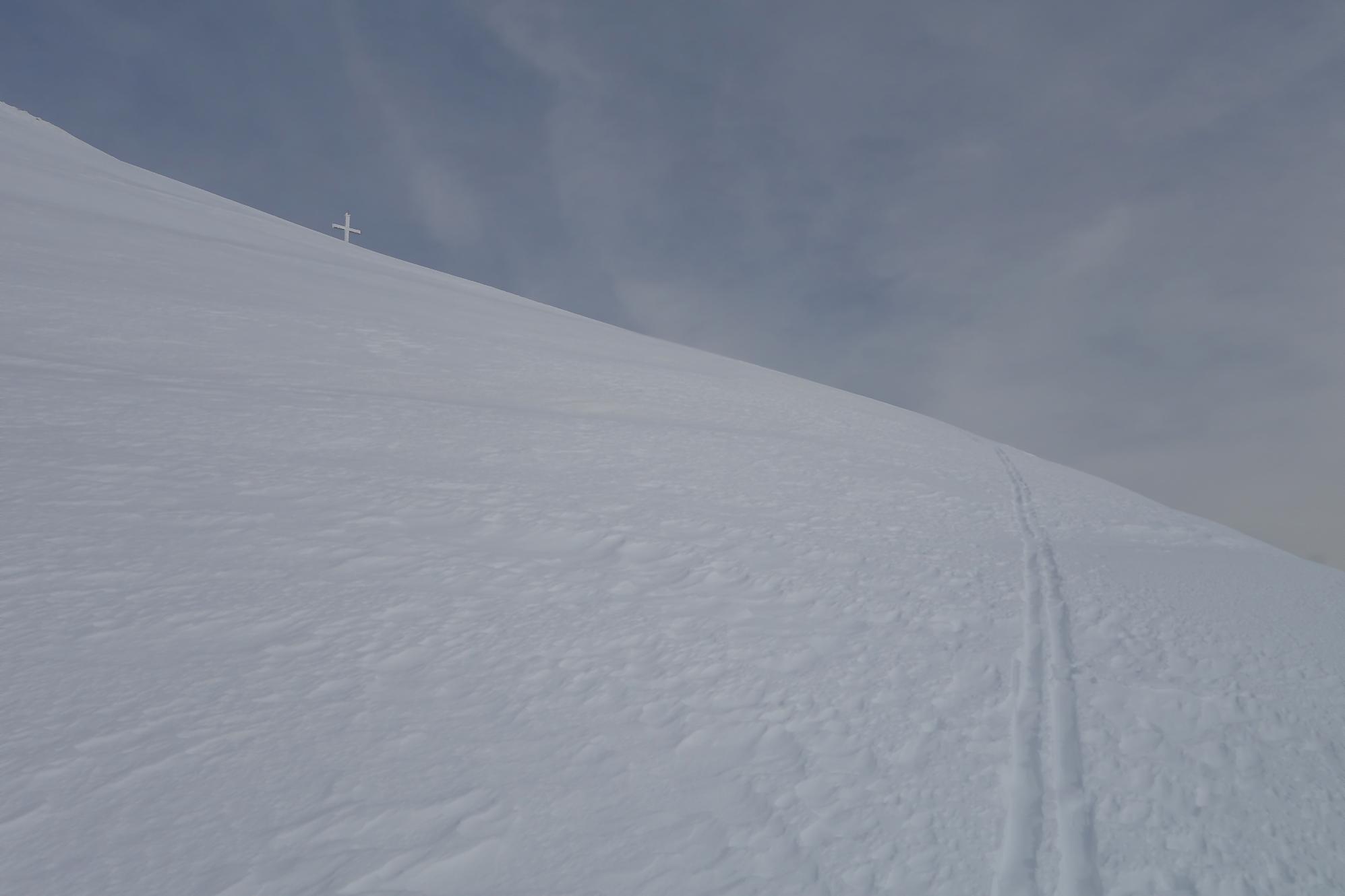 J’arrive au Col d’Outanne, le vent s’invite à la partie. J’ai le couloir E en face de moi, un trace est visible. Ca parait bon pour la descente. Une traversée où les skieurs venant des remontes pentes de Torgon arrivent et je rejoins le Col de Sevan (seulement nommé sur la carte IGN). Le secteur est fortement venteux, je ne m’attarde donc que peu. Je poursuis par la pente S (chemin d’été) pour arriver au passage clé de la course : le contournement d’une falaise. C’est étroit et déversant. Je suis abrité du vent sous la falaise et profite de réajuster les vêtements. J’ai pris mes crampons en aluminium (très légers … inversement proportionnel au prix !) et décide de les mettre. Devant une trace d’un seul skieur … qui est resté sur ses skis. Je n’ai pas ce courage ! Avec les crampons, je finis par un droit en haut et rejoins la pente finale. Le décore change, ambiance de grand nord avec les arbres tout blanc. Deux conversions techniques et je rejoins la croix du Linleu, 2093m. Elle est chargée de neige soufflée, superbe. Le vent est peu présent depuis le passage clé et je profite du paysage. La météo a viré au gris et les Dents du Midi sont en partie prises par les nuages. Le Mont-Blanc a déjà abdiqué, la tâche est trop dure ! Quel panorama depuis ce sommet peu fréquenté.