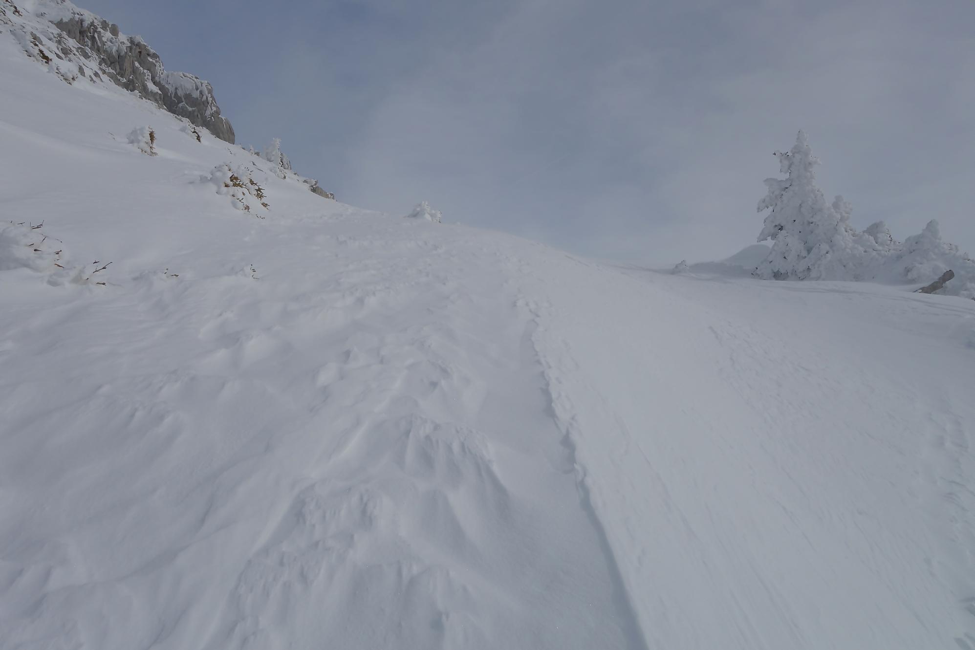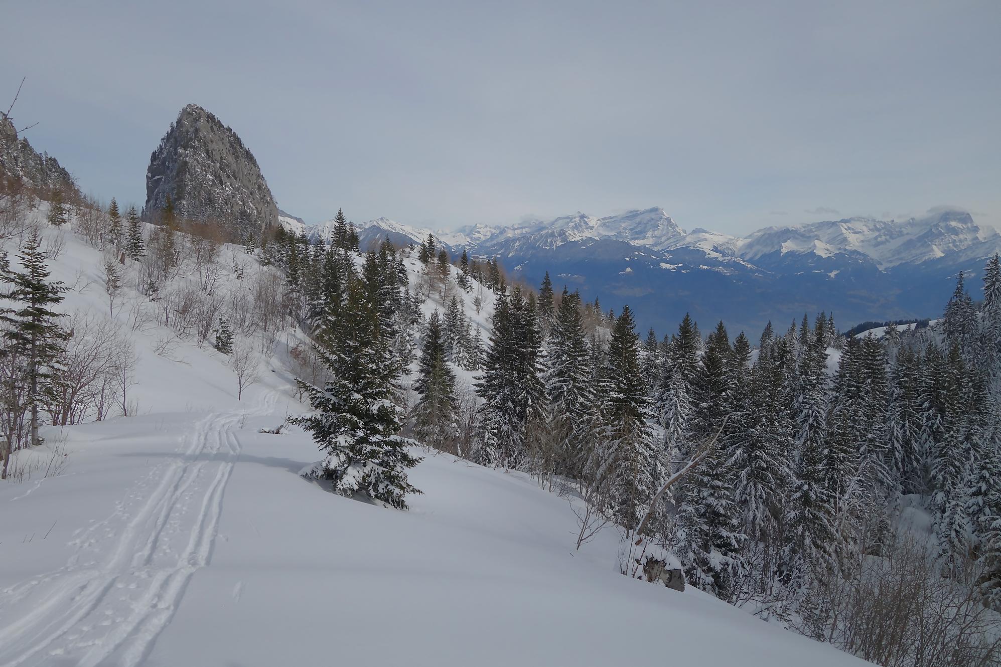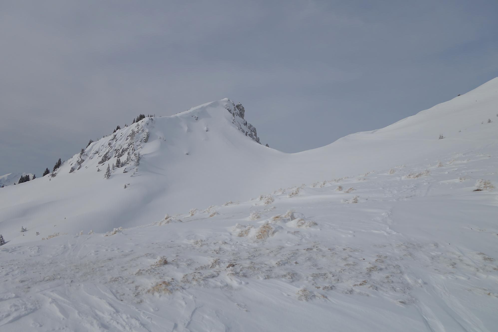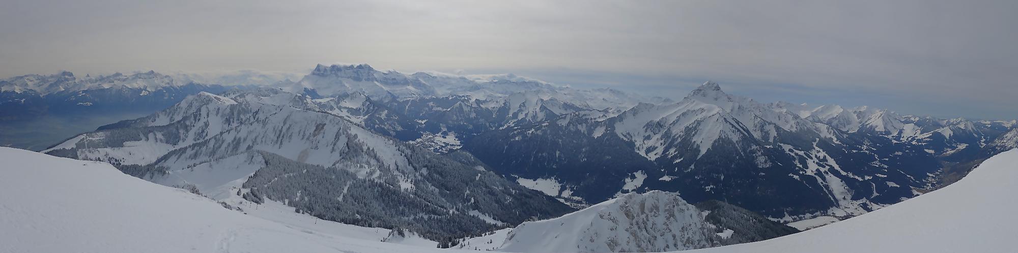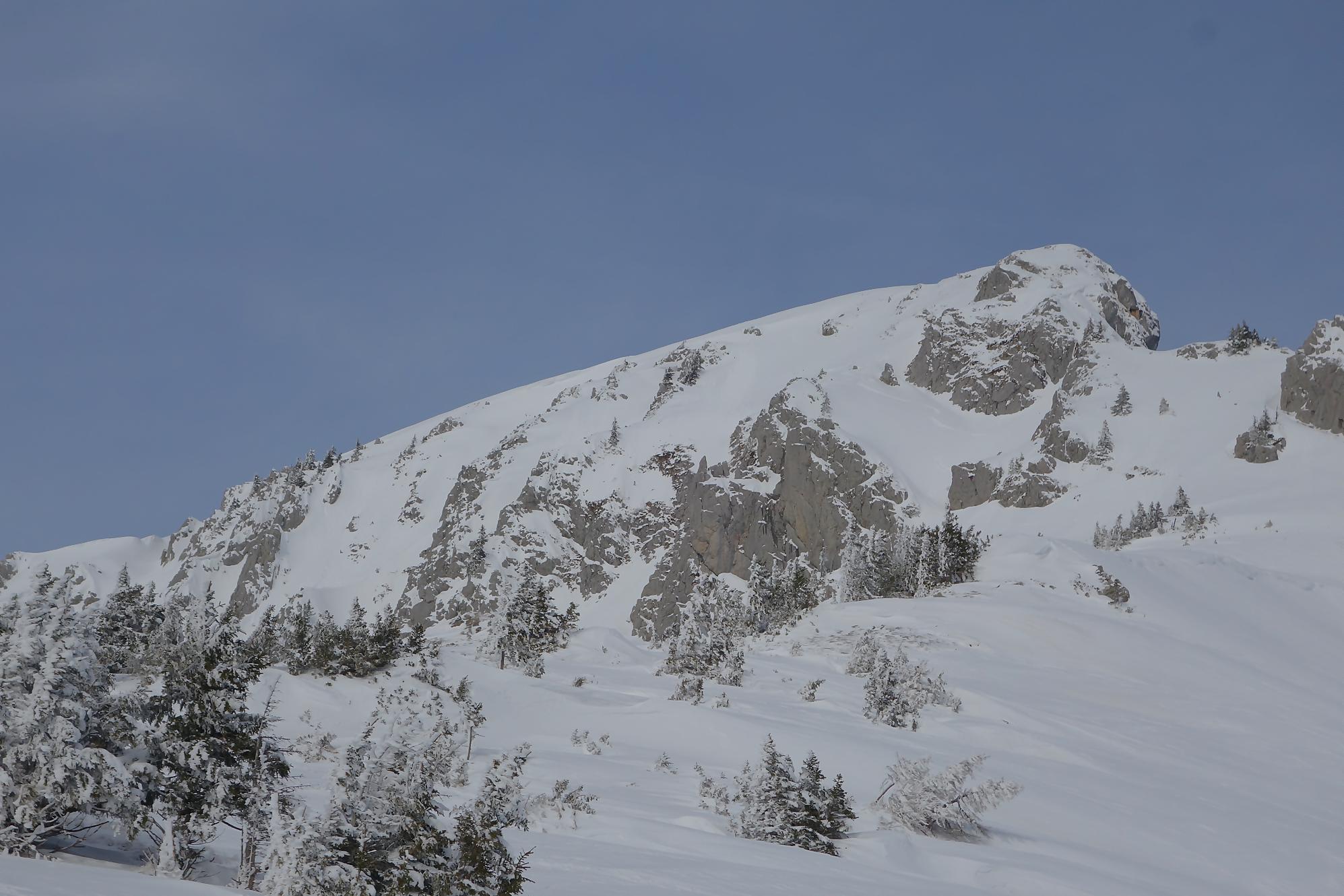 J’arrive au Col d’Outanne, le vent s’invite à la partie. J’ai le couloir E en face de moi, un trace est visible. Ca parait bon pour la descente. Une traversée où les skieurs venant des remontes pentes de Torgon arrivent et je rejoins le Col de Sevan (seulement nommé sur la carte IGN). Le secteur est fortement venteux, je ne m’attarde donc que peu. Je poursuis par la pente S (chemin d’été) pour arriver au passage clé de la course : le contournement d’une falaise. C’est étroit et déversant. Je suis abrité du vent sous la falaise et profite de réajuster les vêtements. J’ai pris mes crampons en aluminium (très légers … inversement proportionnel au prix !) et décide de les mettre. Devant une trace d’un seul skieur … qui est resté sur ses skis. Je n’ai pas ce courage ! Avec les crampons, je finis par un droit en haut et rejoins la pente finale. Le décore change, ambiance de grand nord avec les arbres tout blanc. Deux conversions techniques et je rejoins la croix du Linleu, 2093m. Elle est chargée de neige soufflée, superbe. Le vent est peu présent depuis le passage clé et je profite du paysage. La météo a viré au gris et les Dents du Midi sont en partie prises par les nuages. Le Mont-Blanc a déjà abdiqué, la tâche est trop dure ! Quel panorama depuis ce sommet peu fréquenté.