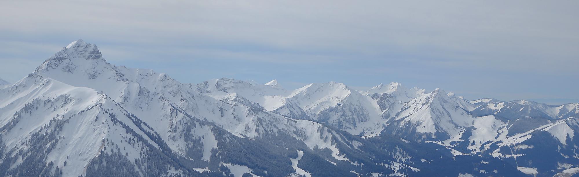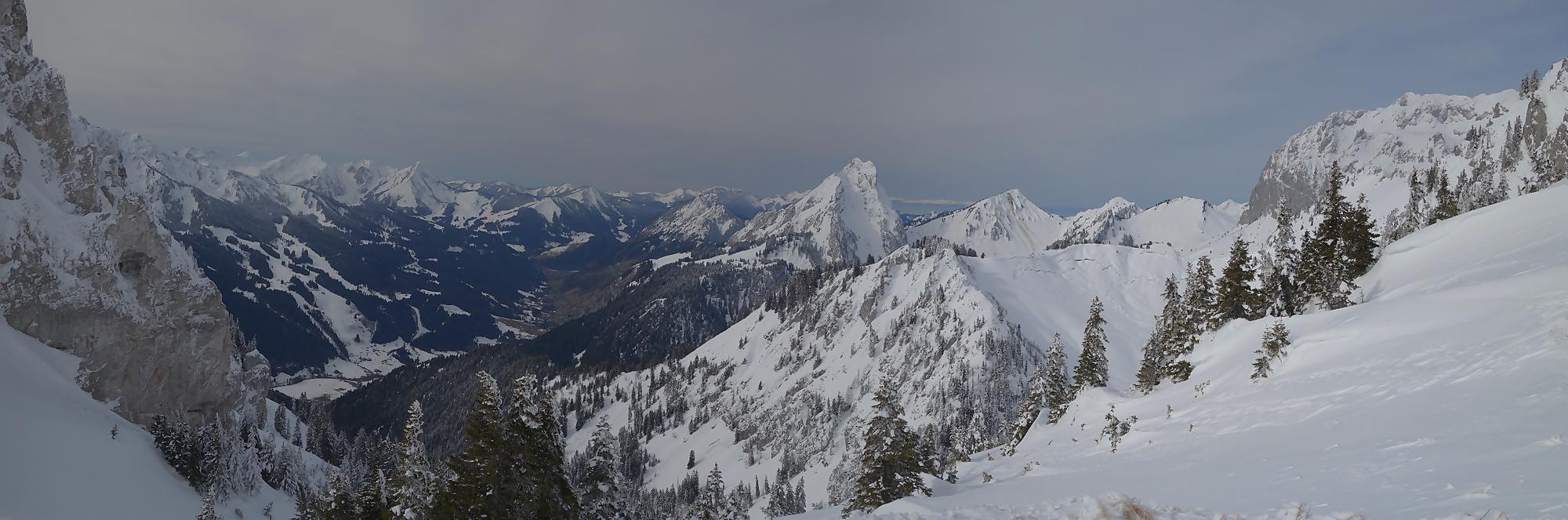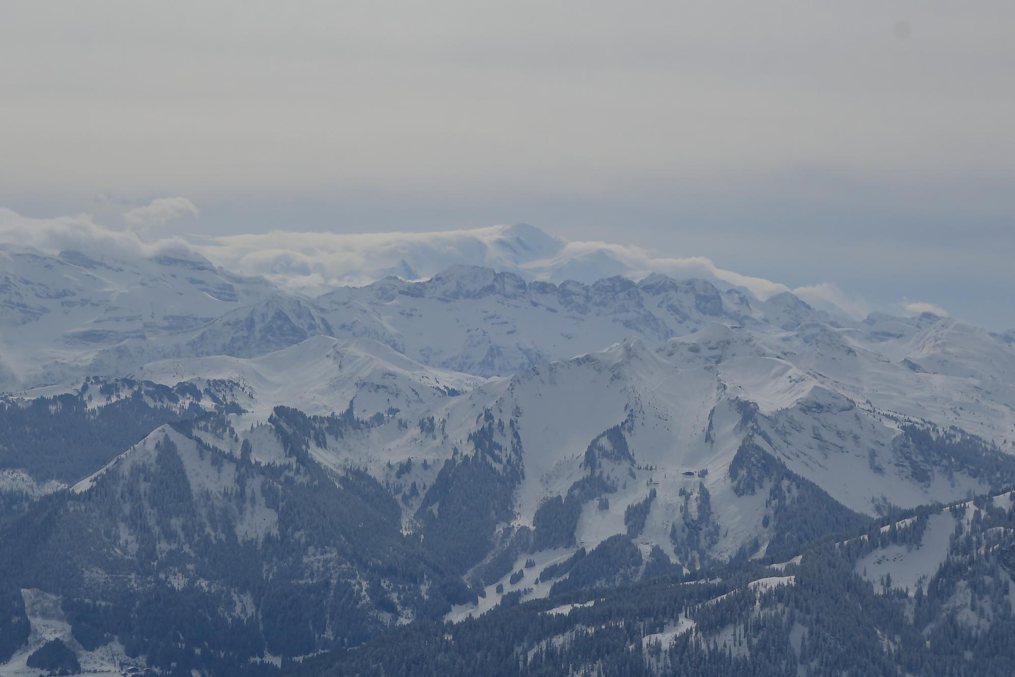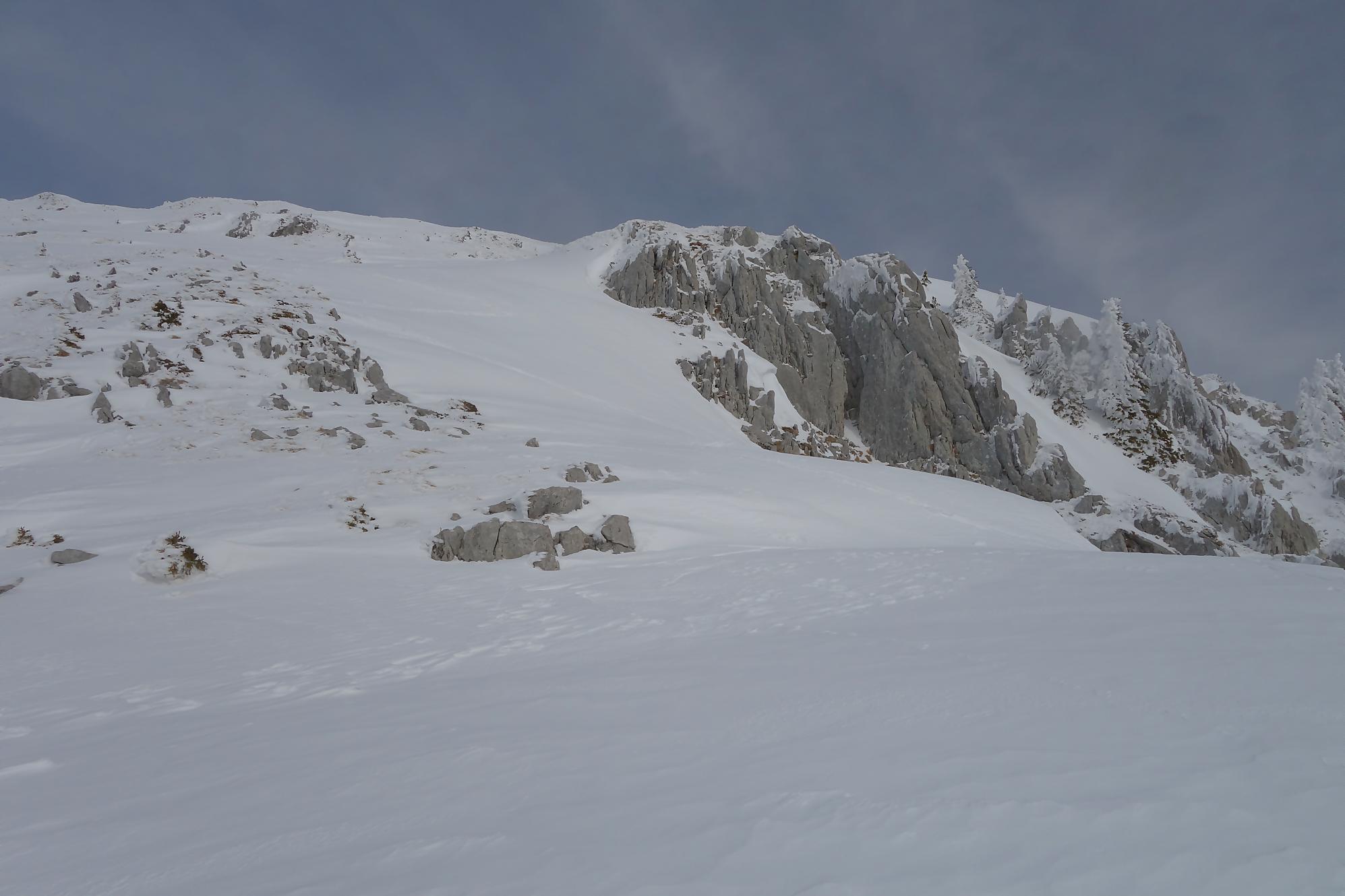 J’arrive au Col d’Outanne, le vent s’invite à la partie. J’ai le couloir E en face de moi, un trace est visible. Ca parait bon pour la descente. Une traversée où les skieurs venant des remontes pentes de Torgon arrivent et je rejoins le Col de Sevan (seulement nommé sur la carte IGN). Le secteur est fortement venteux, je ne m’attarde donc que peu. Je poursuis par la pente S (chemin d’été) pour arriver au passage clé de la course : le contournement d’une falaise. C’est étroit et déversant. Je suis abrité du vent sous la falaise et profite de réajuster les vêtements. J’ai pris mes crampons en aluminium (très légers … inversement proportionnel au prix !) et décide de les mettre. Devant une trace d’un seul skieur … qui est resté sur ses skis. Je n’ai pas ce courage ! Avec les crampons, je finis par un droit en haut et rejoins la pente finale. Le décore change, ambiance de grand nord avec les arbres tout blanc. Deux conversions techniques et je rejoins la croix du Linleu, 2093m. Elle est chargée de neige soufflée, superbe. Le vent est peu présent depuis le passage clé et je profite du paysage. La météo a viré au gris et les Dents du Midi sont en partie prises par les nuages. Le Mont-Blanc a déjà abdiqué, la tâche est trop dure ! Quel panorama depuis ce sommet peu fréquenté.