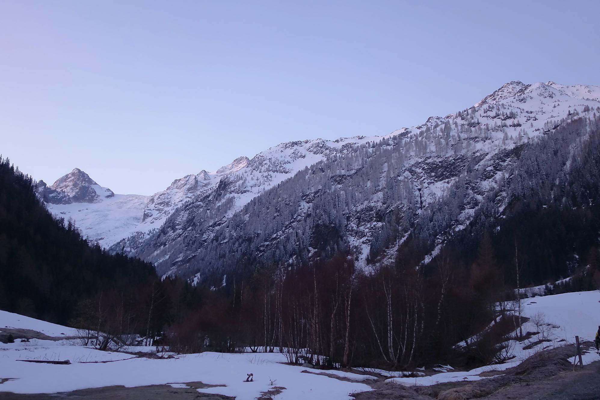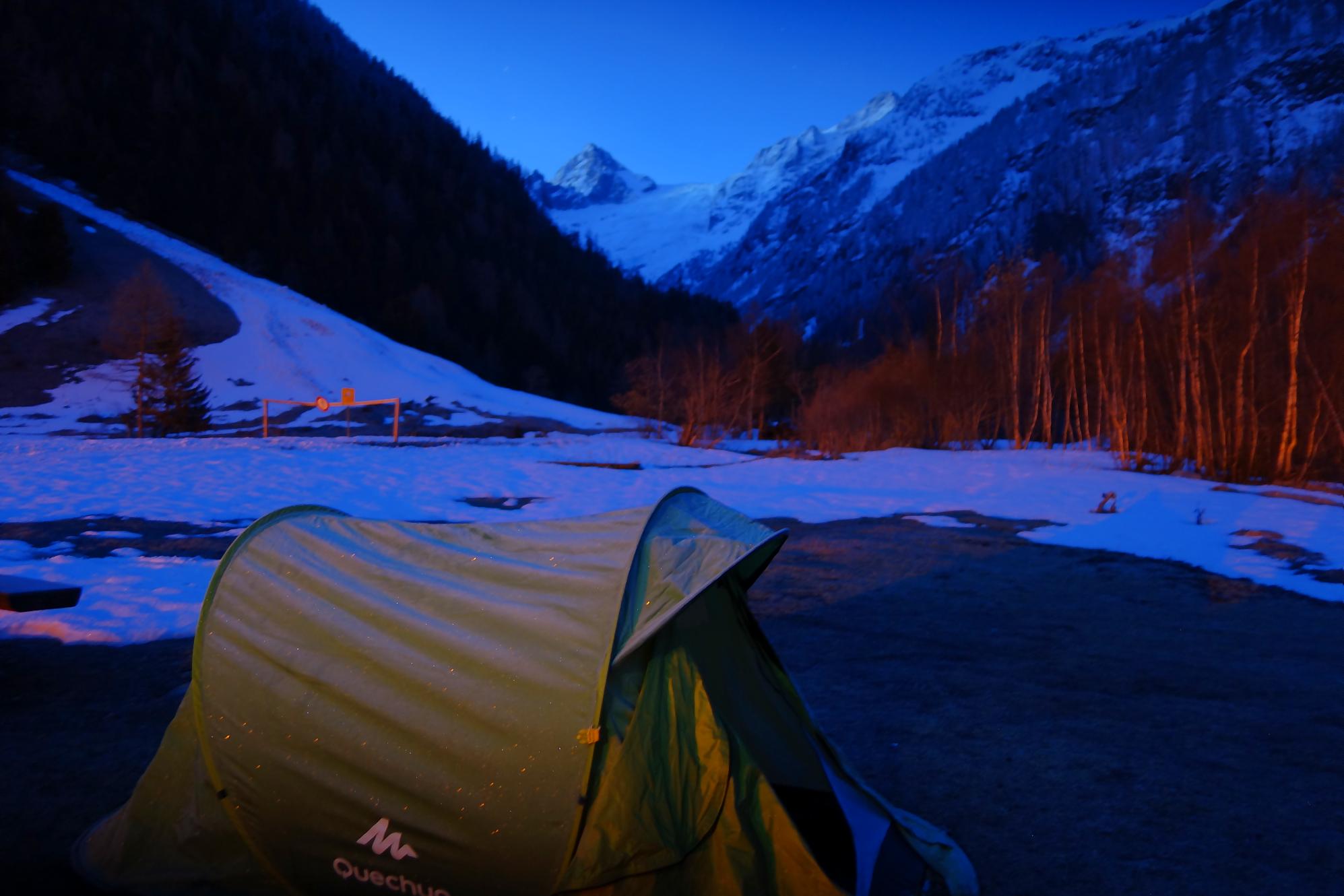 Mon point de départ est Trient, petit village perdu dans le creux des montagnes avec le Col de la Forclaz. J’envisage d’aller au Pissoir (quel nom !) et mon plan B est les Grandes Outanes. Pour le Pissoir cela fait presque 2000m de dénivelé, c’est donc du lourd. Nous sommes au printemps il faut donc partir tôt et je décide de venir la veille et bivouaquer sur place. Le samedi soir j’arrive à Trient sur la place de parking et installe ma tente pour filer dans le duvet. La température tourne autour de 0°c.