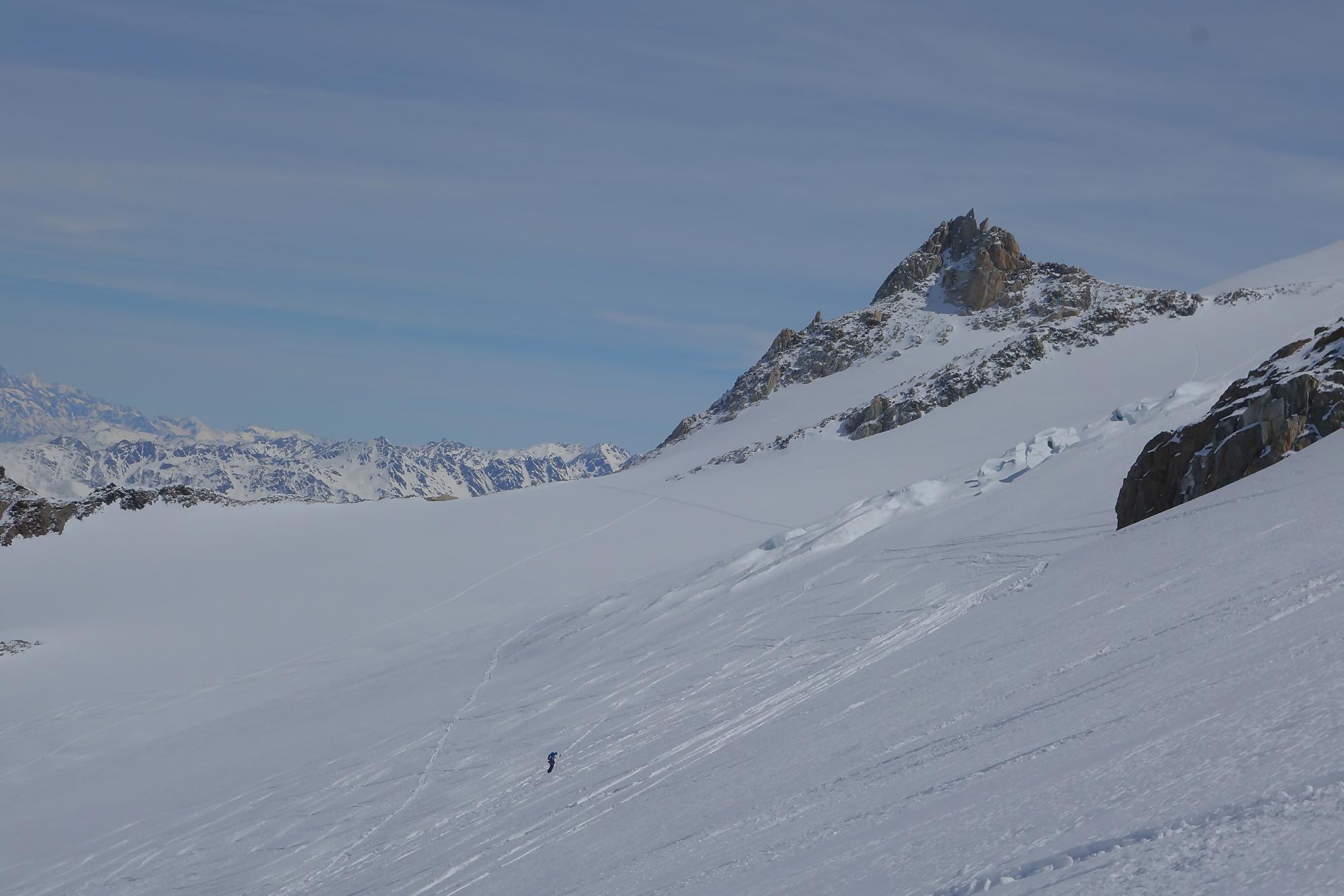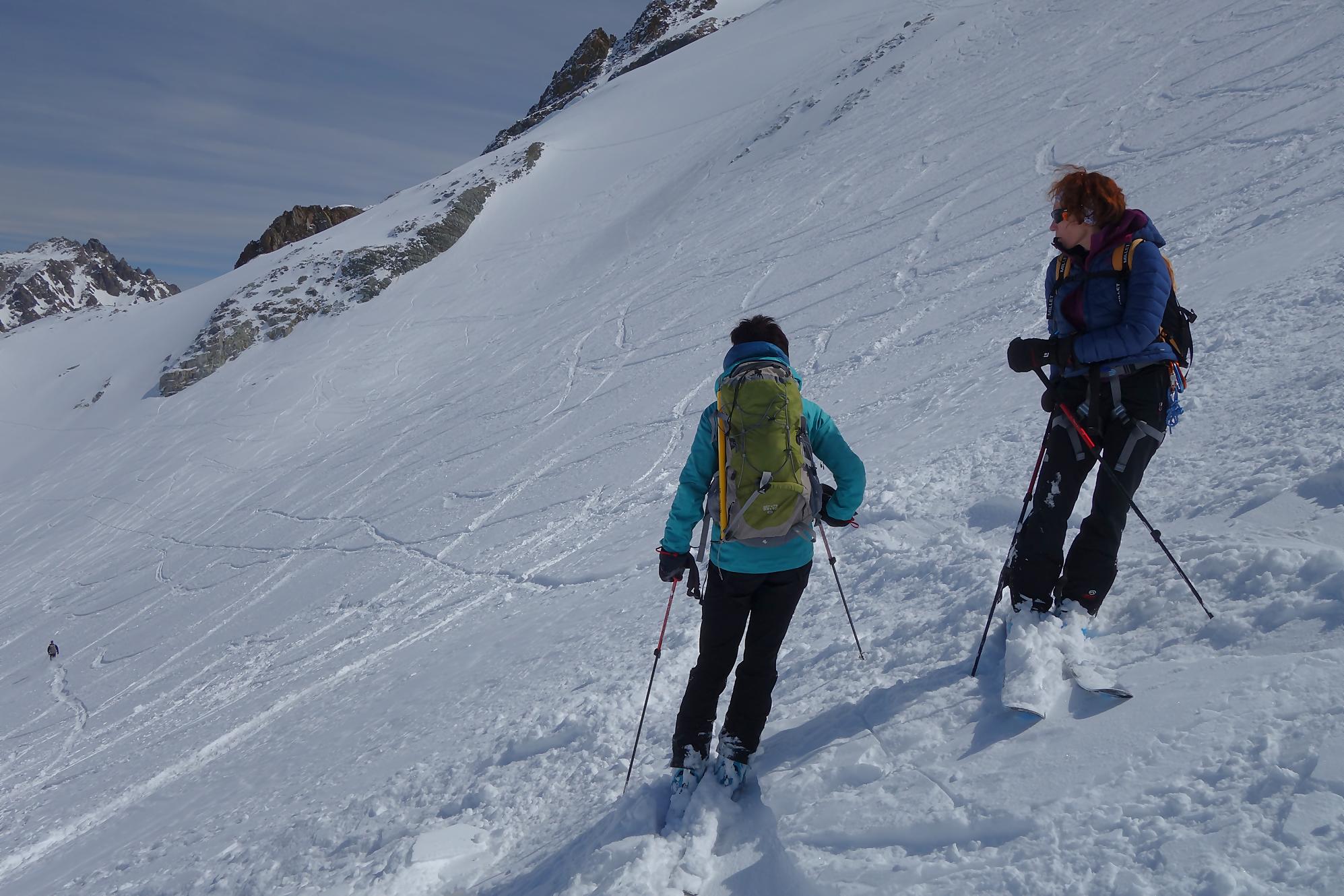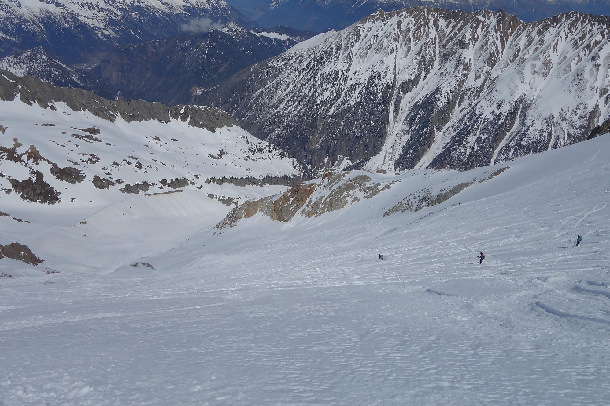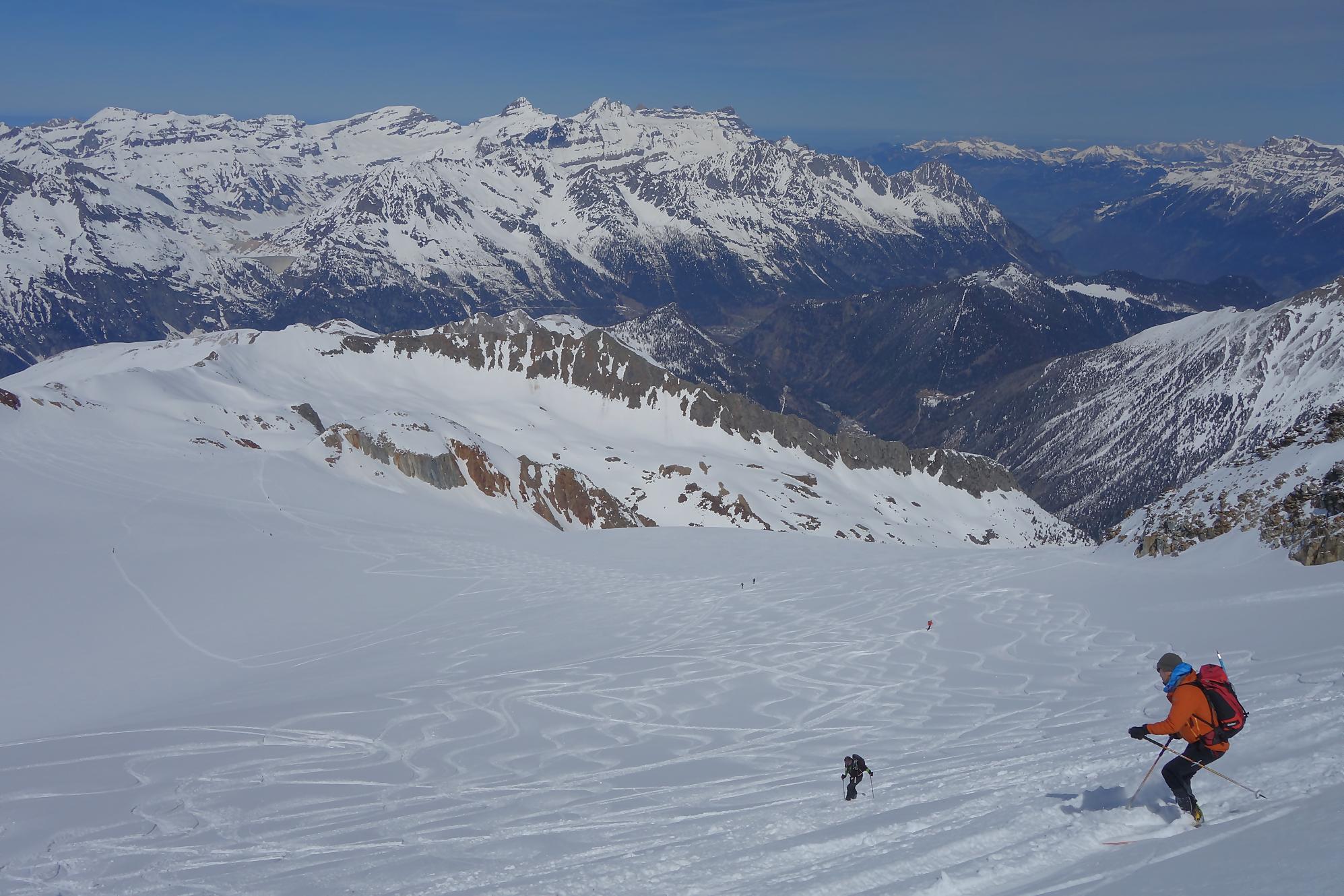 Il faut bien à un moment quitter les lieux, non sans regrets. C’est la descente sur le glacier des Grands. A la montée j’avais bien noté les traces de descentes, ce sera ma ligne. Il a neigé la veille et j’ai le droit à plusieurs cm de poudreuse. Nous sommes presque mi-avril, quel bonheur. Puis la pente s’accentue un peu, sur la carte nous sommes belle et bien sur glacier, mais dans la réalité, peu évident. La neige devient à peine croutée et je rattrape le groupe de Karyne. Puis on retrouve le vallon pentu de la montée, coincé entre les avalanches et la falaise. Il faut descendre parfois sur les carres.