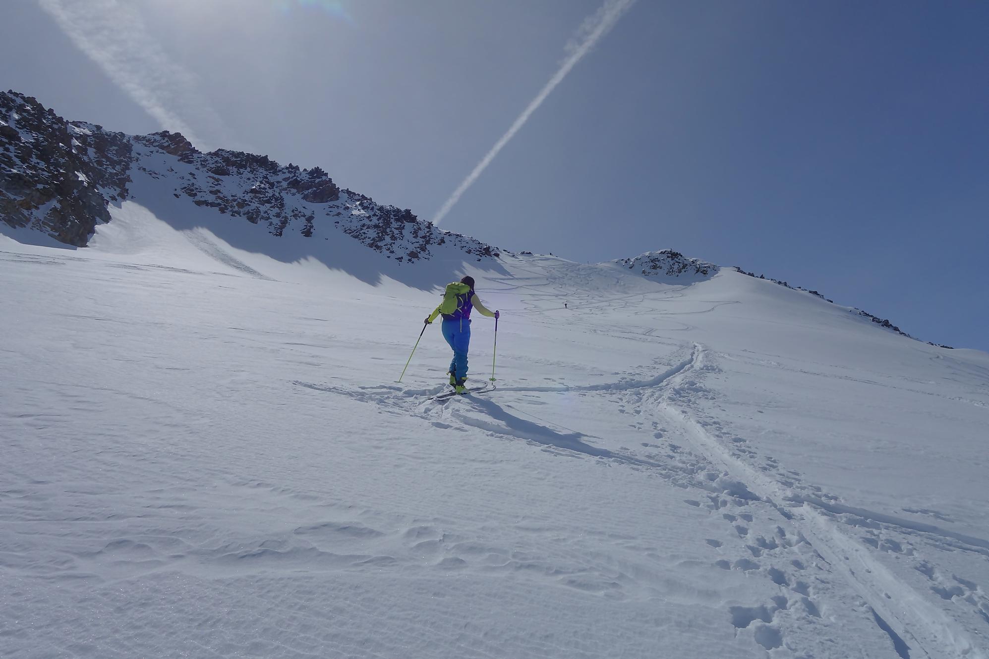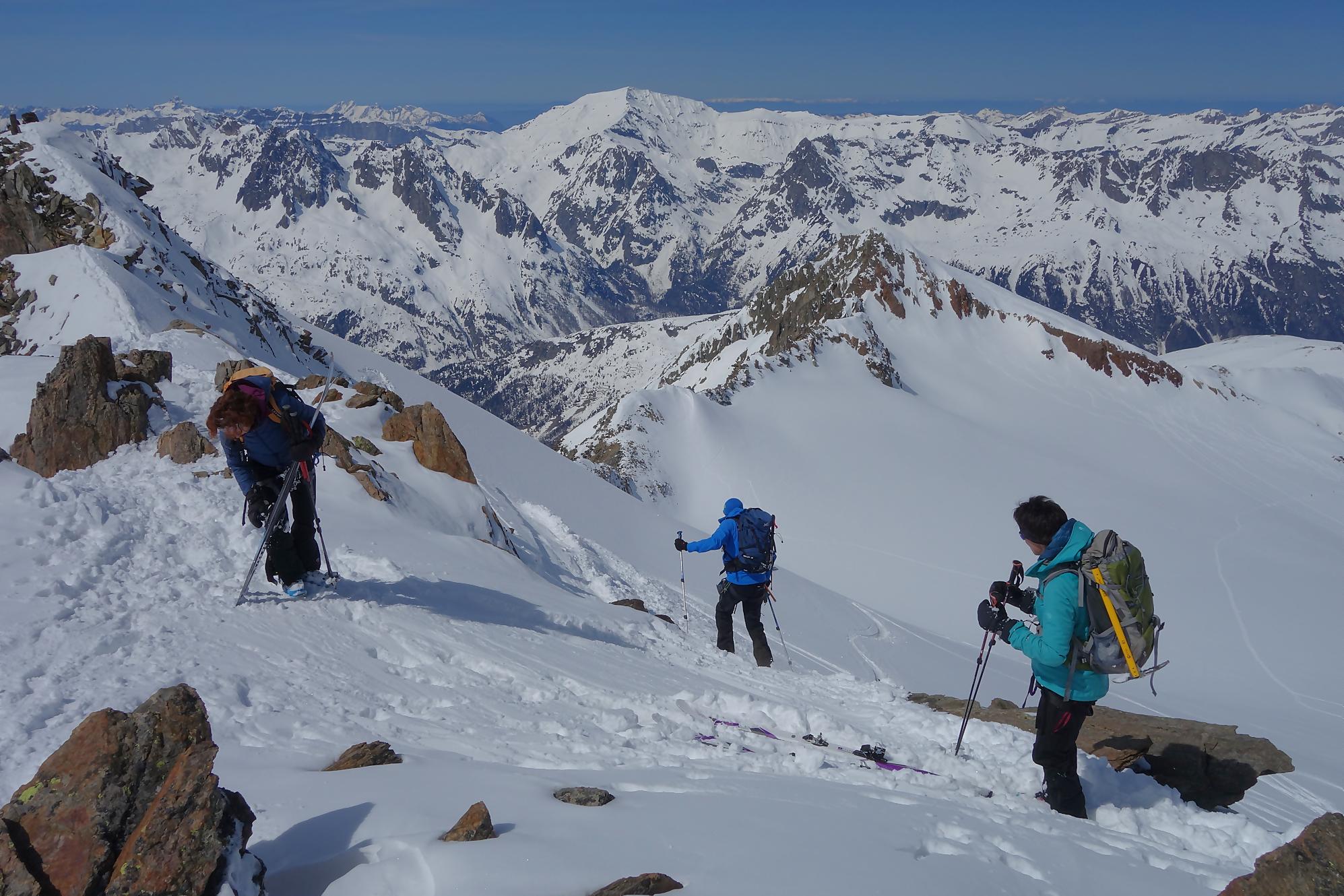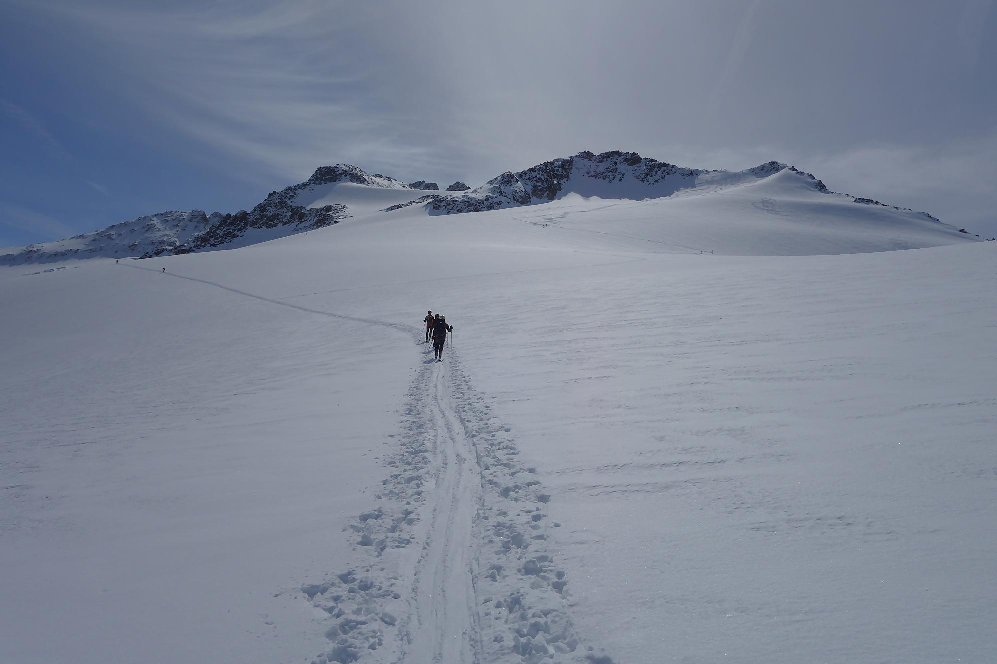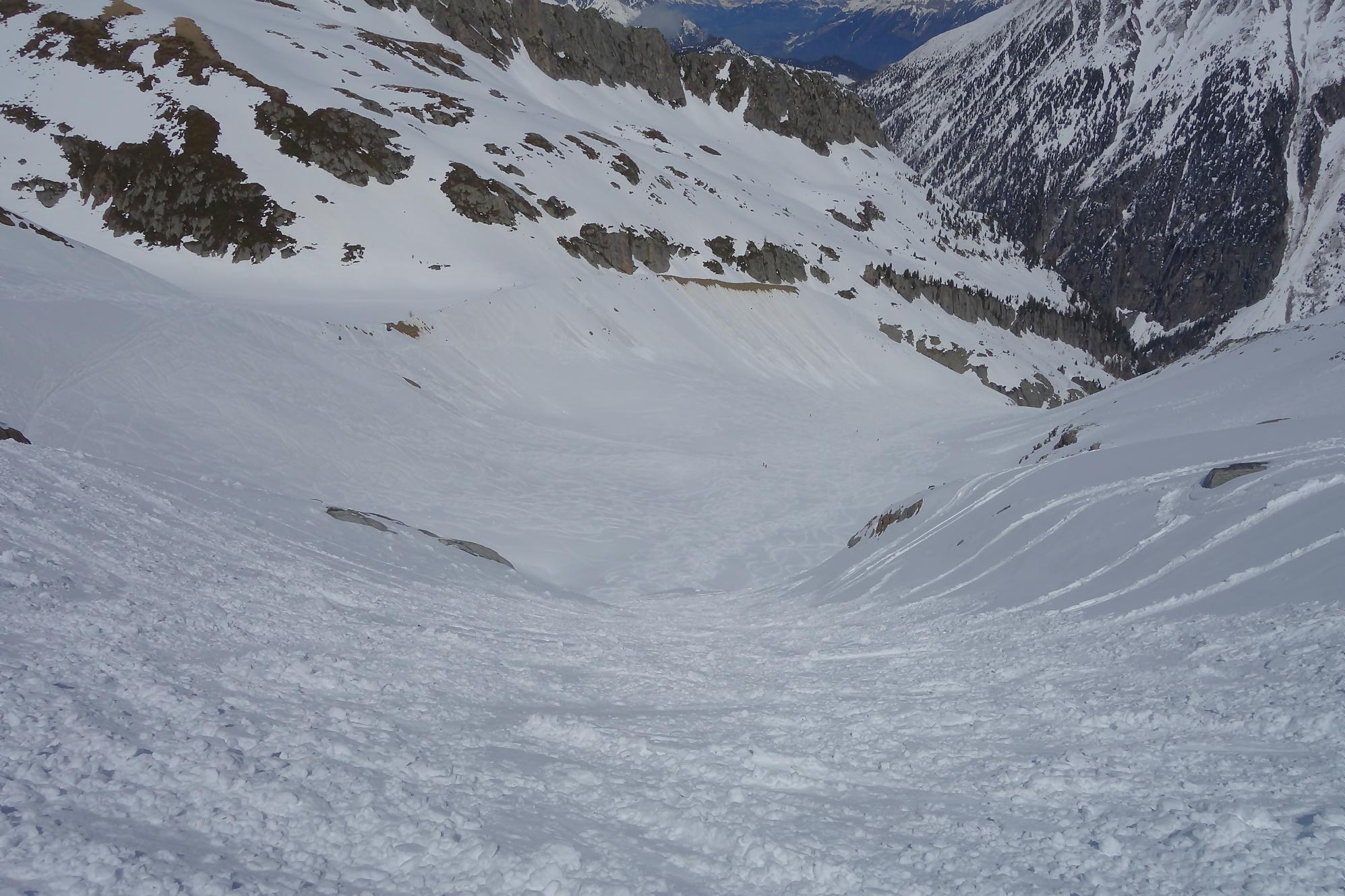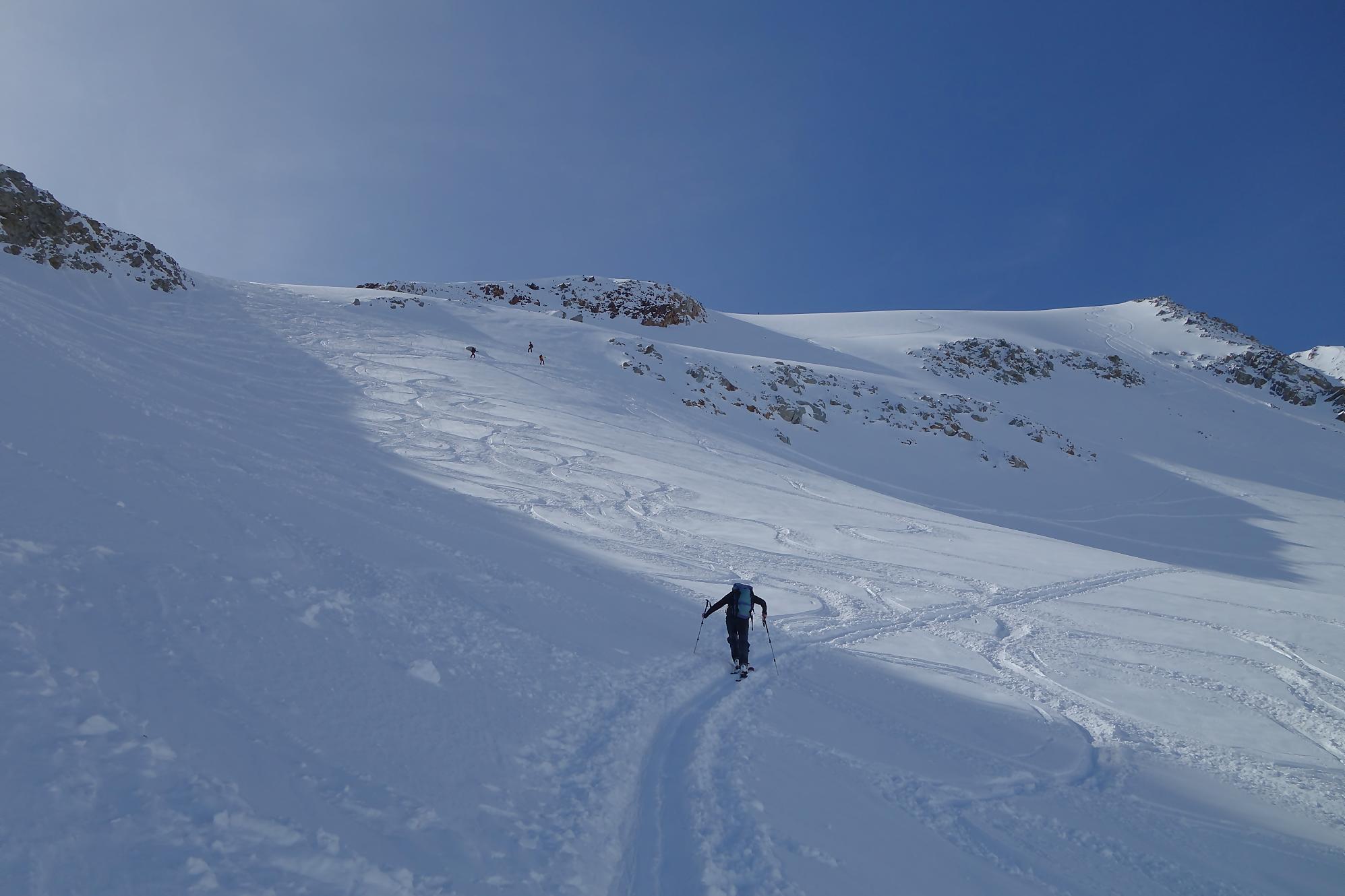 Il faut bien à un moment quitter les lieux, non sans regrets. C’est la descente sur le glacier des Grands. A la montée j’avais bien noté les traces de descentes, ce sera ma ligne. Il a neigé la veille et j’ai le droit à plusieurs cm de poudreuse. Nous sommes presque mi-avril, quel bonheur. Puis la pente s’accentue un peu, sur la carte nous sommes belle et bien sur glacier, mais dans la réalité, peu évident. La neige devient à peine croutée et je rattrape le groupe de Karyne. Puis on retrouve le vallon pentu de la montée, coincé entre les avalanches et la falaise. Il faut descendre parfois sur les carres.