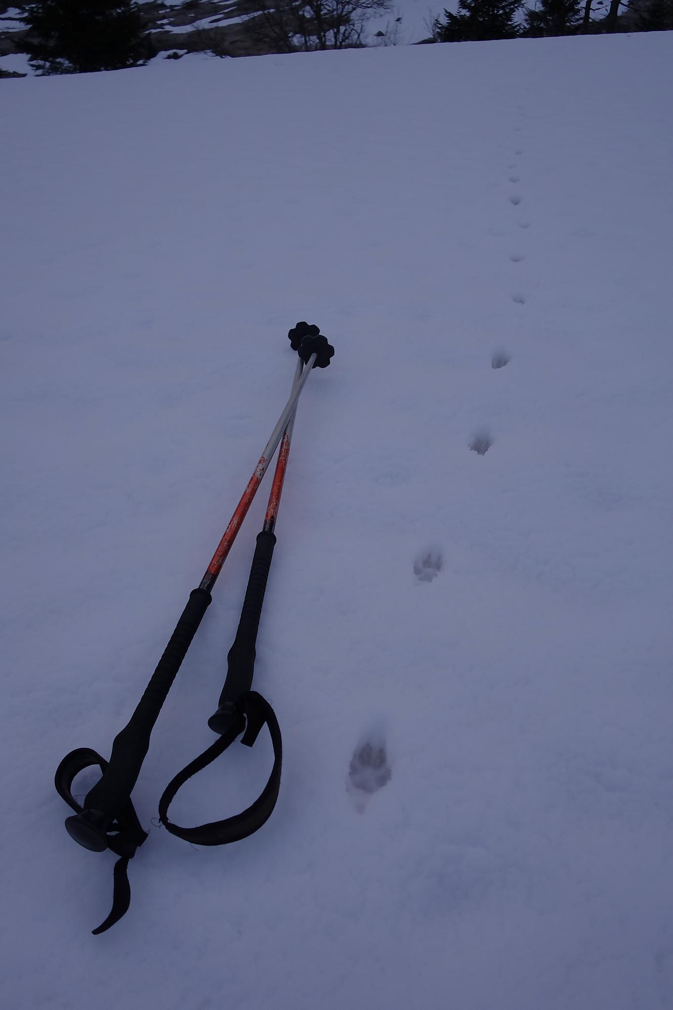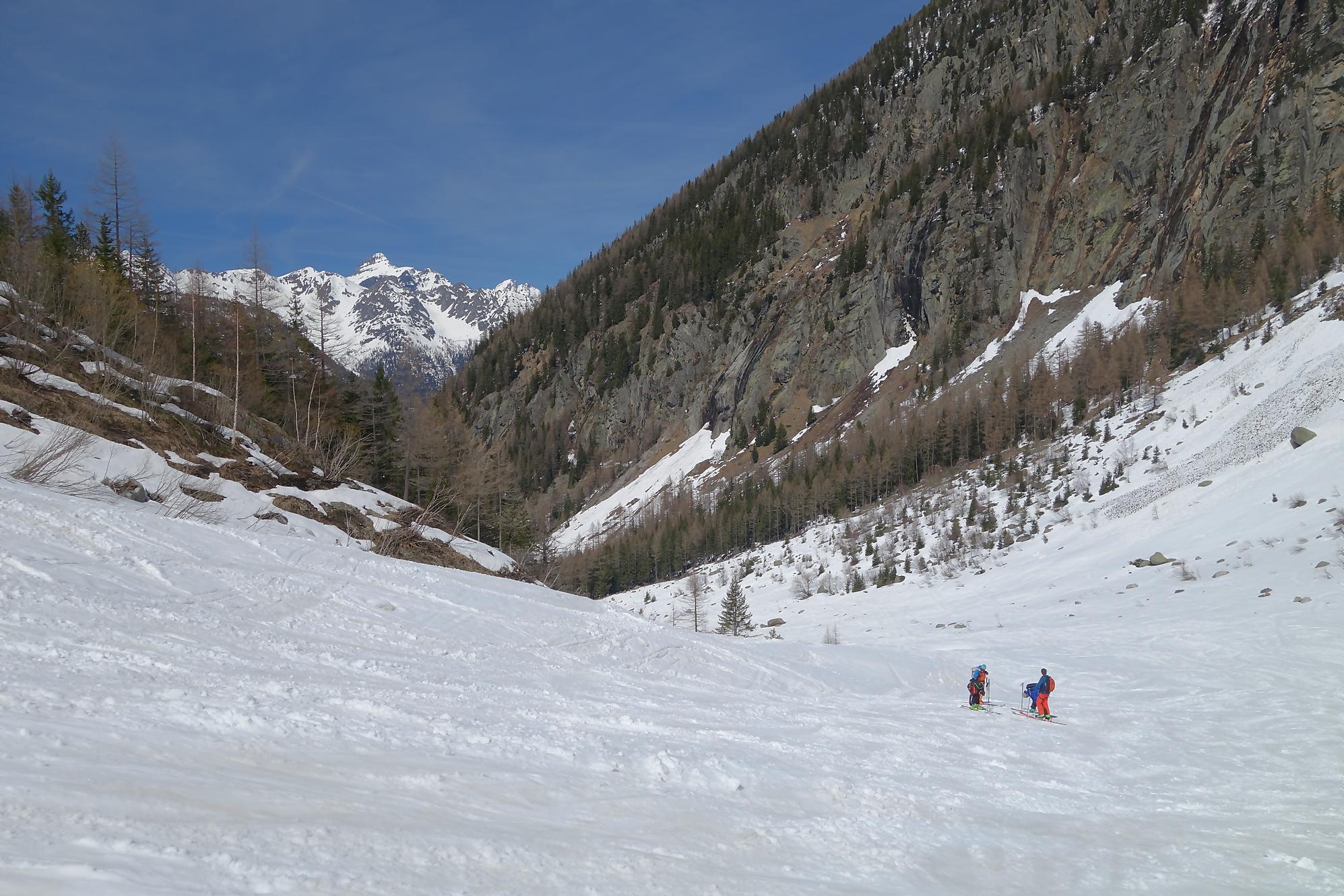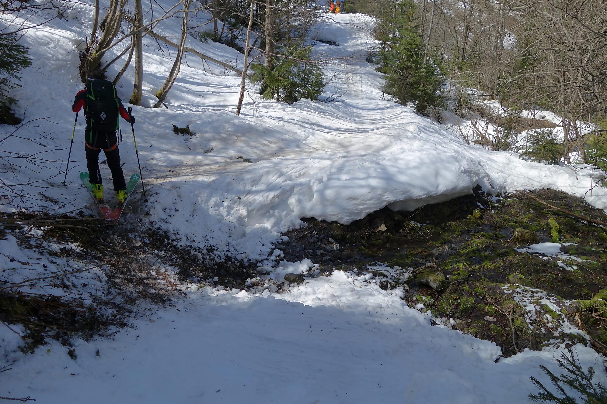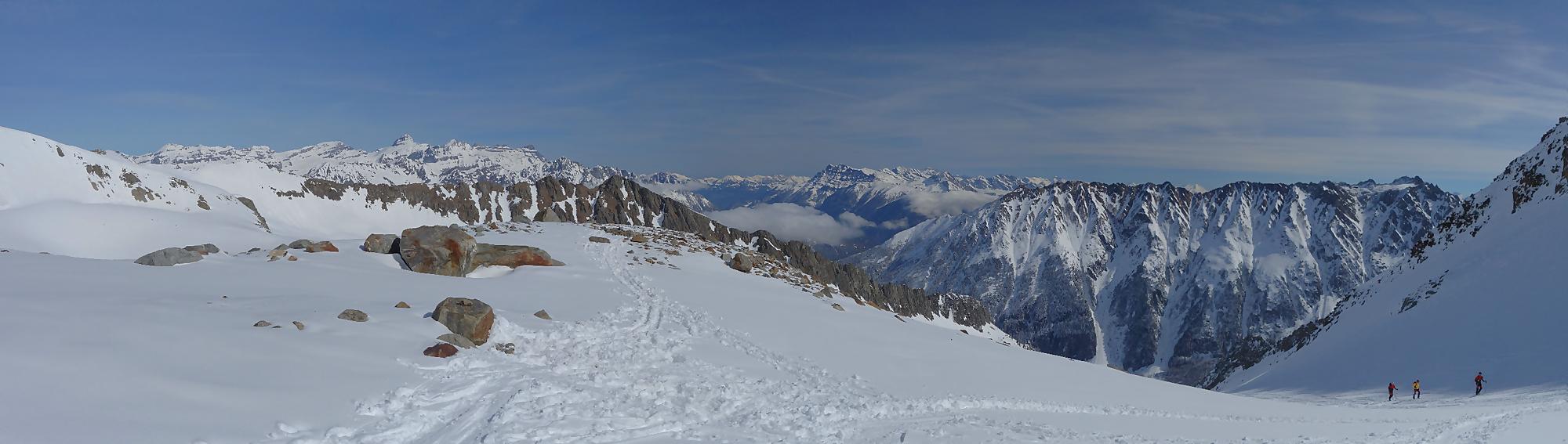 Il faut bien à un moment quitter les lieux, non sans regrets. C’est la descente sur le glacier des Grands. A la montée j’avais bien noté les traces de descentes, ce sera ma ligne. Il a neigé la veille et j’ai le droit à plusieurs cm de poudreuse. Nous sommes presque mi-avril, quel bonheur. Puis la pente s’accentue un peu, sur la carte nous sommes belle et bien sur glacier, mais dans la réalité, peu évident. La neige devient à peine croutée et je rattrape le groupe de Karyne. Puis on retrouve le vallon pentu de la montée, coincé entre les avalanches et la falaise. Il faut descendre parfois sur les carres.