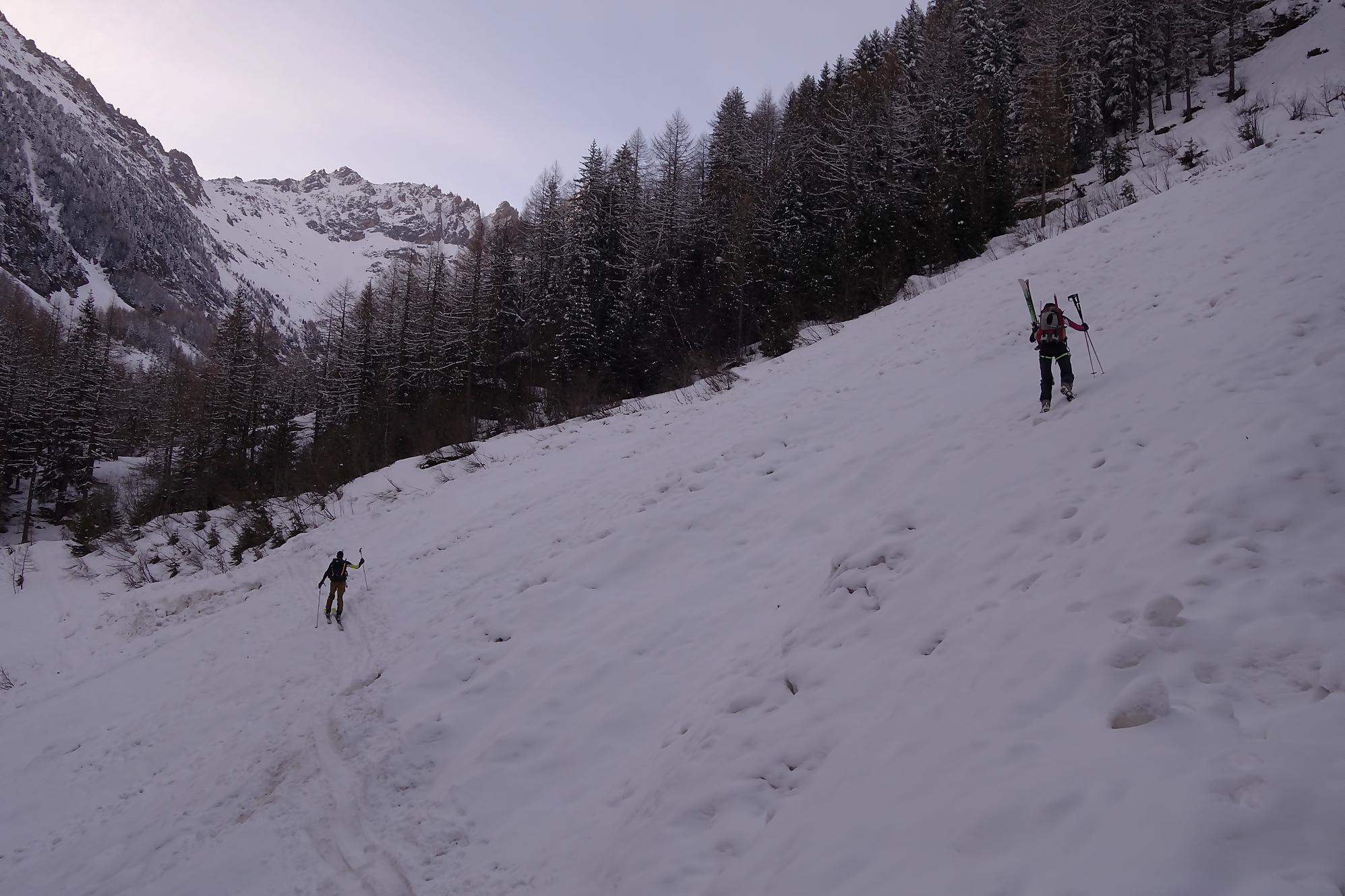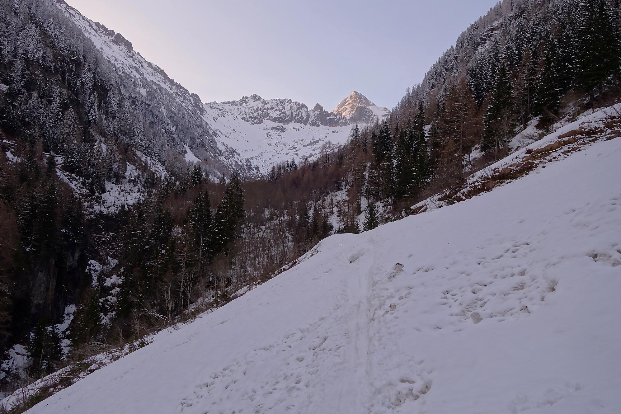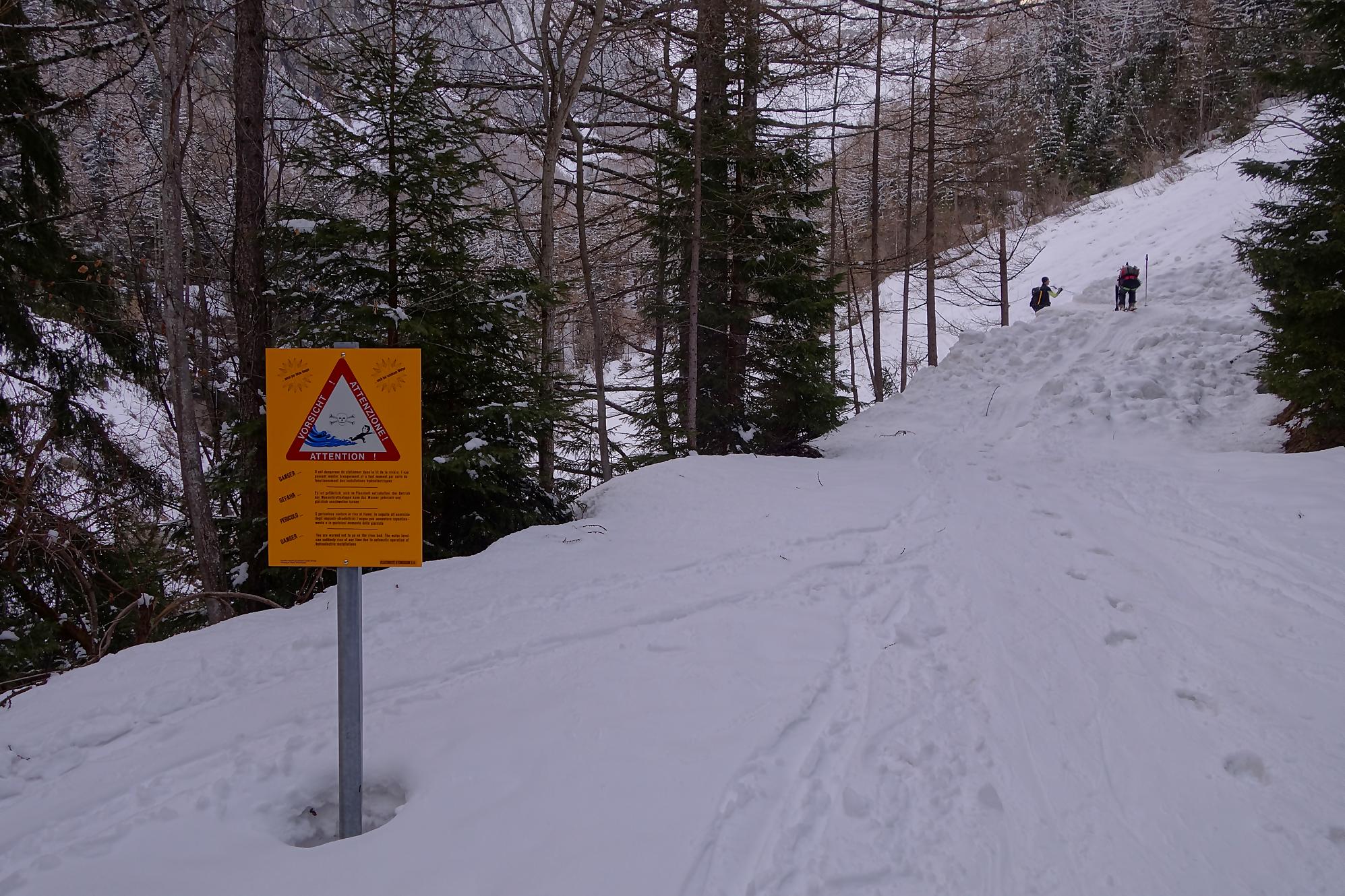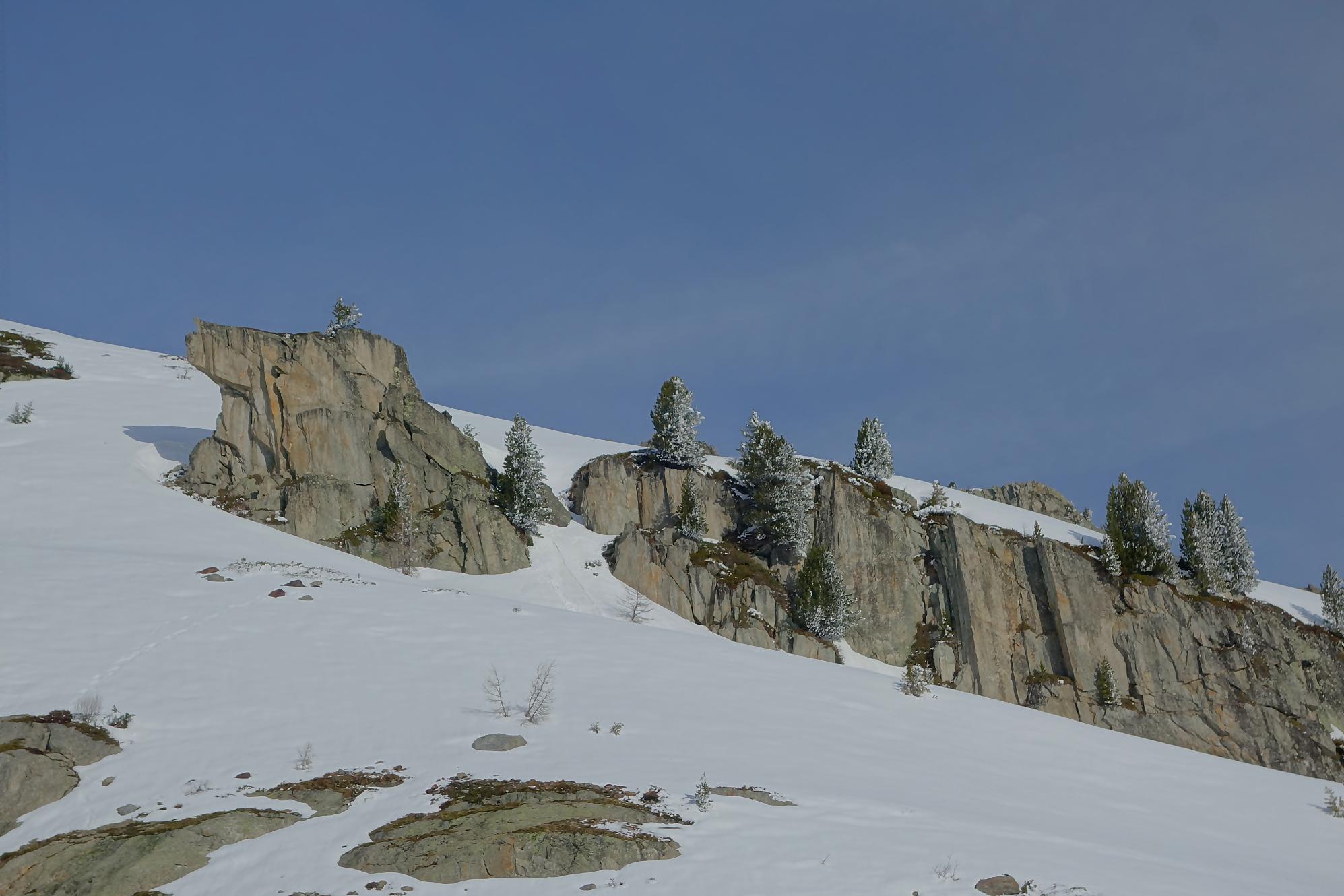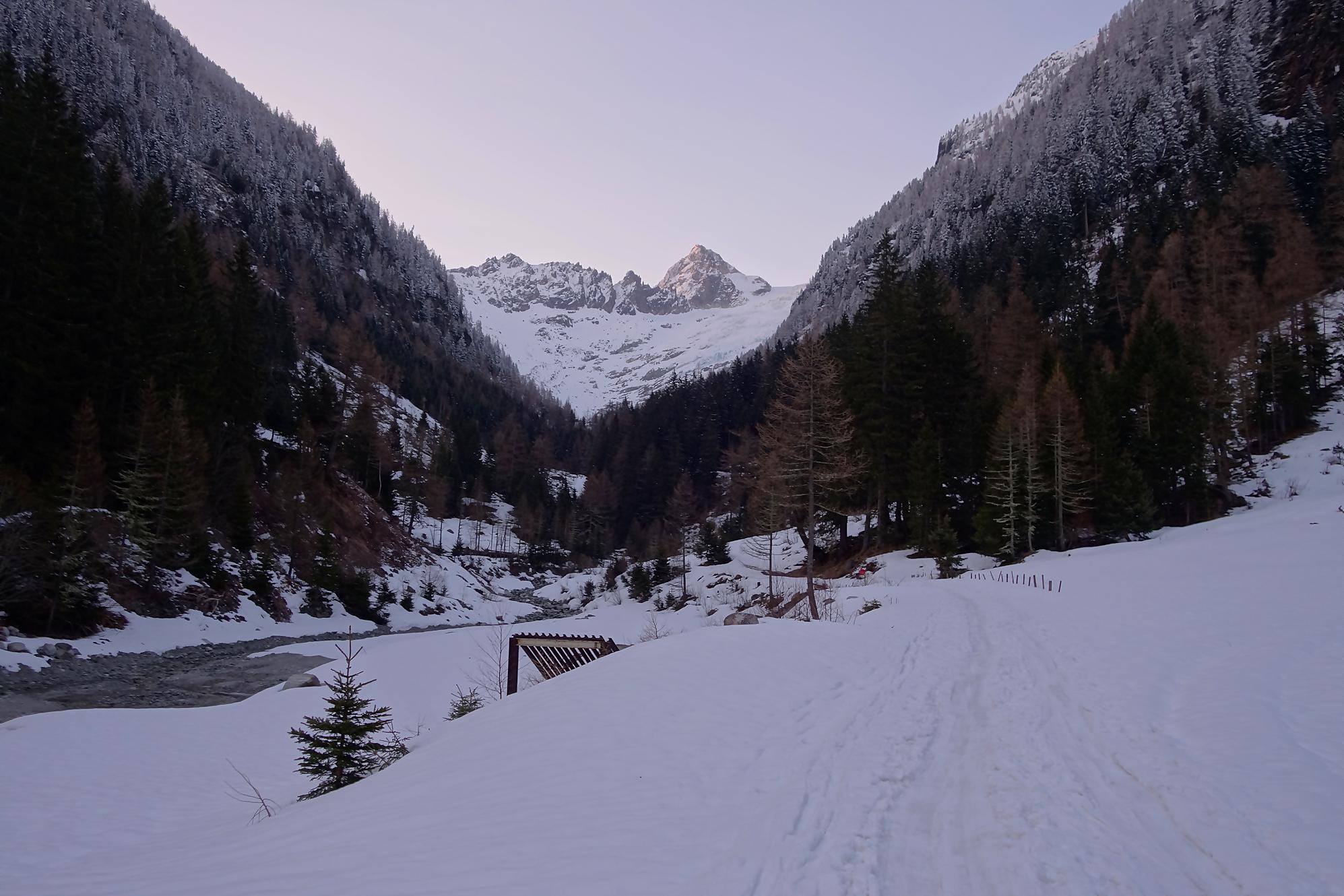 Le départ est à plat, enfin en pente douce. C’est le long des pistes de ski de fond. On traverse une forêt clairsemée pour suivre une route forestière. Il y a trois couloirs avalancheux à passer. Un brin délicat car la trace est gelée, d’ailleurs devant moi une femme préfère le passer à pied. Les couteaux seraient plus judicieux selon moi. J’arrive au niveau de la buvette d’été du Chalet du Glacier avec ses informations touristiques sur le bisse du Trient. Au retour je passerai devant. Actuellement c’est un peu la lutte avec les vernes, peu confortables. J’en sors enfin. Vers 1700m, c’est la fin de ce vallon, il faut bifurquer à droite. Une pause et c’est parti pour une longue montée. C’est désormais pentu et je sens que cela va être long. Le soleil émerge à la crête et avec la petite neige de la veille rend les lieux féeriques. Un plateau permet une pause au soleil, quel bonheur !