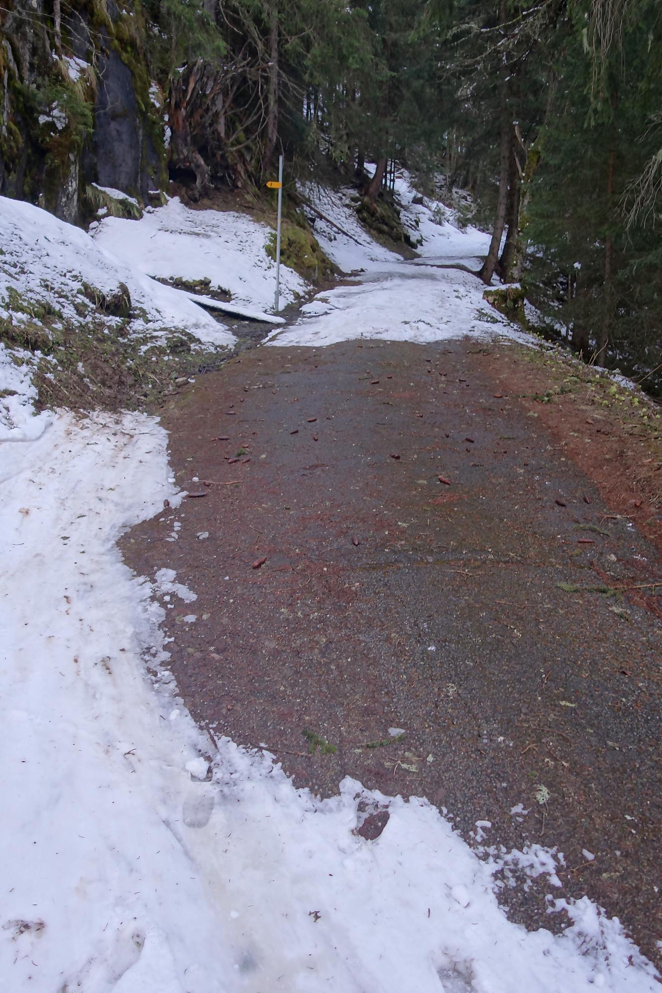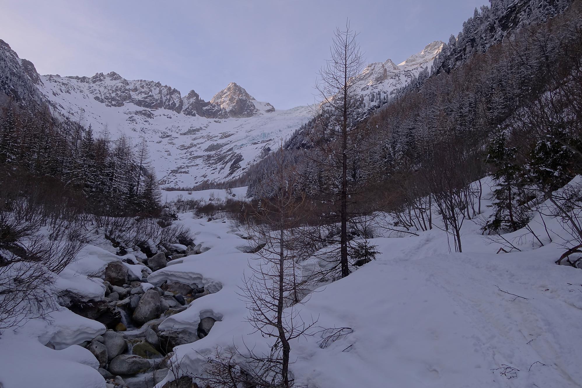 Puis je rejoins le vallon du Trient et file tranquillement dans une neige transformée. Je passe devant le Chalet du Glacier, traverse le pont, puis c’est la descente par le chemin de la montée. Pas toujours évident de descendre les chemins en forêt. C’est le retour au parking où je peux constater que les voitures viennent de tous les cantons romands, de France et d’Italie. Cet itinéraire est donc une grande classique, mais qu’est-ce qu’il est beau … mais long !