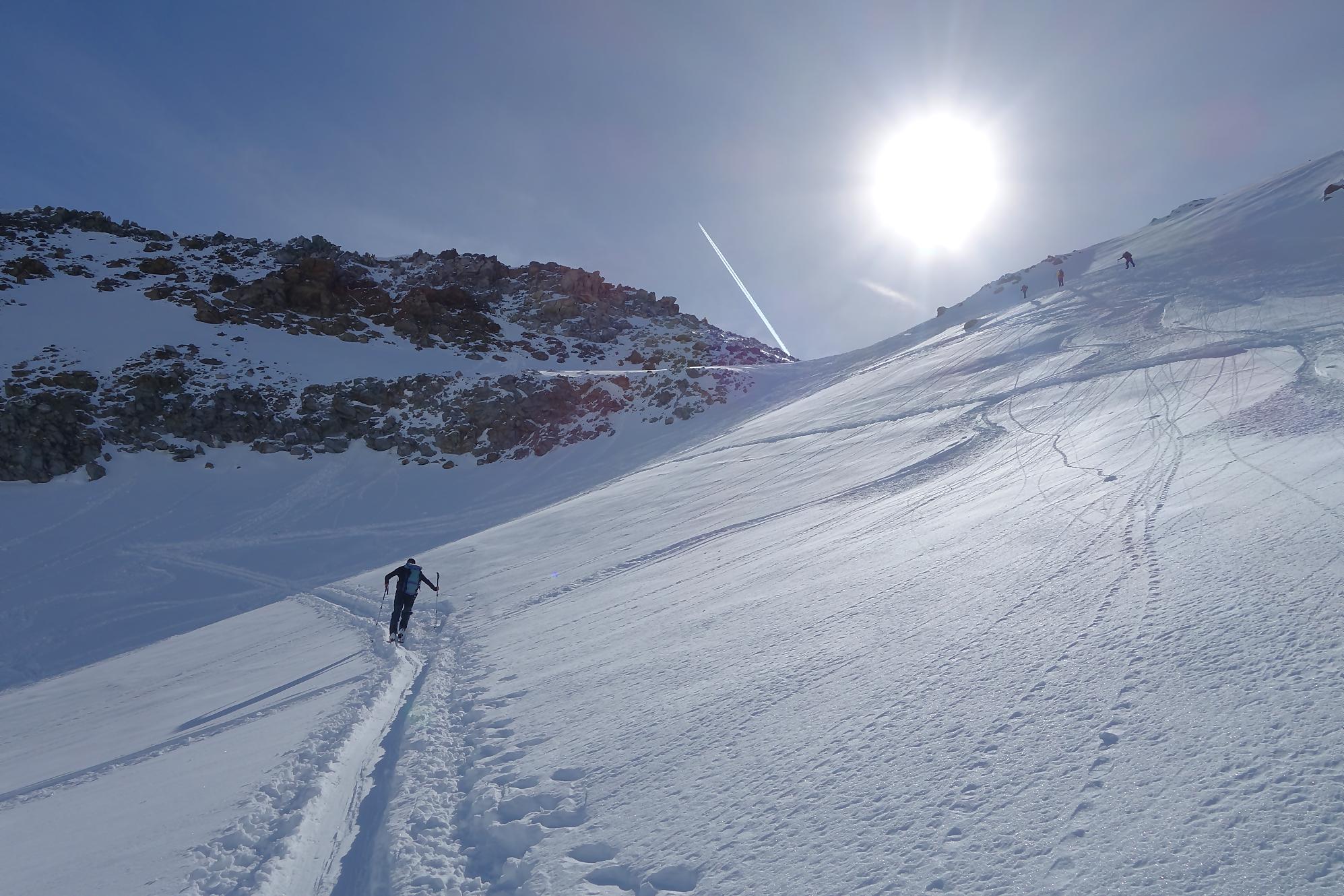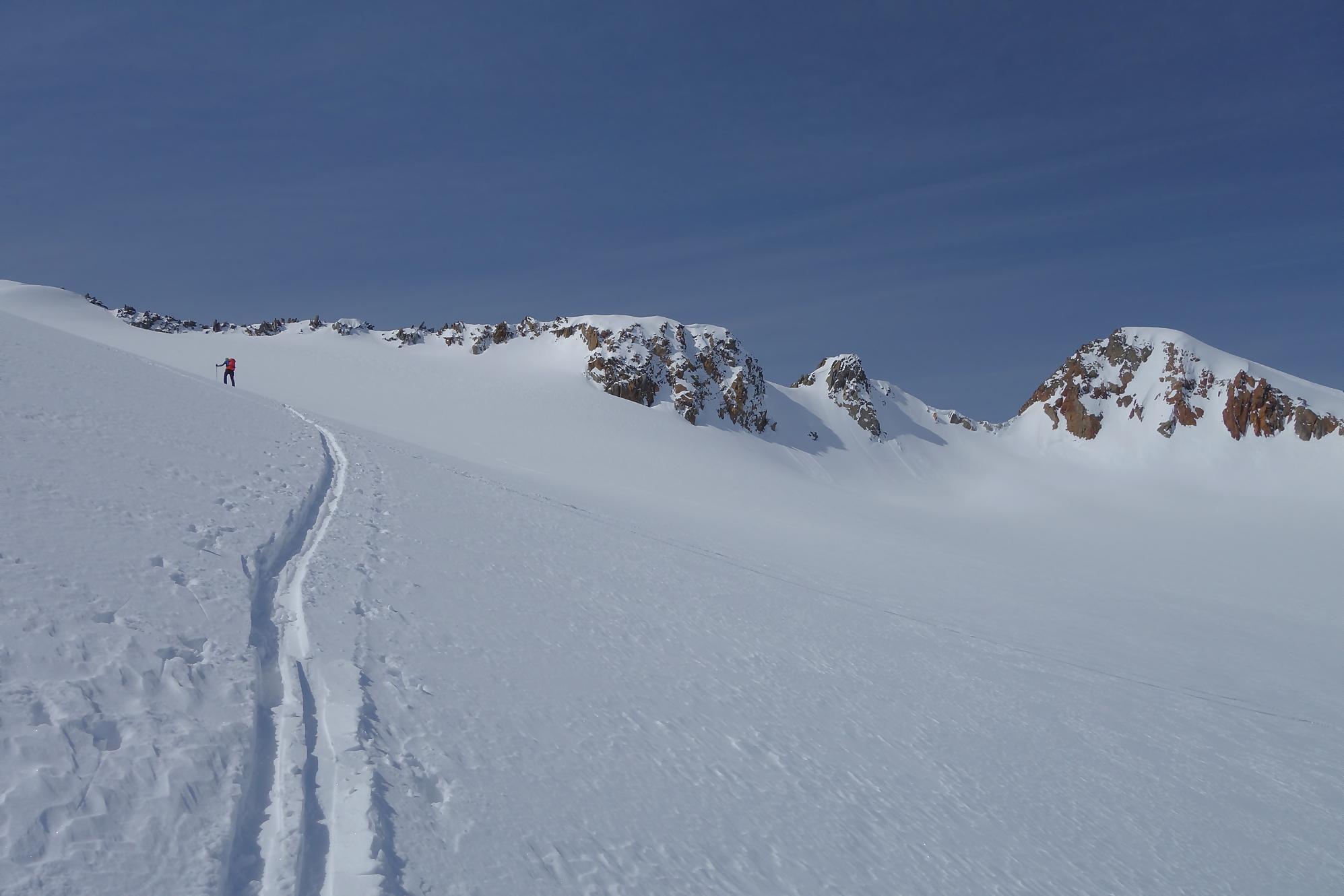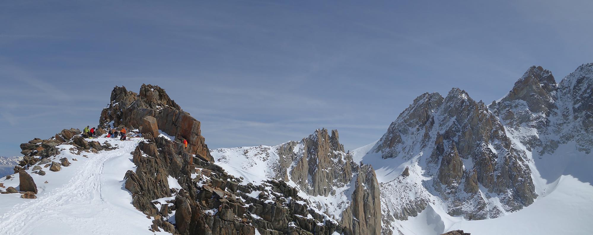 La montée se poursuit et le but est de contourner le sommet devant nous : La Croix des Bérons. Je suis en forme, il fait beau je décide de poursuivre mon plan A. Le chemin se raidit dans la face NO de ce sommet, les conversions s’enchainent. Les derniers 100m me demandent de l’attention, la pente est déversante et mon ski aval n’a que peu d’appui. Je ralentis et tant pis pour le collant-pipette qui piaffe derrière moi. Plusieurs hélicoptères font des rotations, j’apprendrai plus tard que la zone est un lieu de dépôt de l’héliski. J’arrive au col sous la Croix des Bérons, quel panorama. Je m’en mets plein les yeux. Je prends une brève pause. Un sommet se dresse devant moi, l’Aiguille du Midi avec une jolie trace de montée. Finalement ce sera mon sommet