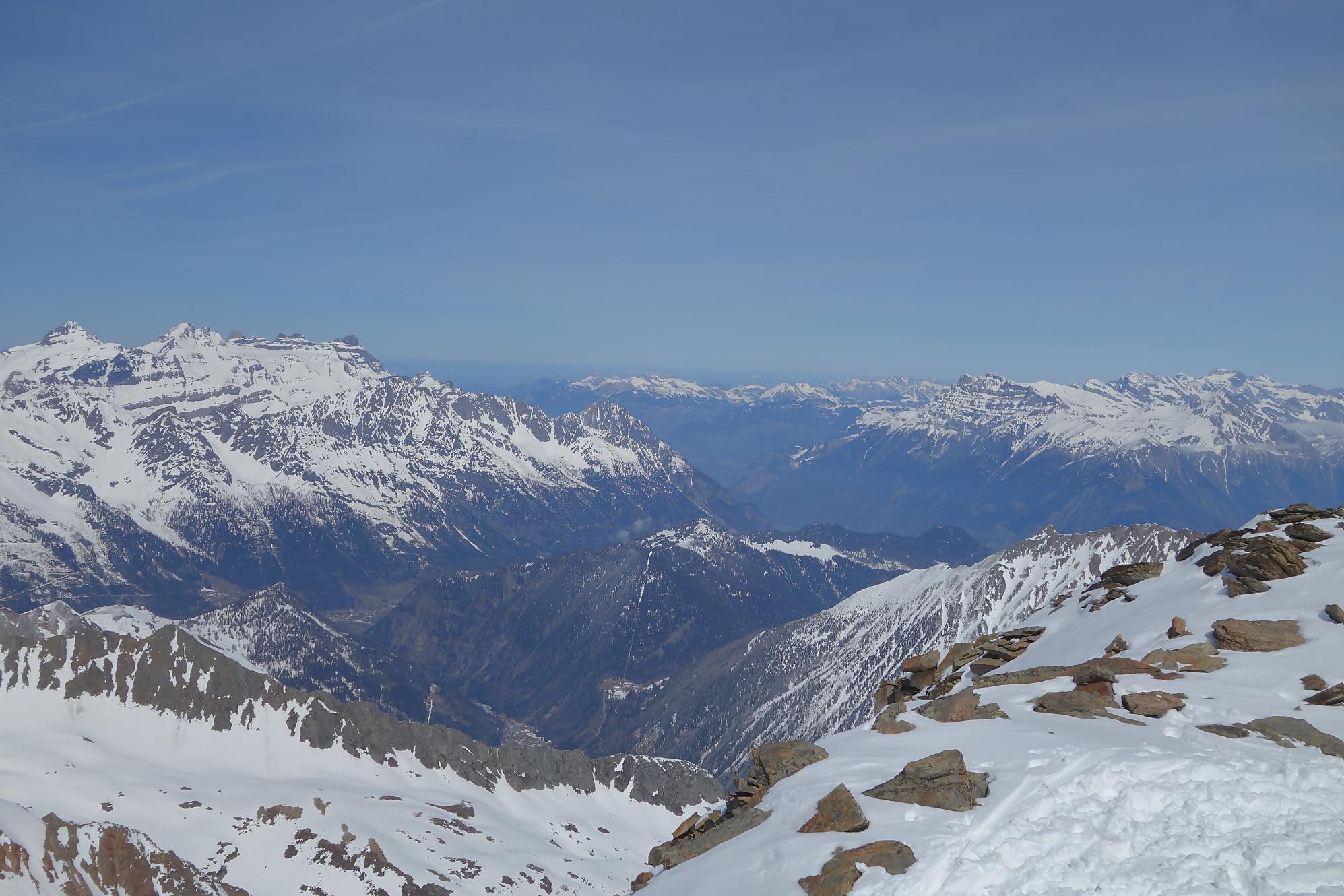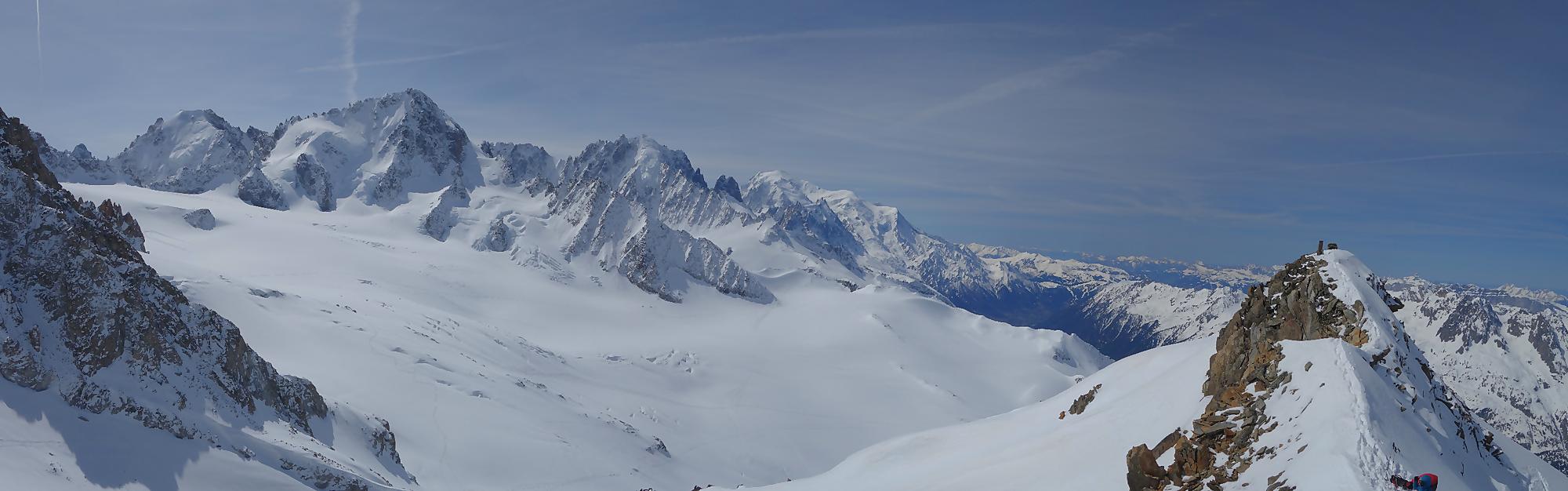 Je traverse le plateau (glacier des Grands) et c’est la montée finale. Le dénivelé se fait sentir, la faim et la soif. Mon coeur bat la chamade, c’est désormais le moral qui me fait avancer. Avec une dame, on se suit, marquant des brèves pauses pour reprendre le souffle. Les collants-pipettes descendent déjà. Techniquement, il n’y a pas de difficulté ici, mais la longueur et le dénivelé se payent cash. Cela me fait penser à ma randonnée au Rogneux en 2010, mais qui à l’avantage d’une distance plus courte pour un peu plus de dénivelé. J’arrive au sommet, enfin la crête car le sommet lui-même est du rocher. La vue est grandiose, sous mes pieds s’ouvre le Glacier du Tour, en face l’Aiguille du Chardonnet et surtout le Mont-Blanc qui semble si proche. Fort ! Aiguille du Génépi, avec un nom pareil, ça sent la France, normal le sommet fait frontière.