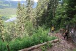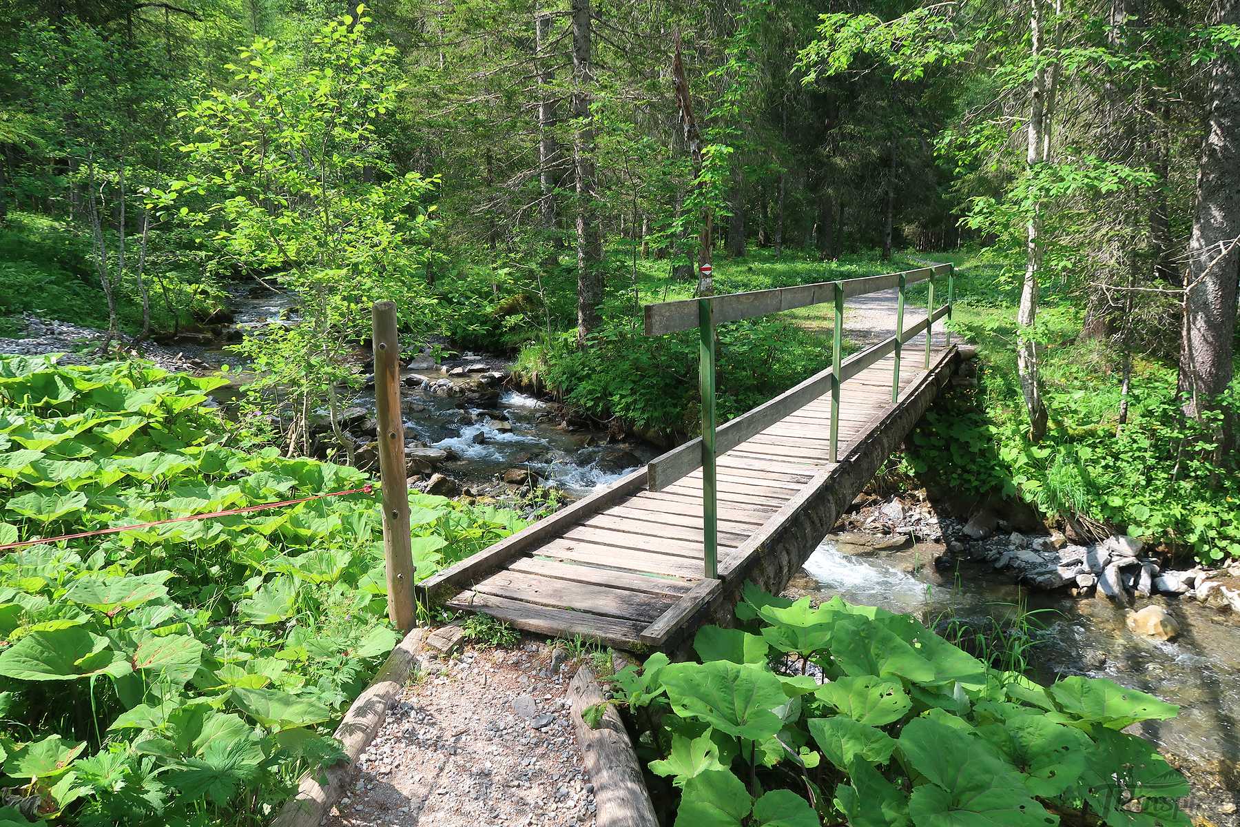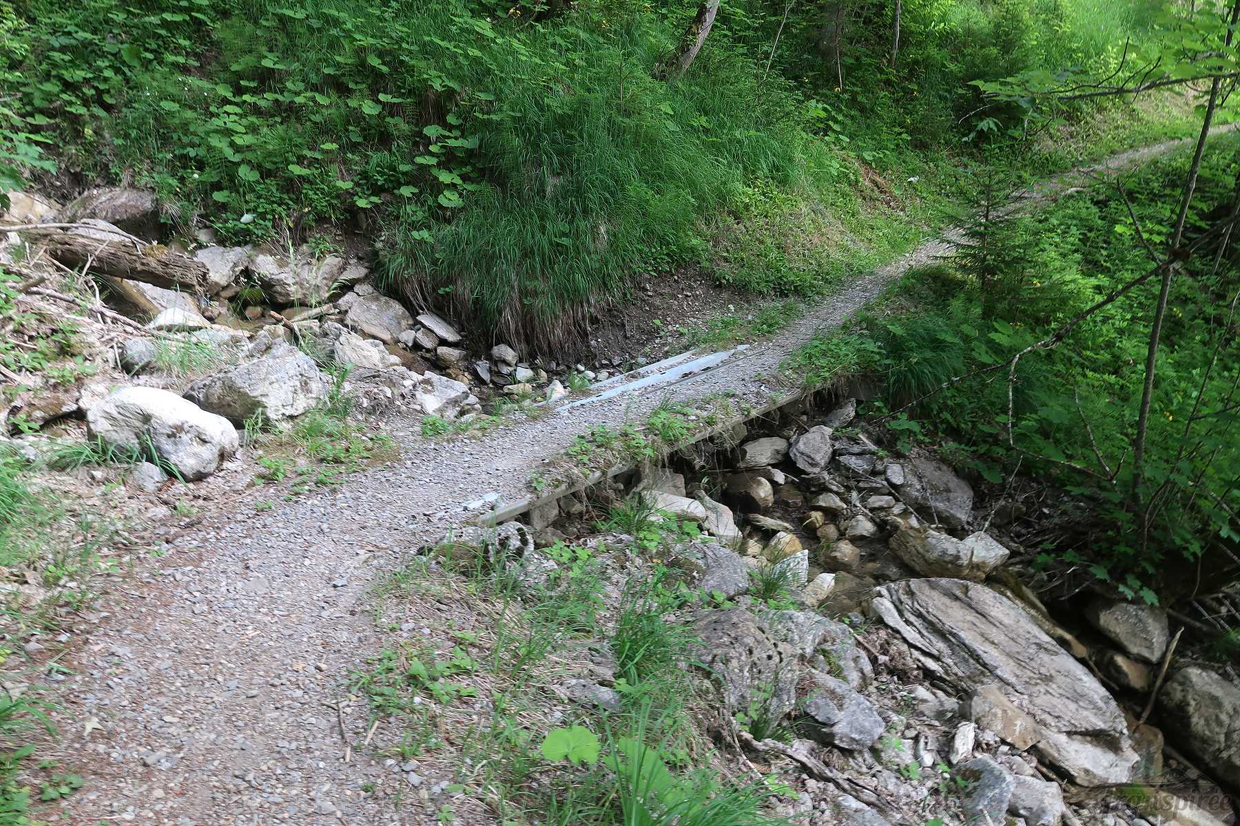 Nous partons directement, sans visiter le lac (l’idée est de garder cela pour une autre fois). Emporté dans mon élan, je file par la route qui mène au lac. Demi-tour, il faut emprunter un petit pont pour filer en forêt.