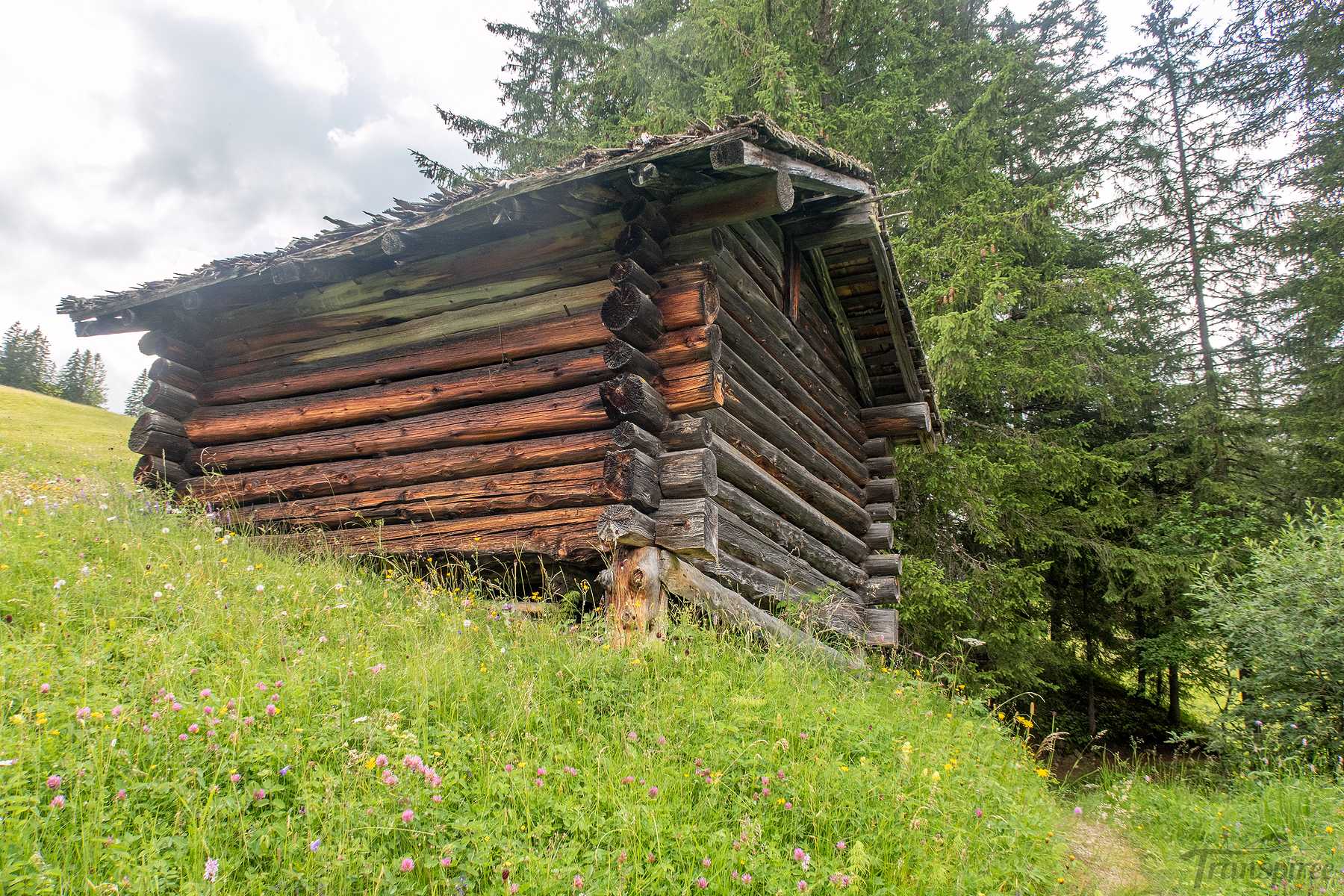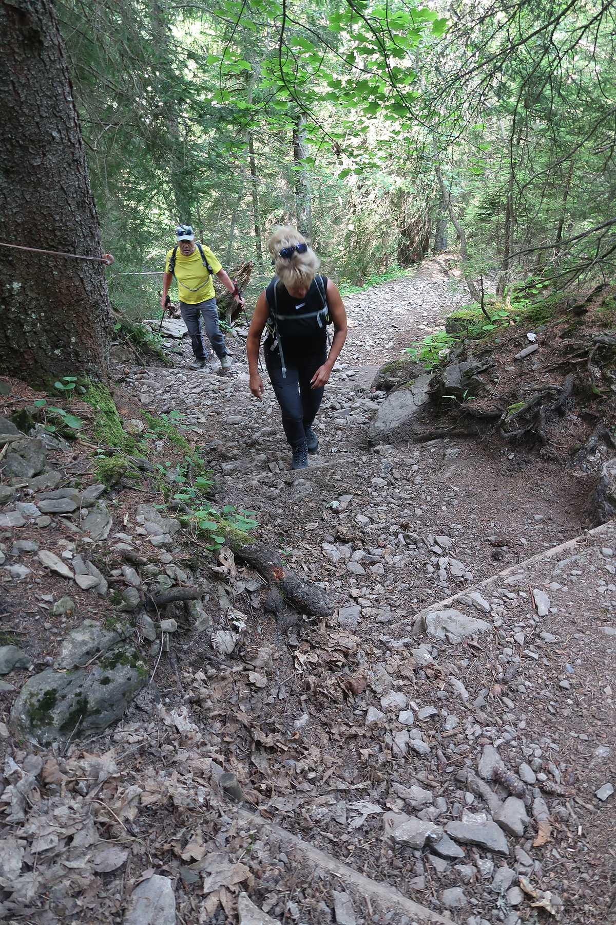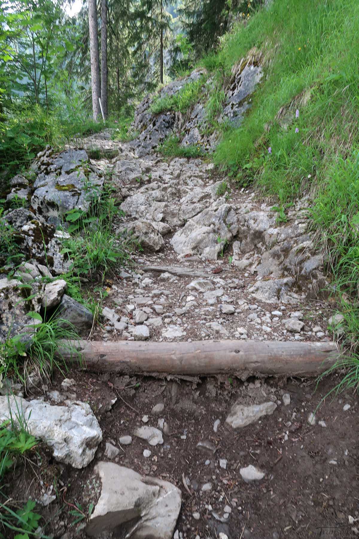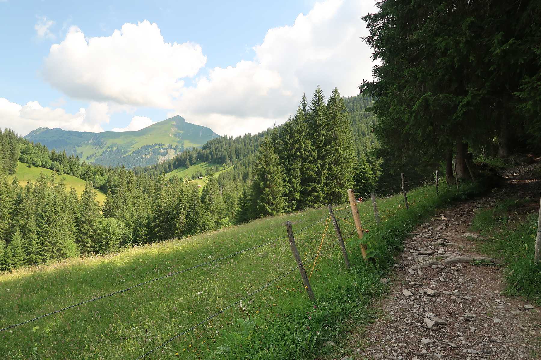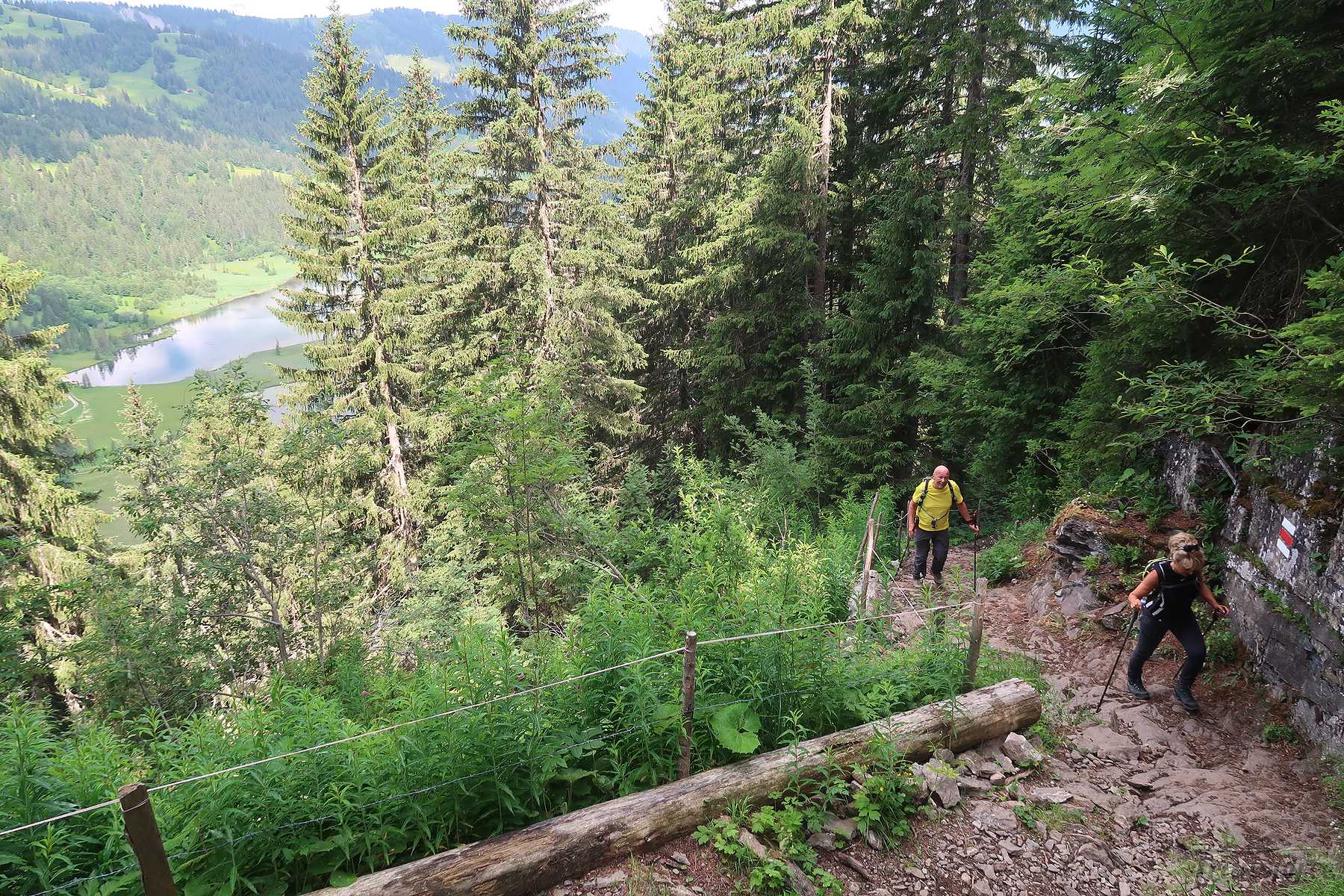 Le sentier est d’abord tranquille, puis après une ferme, il monte tout en zigzags. C’est plutôt raide, mais régulier. Des trouées permettent de voir, derrière nous, le lac Lauenensee. Joli. Le sentier est assez large et des marches facilitent la progression. Par temps de pluie, l’ambiance doit être tout autre. Tient une musaraigne se laisse contempler un court instant.