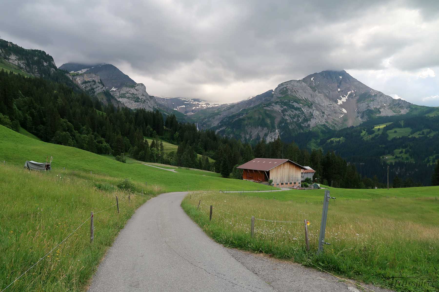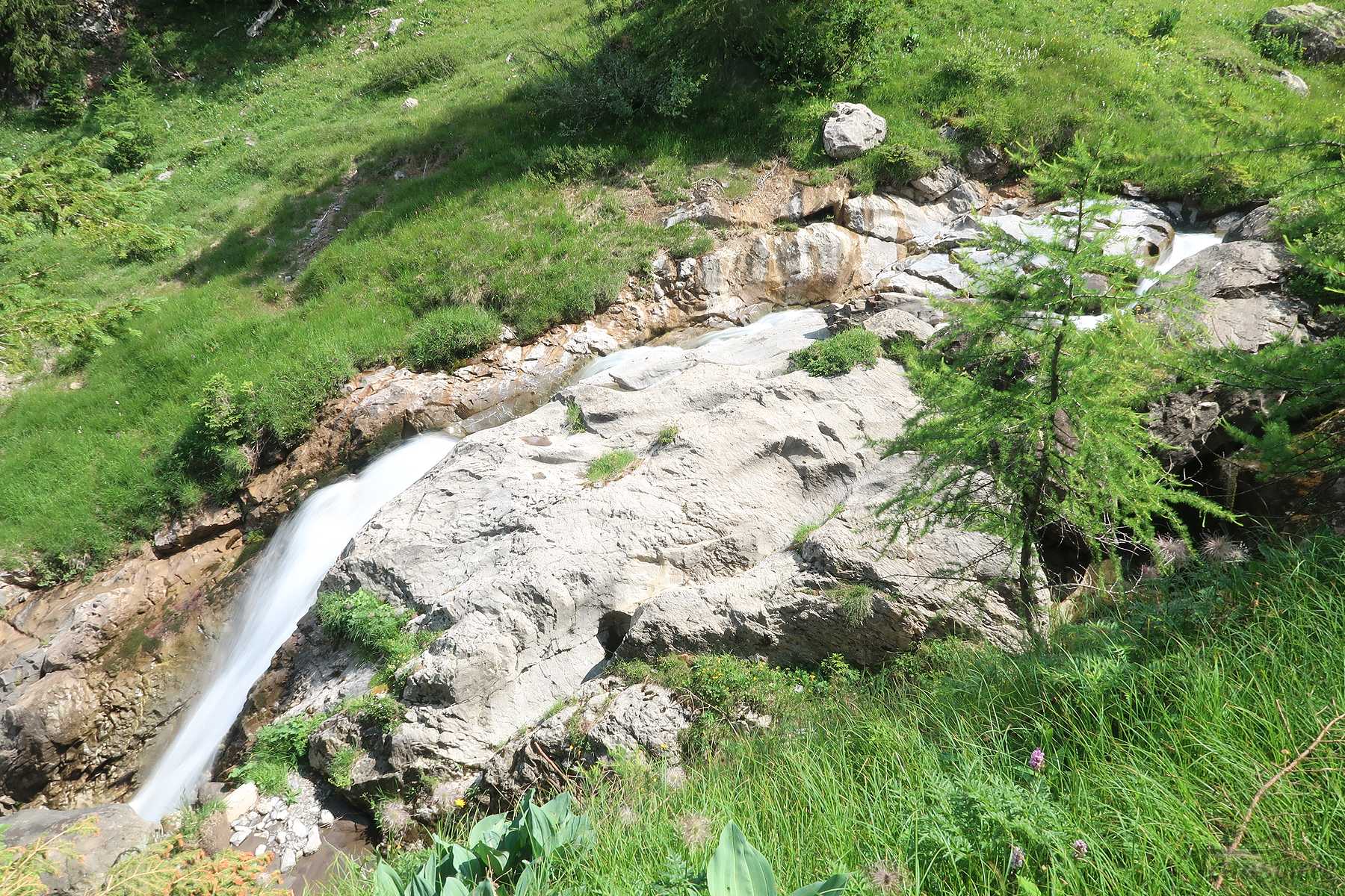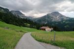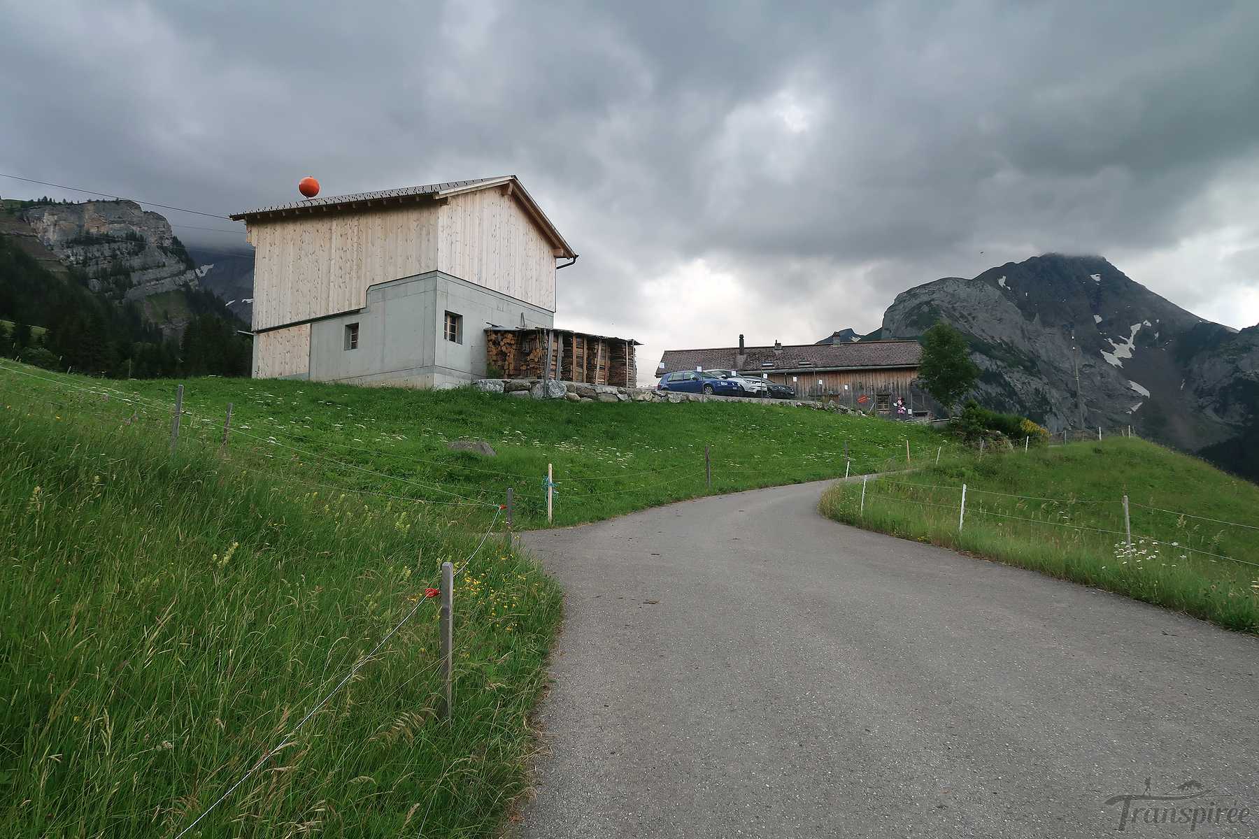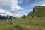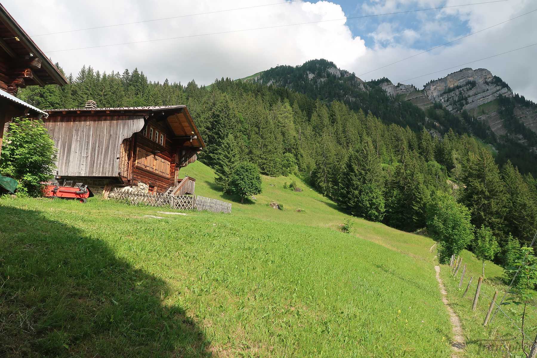Vers 1700m, on sort de la forêt et passons sous le câble du monte-charge. Le sentier devient doux et longe la rivière locale (Tungelschutz). Il y a même une mini-cascade. Nous arrivons dans le pâturage de Chüetungel, le panorama s’ouvre sur le cirque local, c’est joli. Les vaches pâturent tranquillement et il faut passer devant leur étable et son parfum unique des cochons.