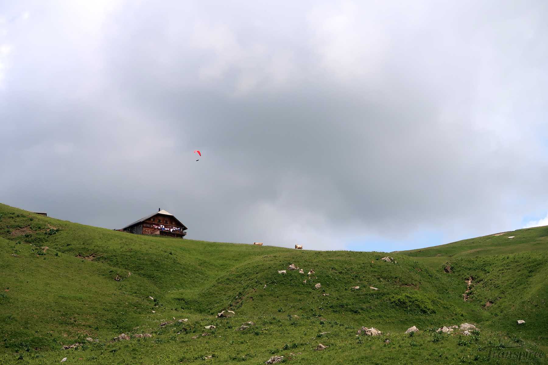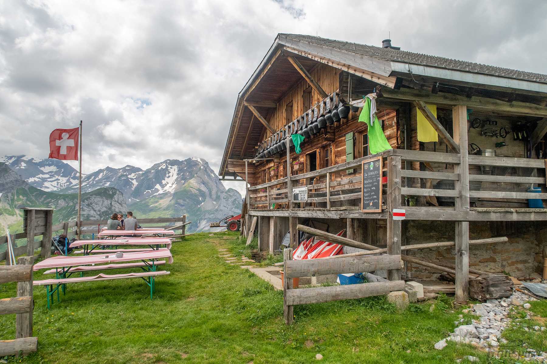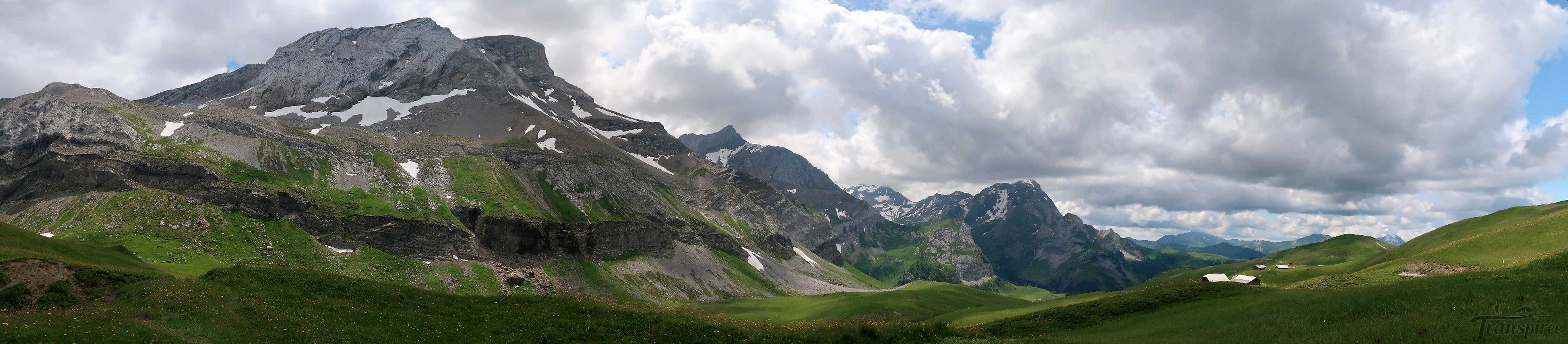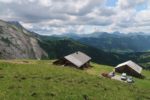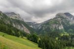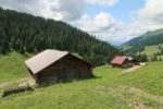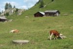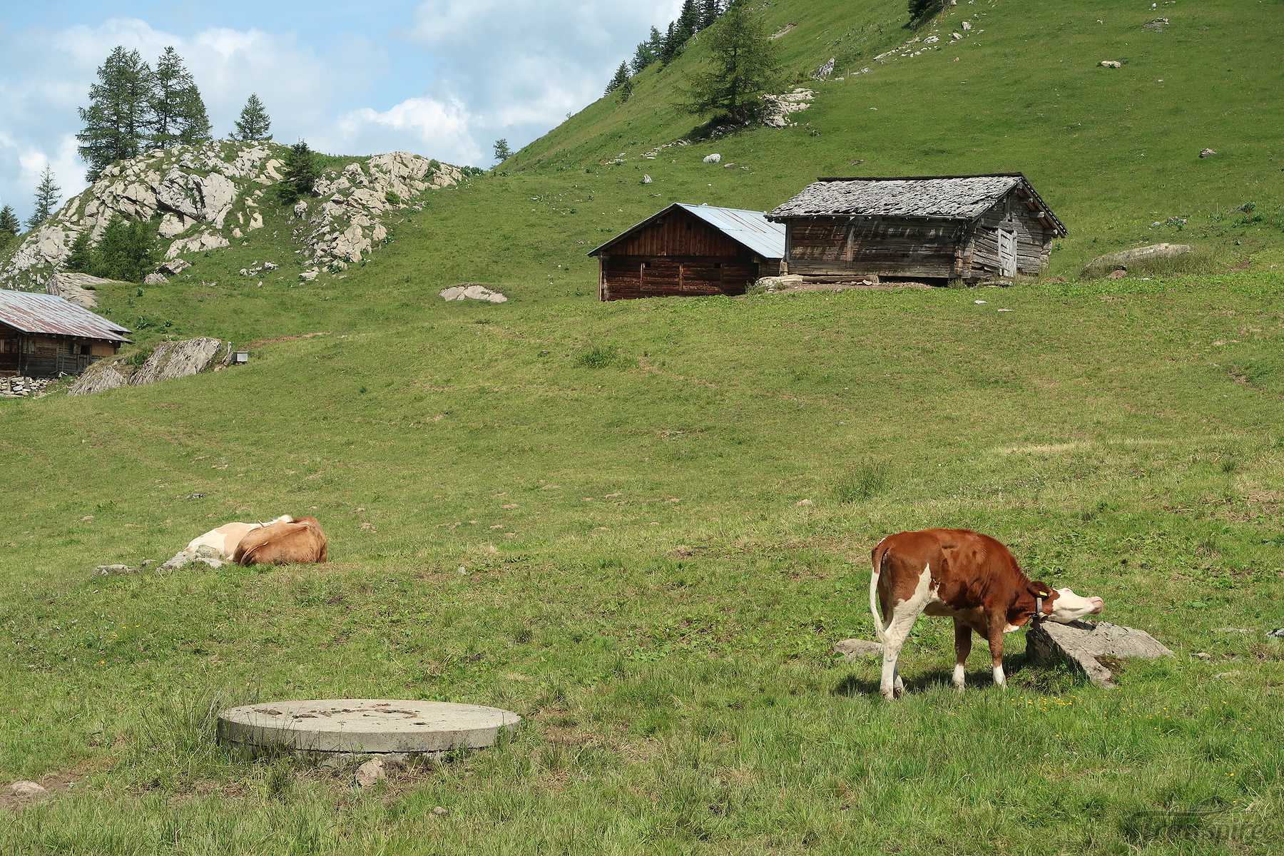 Vers 1700m, on sort de la forêt et passons sous le câble du monte-charge. Le sentier devient doux et longe la rivière locale (Tungelschutz). Il y a même une mini-cascade. Nous arrivons dans le pâturage de Chüetungel, le panorama s’ouvre sur le cirque local, c’est joli. Les vaches pâturent tranquillement et il faut passer devant leur étable et son parfum unique des cochons.