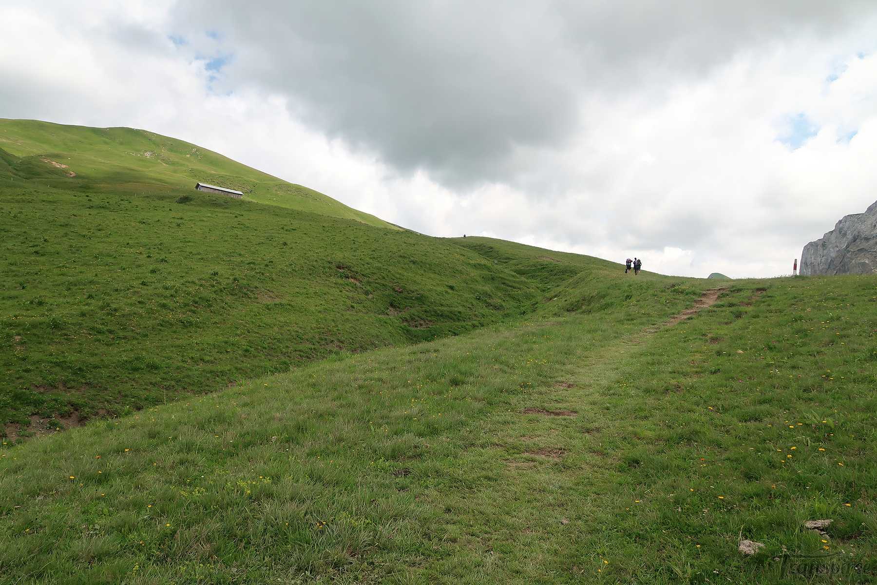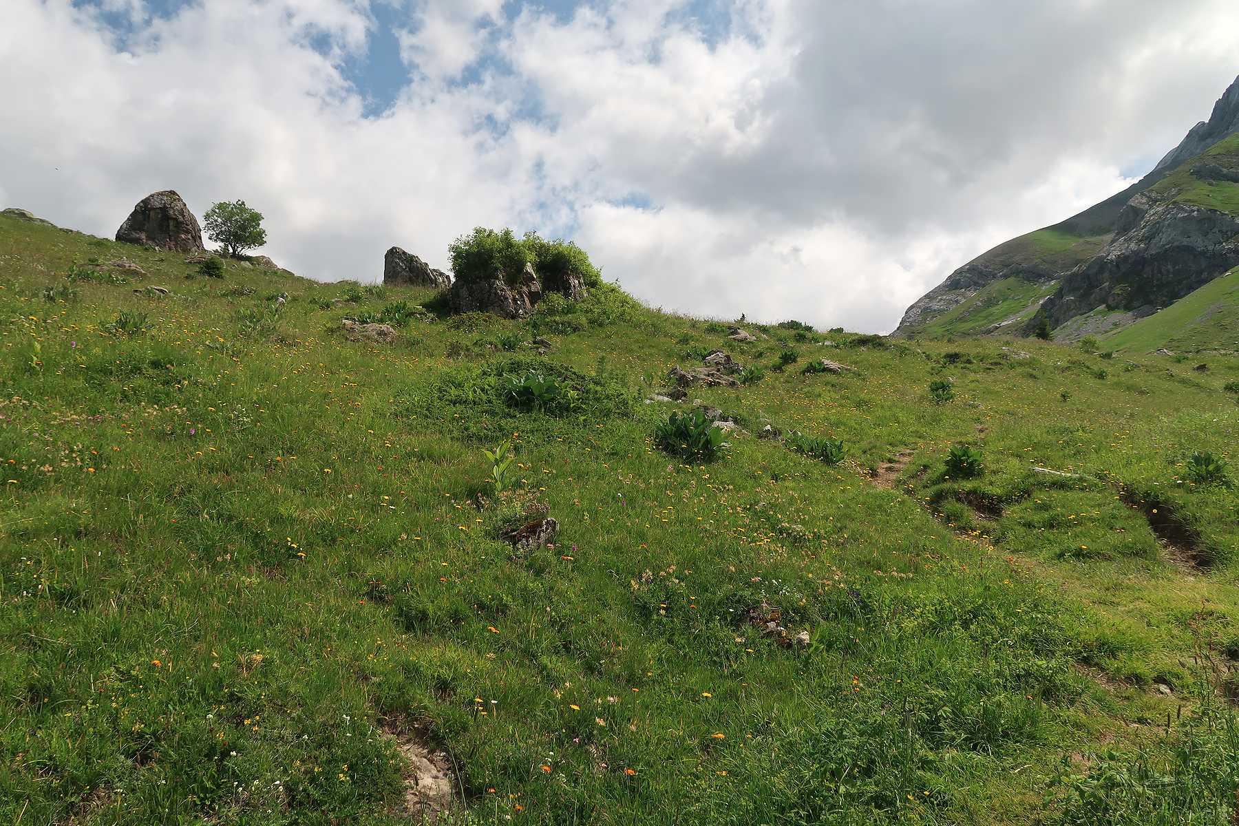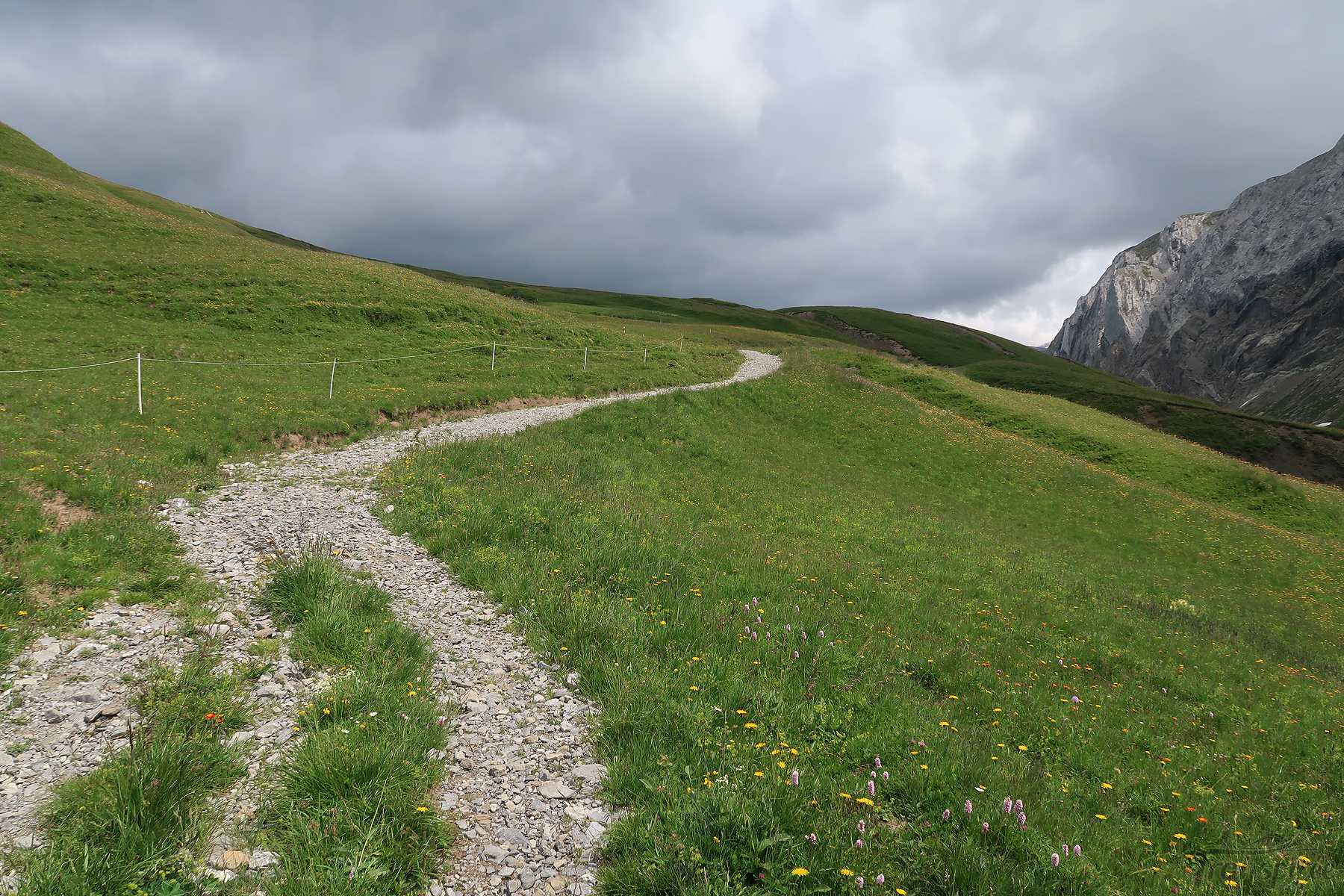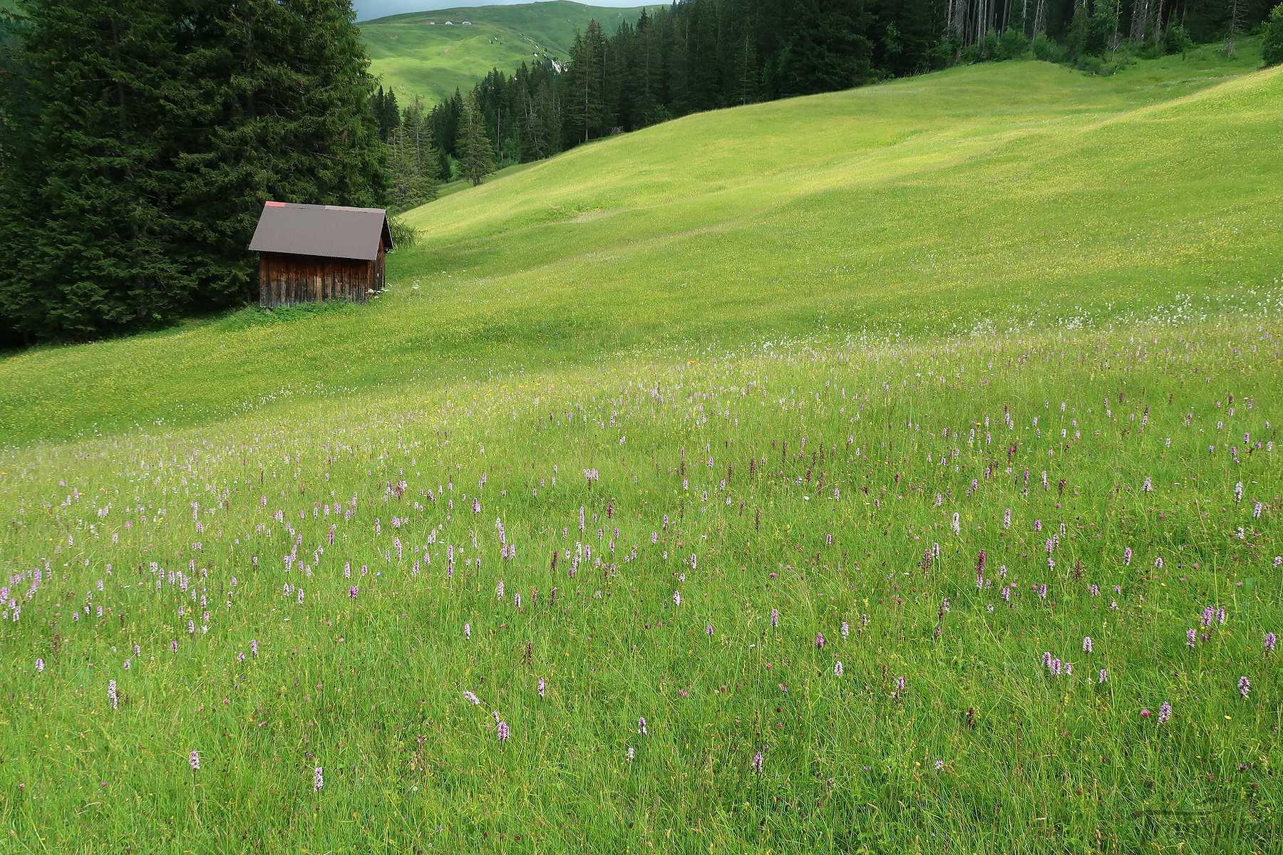 On suit désormais une route d’alpage, cela fait du bien car la dernière portion du chemin fut peu confortable. Vers 1600m, il faut quitter la route et traverser le cours d’eau local (Blattibach) via un pont. Le sentier remonte dans des pâturages, il faut suivre les piquets, le chemin est peu marqué. Il y a des abris isolée et la surprise est de voir un champ rempli d’orchis, jamais je n’en ai vu autant ! Superbe