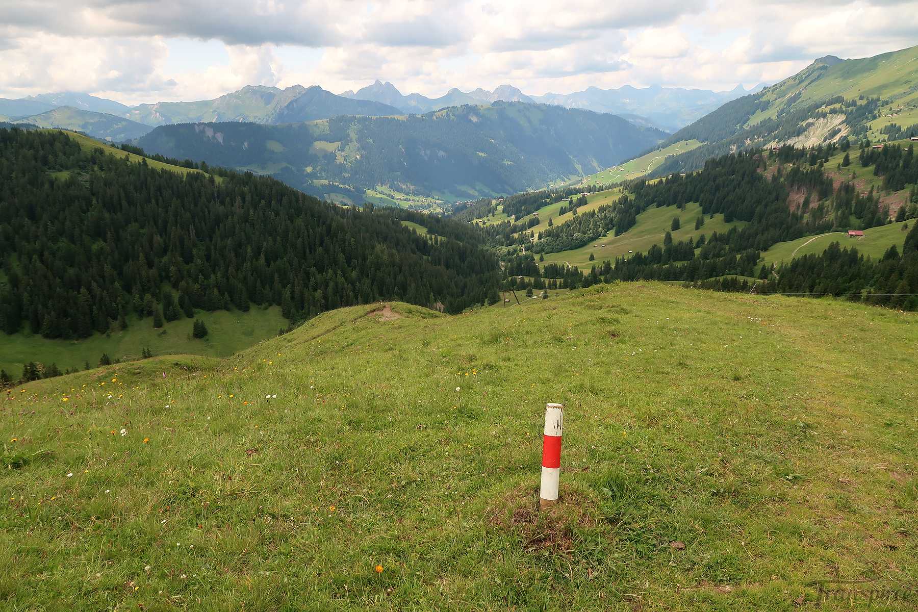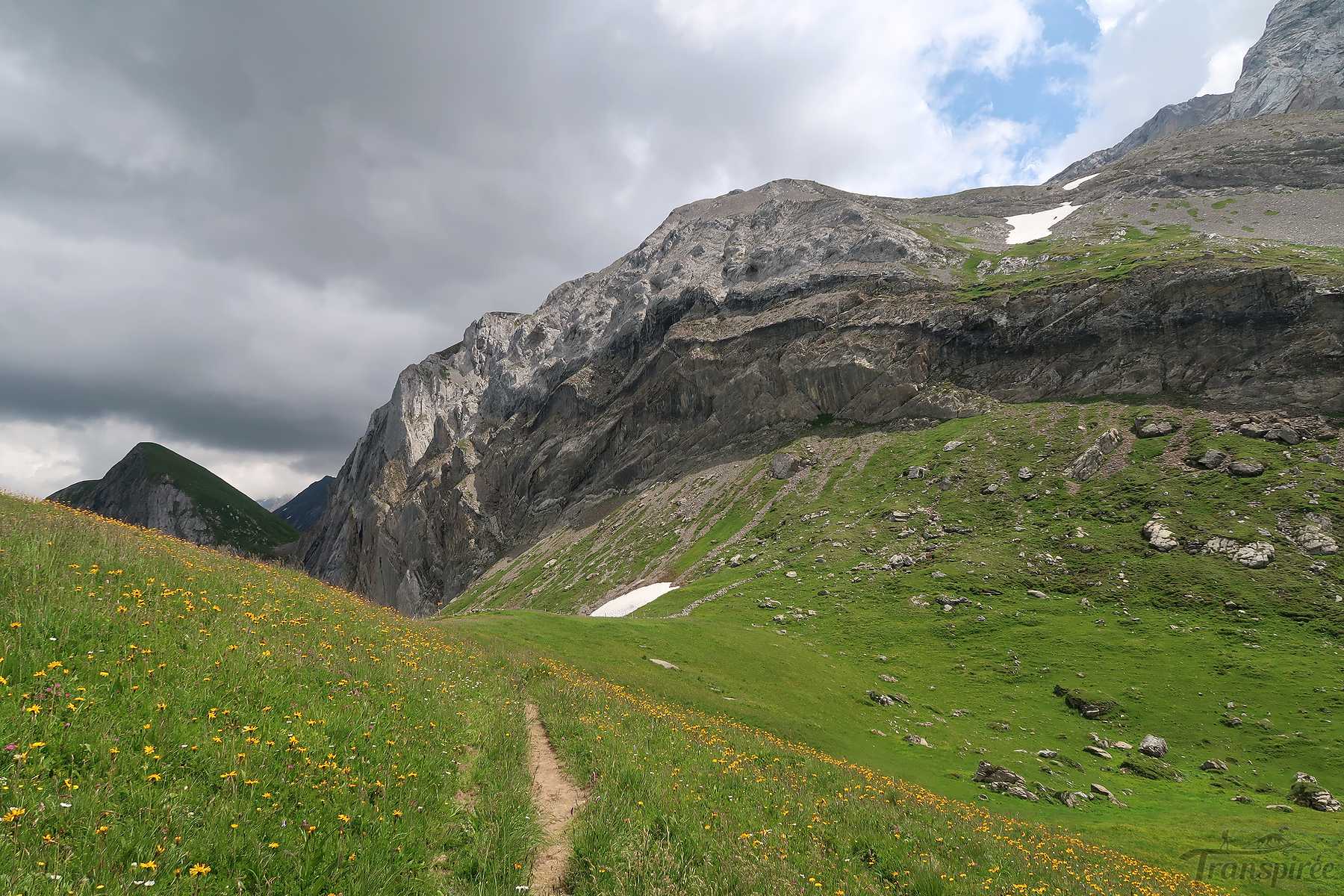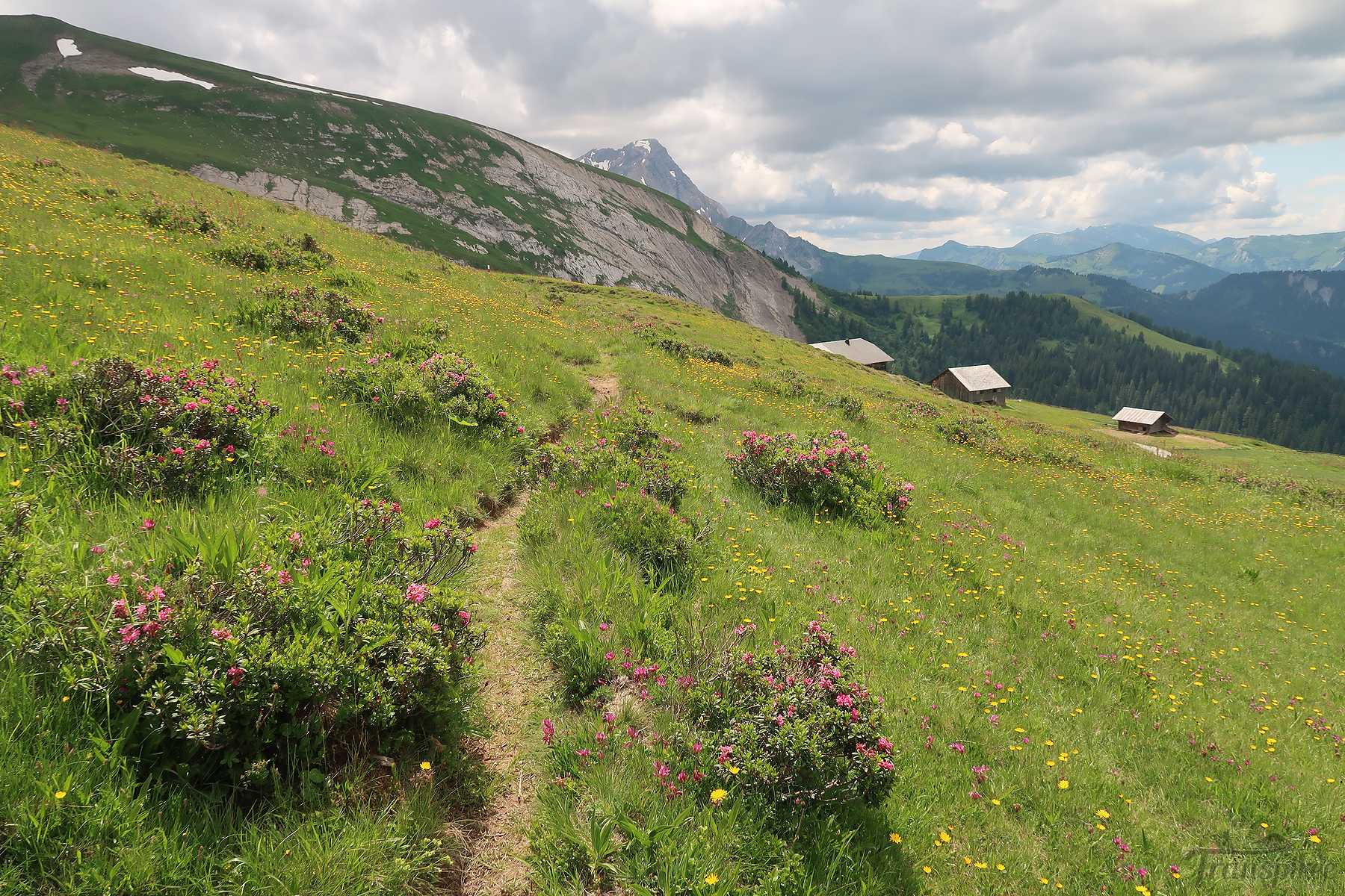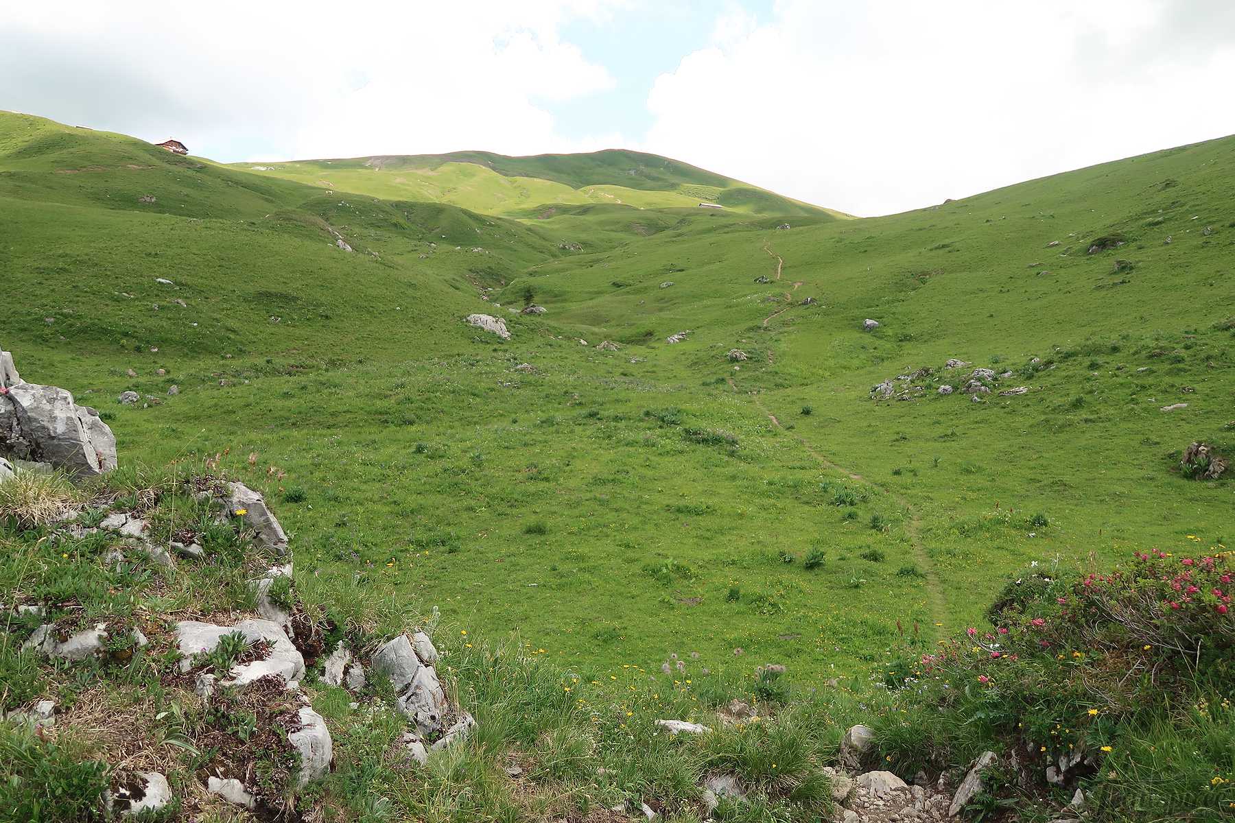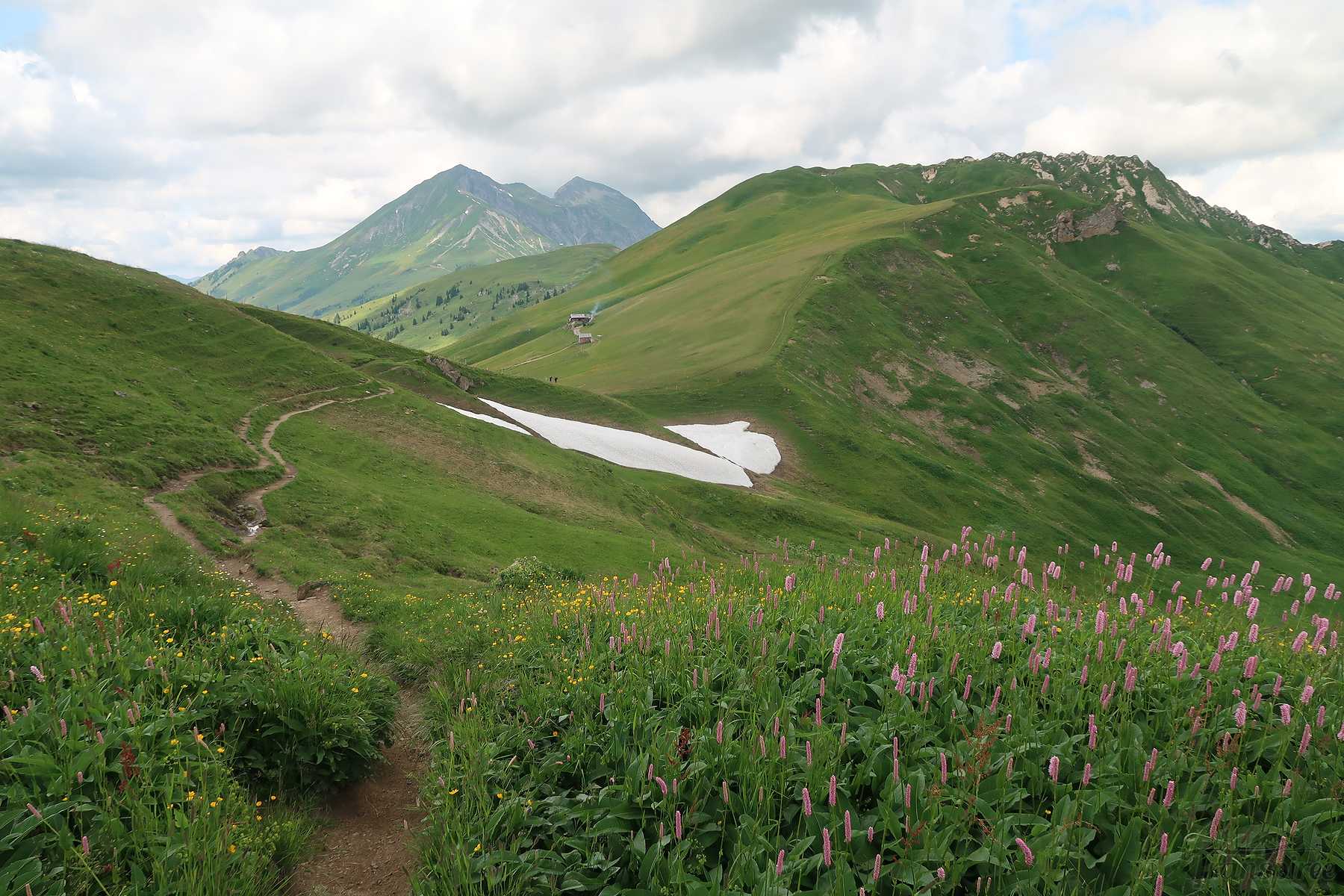 On suit désormais une route d’alpage, cela fait du bien car la dernière portion du chemin fut peu confortable. Vers 1600m, il faut quitter la route et traverser le cours d’eau local (Blattibach) via un pont. Le sentier remonte dans des pâturages, il faut suivre les piquets, le chemin est peu marqué. Il y a des abris isolée et la surprise est de voir un champ rempli d’orchis, jamais je n’en ai vu autant ! Superbe
