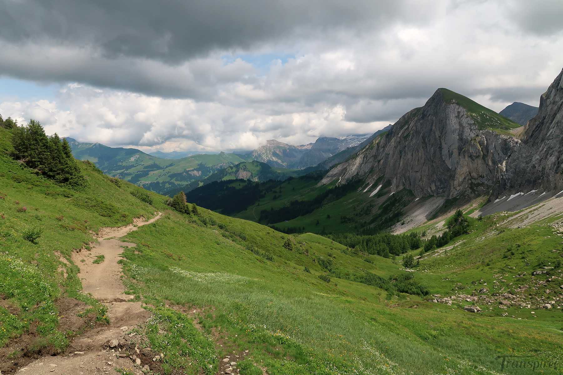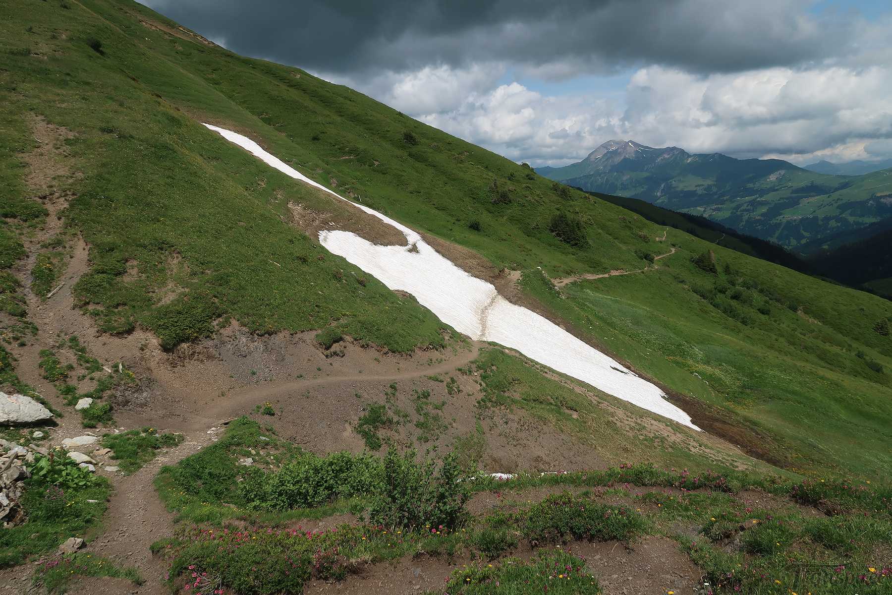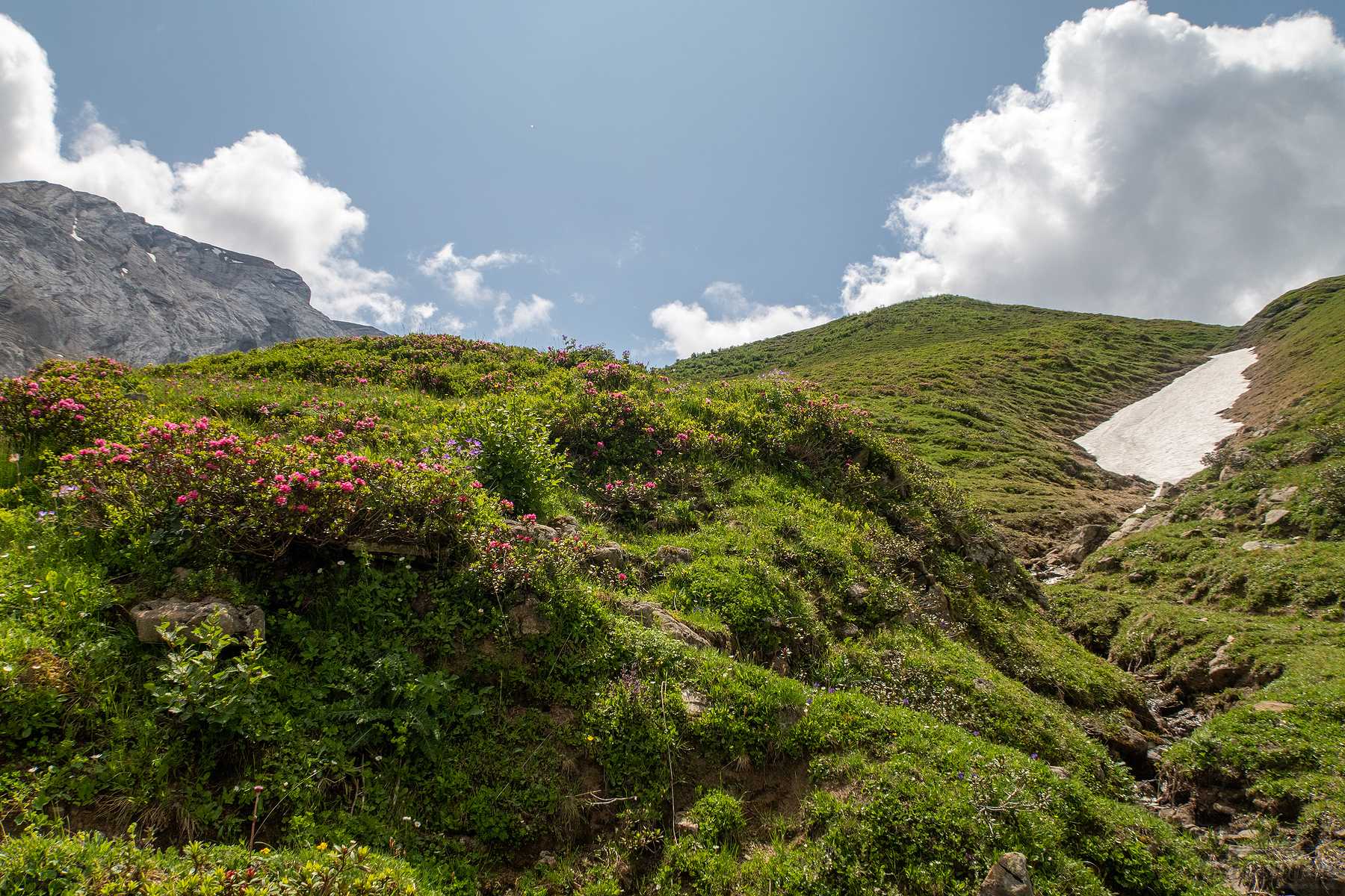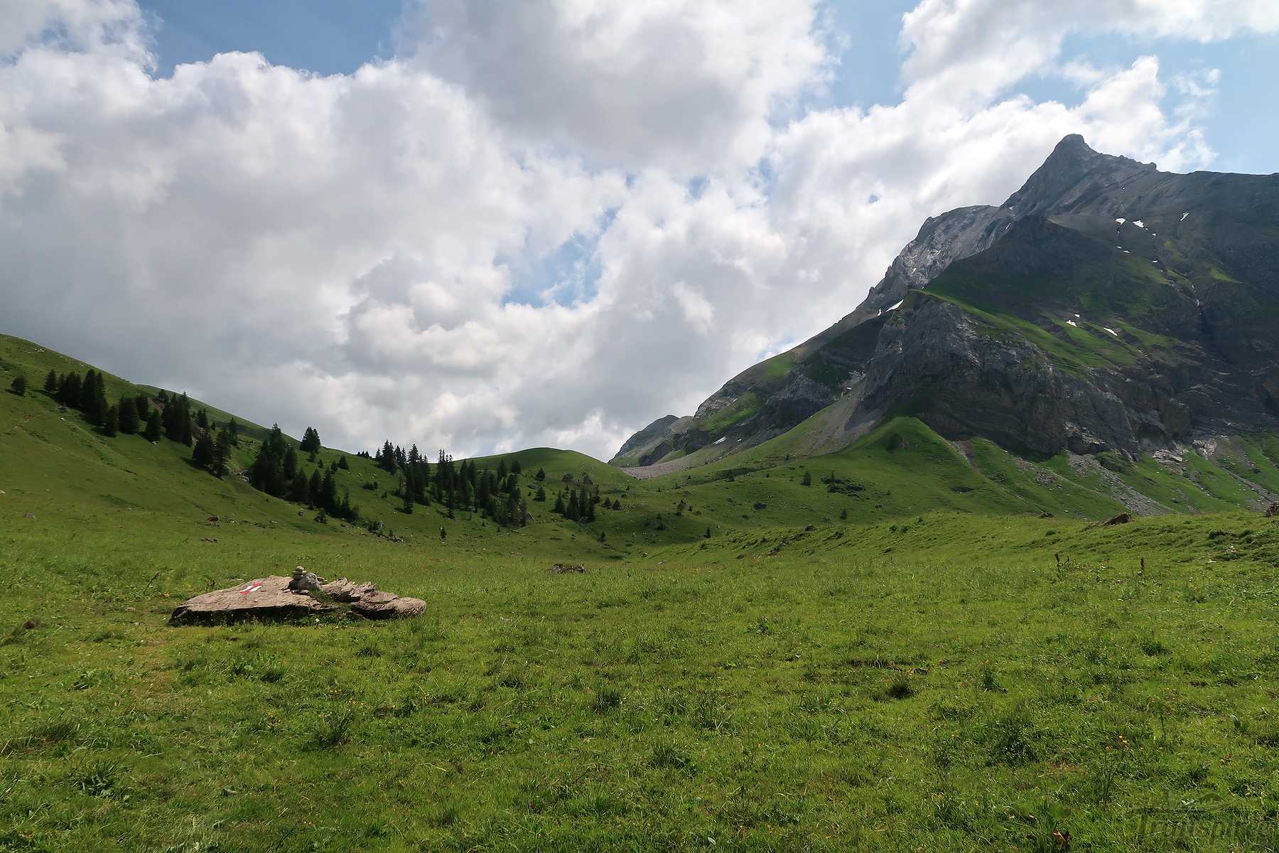 On suit désormais une route d’alpage, cela fait du bien car la dernière portion du chemin fut peu confortable. Vers 1600m, il faut quitter la route et traverser le cours d’eau local (Blattibach) via un pont. Le sentier remonte dans des pâturages, il faut suivre les piquets, le chemin est peu marqué. Il y a des abris isolée et la surprise est de voir un champ rempli d’orchis, jamais je n’en ai vu autant ! Superbe