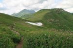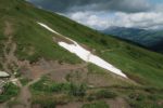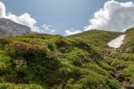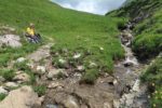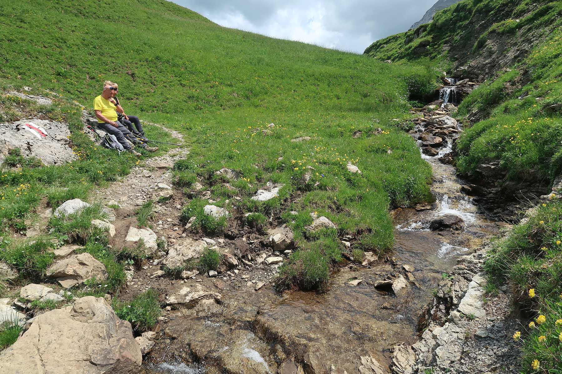 Le chemin monte tranquillement et il faut passer une sorte de col vers 1900m. La progression est tranquille. Vers 2000m, je vais un détour, mon idée est d’emprunter le sentier le plus au S qui monte dans la falaise. Je n’ai pas vu de bifurcation et je m’inquiète. Je ne vois rien et reviens sur mes pas. Une pause casse-croute au bord du cours d’eau local, puis nous repartons. Tiens on croise un peu de monde, cela change de la solitude jusqu’à présent. Le sentier monte en pente douce. Aux jumelles, je découvre enfin le sentier que je cherchais. Il semble peu utilisé et un névé vers le bas complique le départ … avec aucun trace de pas !