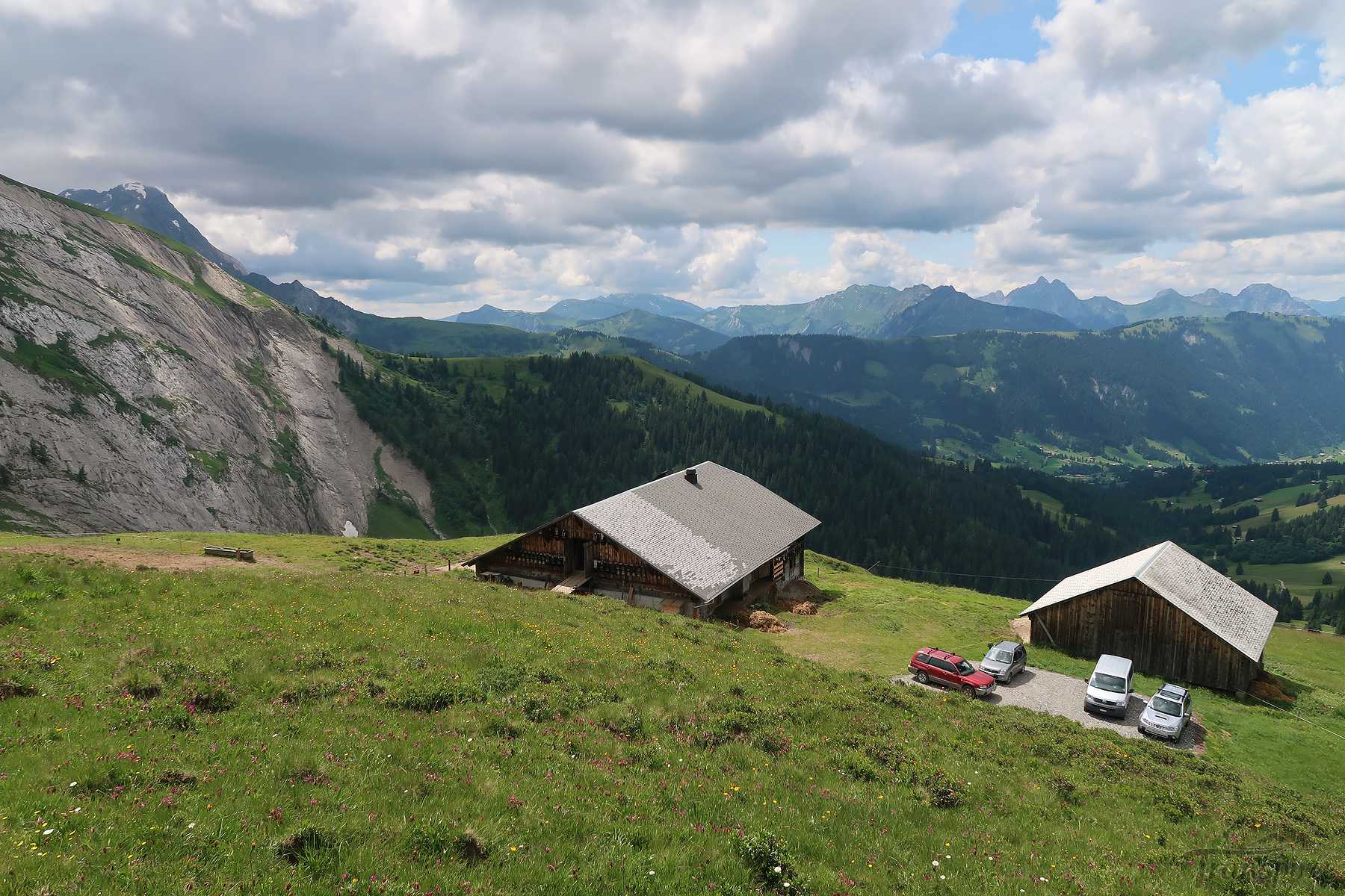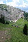 On descend en suivant le sentier pour passer devant les fermes d’Obers-Blatti. Ensuite il faut suivre les piquets et on retrouve un sentier pentu. Va pour sortir les bâtons. La face N de la falaise de Jakosweid est jolie à point. En arrivant au niveau des fermes d’Unders-Blatti, on peut y voir deux cavités dans les hauteurs.