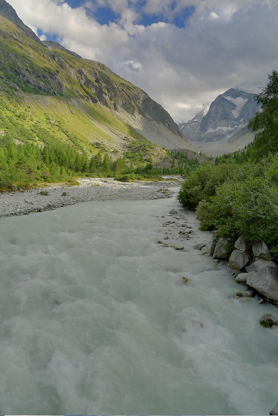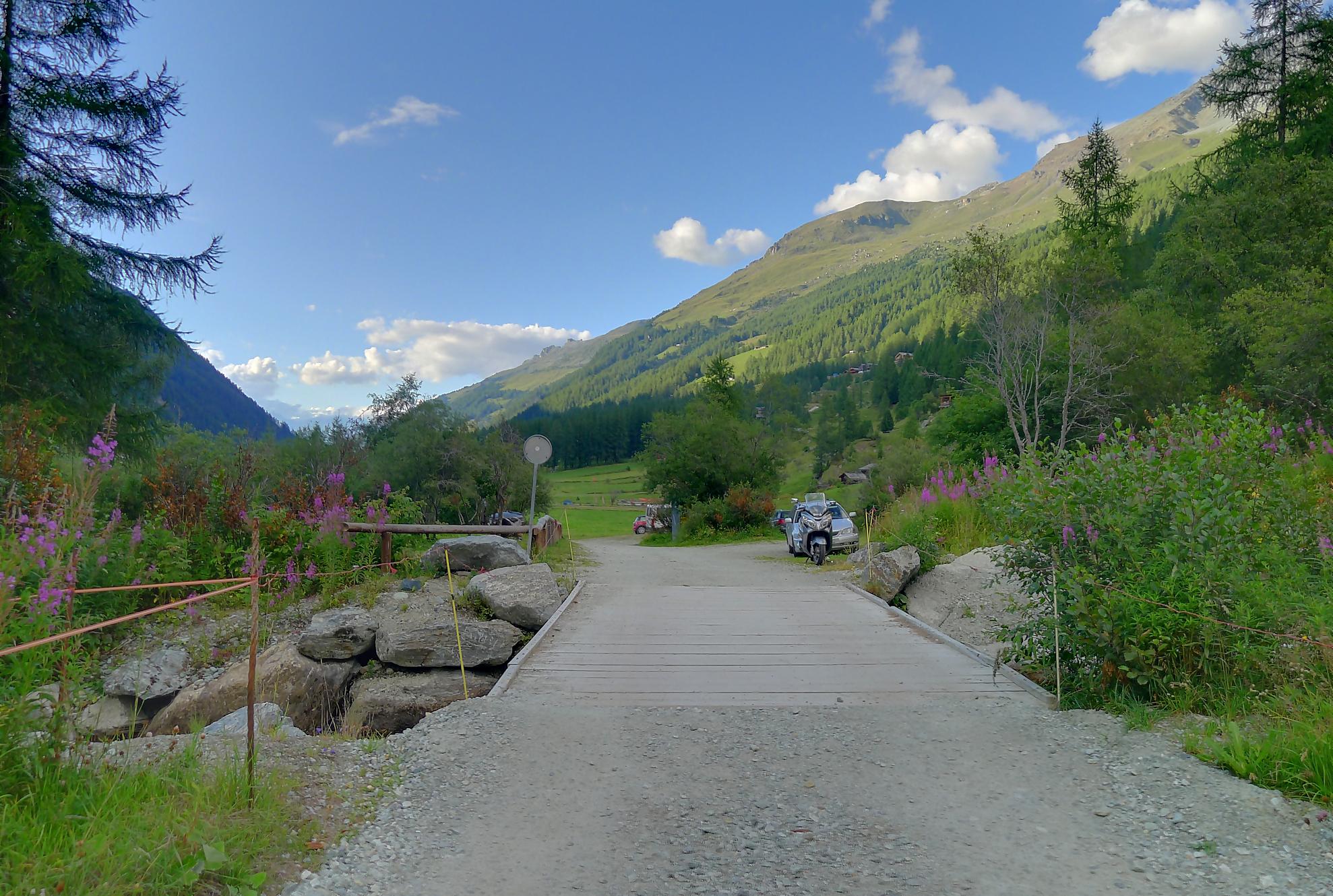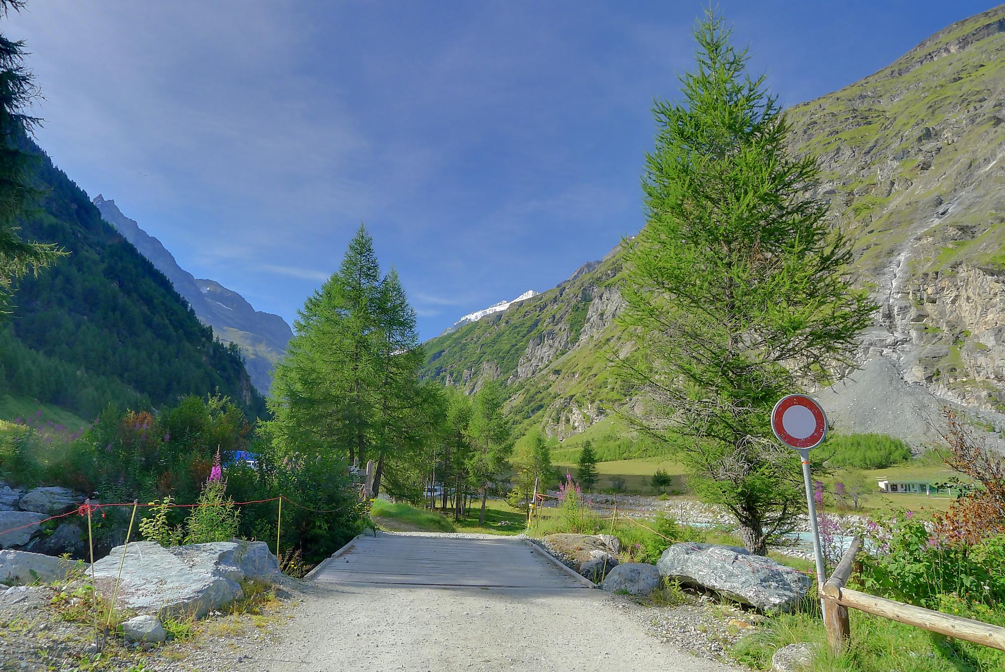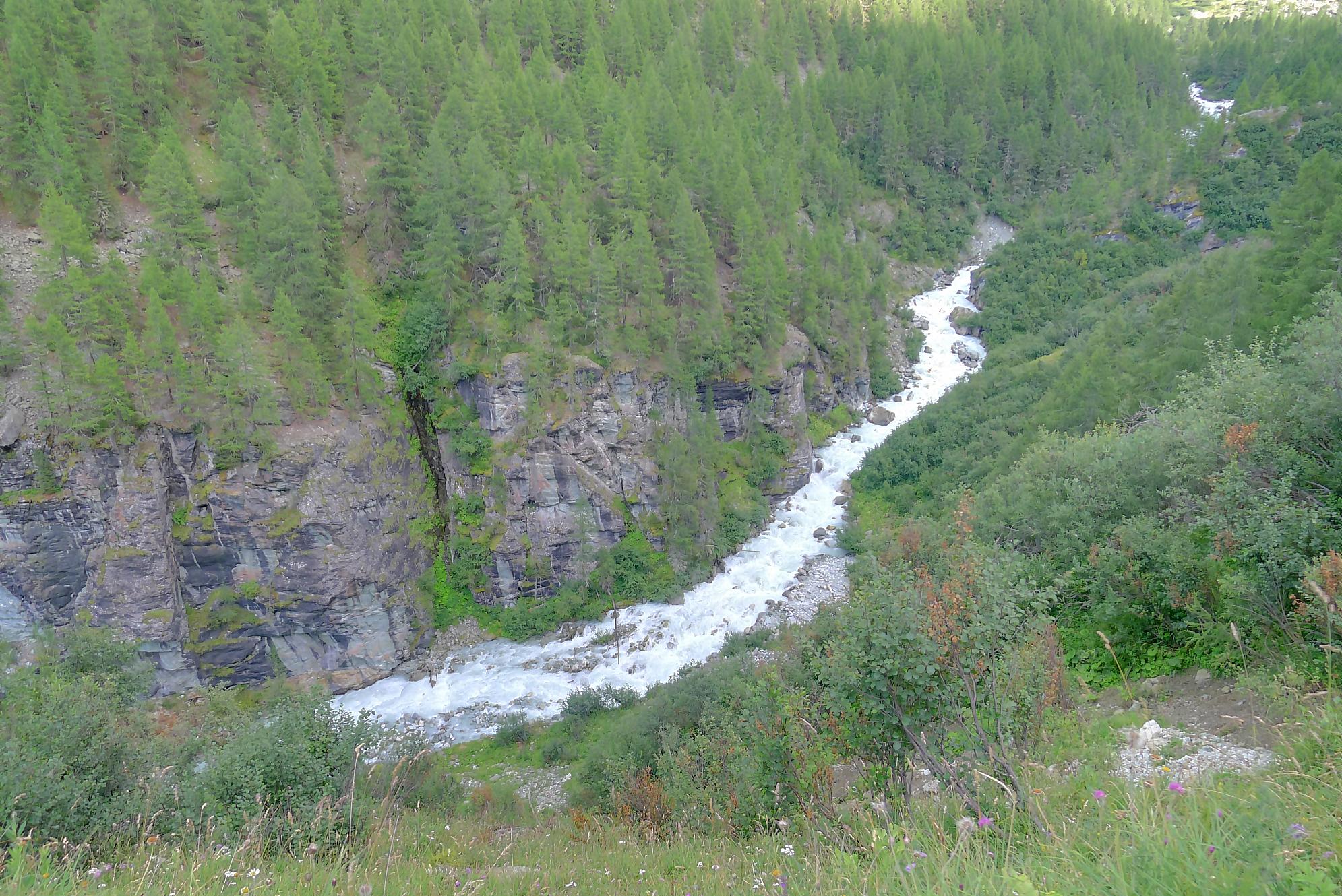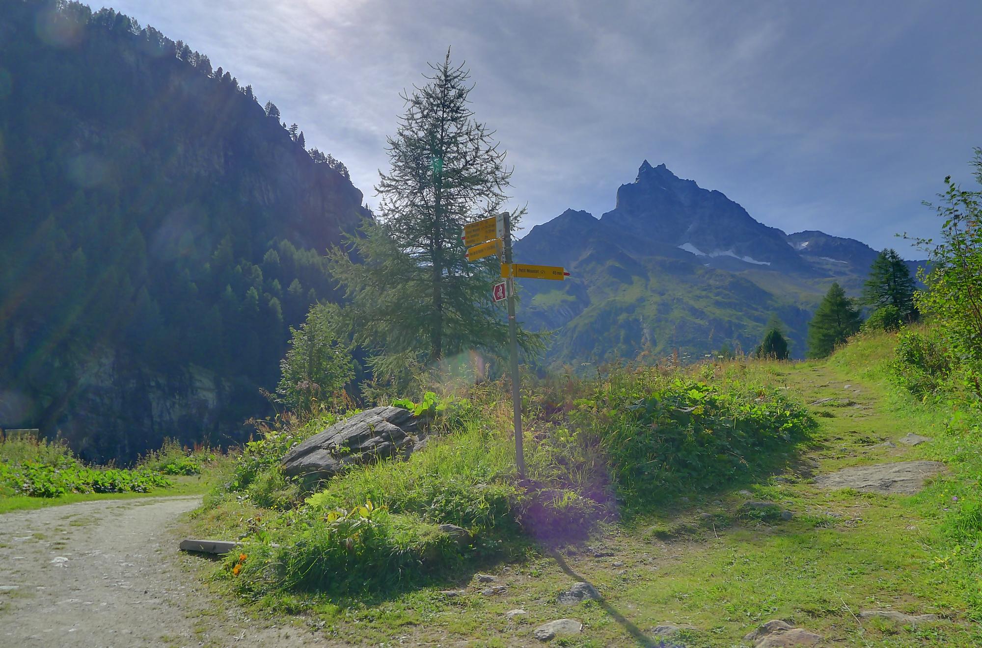Je me gare après Zinal, Barme sur la carte, juste devant le panneau interdiction de circuler. Je déconseille d’aller après, car lors de mon arrivée un policier en voiture venait distribuer des prunes à 40, non pas degrés d’alcool comme le propose les distilleries locales, mais en CHF (je ne connais pas le tarif exact) ! Je pars à 10h et longe la rivière La Navisence dont la couleur de l’eau “lait de glacier” est bien jolie, section de mise en jambe. Au pont du Pt1731, on change de rive, il faut monter à droite (perpendiculaire à la rivière) sur 100m (aucune indication et le chemin se perd ici) pour retrouver le chemin de la cabane du Petit Mountet. C’est une route forestière, qu’il est possible de suivre jusqu’à cette cabane, mais vu les détours qu’elle fait, je conseille plutôt la version chemin pédestre (il y a deux possibilités, j’y viens).