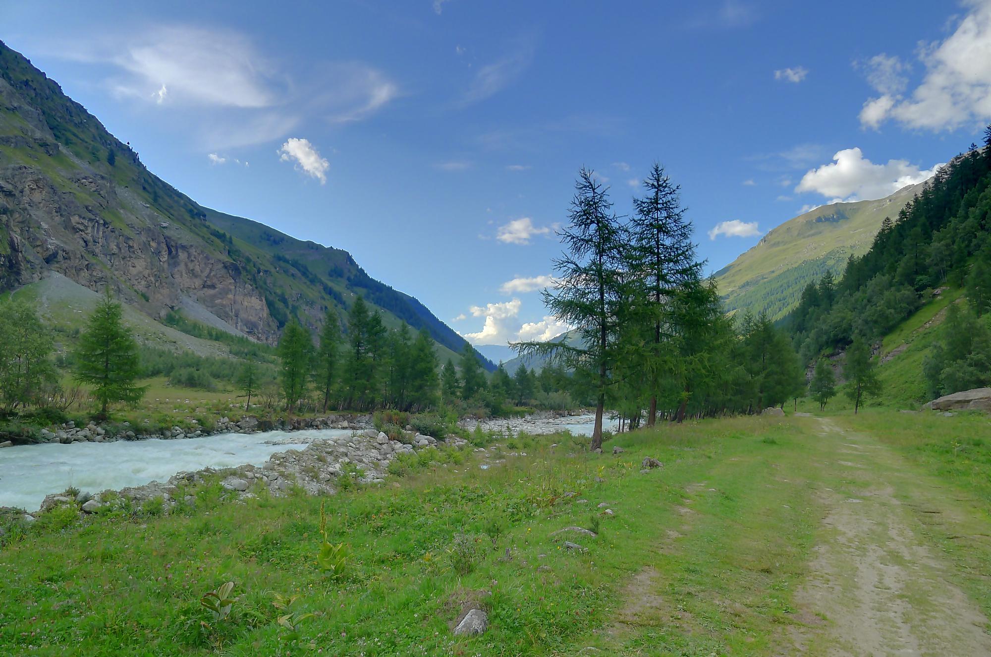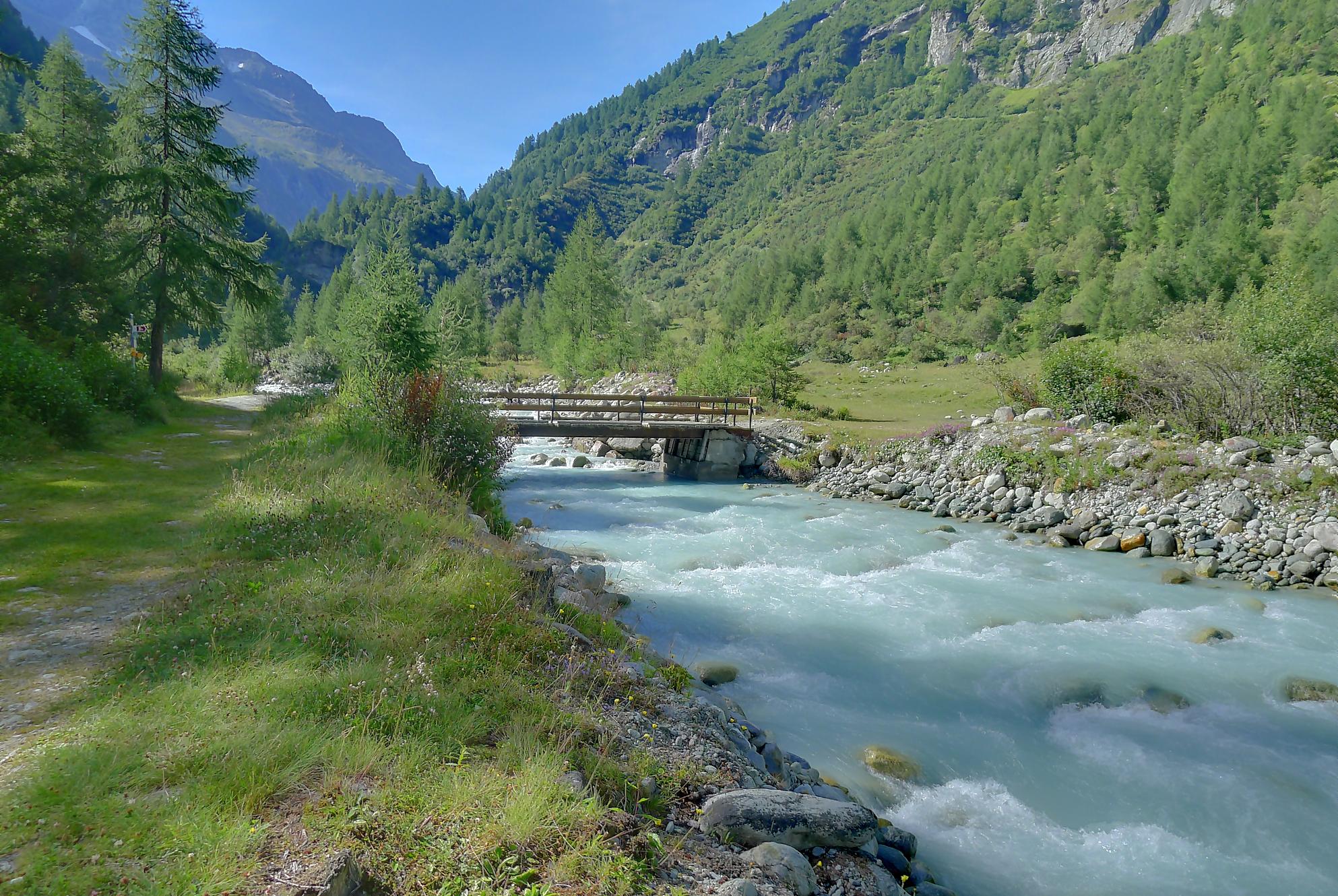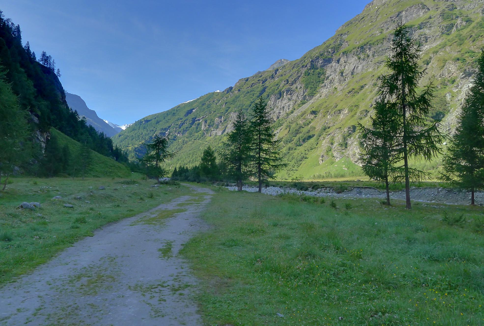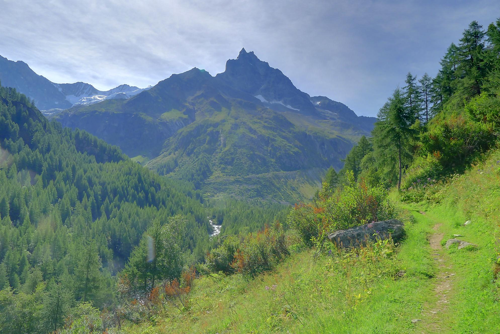 Je me gare après Zinal, Barme sur la carte, juste devant le panneau interdiction de circuler. Je déconseille d’aller après, car lors de mon arrivée un policier en voiture venait distribuer des prunes à 40, non pas degrés d’alcool comme le propose les distilleries locales, mais en CHF (je ne connais pas le tarif exact) ! Je pars à 10h et longe la rivière La Navisence dont la couleur de l’eau “lait de glacier” est bien jolie, section de mise en jambe. Au pont du Pt1731, on change de rive, il faut monter à droite (perpendiculaire à la rivière) sur 100m (aucune indication et le chemin se perd ici) pour retrouver le chemin de la cabane du Petit Mountet. C’est une route forestière, qu’il est possible de suivre jusqu’à cette cabane, mais vu les détours qu’elle fait, je conseille plutôt la version chemin pédestre (il y a deux possibilités, j’y viens).