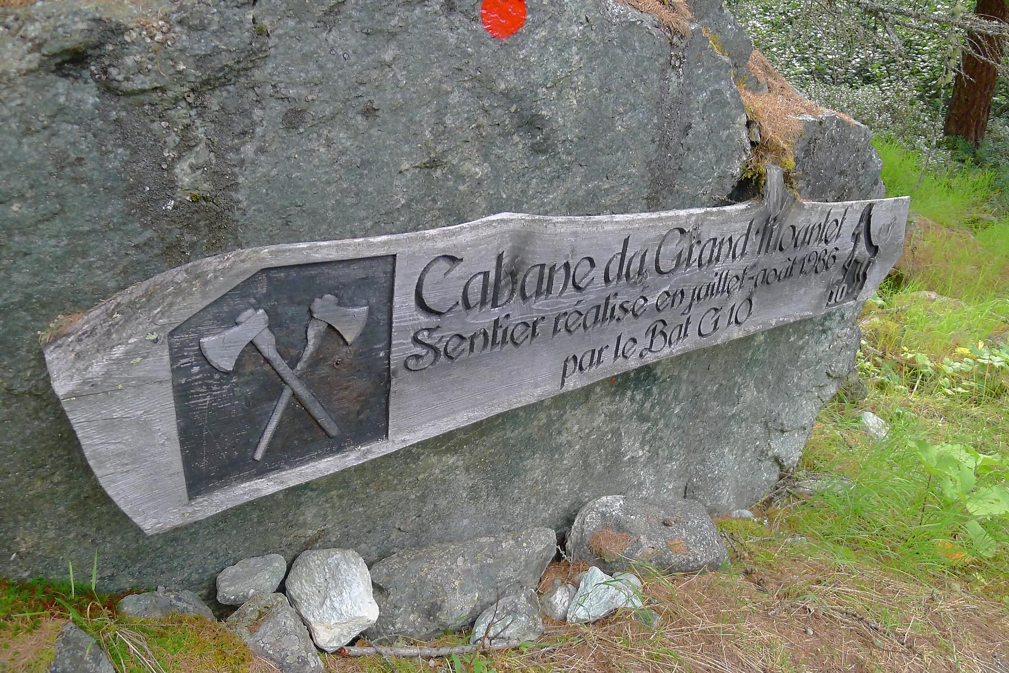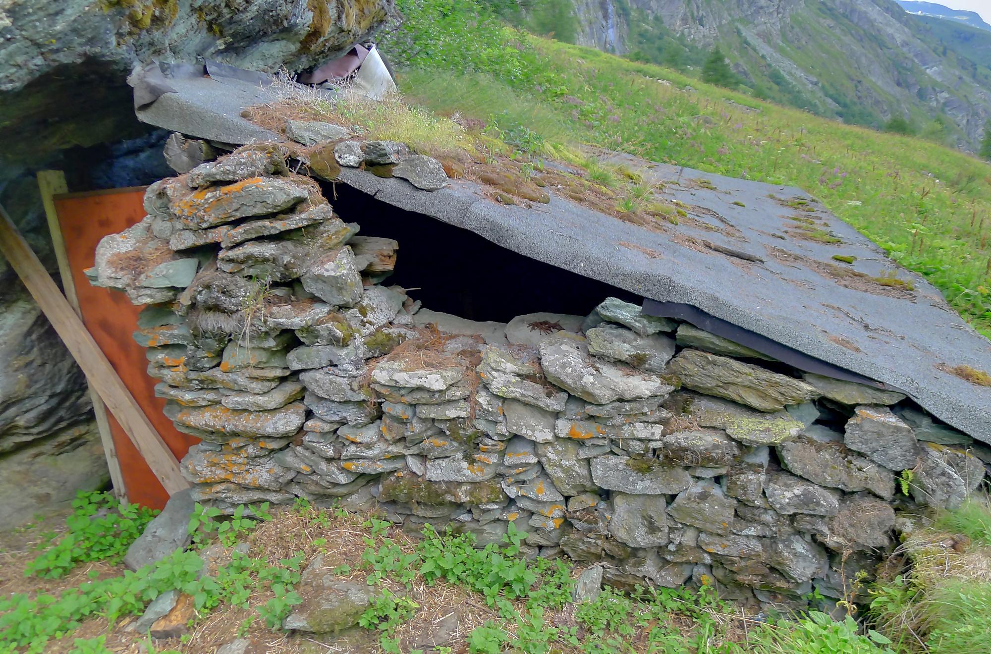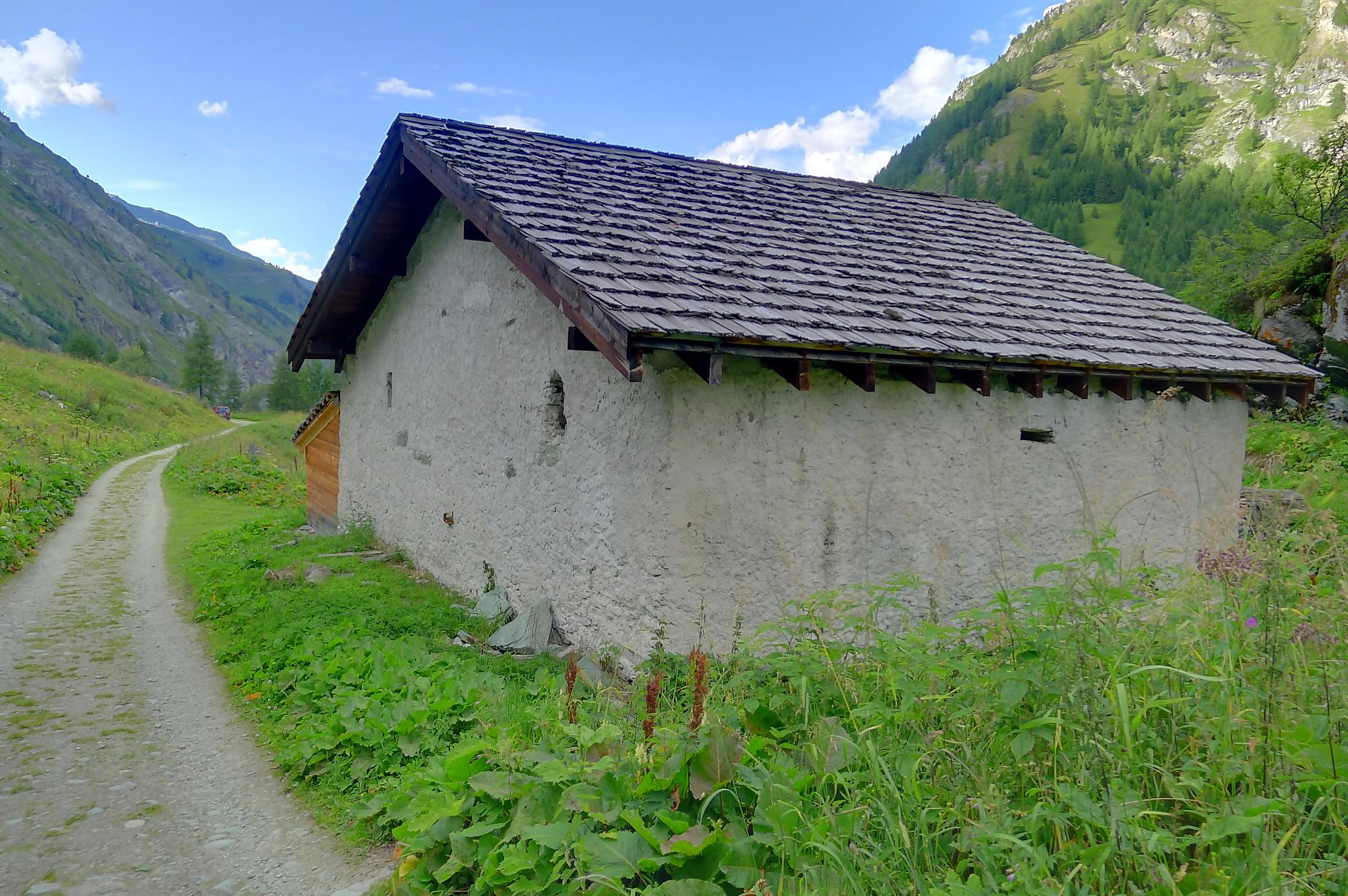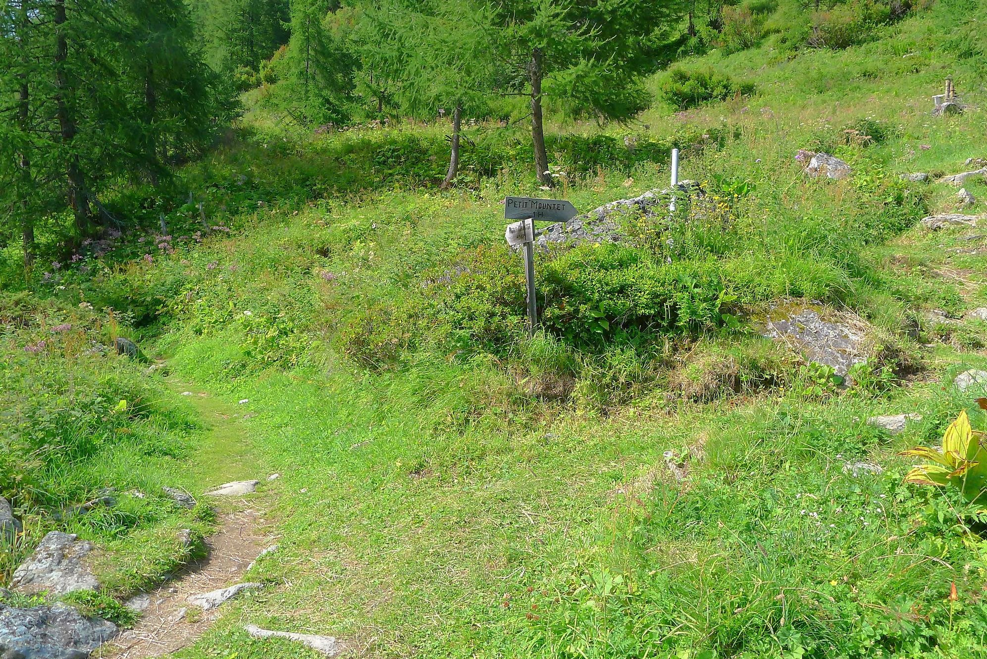 Peu après sur la droite, un panneau indique la direction des Anciennes Mines de Cuivres de La Lé, 15 min. J’avais vu l’indication sur la carte, mais elle n’est pas au programme du jour. Pour une visite, il faut s’inscrire à l’office du tourisme de Zinal. Un dépliant est disponible à la cabane du Petit Mountet. Après le lieu dit Le Vichiesso, une bifurcation propose deux chemins pour la cabane du Petit Mountet, 40 min pour la version courte en forêt, 1h pour une version dans les hauteurs, mais qui fait monter pour redescendre. Sachant que la journée sera longue je prends l’option 40 min.