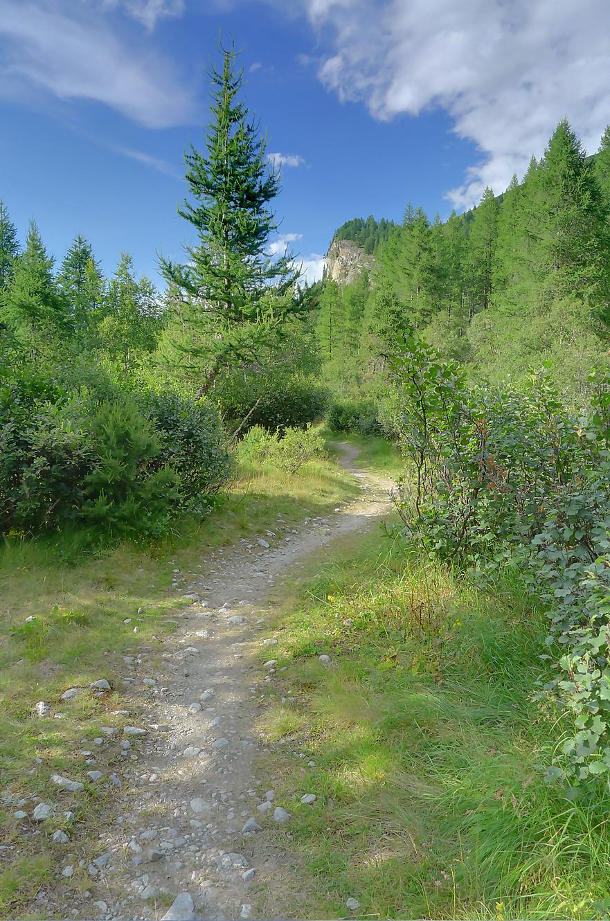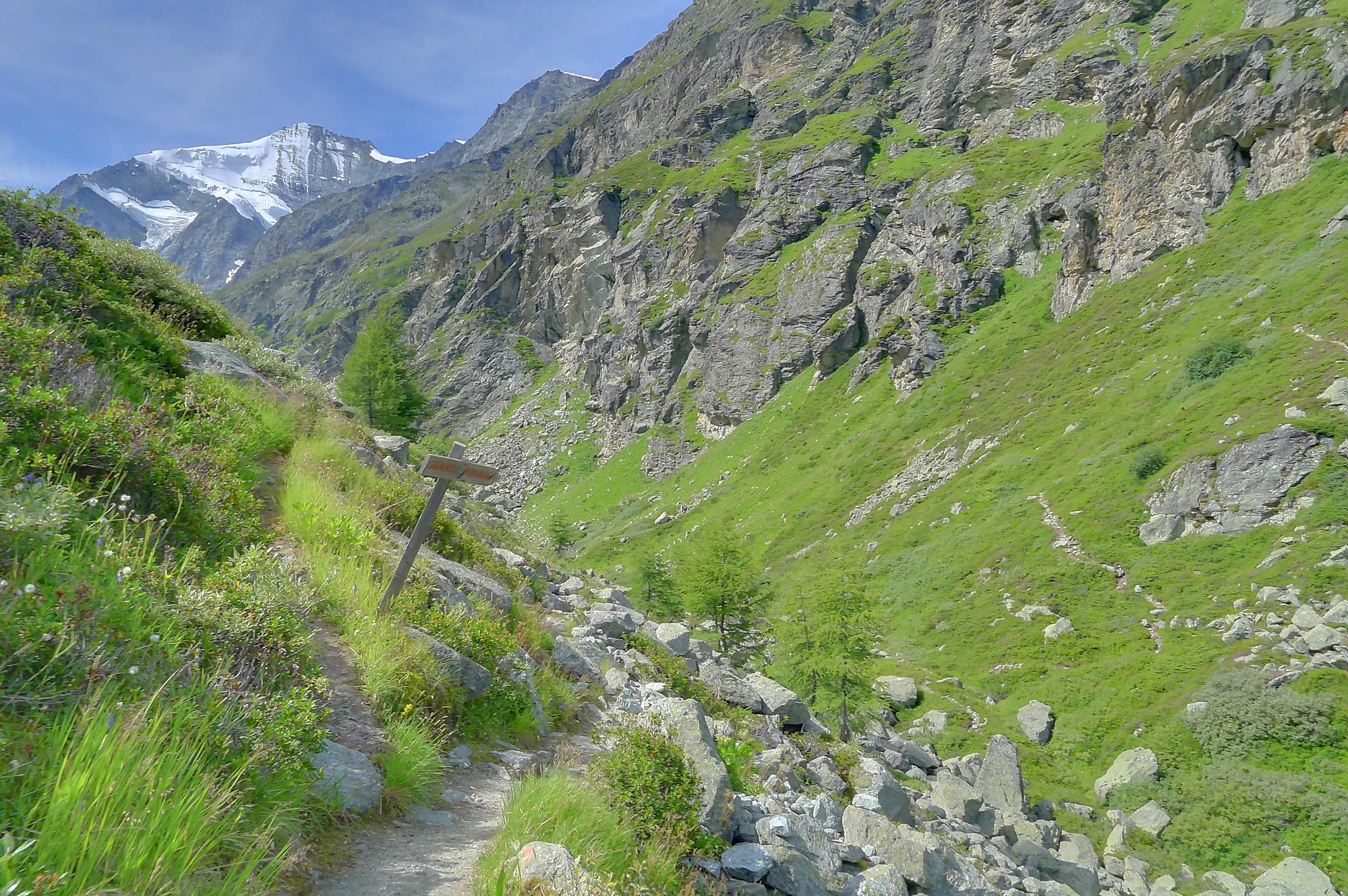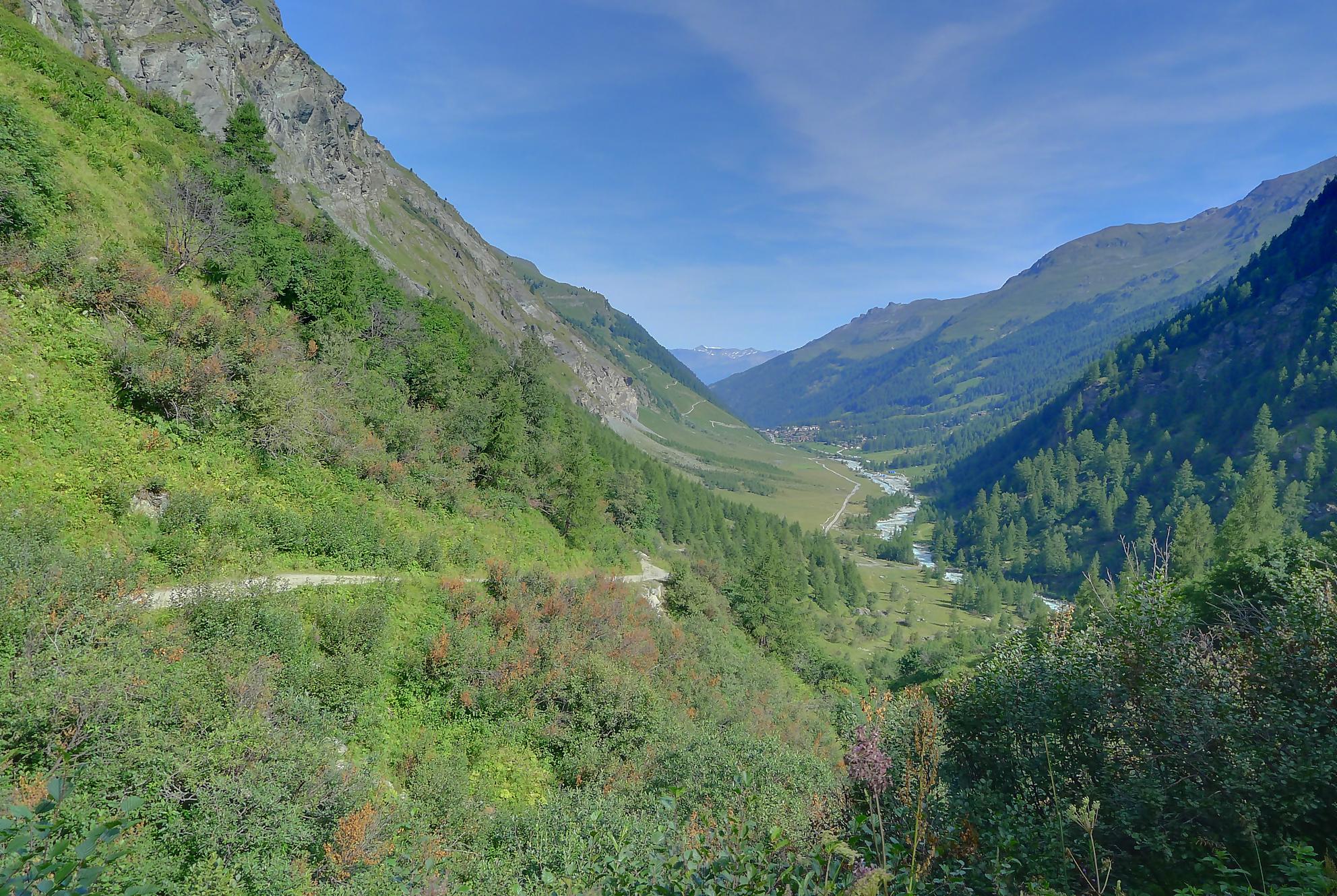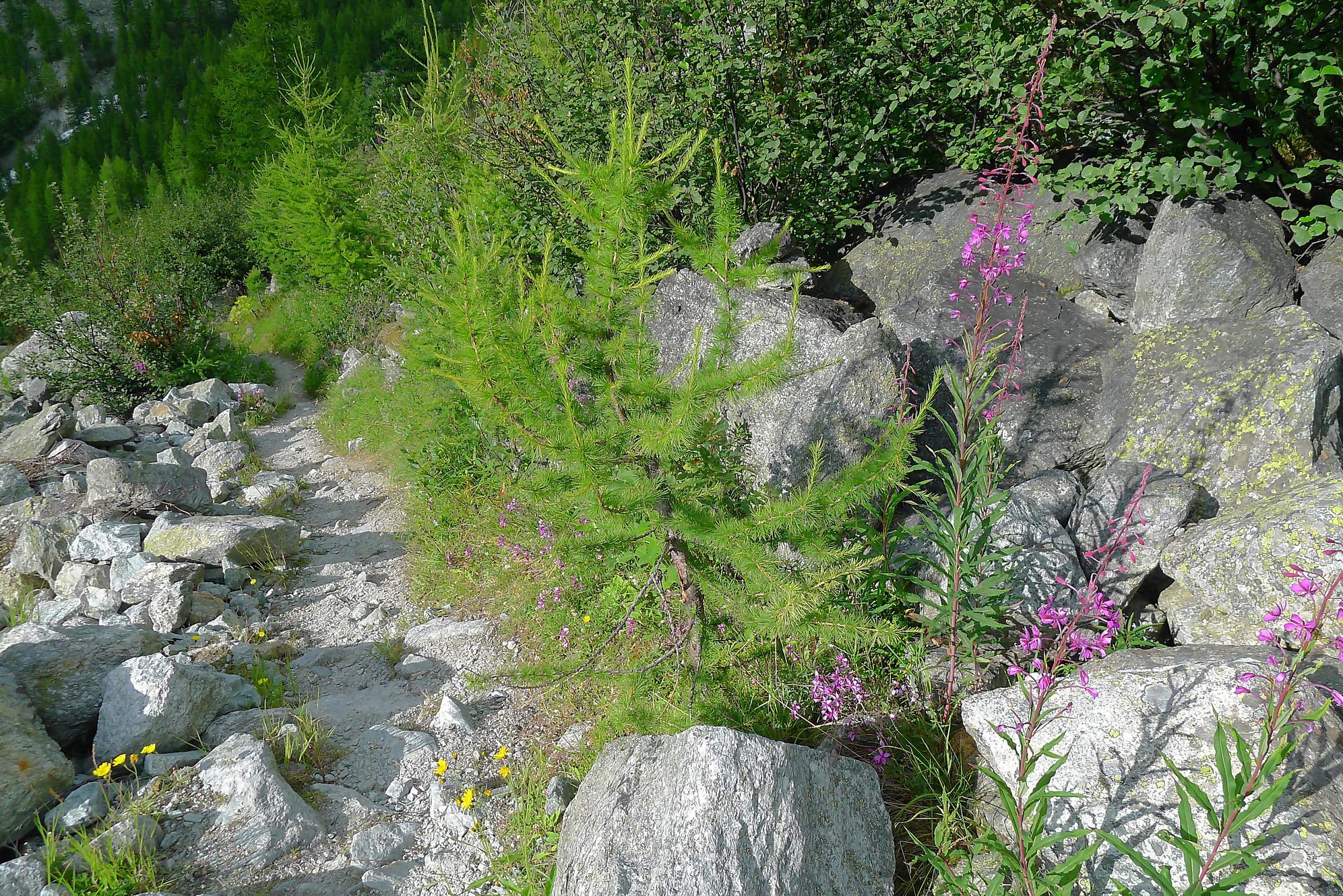 Peu après sur la droite, un panneau indique la direction des Anciennes Mines de Cuivres de La Lé, 15 min. J’avais vu l’indication sur la carte, mais elle n’est pas au programme du jour. Pour une visite, il faut s’inscrire à l’office du tourisme de Zinal. Un dépliant est disponible à la cabane du Petit Mountet. Après le lieu dit Le Vichiesso, une bifurcation propose deux chemins pour la cabane du Petit Mountet, 40 min pour la version courte en forêt, 1h pour une version dans les hauteurs, mais qui fait monter pour redescendre. Sachant que la journée sera longue je prends l’option 40 min.